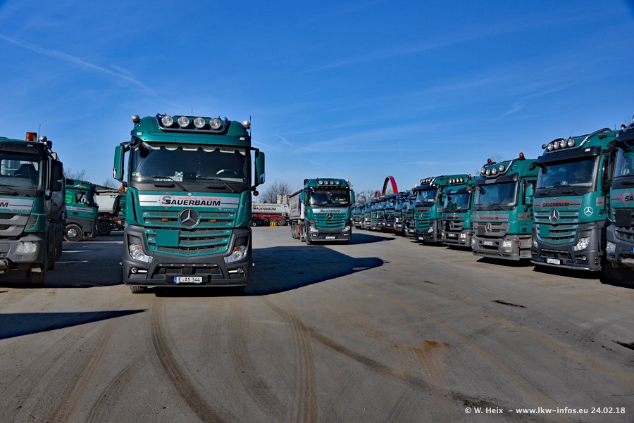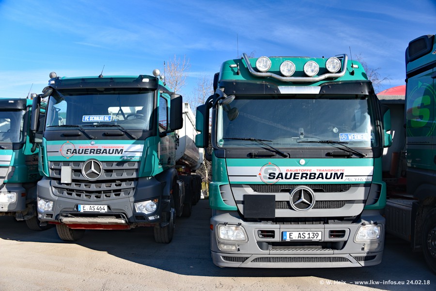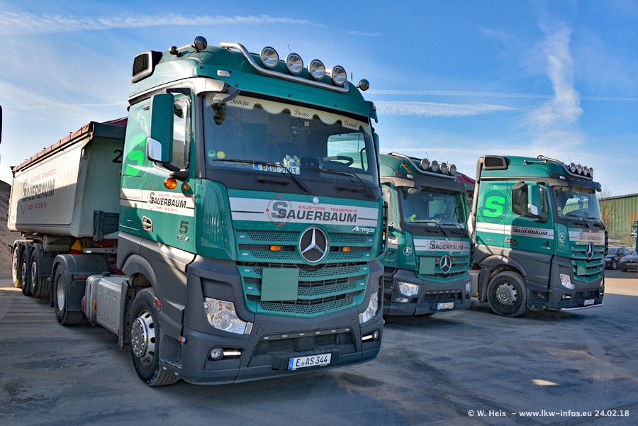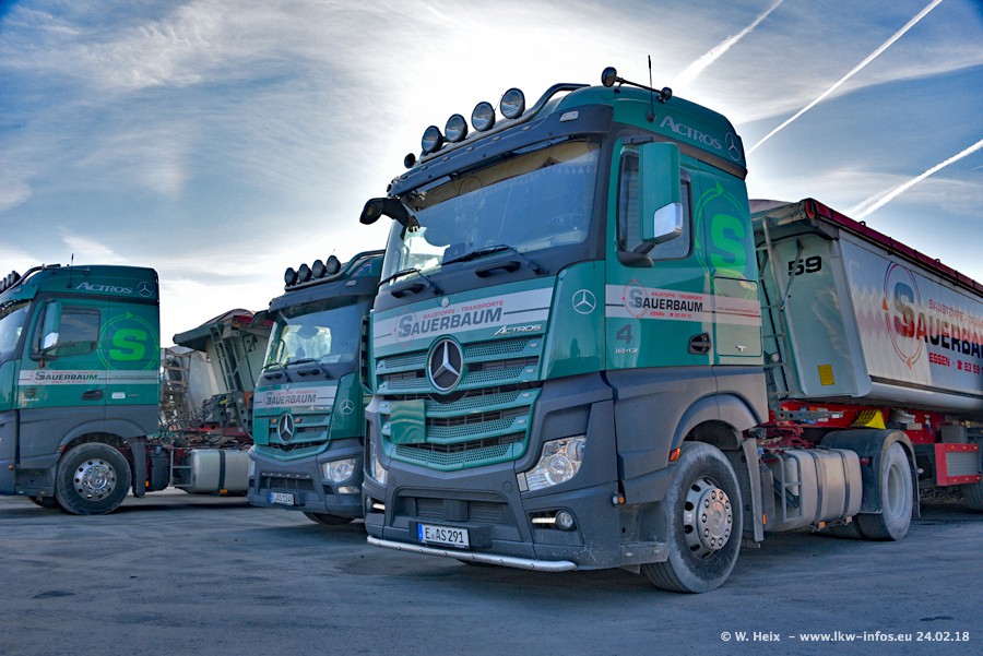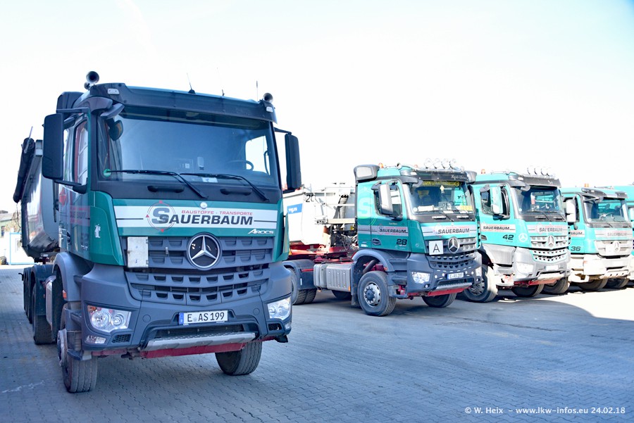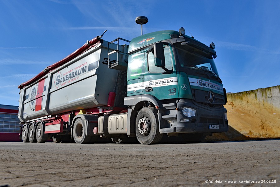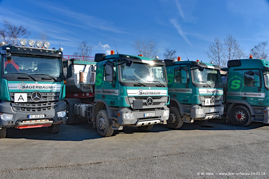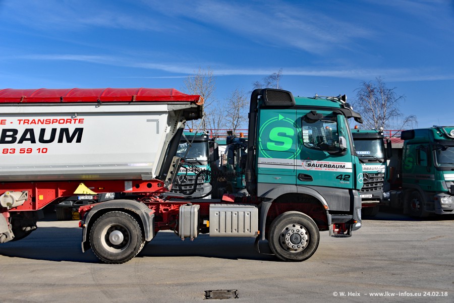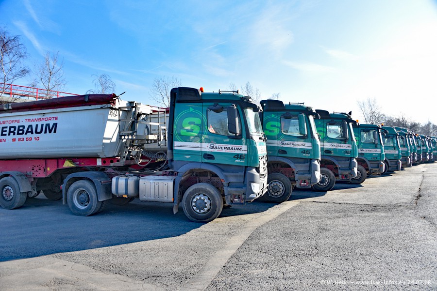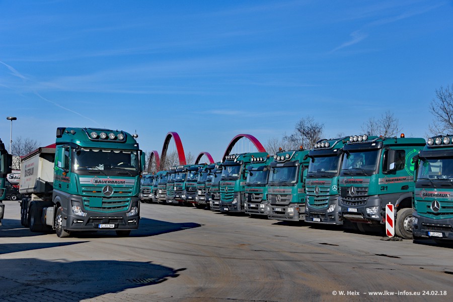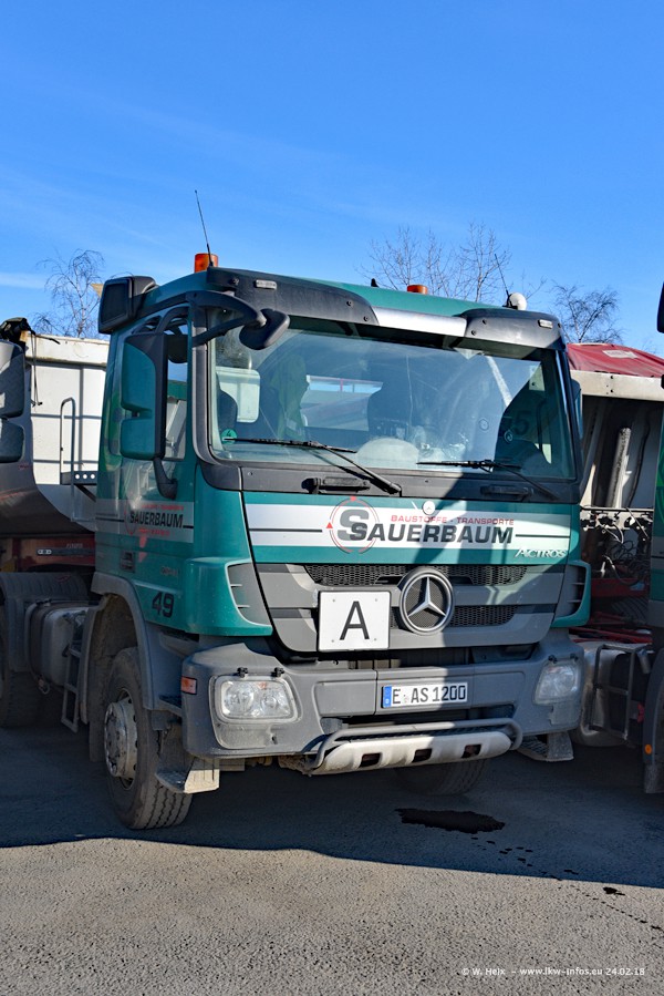 Der Fuhrpark von Sauerbaum besteht aus rund 50 LKW. Das sind 2 MAN TGS Euro 6 und alle anderen Fahrzeuge sind von Mercedes-Benz: Actros 3 und 4 sowie Arocs bei den Allrad-Zugmaschinen.