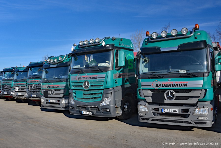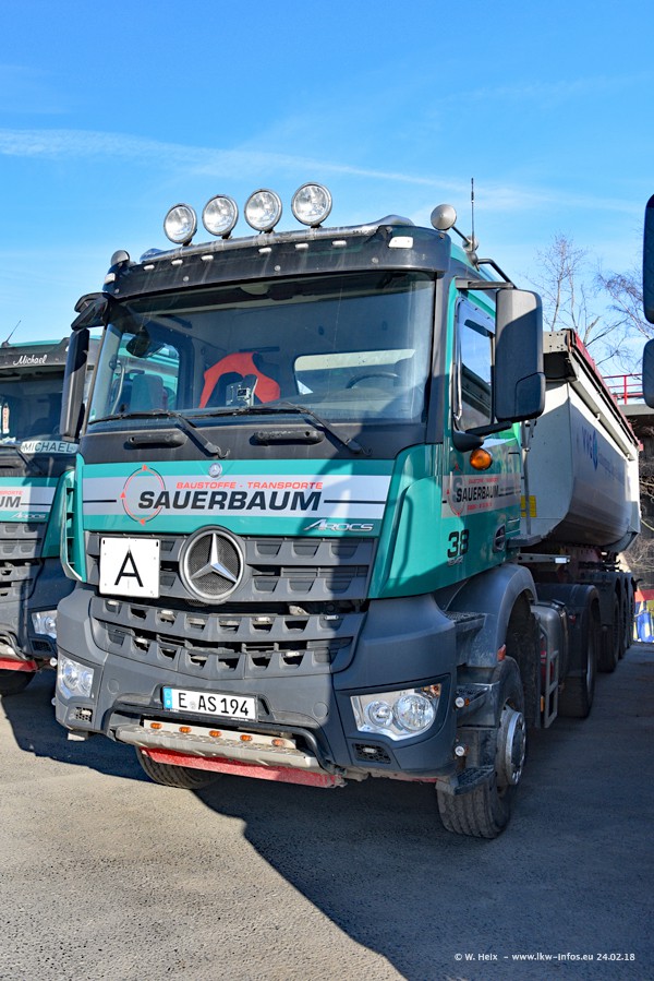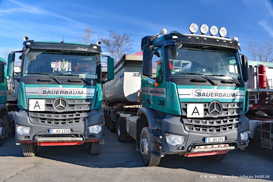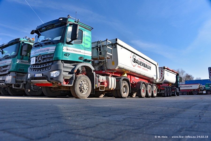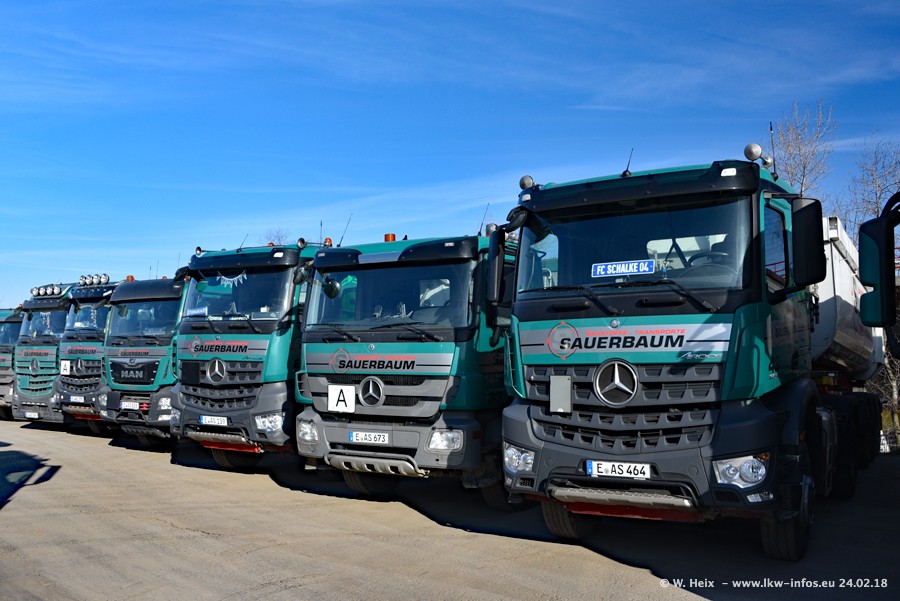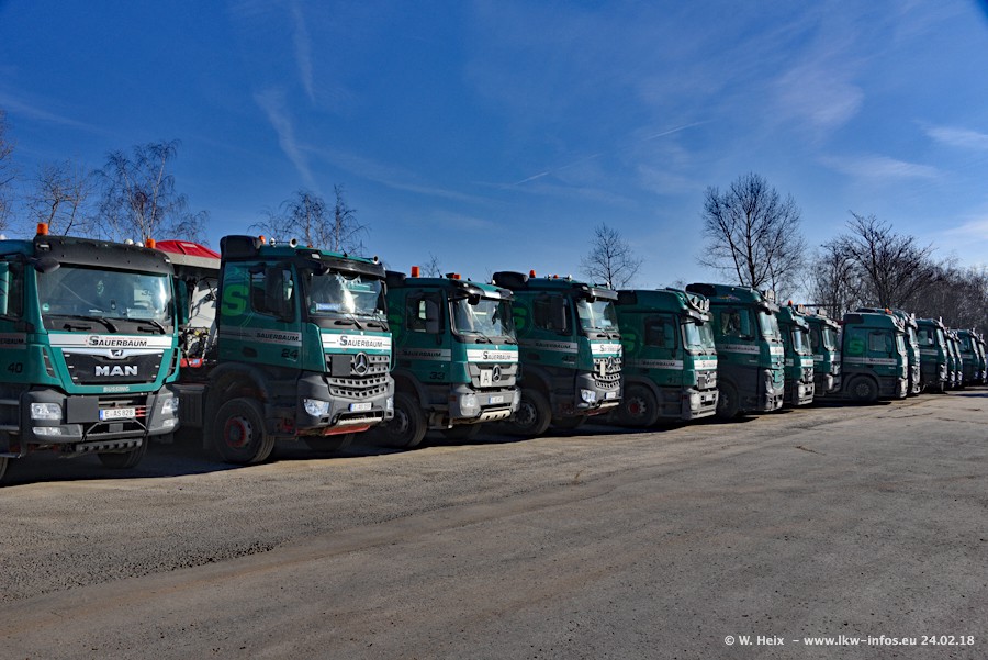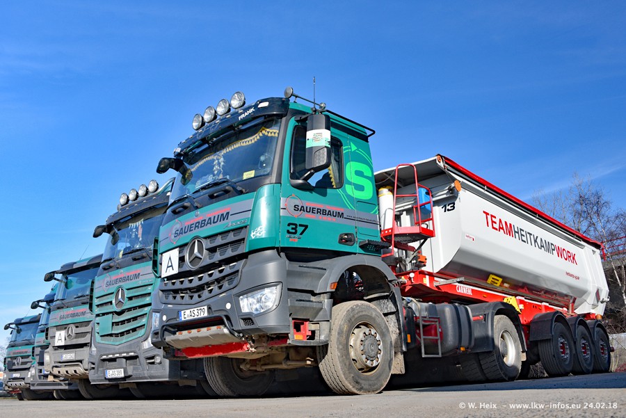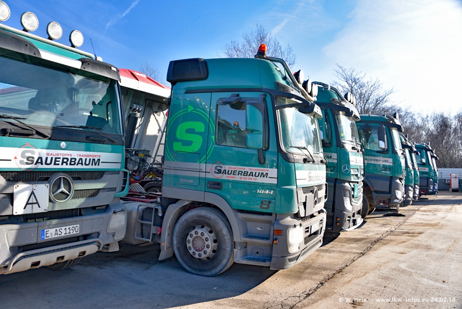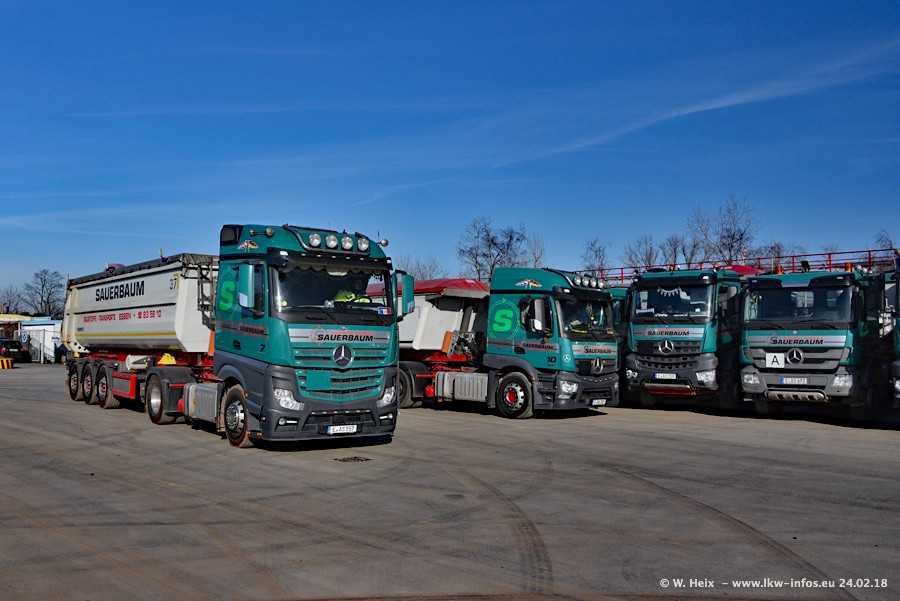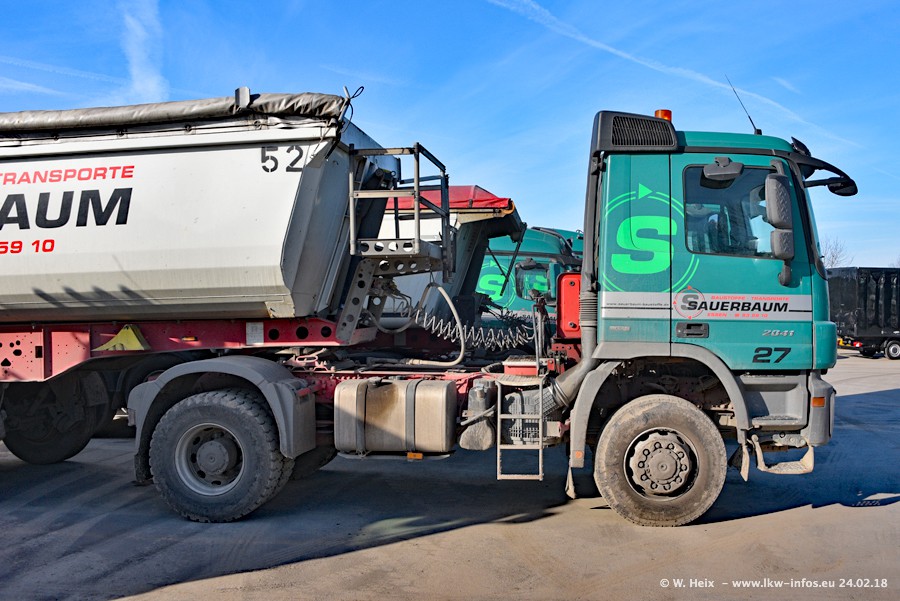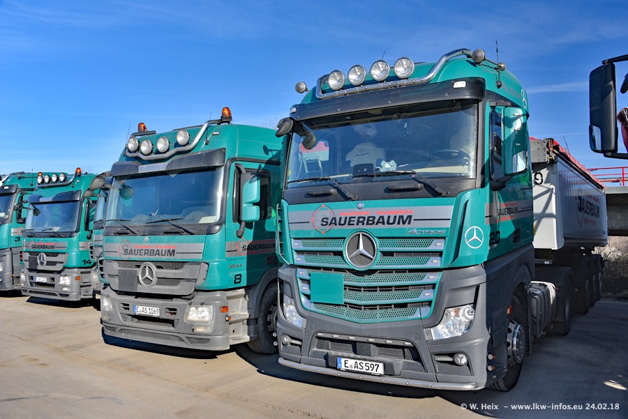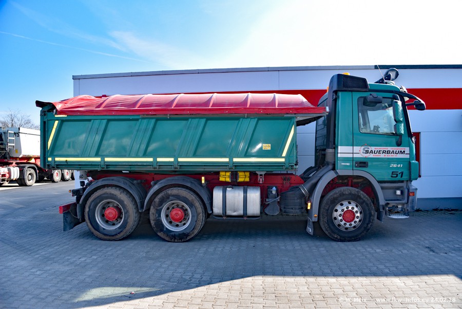 Der Fuhrpark von Sauerbaum besteht aus rund 50 LKW. Das sind 2 MAN TGS Euro 6 und alle anderen Fahrzeuge sind von Mercedes-Benz: Actros 3 und 4 sowie Arocs bei den Allrad-Zugmaschinen.