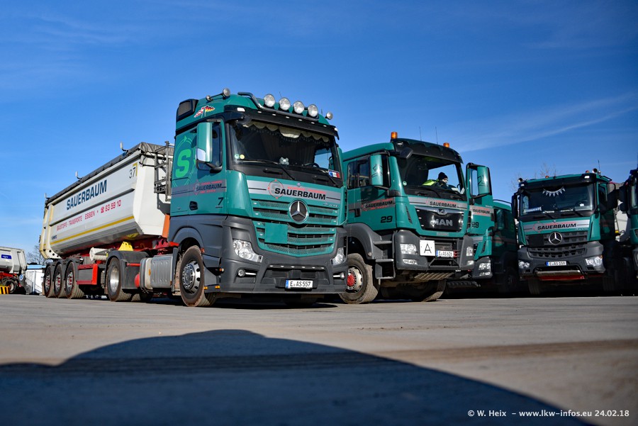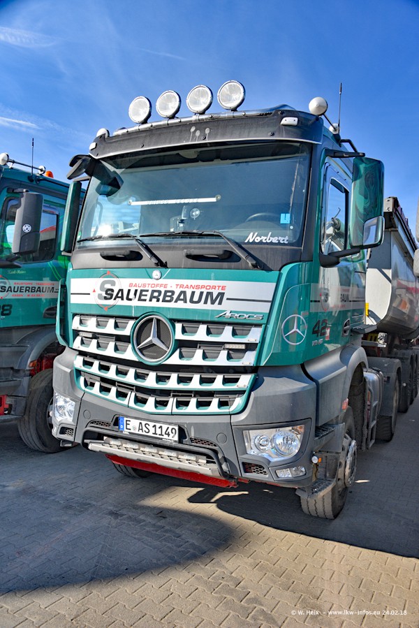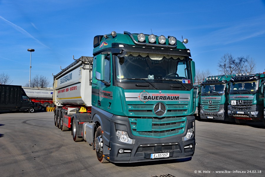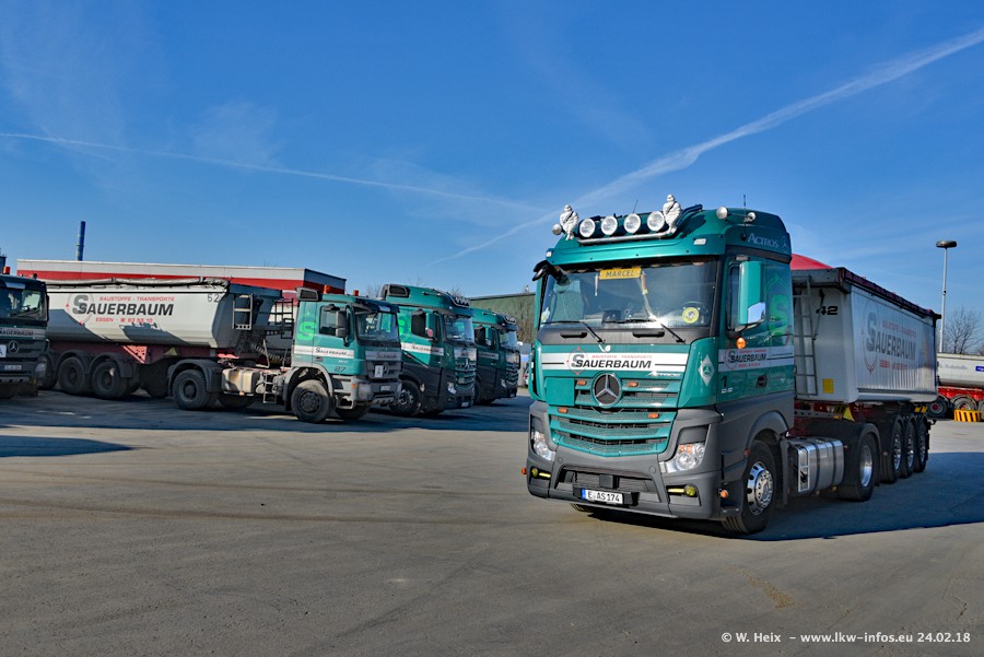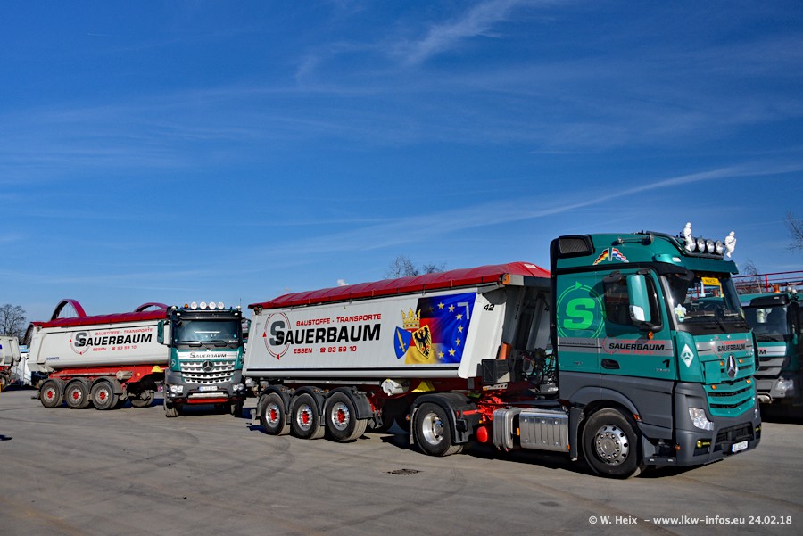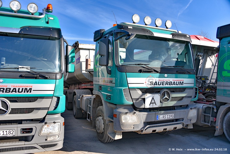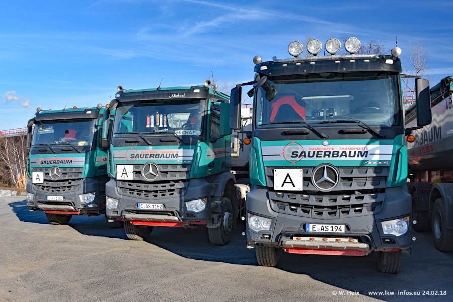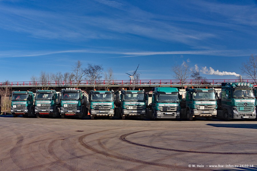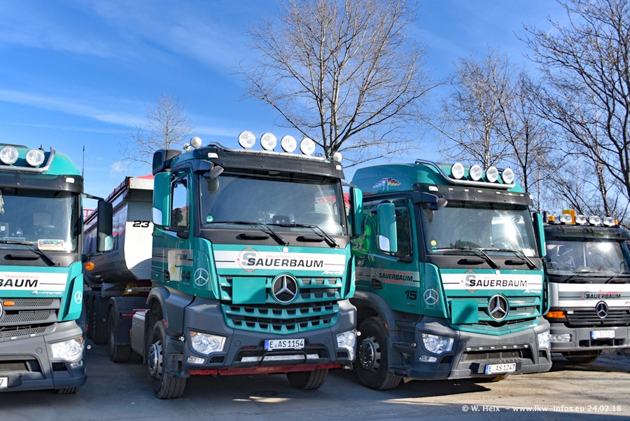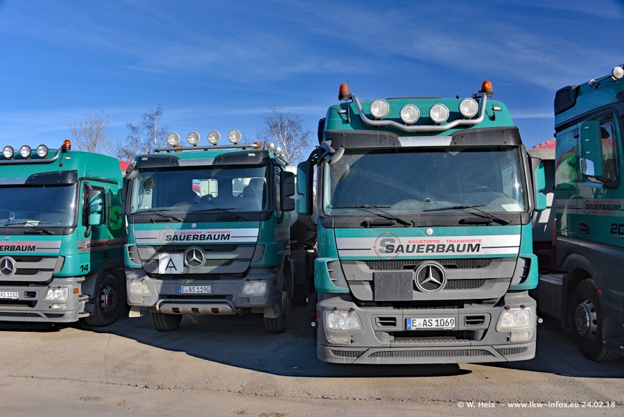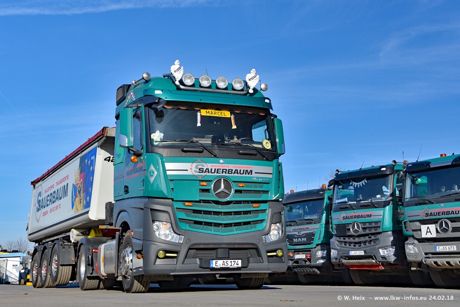 Der Fuhrpark von Sauerbaum besteht aus rund 50 LKW. Das sind 2 MAN TGS Euro 6 und alle anderen Fahrzeuge sind von Mercedes-Benz: Actros 3 und 4 sowie Arocs bei den Allrad-Zugmaschinen.