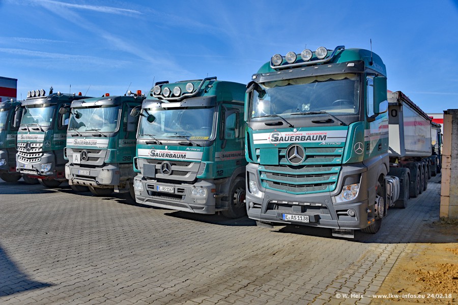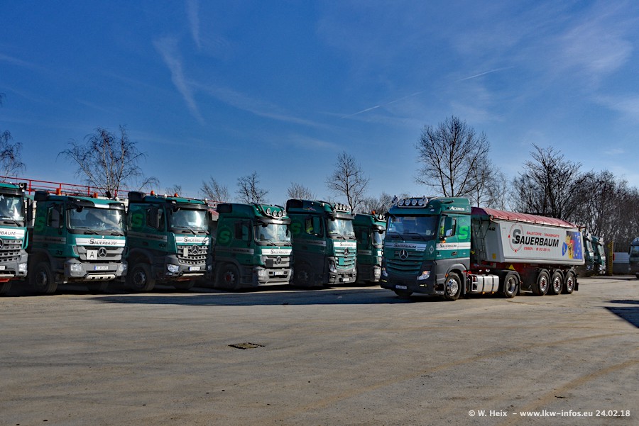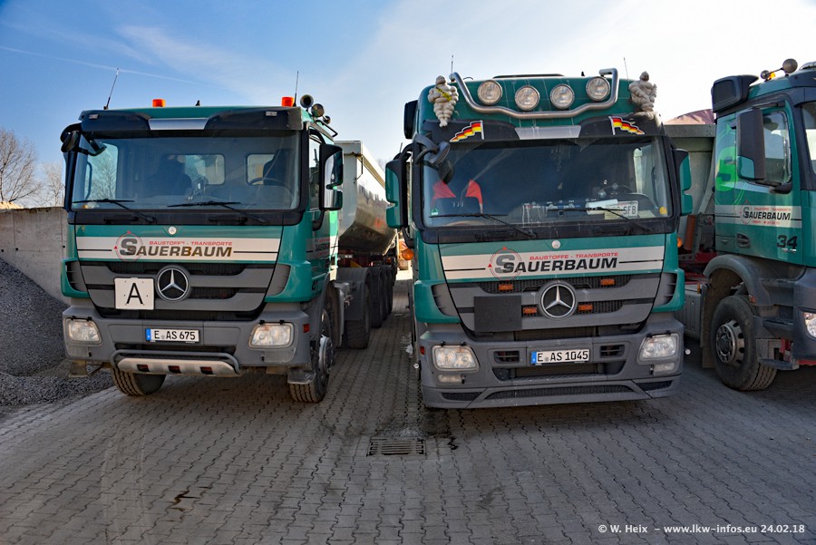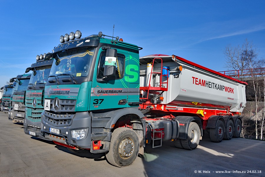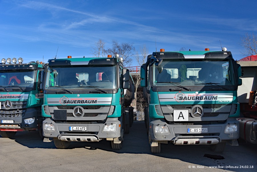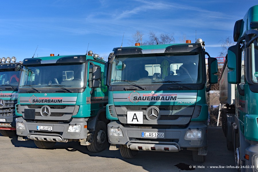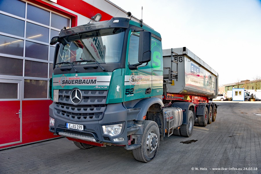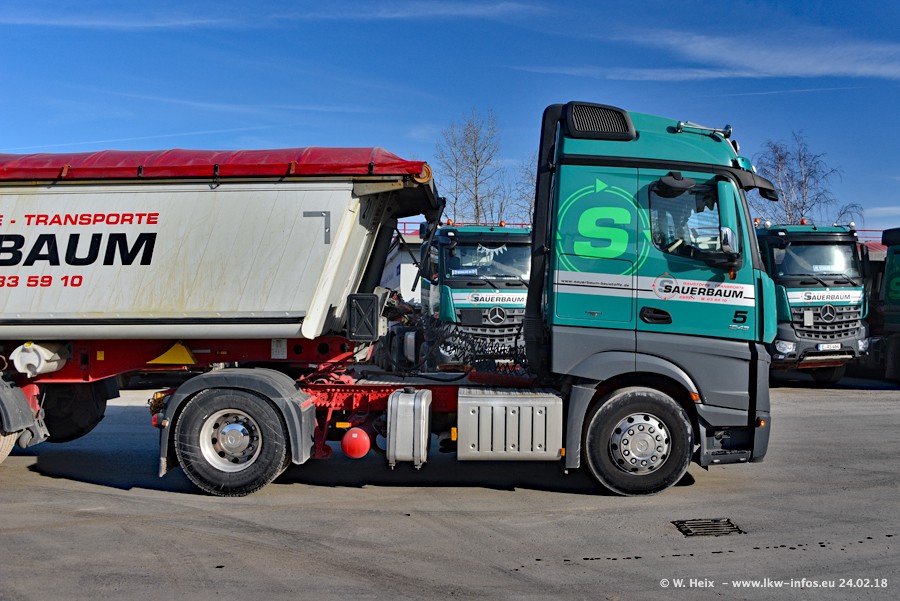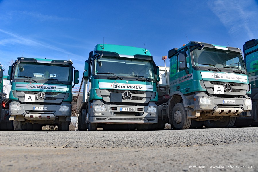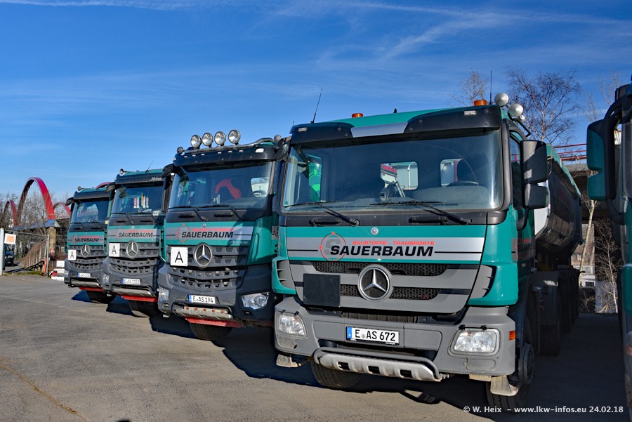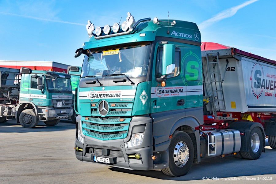 Der Fuhrpark von Sauerbaum besteht aus rund 50 LKW. Das sind 2 MAN TGS Euro 6 und alle anderen Fahrzeuge sind von Mercedes-Benz: Actros 3 und 4 sowie Arocs bei den Allrad-Zugmaschinen.