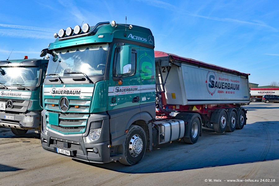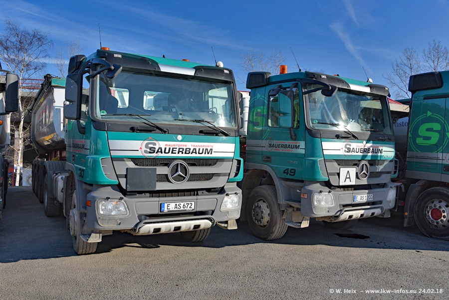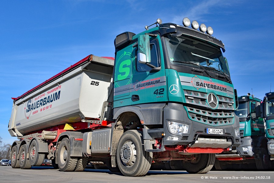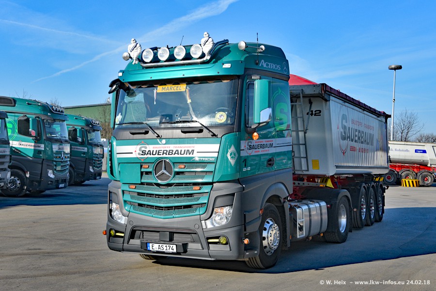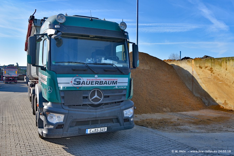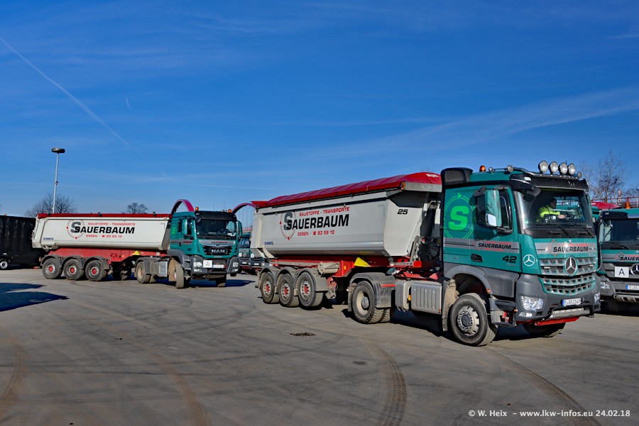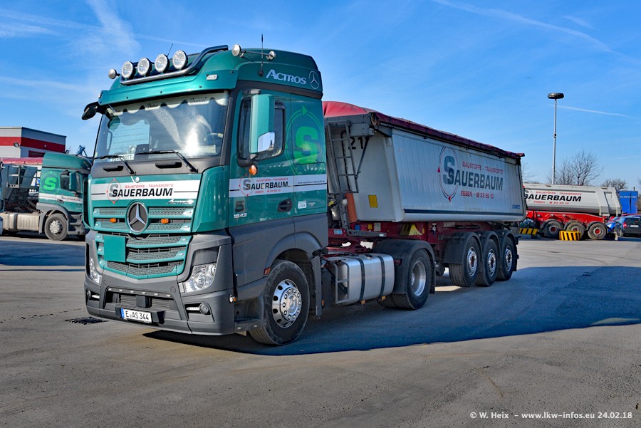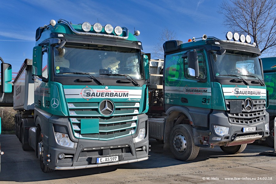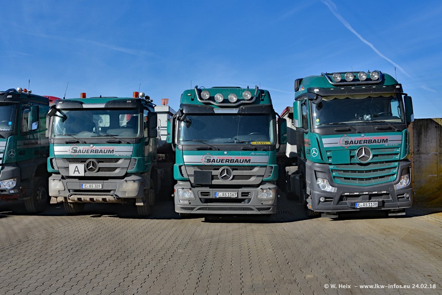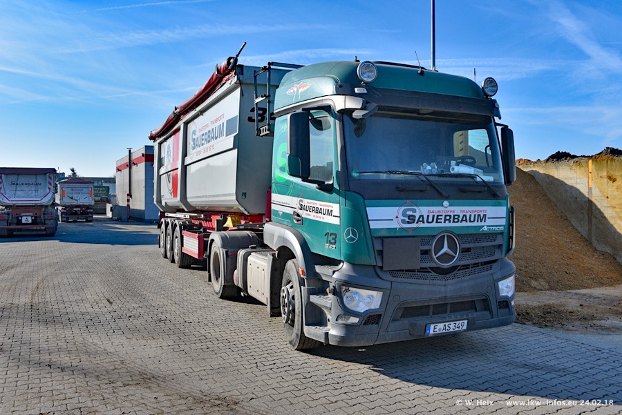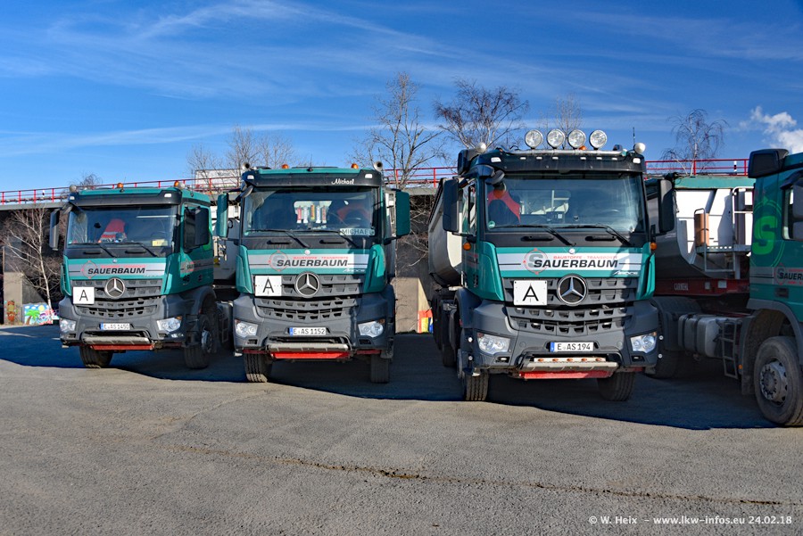 Der Fuhrpark von Sauerbaum besteht aus rund 50 LKW. Das sind 2 MAN TGS Euro 6 und alle anderen Fahrzeuge sind von Mercedes-Benz: Actros 3 und 4 sowie Arocs bei den Allrad-Zugmaschinen.