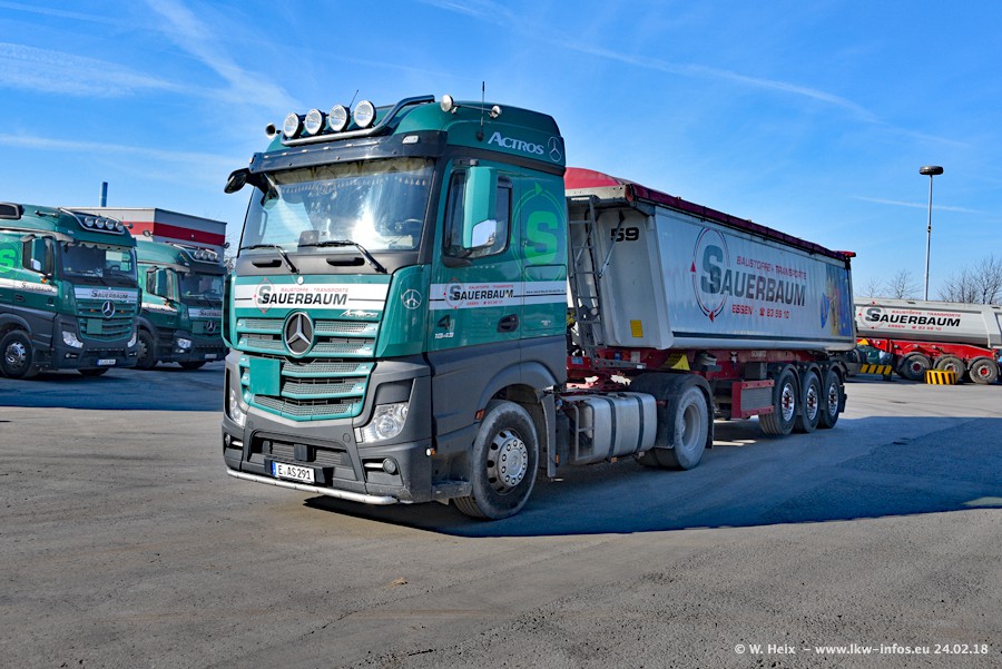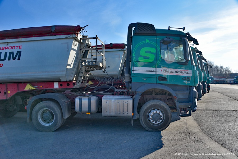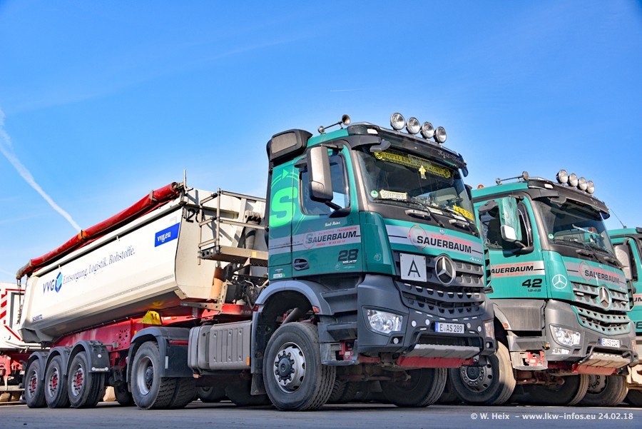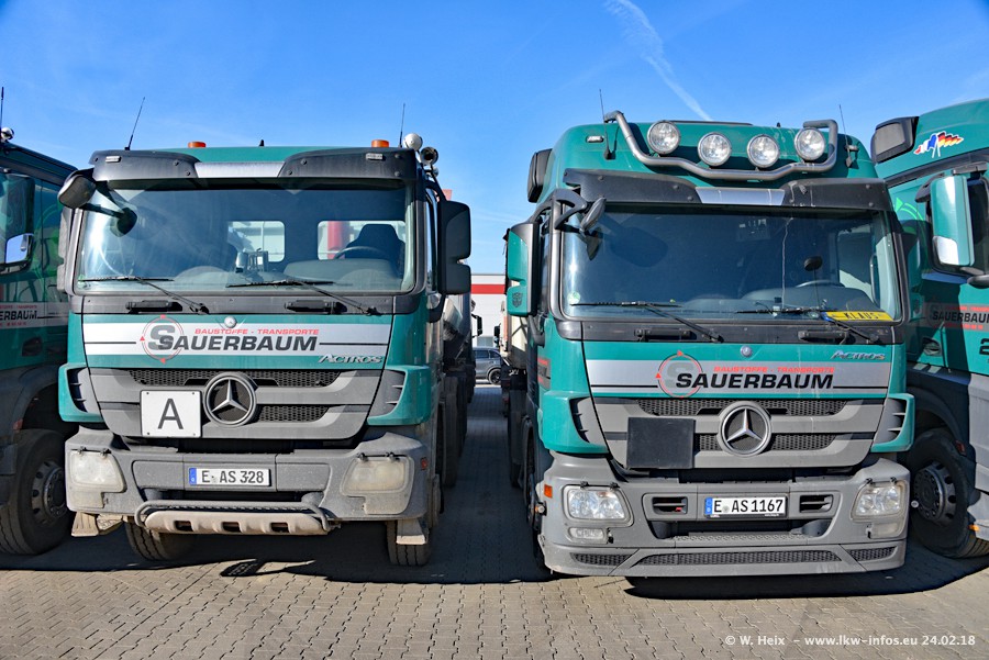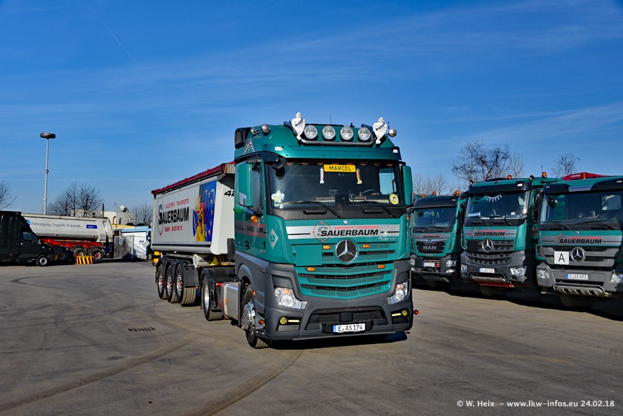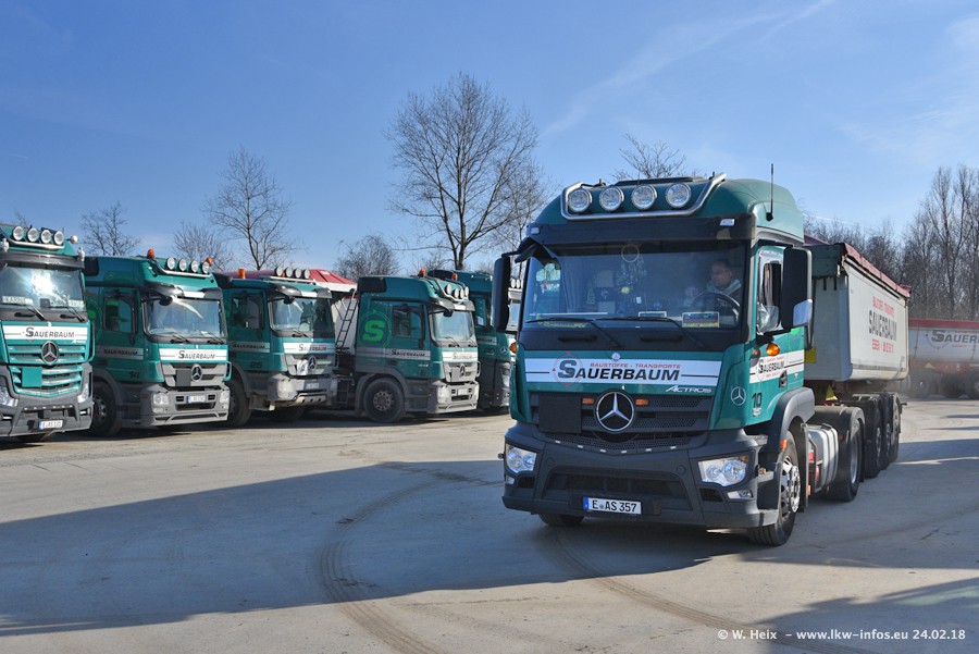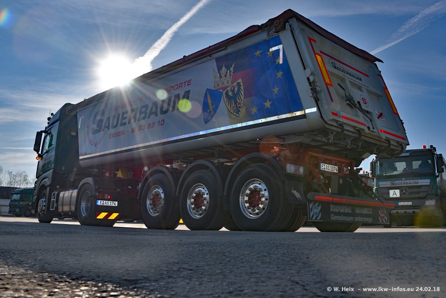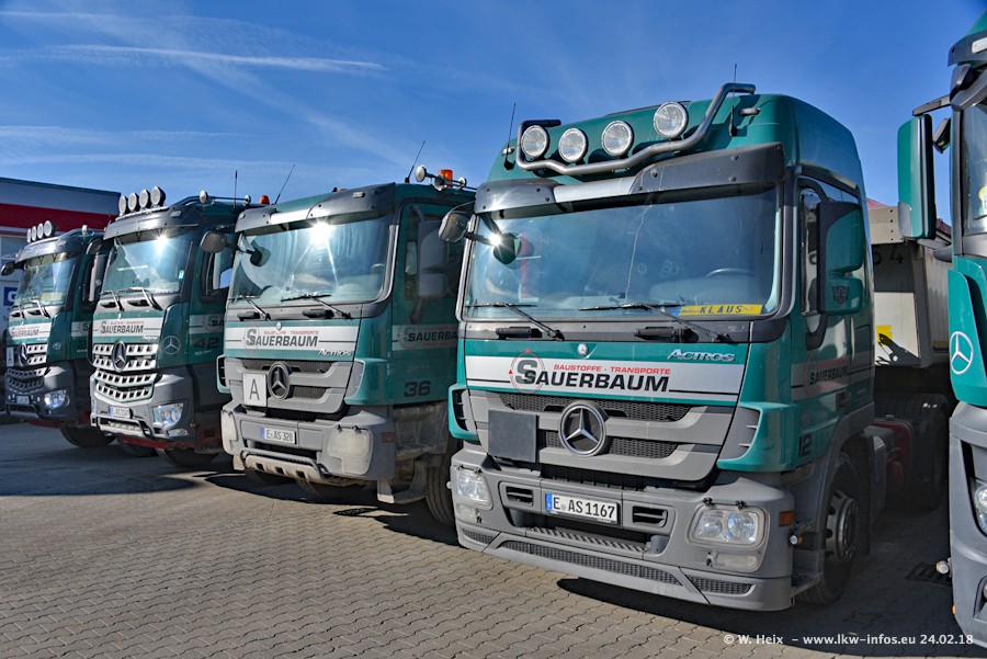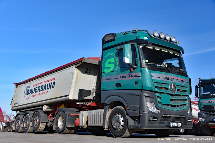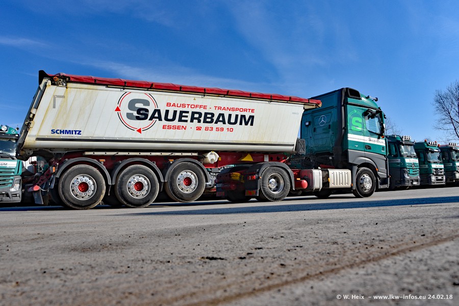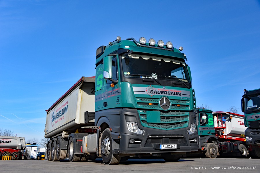 Der Fuhrpark von Sauerbaum besteht aus rund 50 LKW. Das sind 2 MAN TGS Euro 6 und alle anderen Fahrzeuge sind von Mercedes-Benz: Actros 3 und 4 sowie Arocs bei den Allrad-Zugmaschinen.