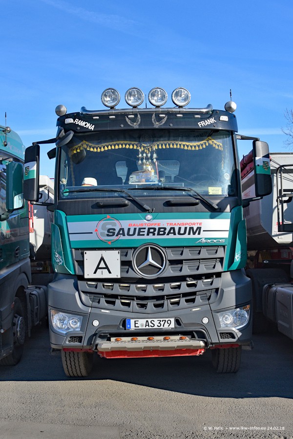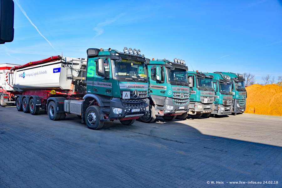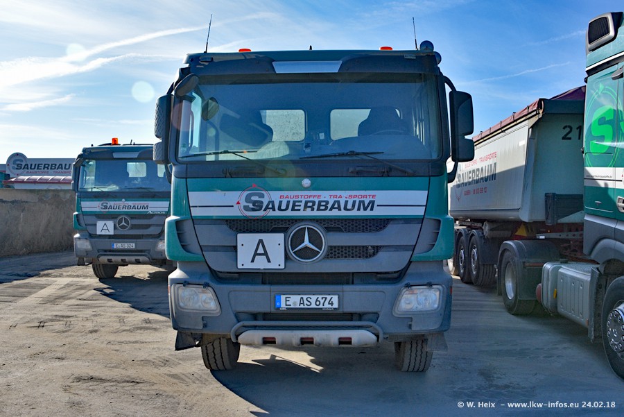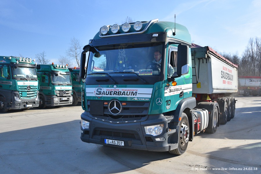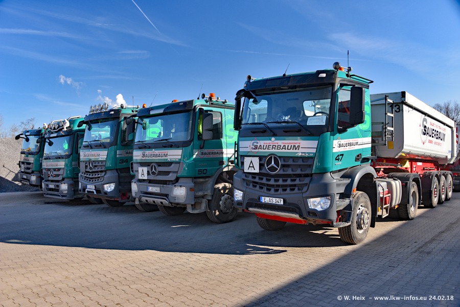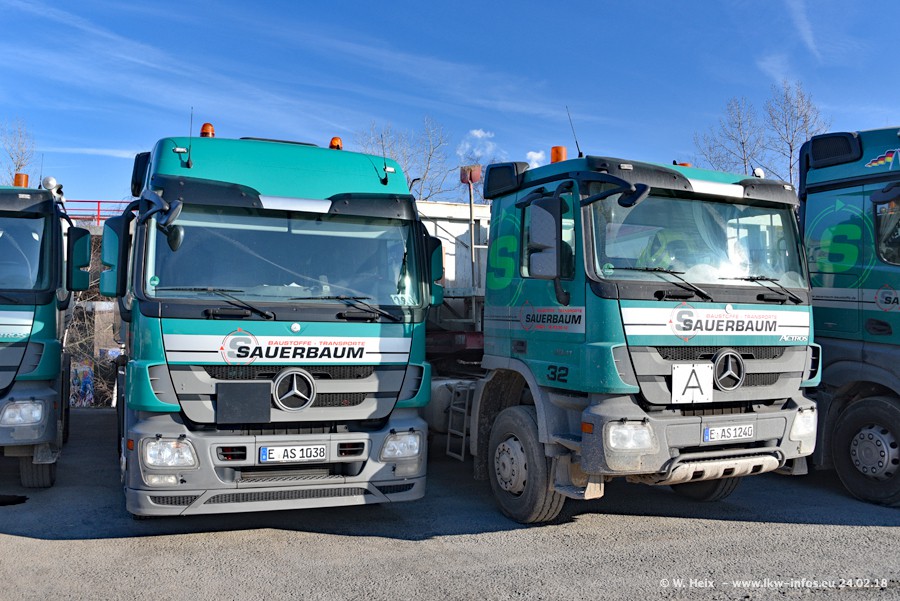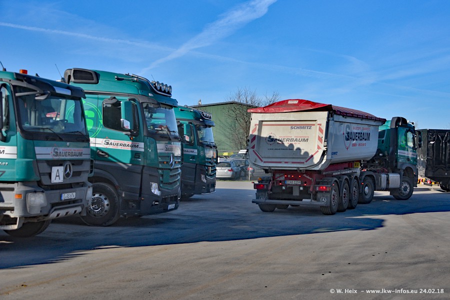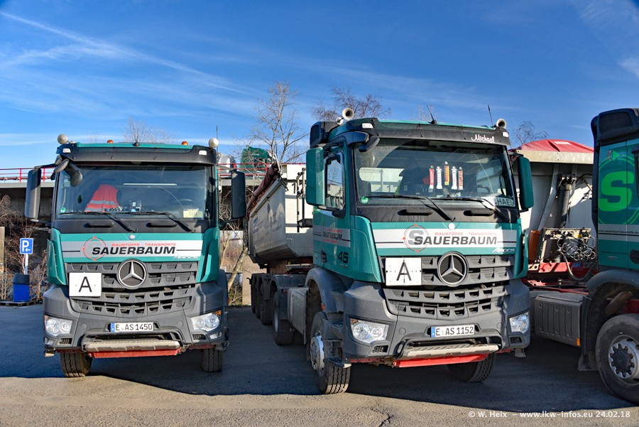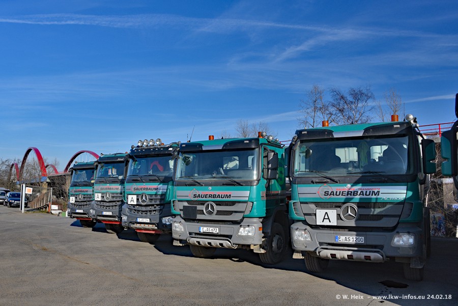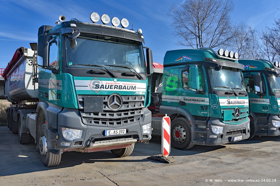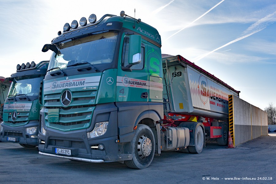 Der Fuhrpark von Sauerbaum besteht aus rund 50 LKW. Das sind 2 MAN TGS Euro 6 und alle anderen Fahrzeuge sind von Mercedes-Benz: Actros 3 und 4 sowie Arocs bei den Allrad-Zugmaschinen.