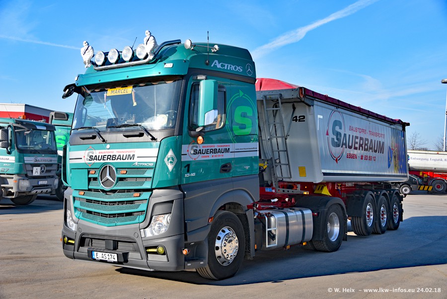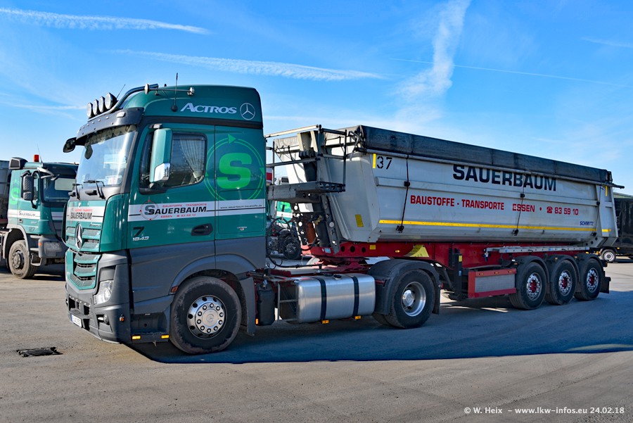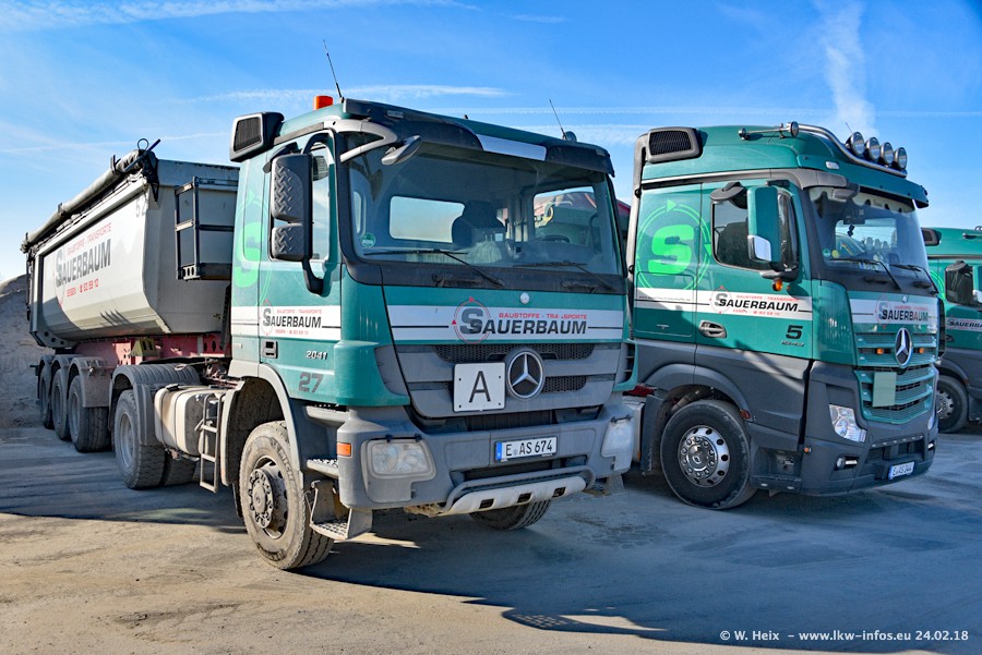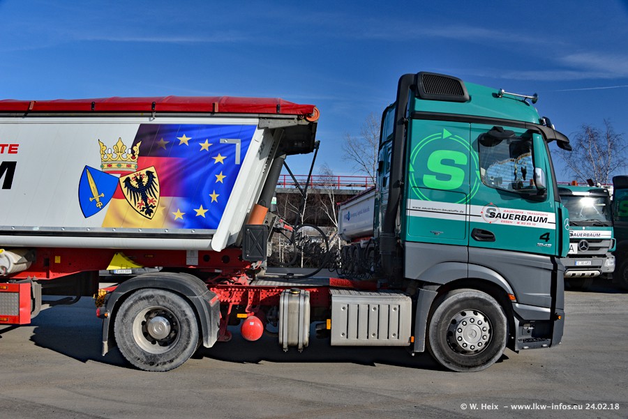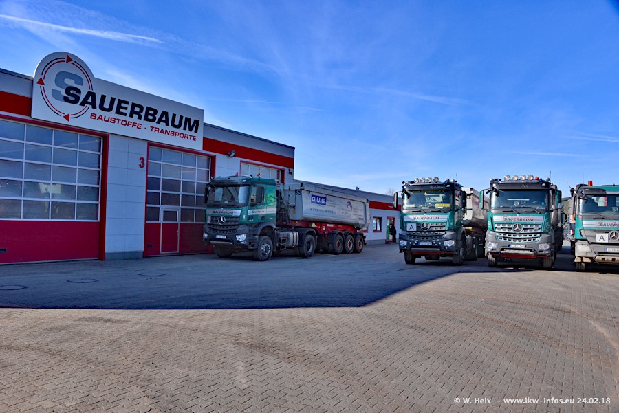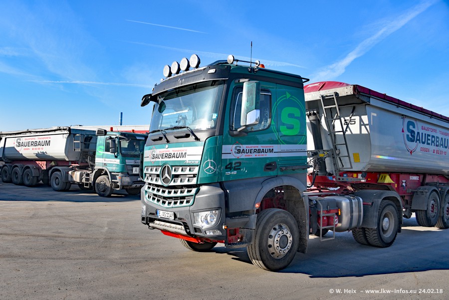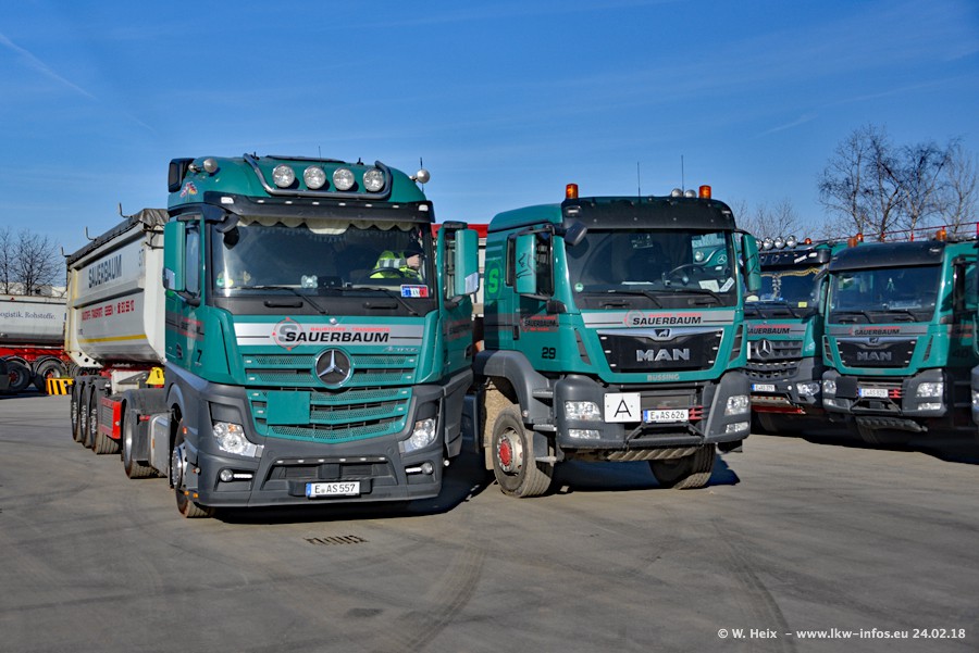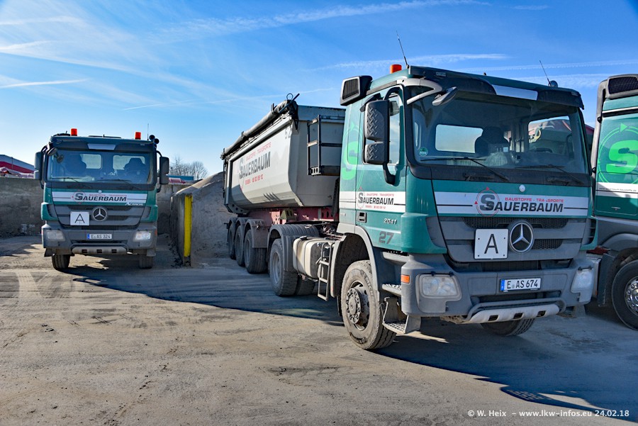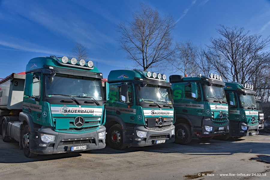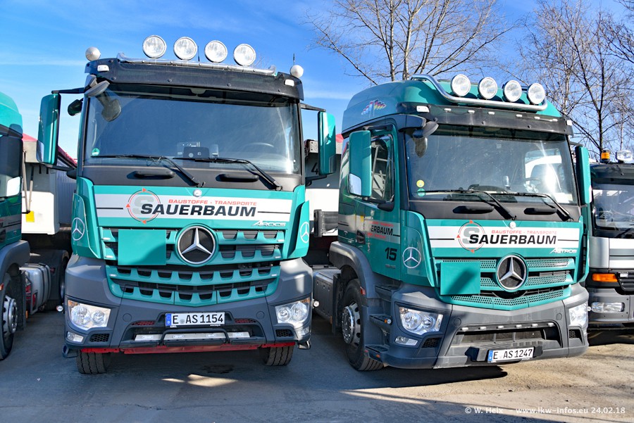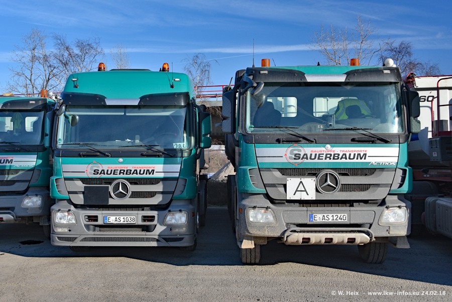 Der Fuhrpark von Sauerbaum besteht aus rund 50 LKW. Das sind 2 MAN TGS Euro 6 und alle anderen Fahrzeuge sind von Mercedes-Benz: Actros 3 und 4 sowie Arocs bei den Allrad-Zugmaschinen.