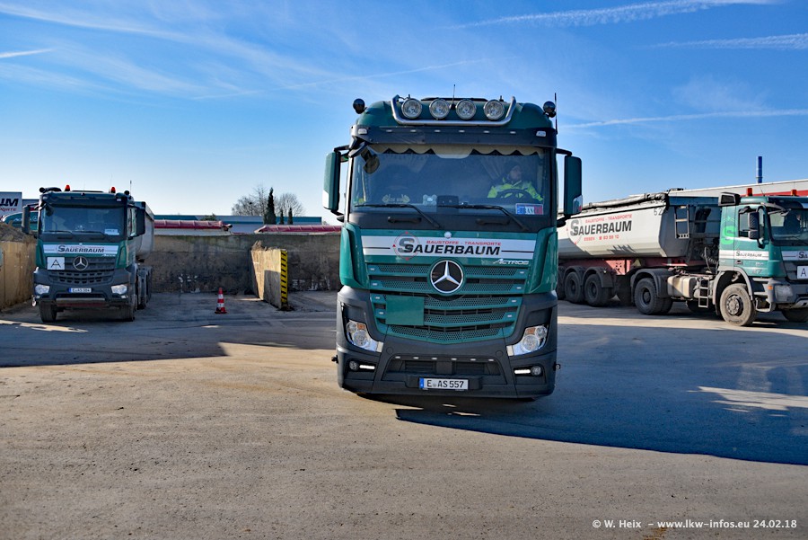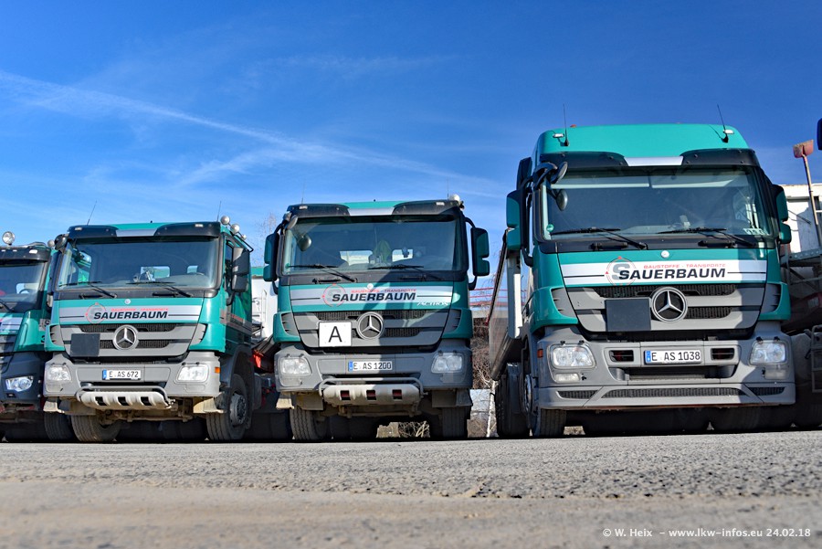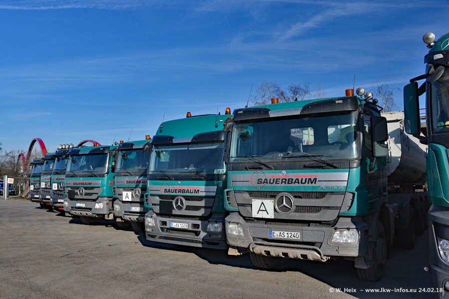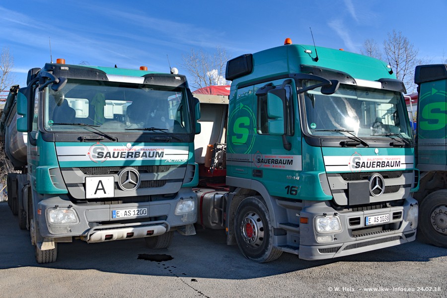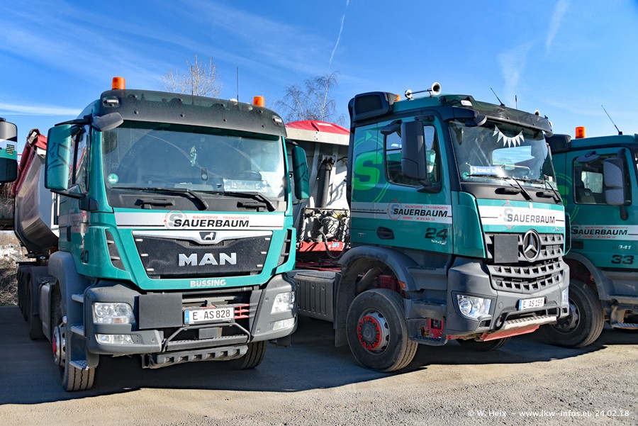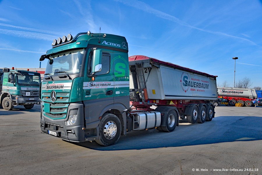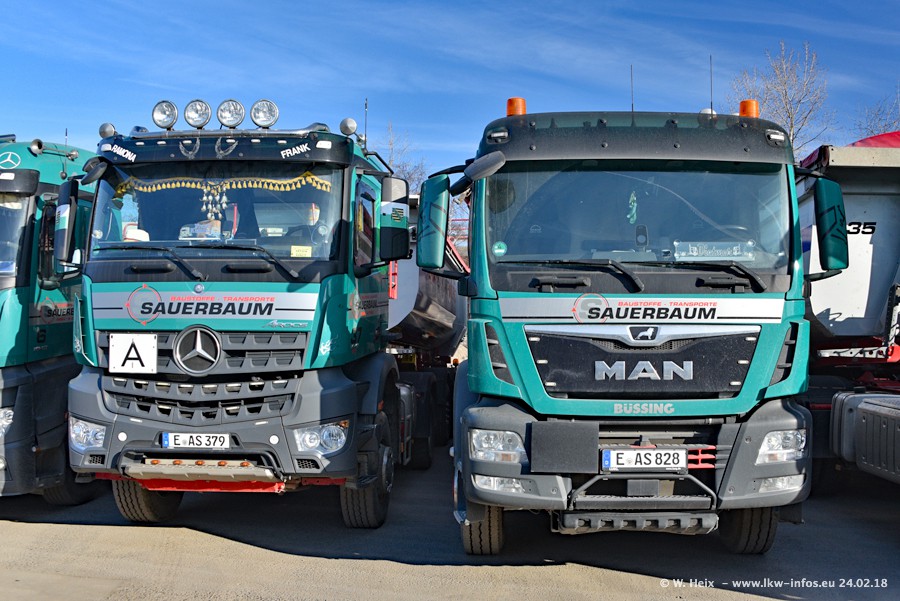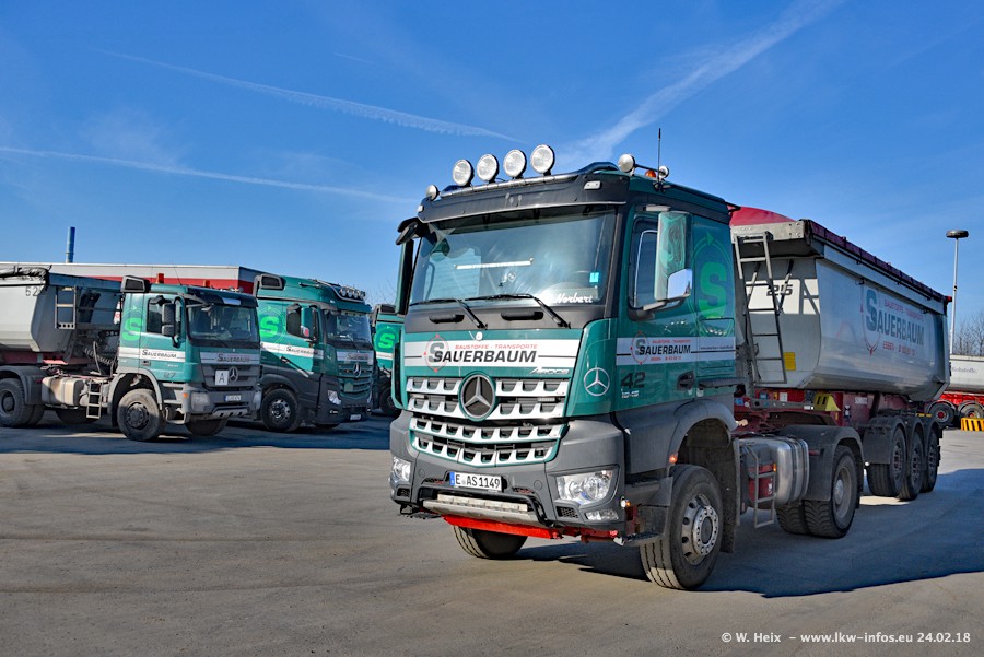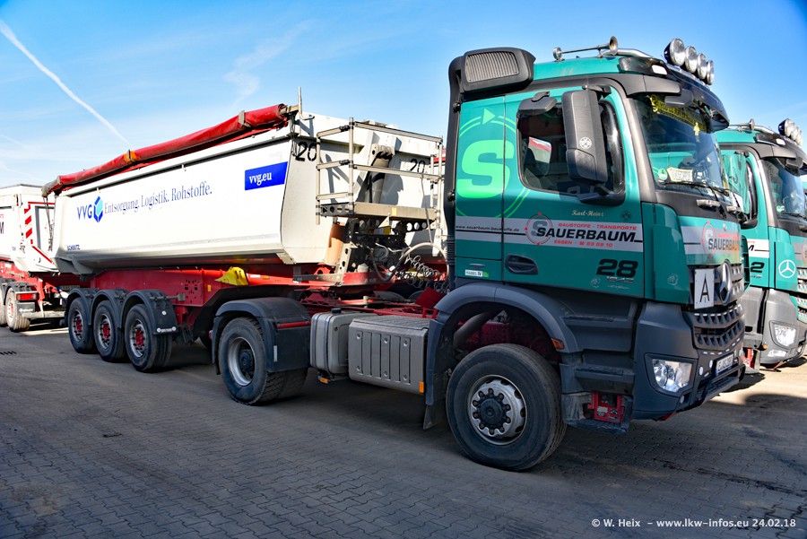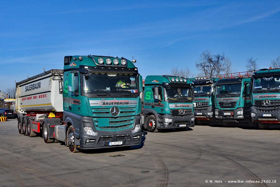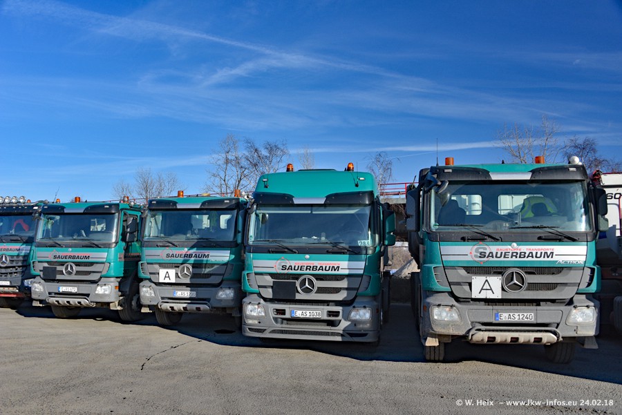 Der Fuhrpark von Sauerbaum besteht aus rund 50 LKW. Das sind 2 MAN TGS Euro 6 und alle anderen Fahrzeuge sind von Mercedes-Benz: Actros 3 und 4 sowie Arocs bei den Allrad-Zugmaschinen.
