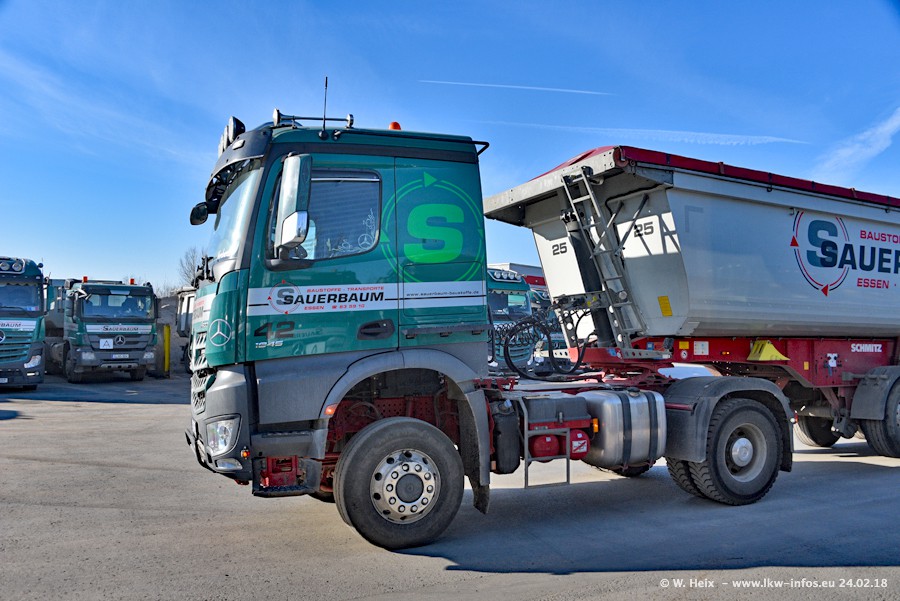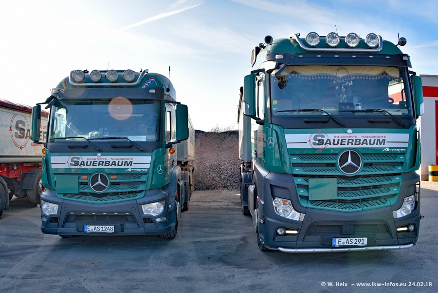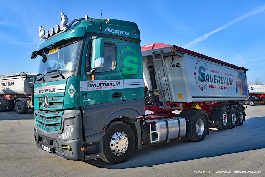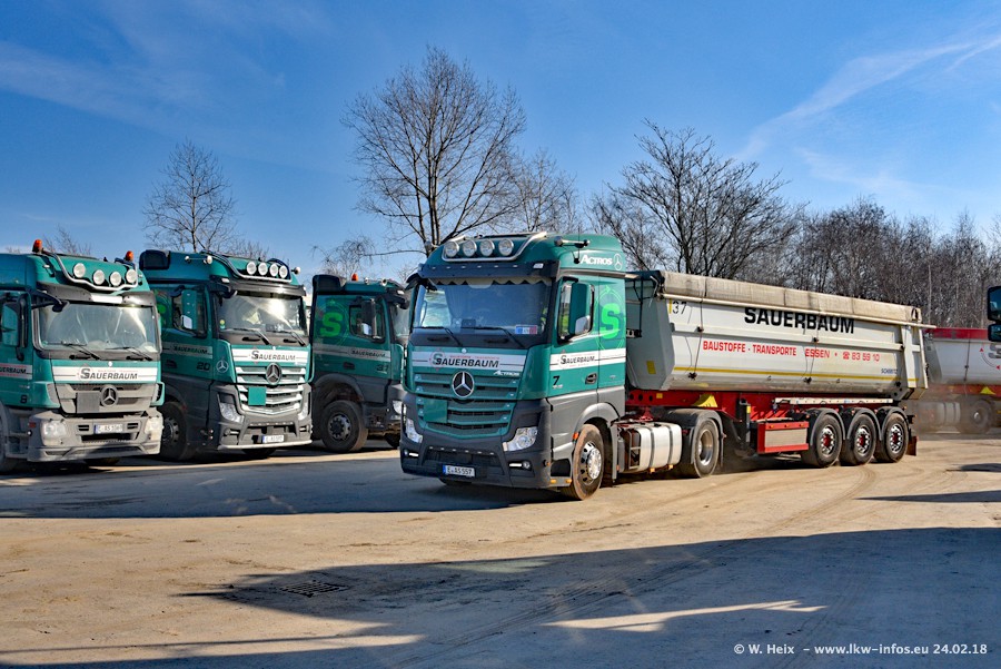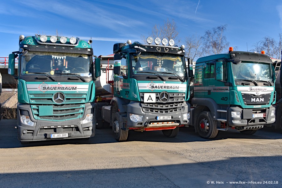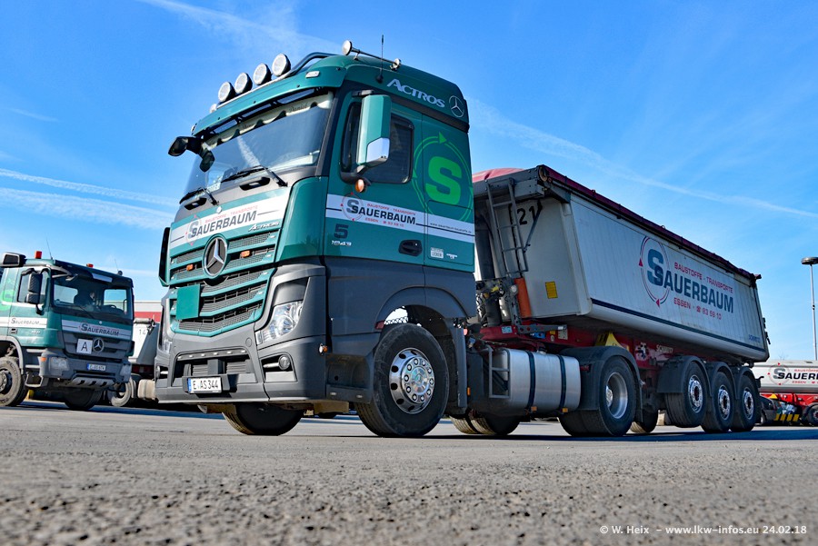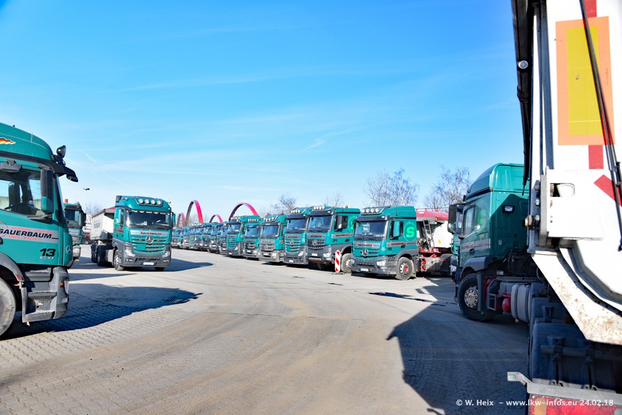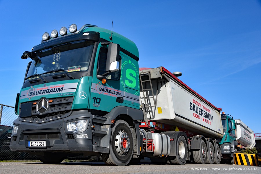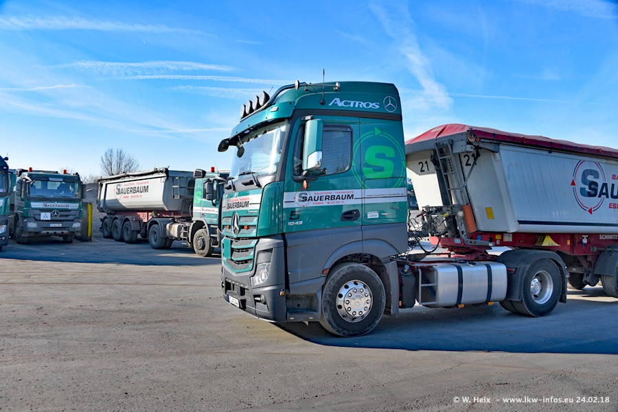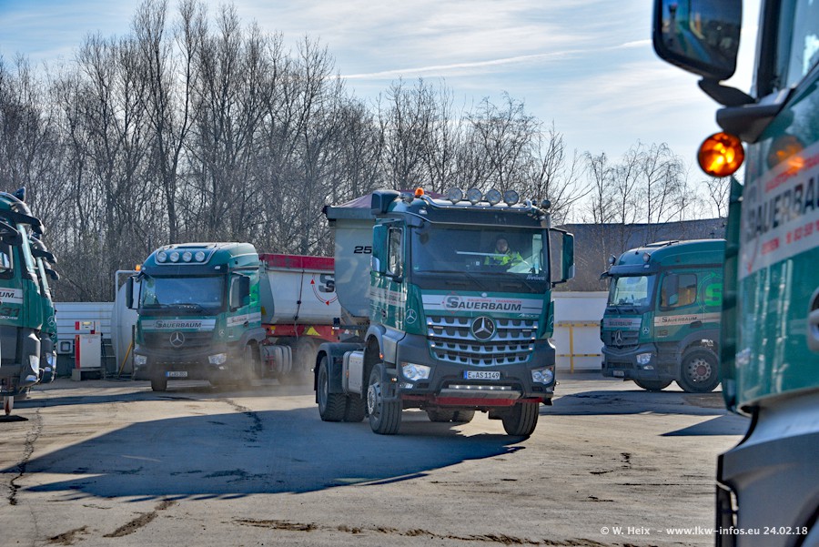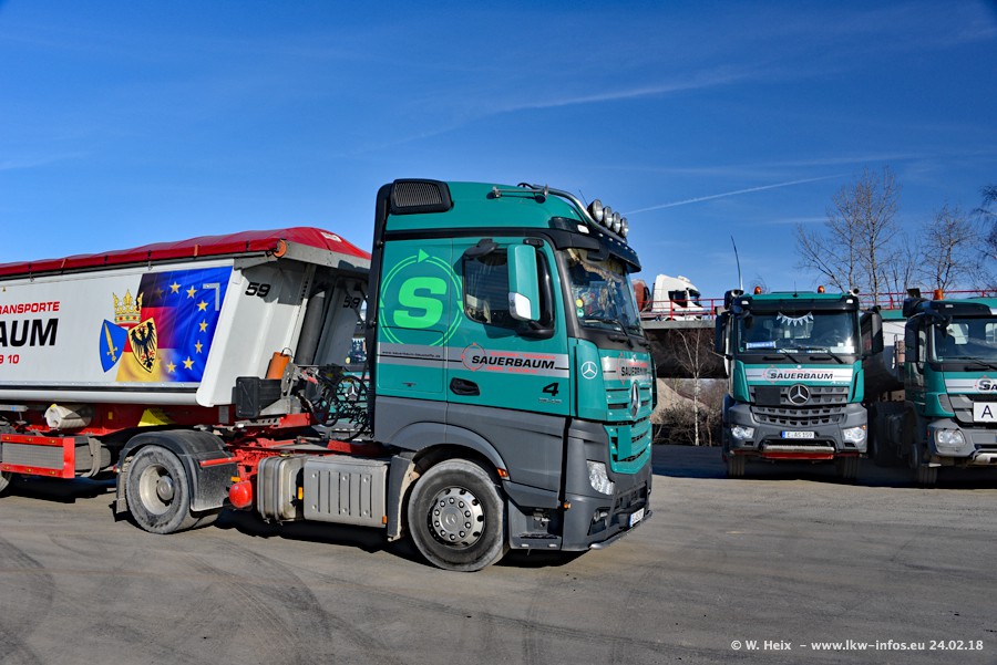 Der Fuhrpark von Sauerbaum besteht aus rund 50 LKW. Das sind 2 MAN TGS Euro 6 und alle anderen Fahrzeuge sind von Mercedes-Benz: Actros 3 und 4 sowie Arocs bei den Allrad-Zugmaschinen.