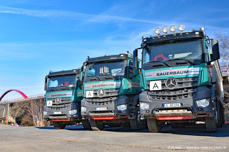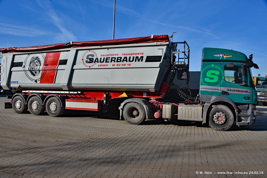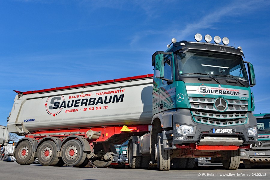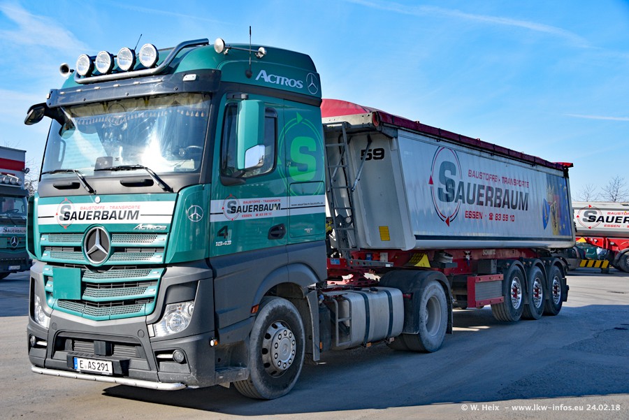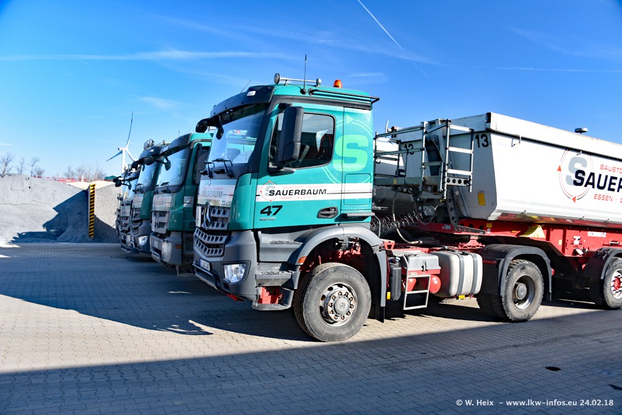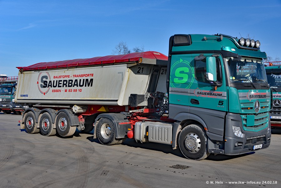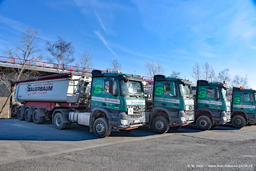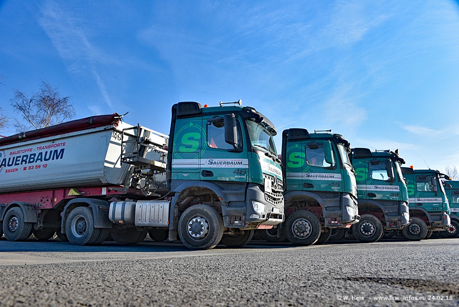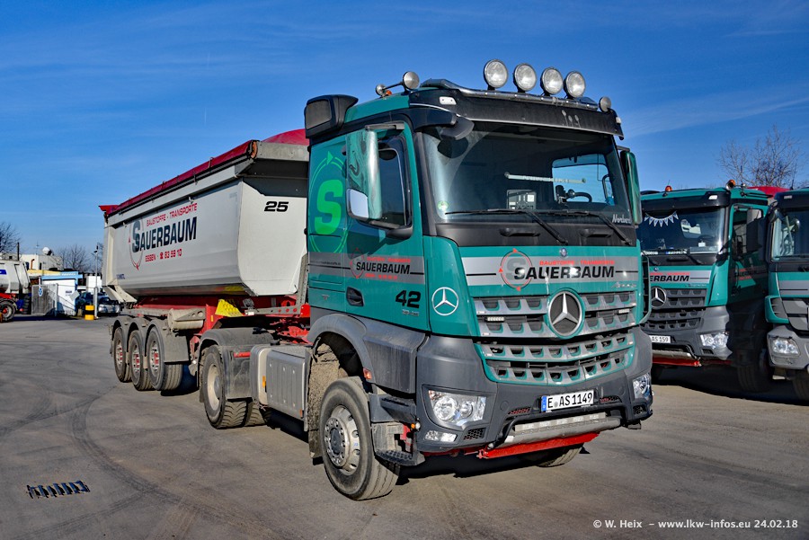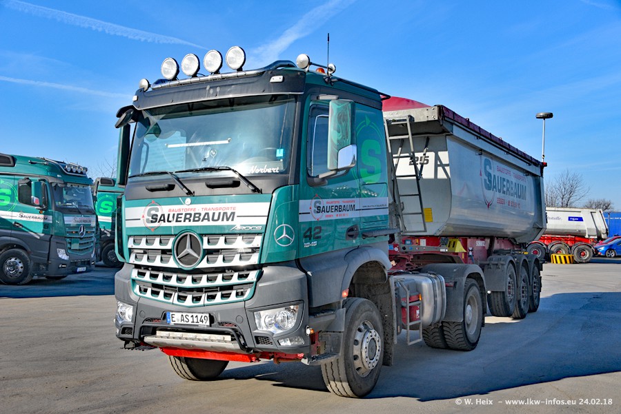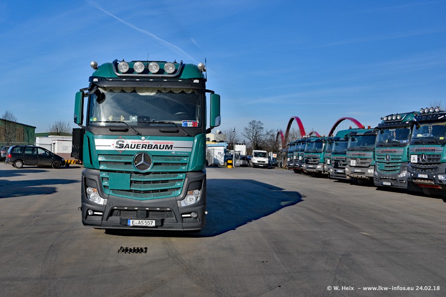 Der Fuhrpark von Sauerbaum besteht aus rund 50 LKW. Das sind 2 MAN TGS Euro 6 und alle anderen Fahrzeuge sind von Mercedes-Benz: Actros 3 und 4 sowie Arocs bei den Allrad-Zugmaschinen.