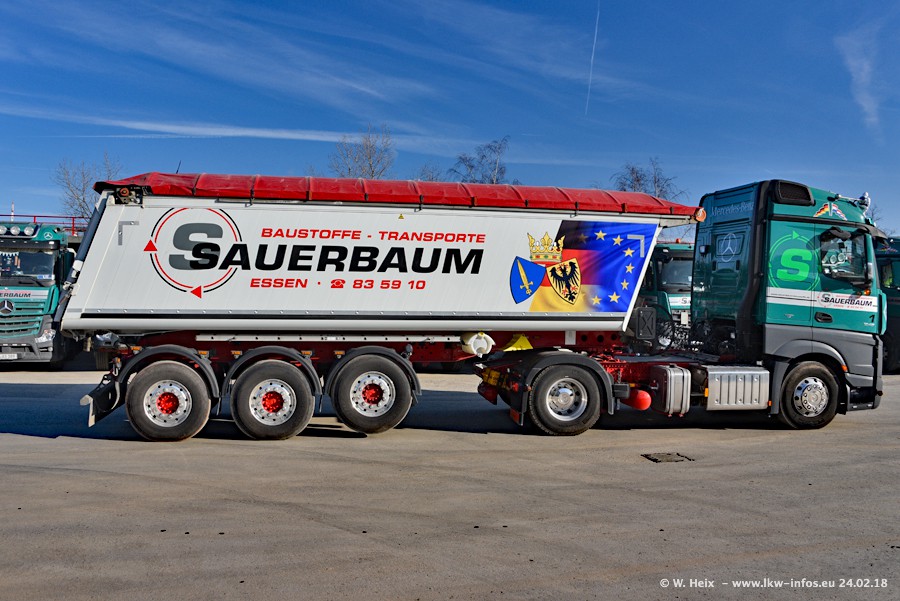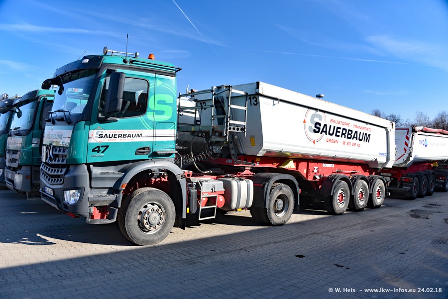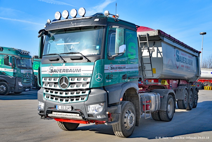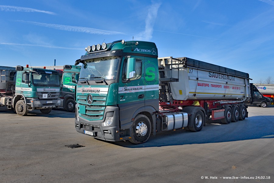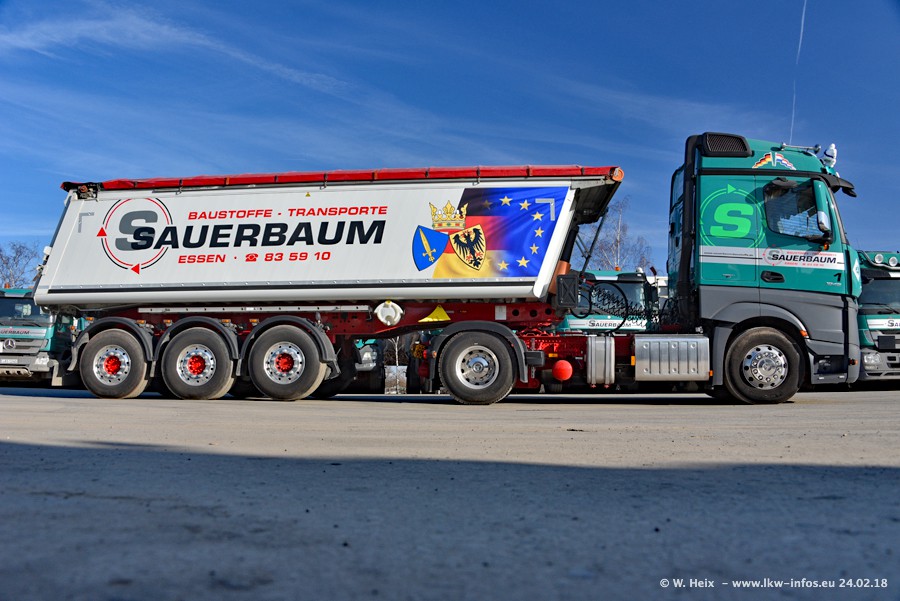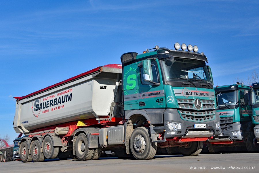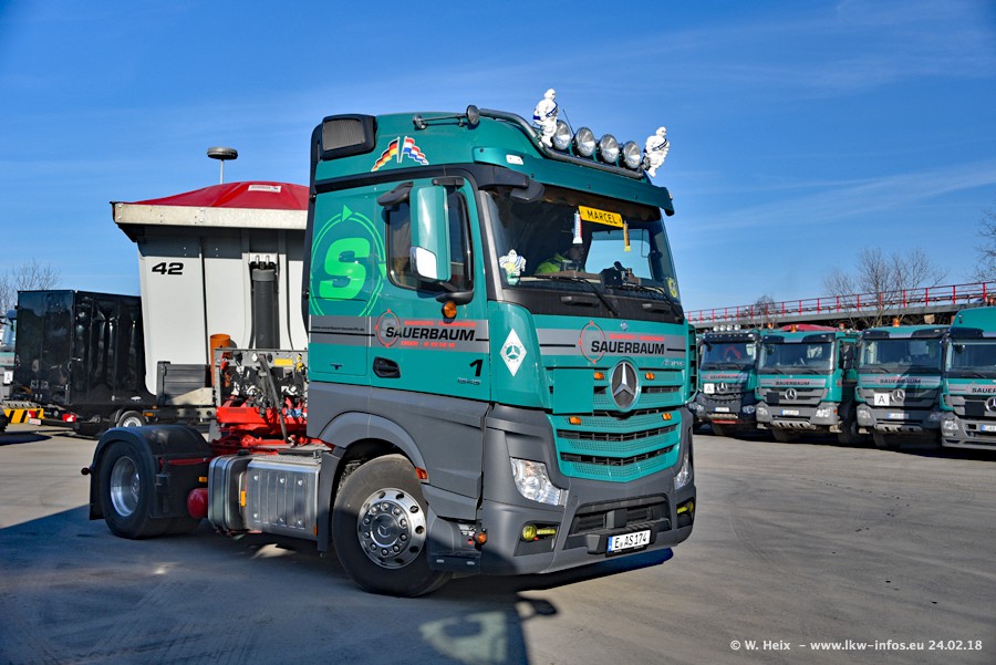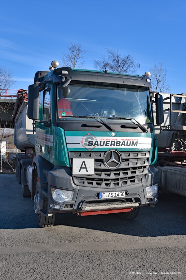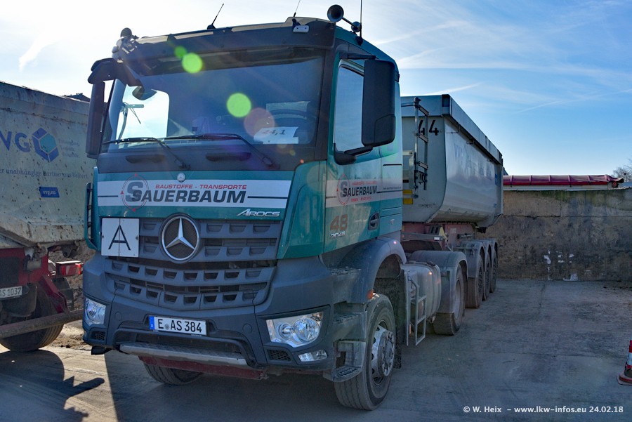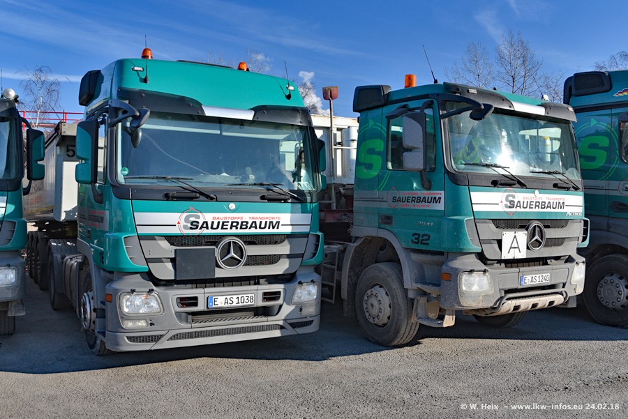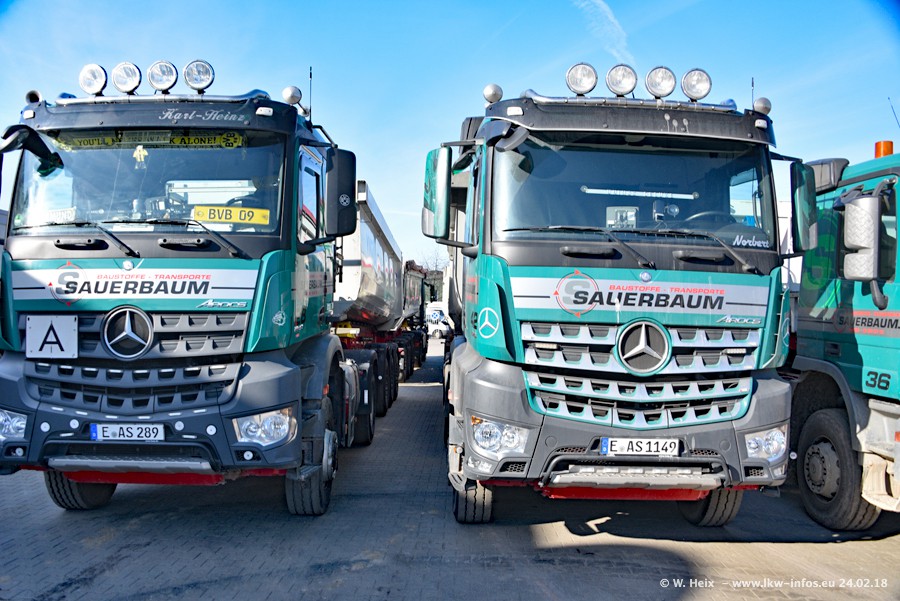 Der Fuhrpark von Sauerbaum besteht aus rund 50 LKW. Das sind 2 MAN TGS Euro 6 und alle anderen Fahrzeuge sind von Mercedes-Benz: Actros 3 und 4 sowie Arocs bei den Allrad-Zugmaschinen.