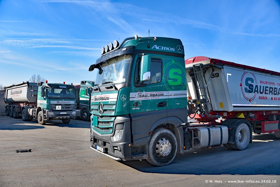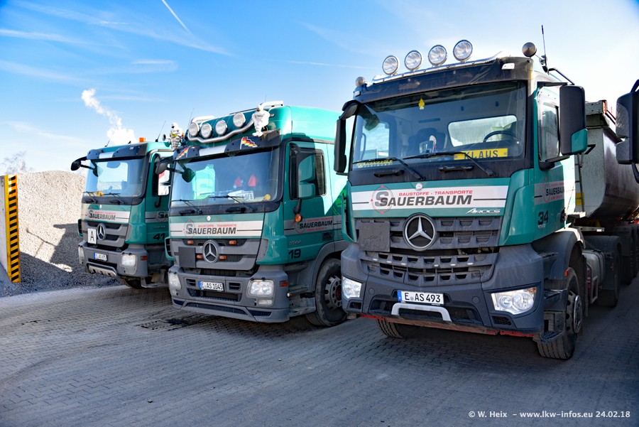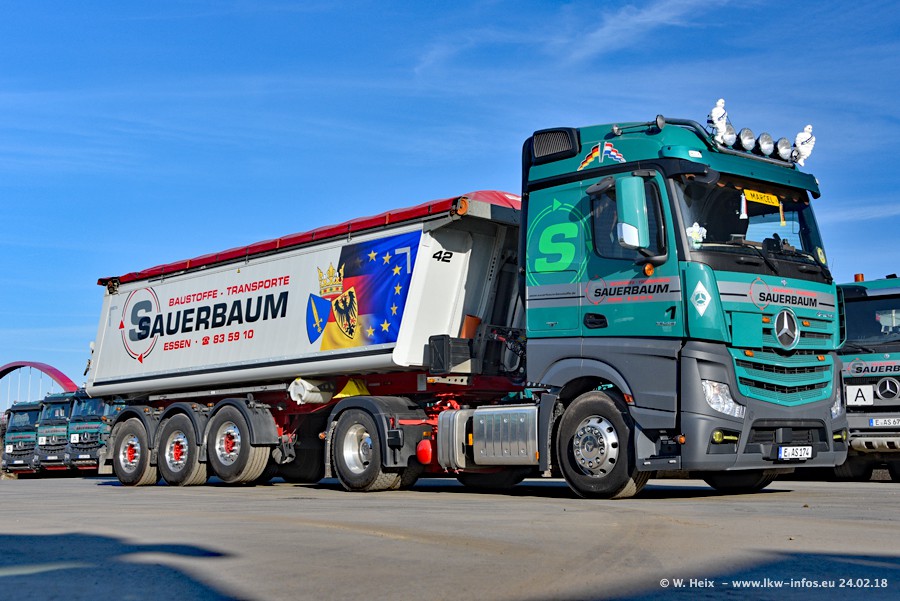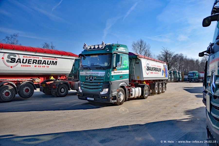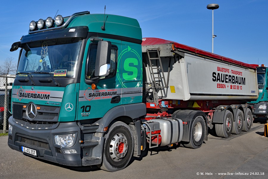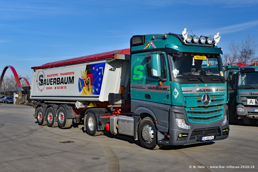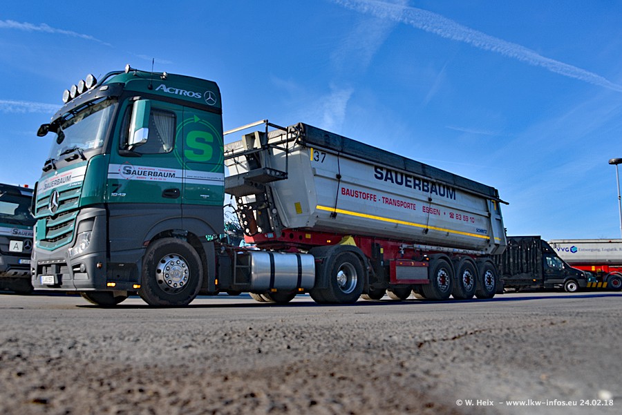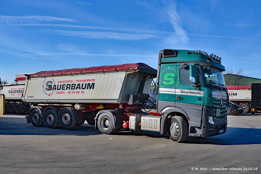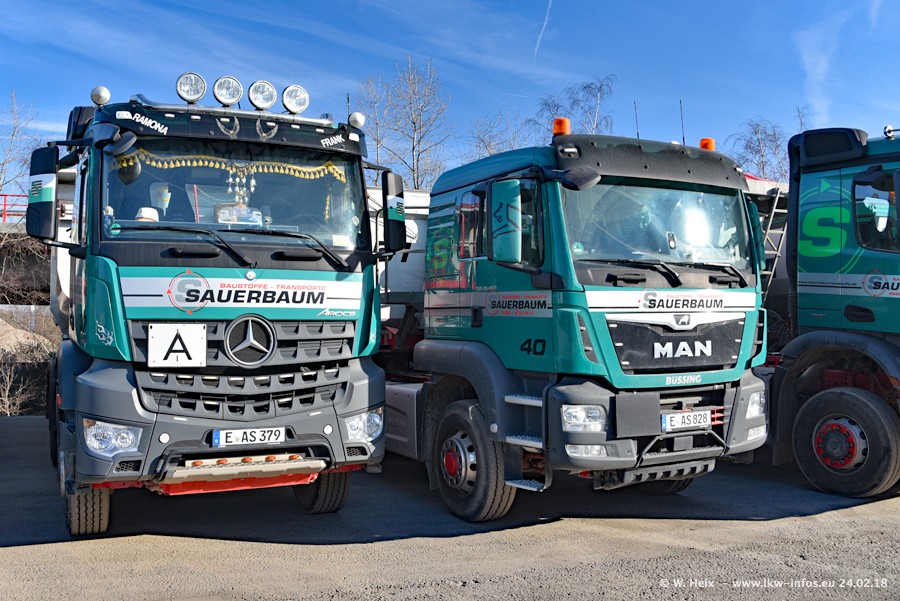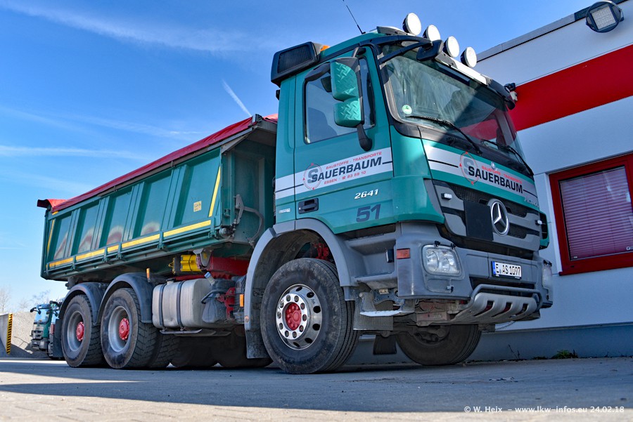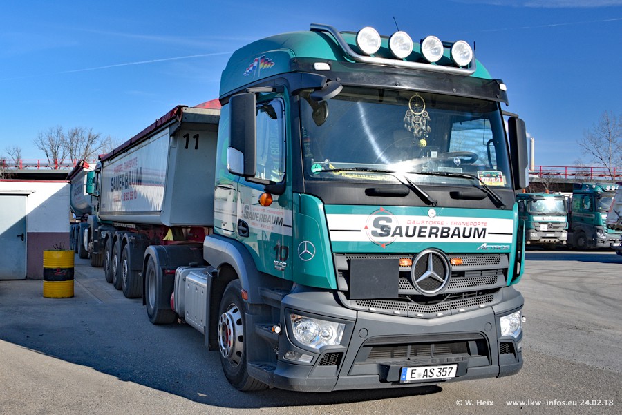 Der Fuhrpark von Sauerbaum besteht aus rund 50 LKW. Das sind 2 MAN TGS Euro 6 und alle anderen Fahrzeuge sind von Mercedes-Benz: Actros 3 und 4 sowie Arocs bei den Allrad-Zugmaschinen.