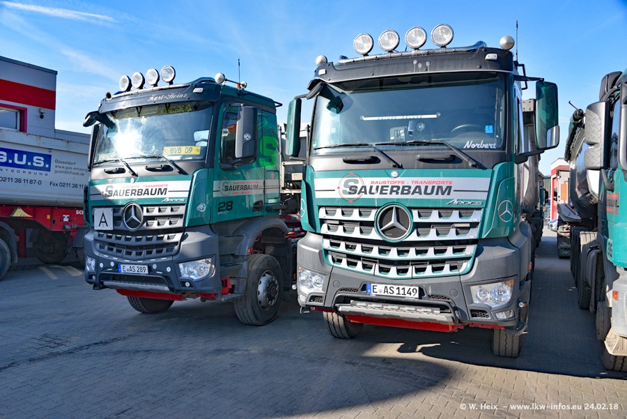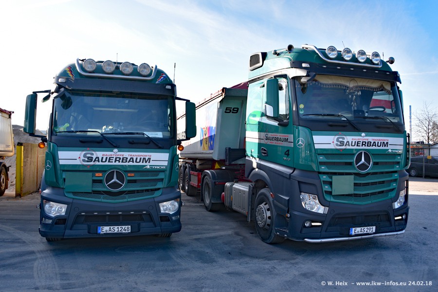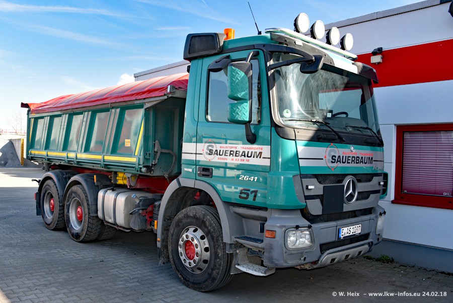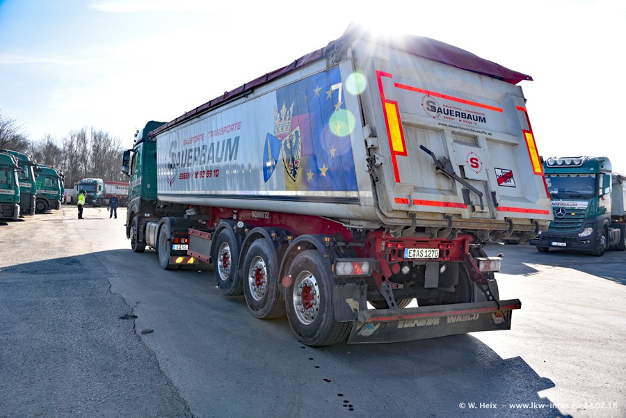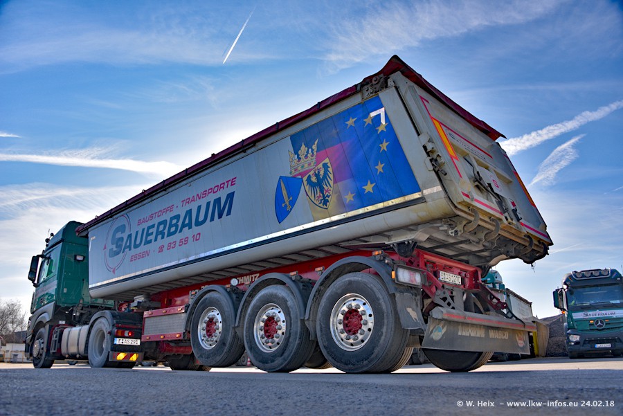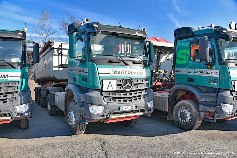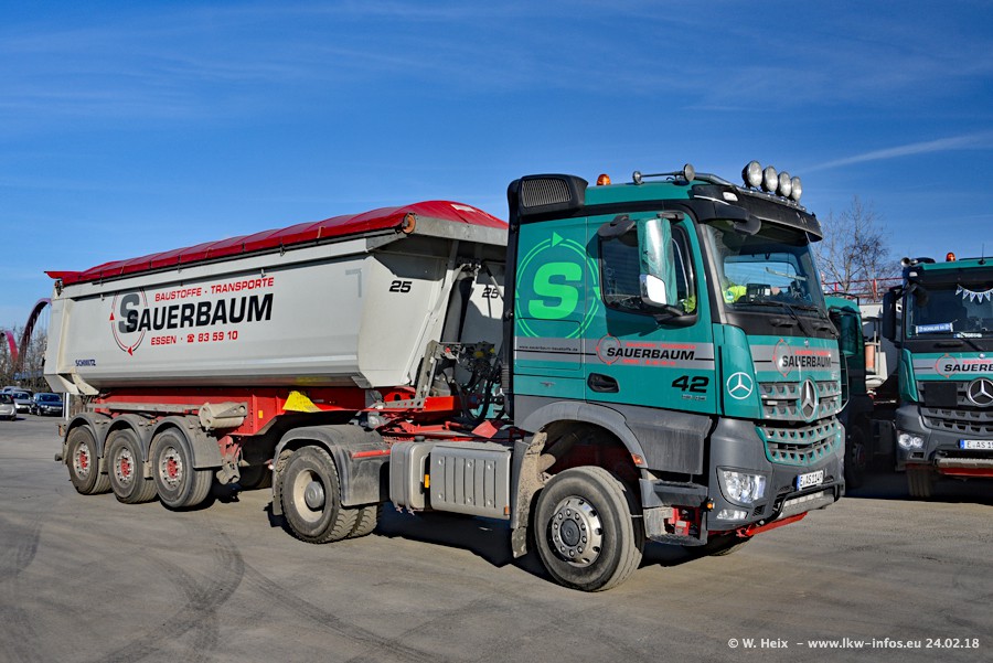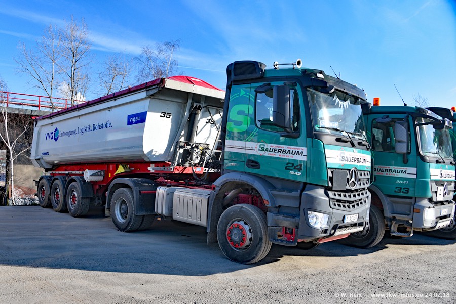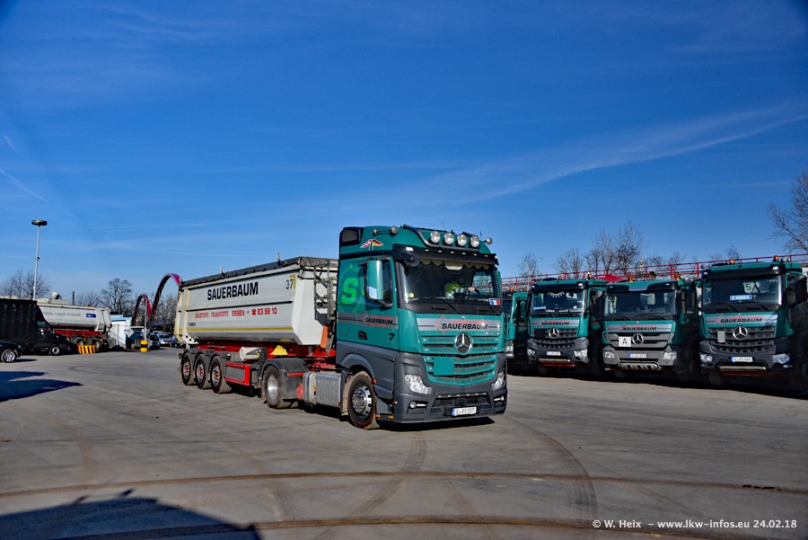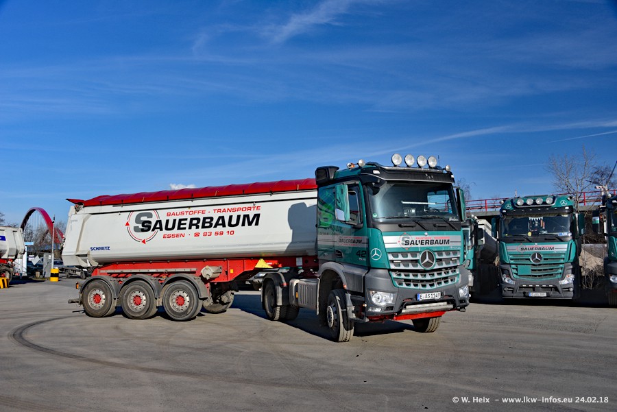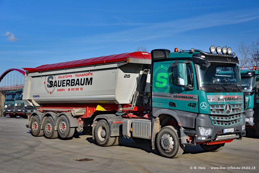 Der Fuhrpark von Sauerbaum besteht aus rund 50 LKW. Das sind 2 MAN TGS Euro 6 und alle anderen Fahrzeuge sind von Mercedes-Benz: Actros 3 und 4 sowie Arocs bei den Allrad-Zugmaschinen.