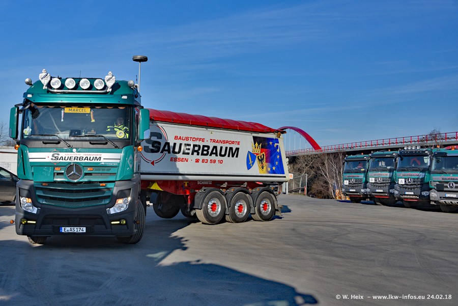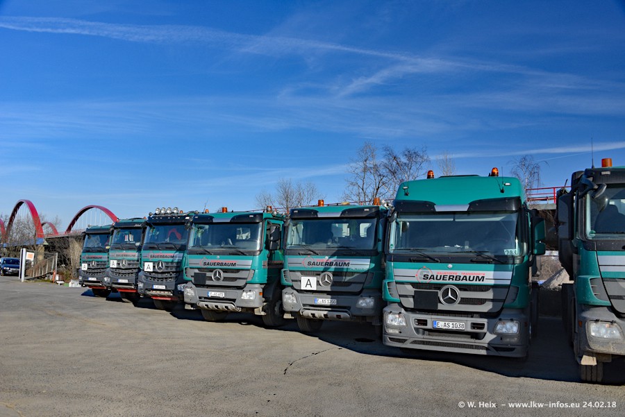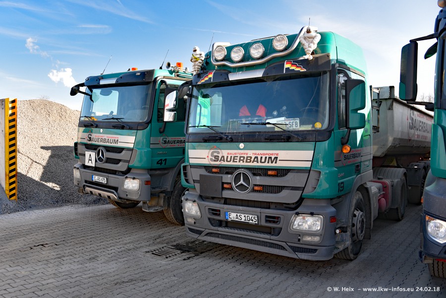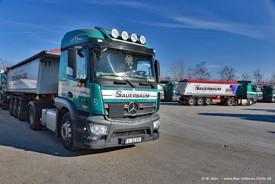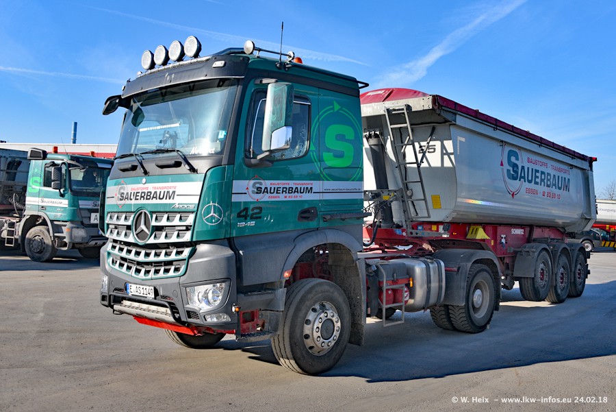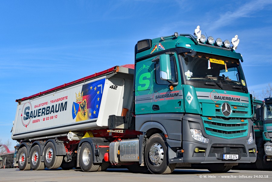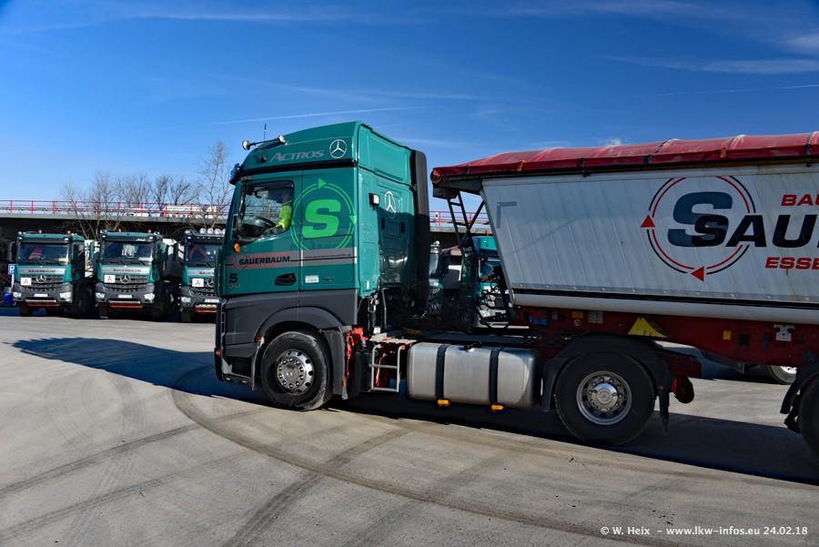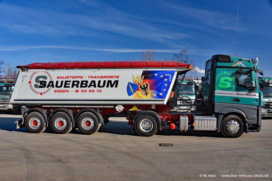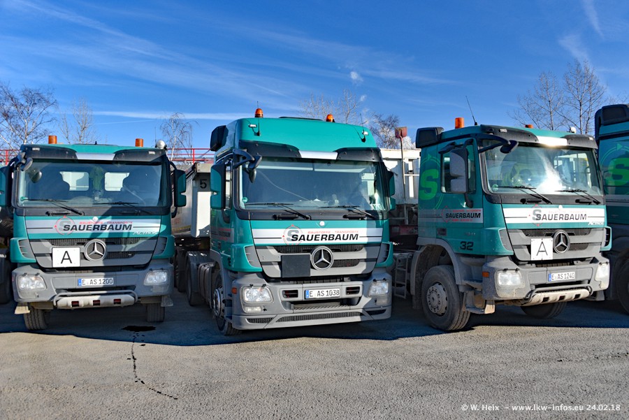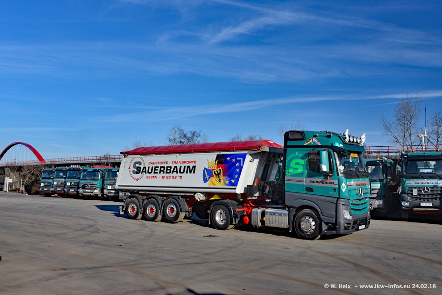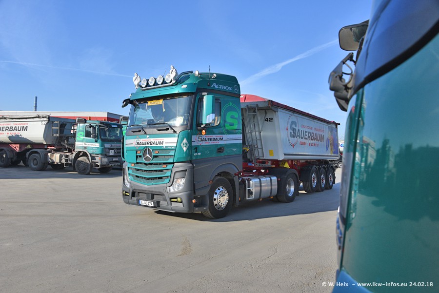 Der Fuhrpark von Sauerbaum besteht aus rund 50 LKW. Das sind 2 MAN TGS Euro 6 und alle anderen Fahrzeuge sind von Mercedes-Benz: Actros 3 und 4 sowie Arocs bei den Allrad-Zugmaschinen.