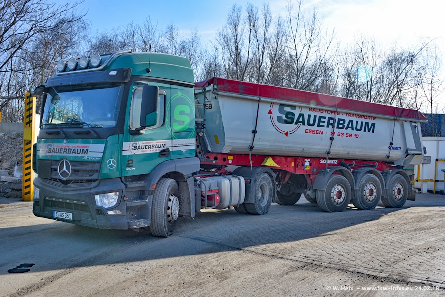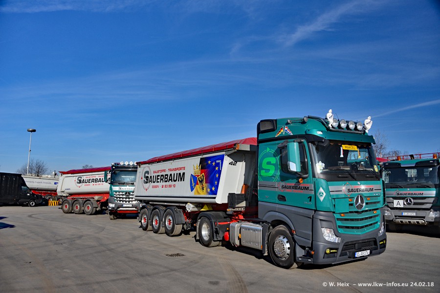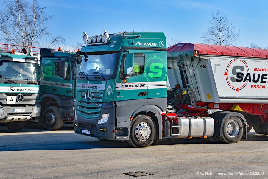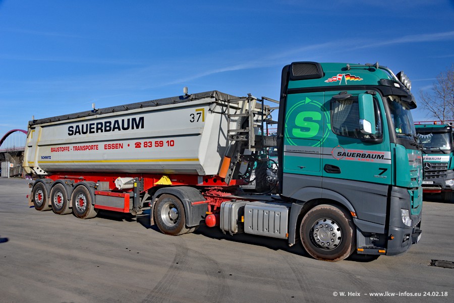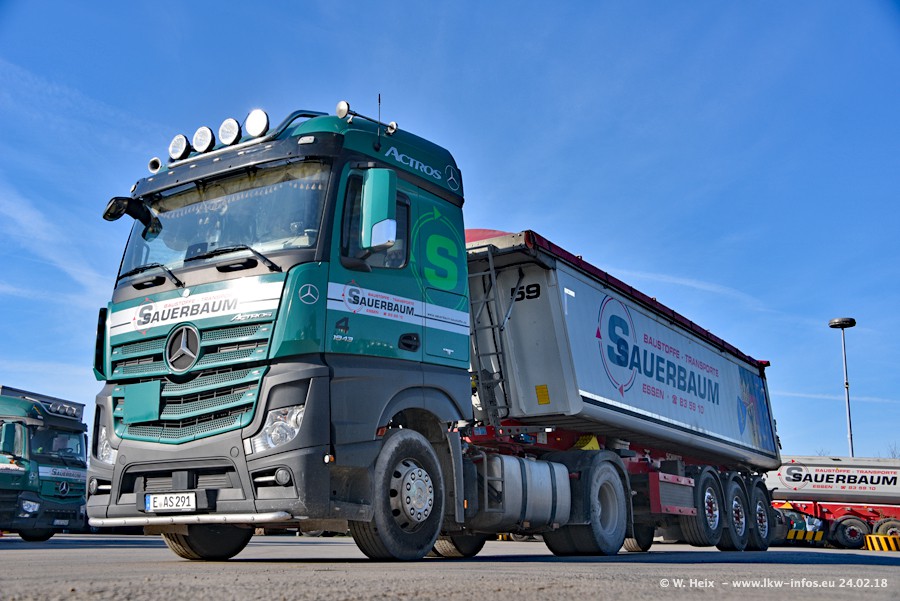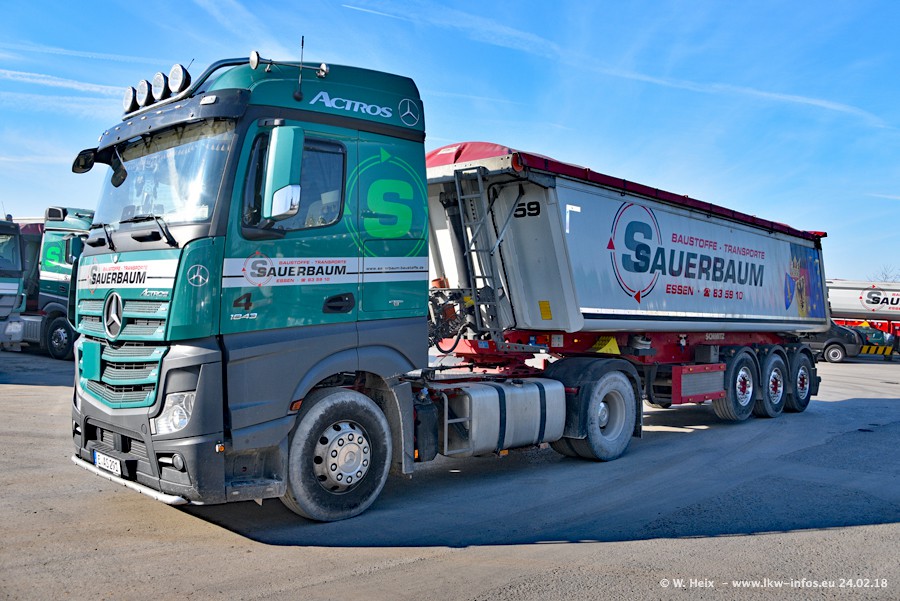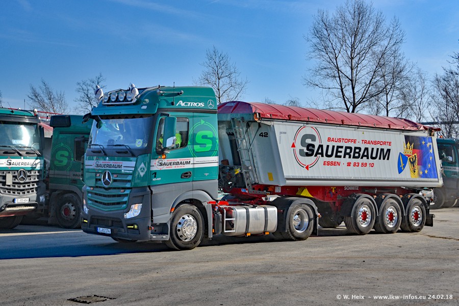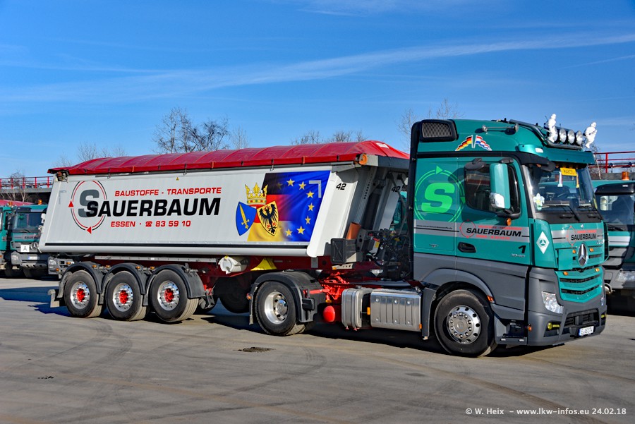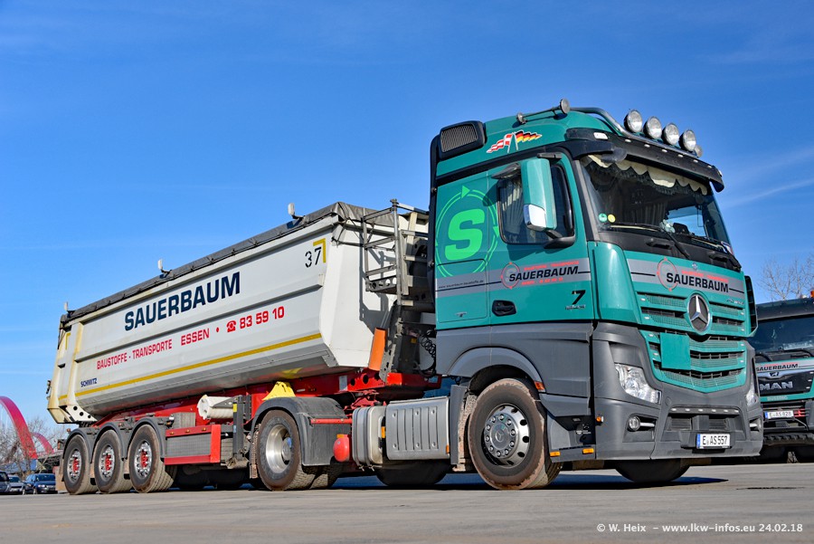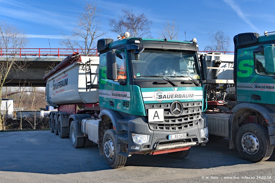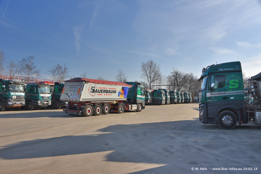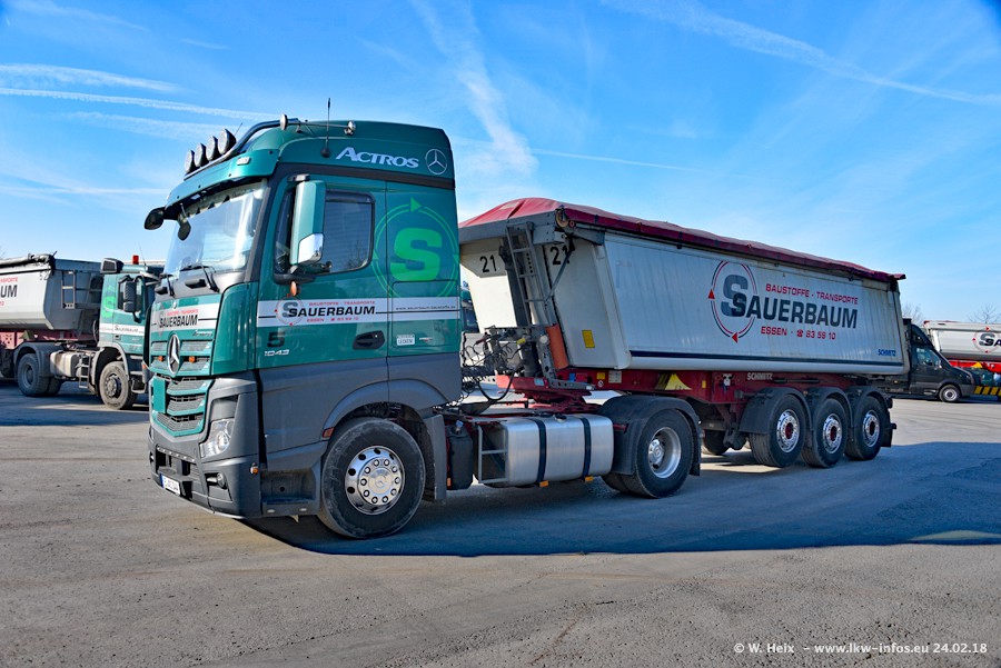 Der Fuhrpark von Sauerbaum besteht aus rund 50 LKW. Das sind 2 MAN TGS Euro 6 und alle anderen Fahrzeuge sind von Mercedes-Benz: Actros 3 und 4 sowie Arocs bei den Allrad-Zugmaschinen.