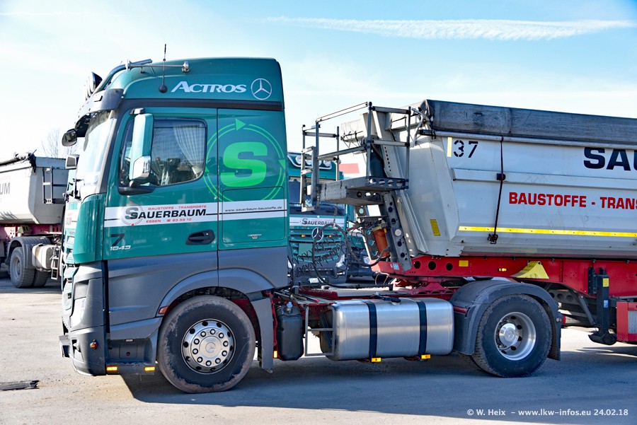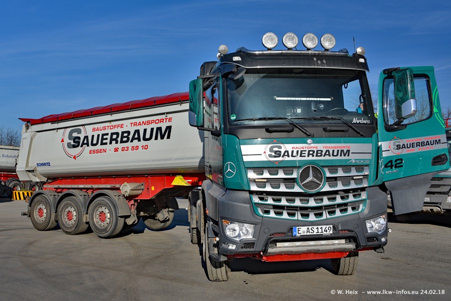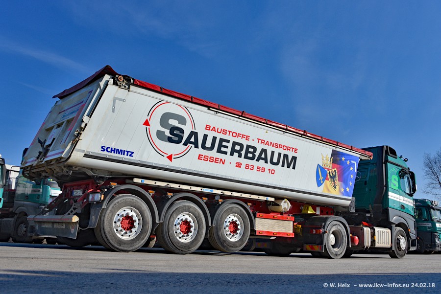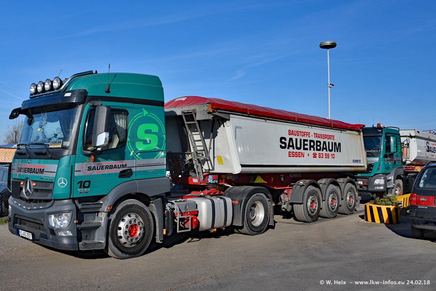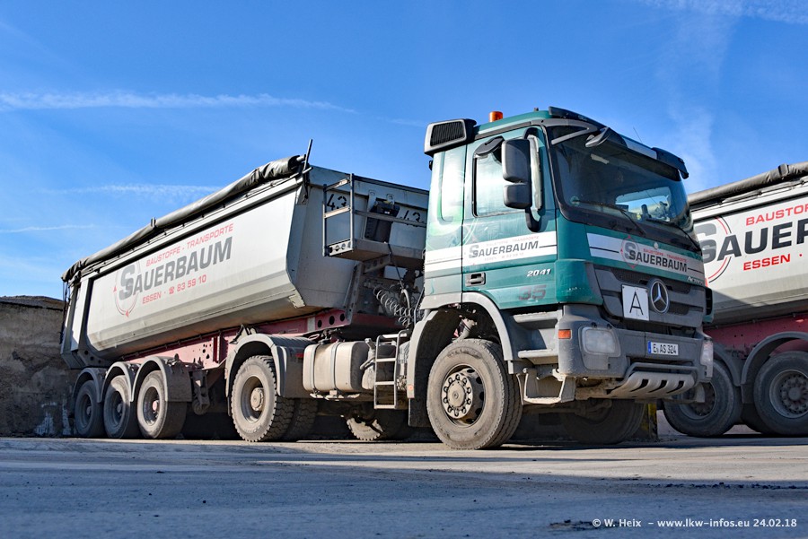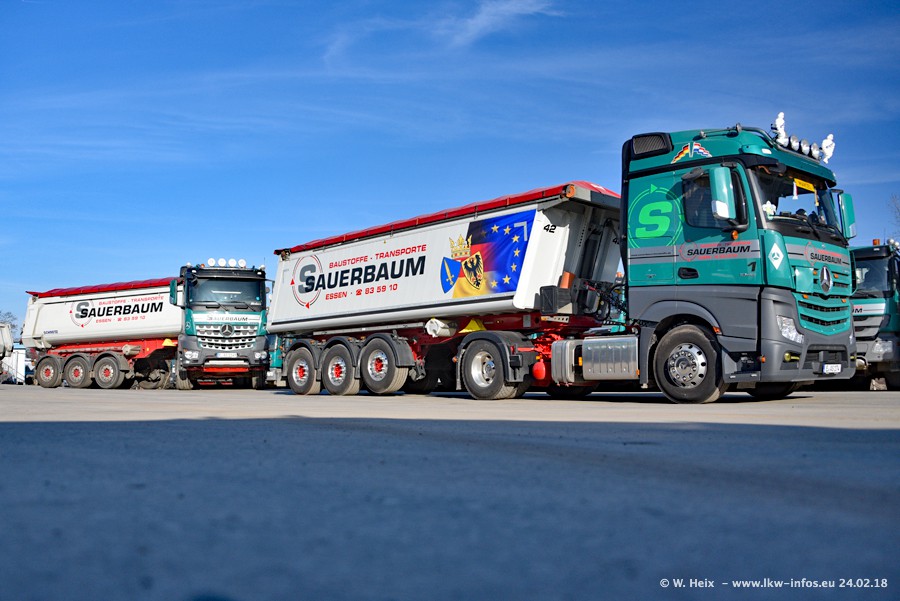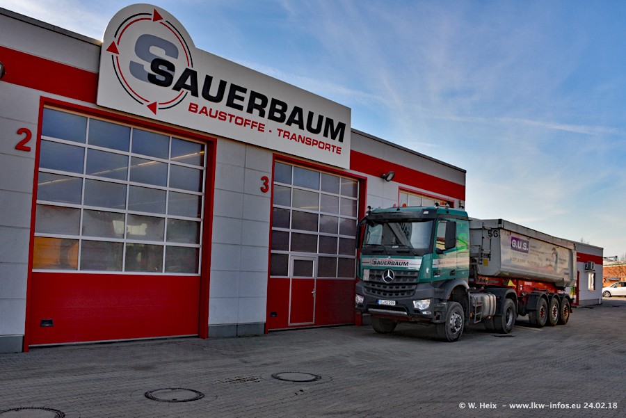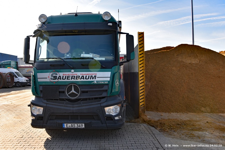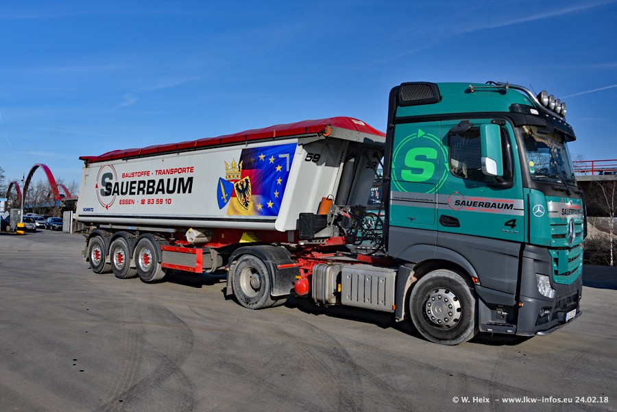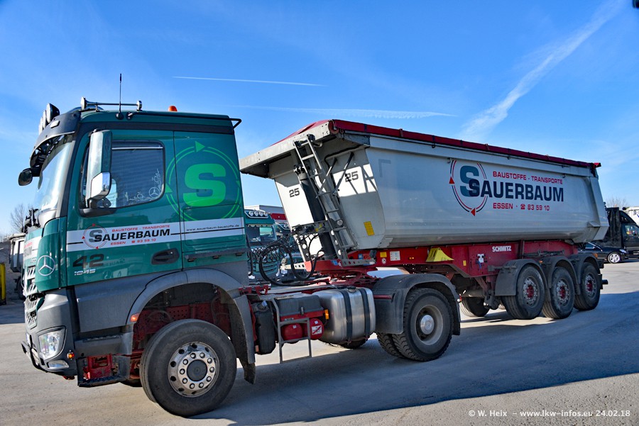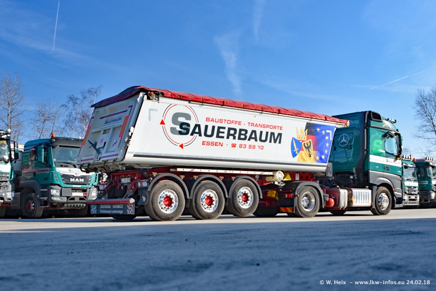 Der Fuhrpark von Sauerbaum besteht aus rund 50 LKW. Das sind 2 MAN TGS Euro 6 und alle anderen Fahrzeuge sind von Mercedes-Benz: Actros 3 und 4 sowie Arocs bei den Allrad-Zugmaschinen.