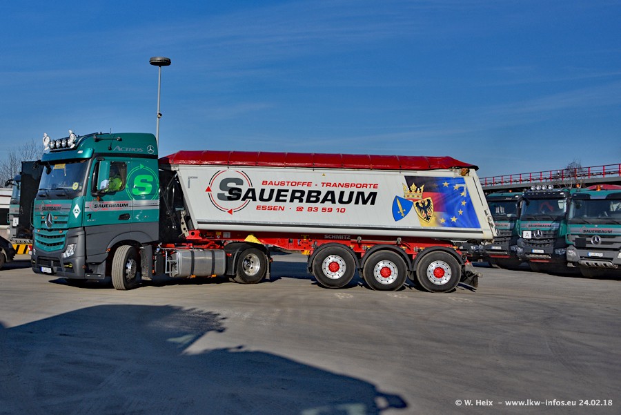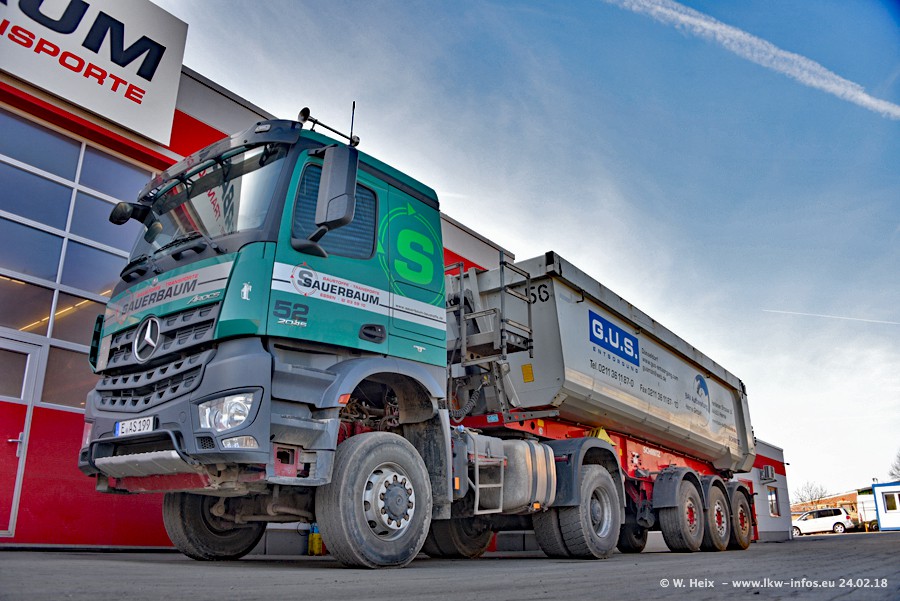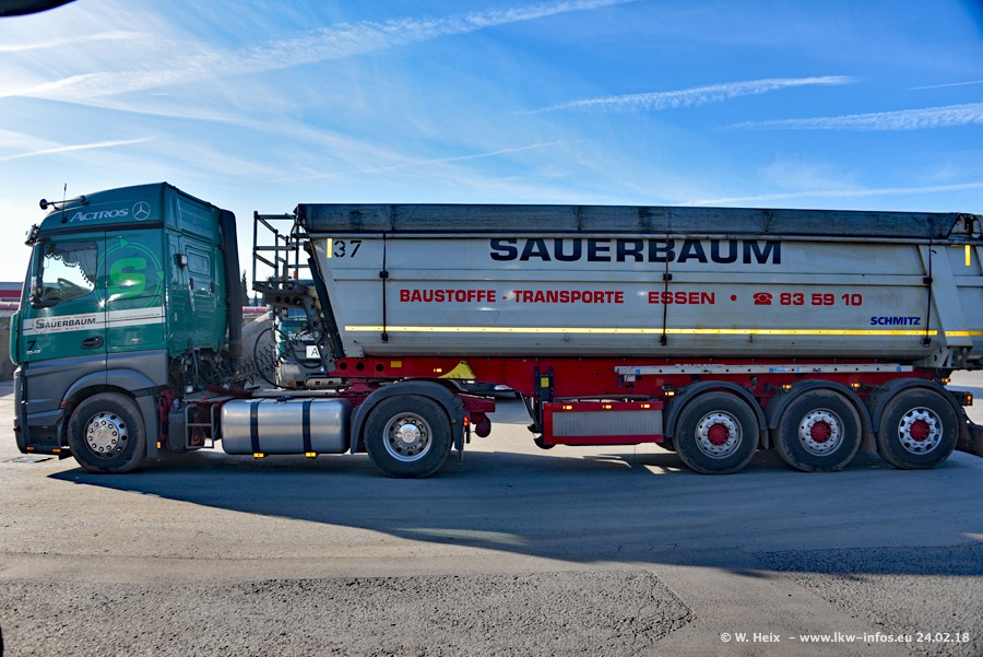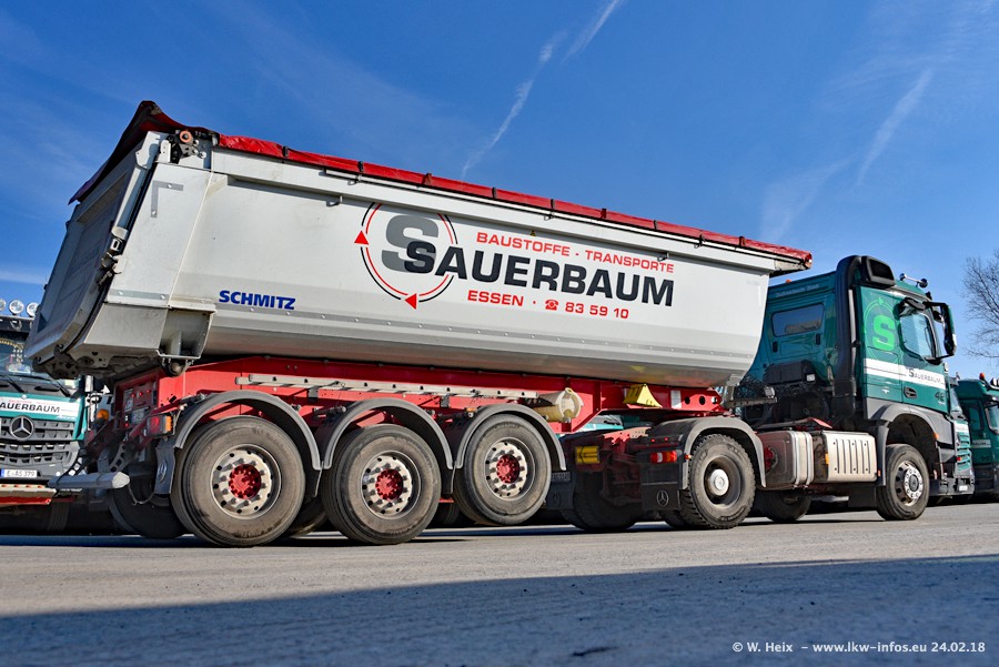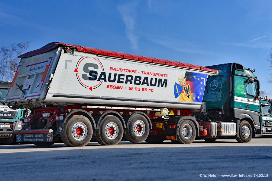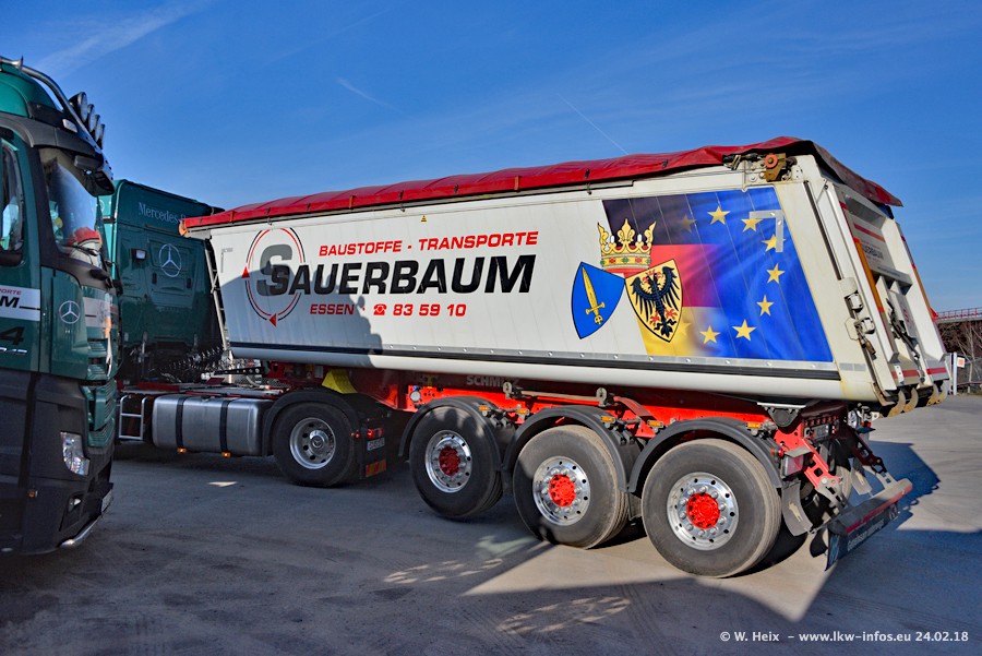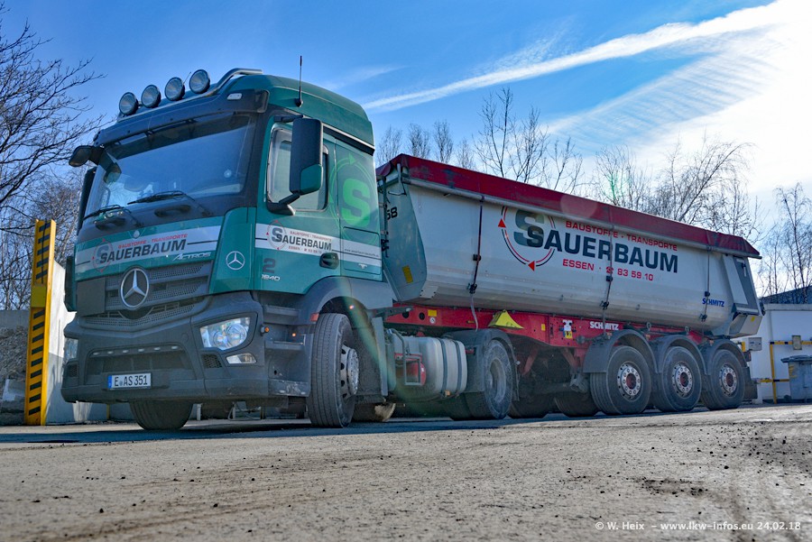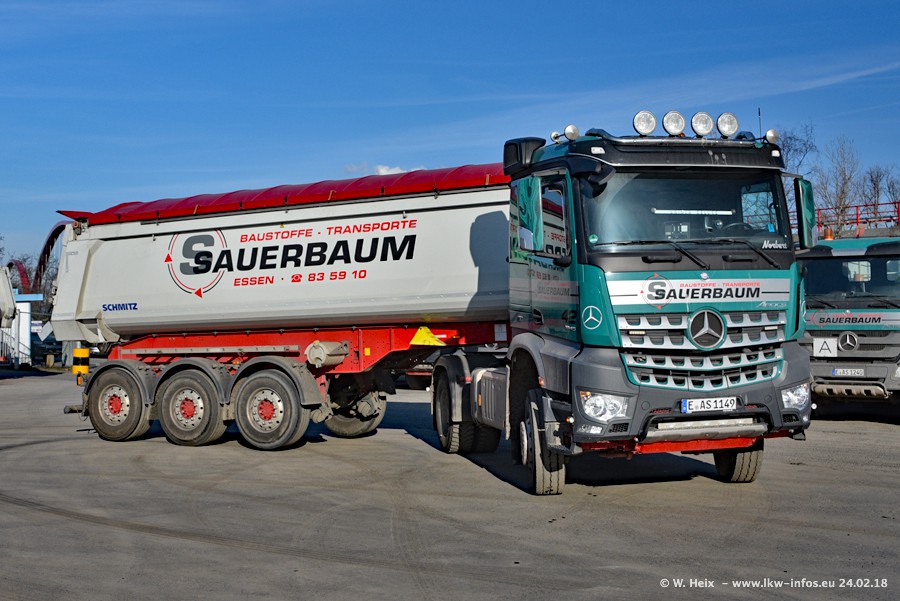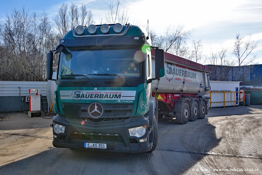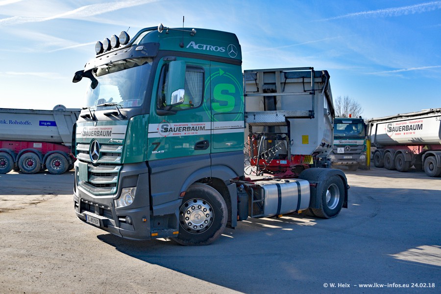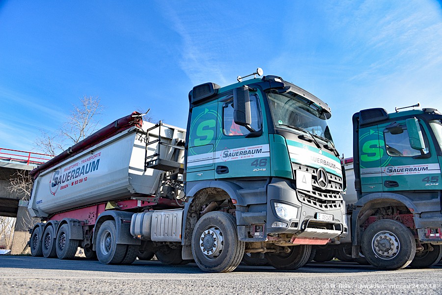Der Fuhrpark von Sauerbaum besteht aus rund 50 LKW. Das sind 2 MAN TGS Euro 6 und alle anderen Fahrzeuge sind von Mercedes-Benz: Actros 3 und 4 sowie Arocs bei den Allrad-Zugmaschinen.
