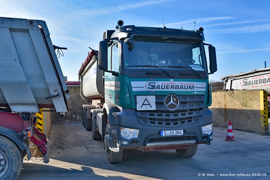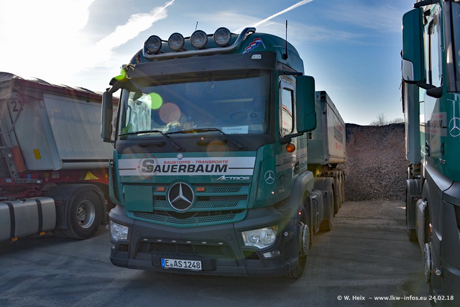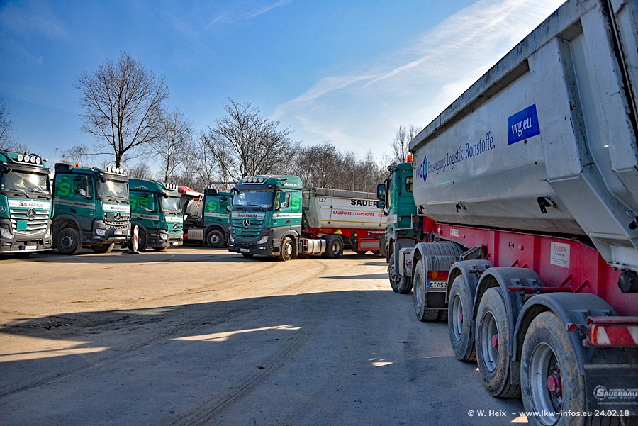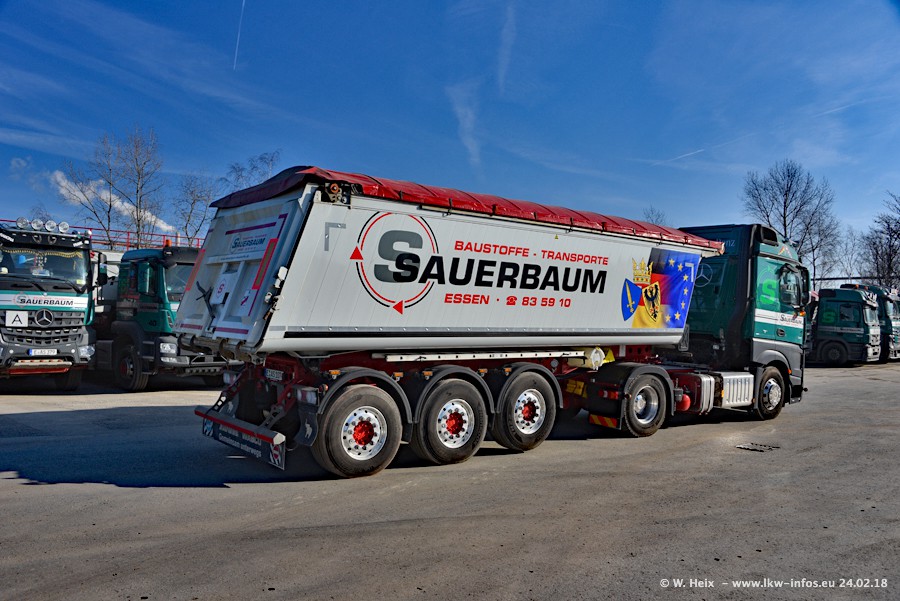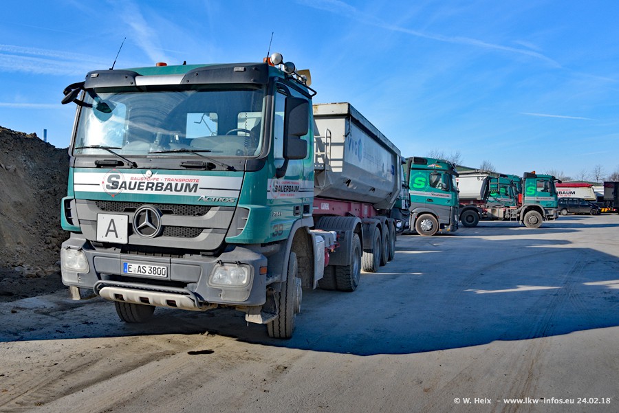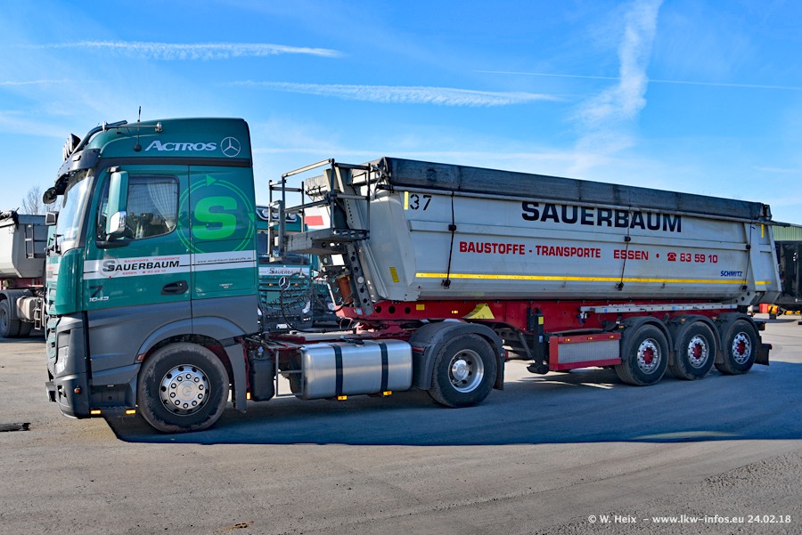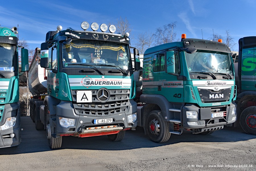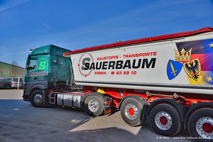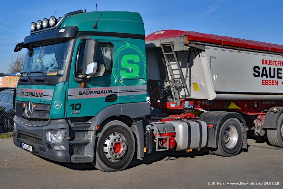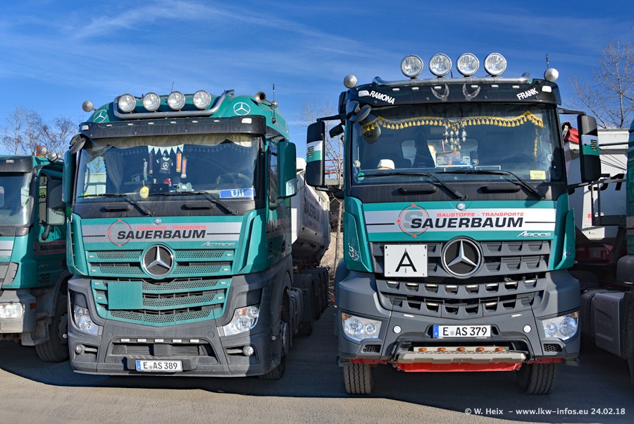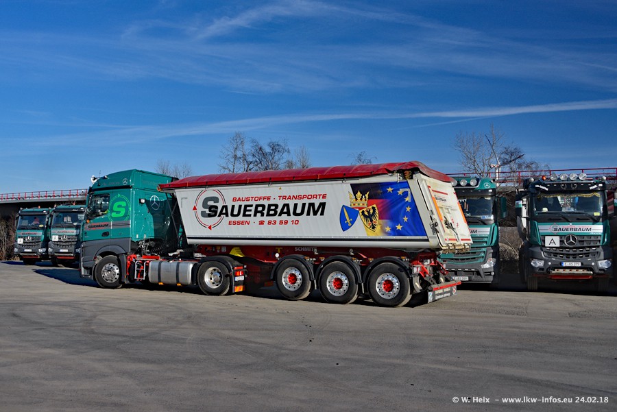 Der Fuhrpark von Sauerbaum besteht aus rund 50 LKW. Das sind 2 MAN TGS Euro 6 und alle anderen Fahrzeuge sind von Mercedes-Benz: Actros 3 und 4 sowie Arocs bei den Allrad-Zugmaschinen.