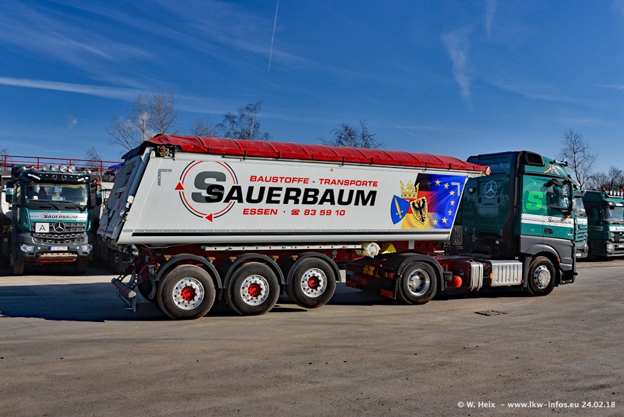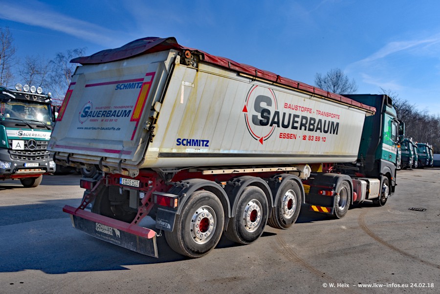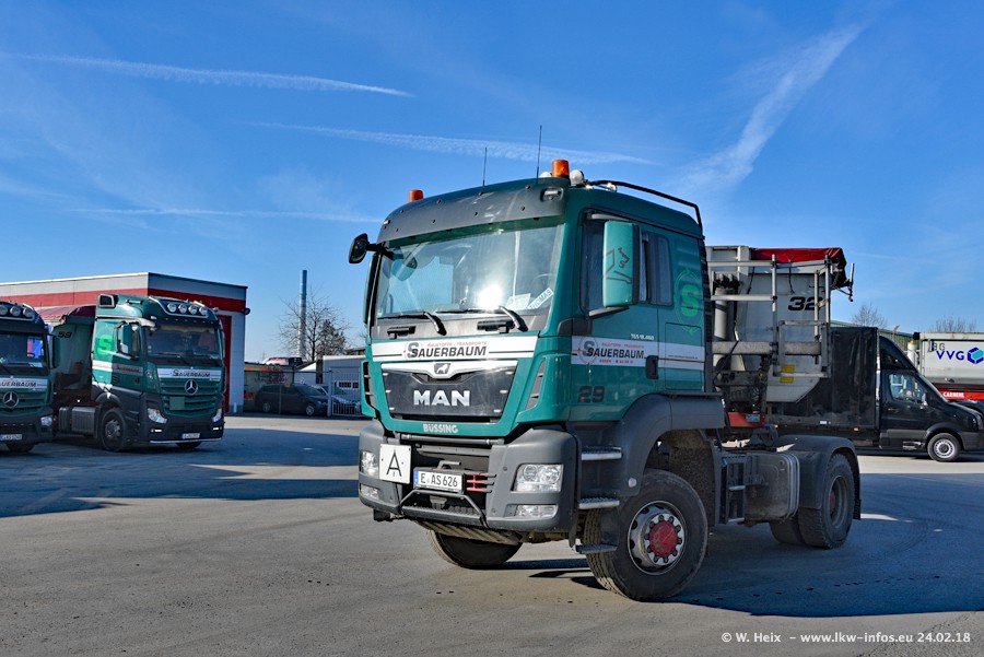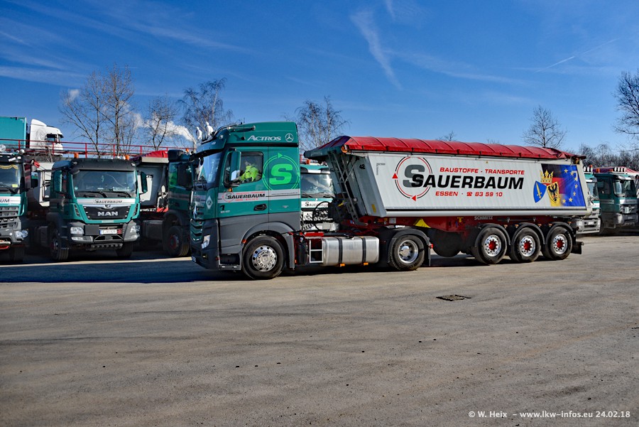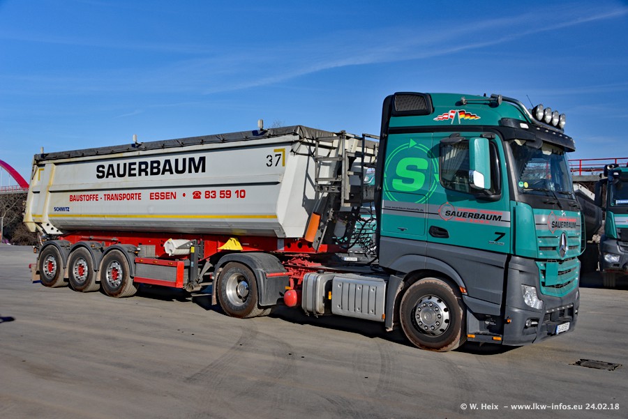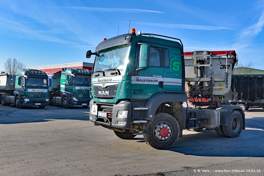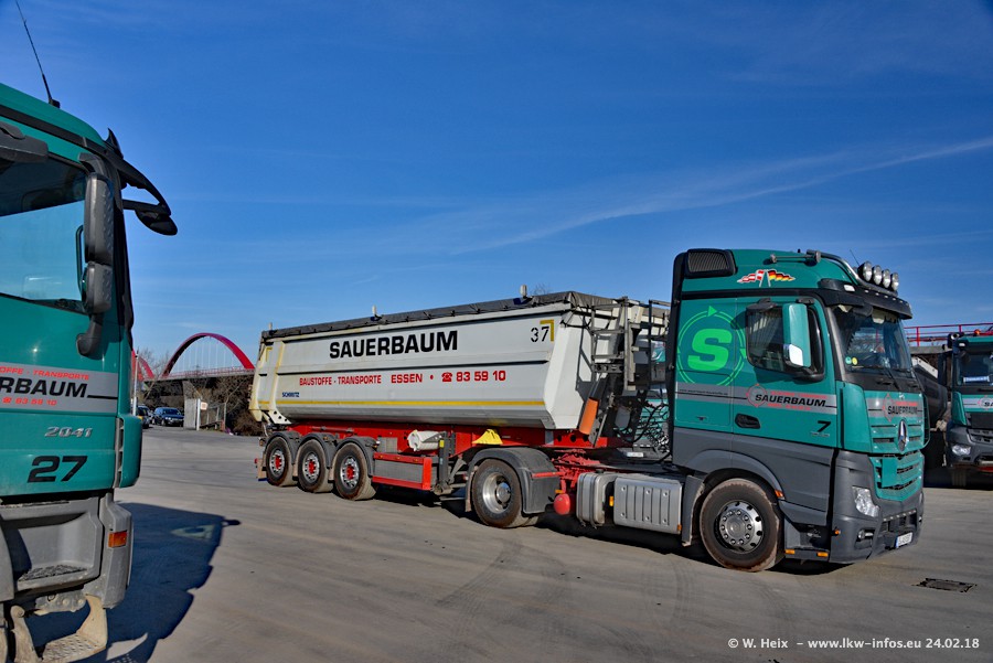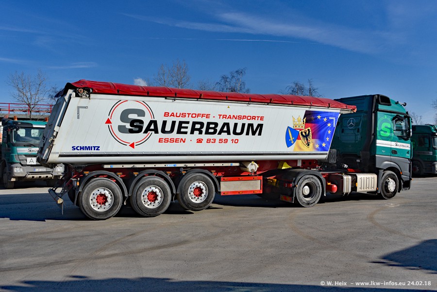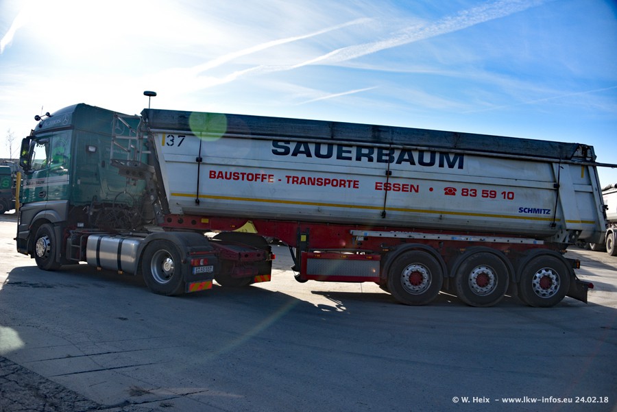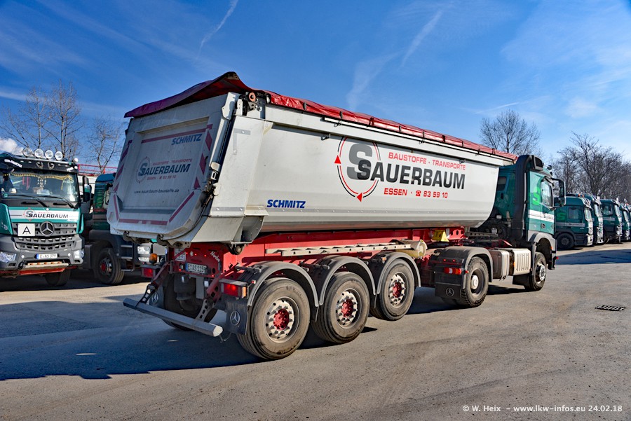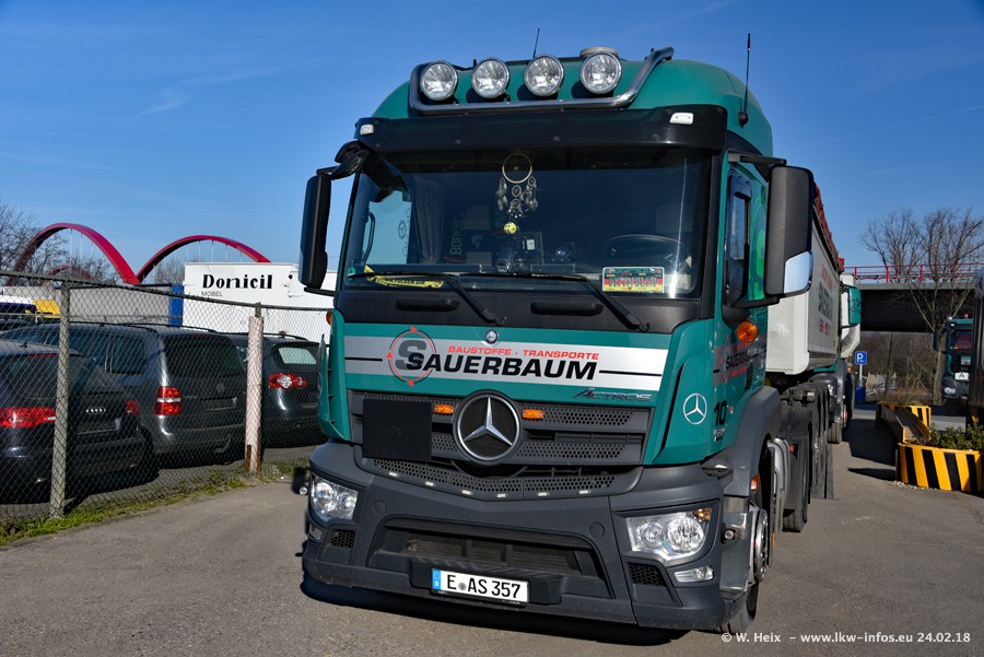 Der Fuhrpark von Sauerbaum besteht aus rund 50 LKW. Das sind 2 MAN TGS Euro 6 und alle anderen Fahrzeuge sind von Mercedes-Benz: Actros 3 und 4 sowie Arocs bei den Allrad-Zugmaschinen.