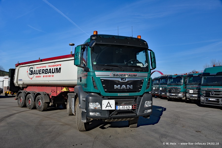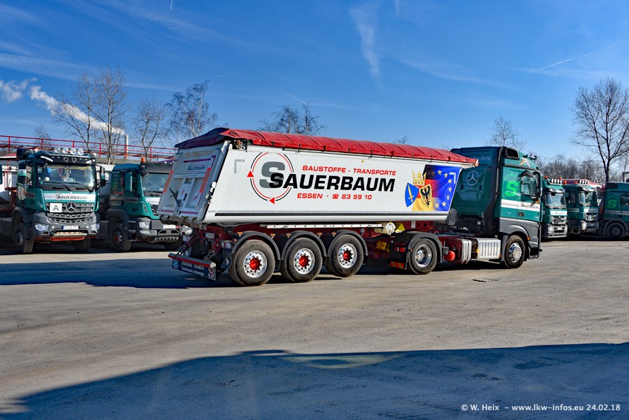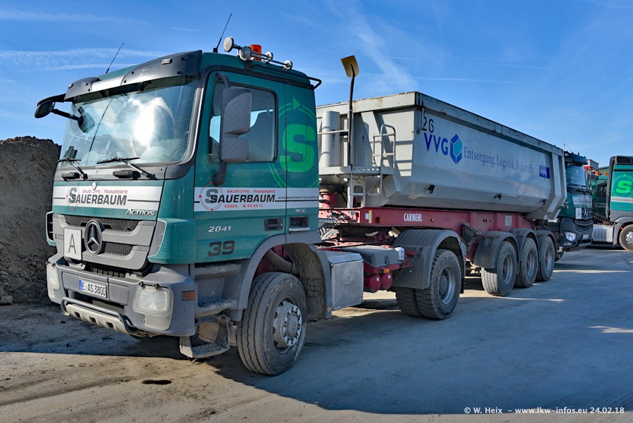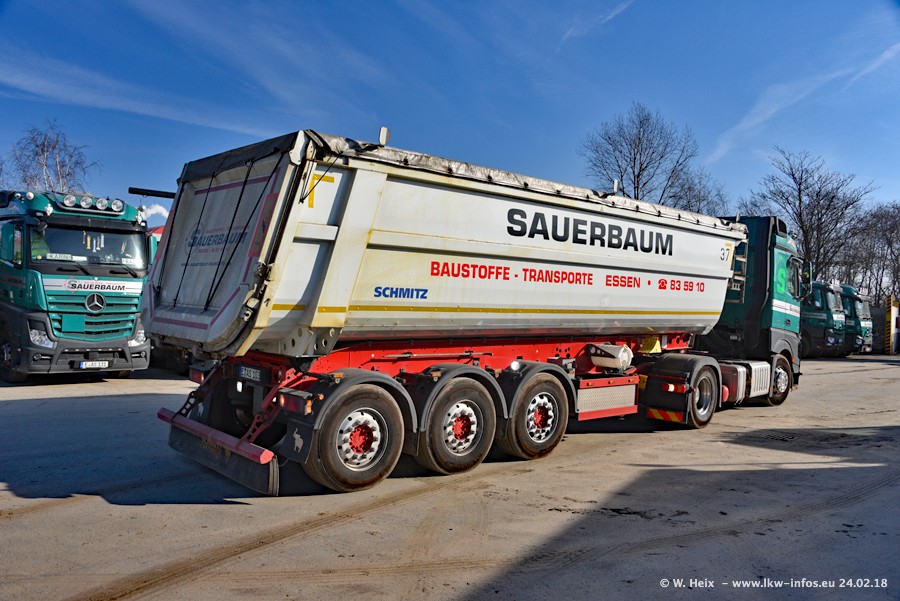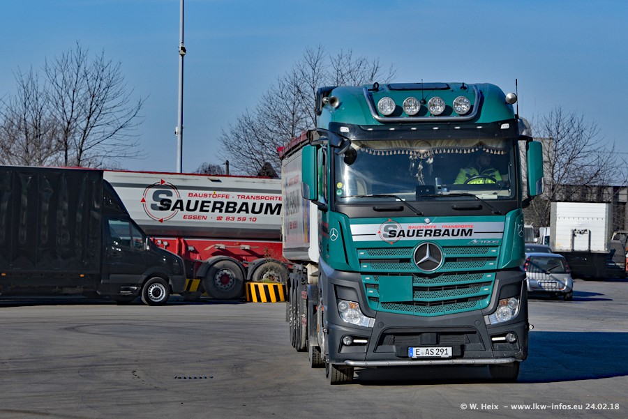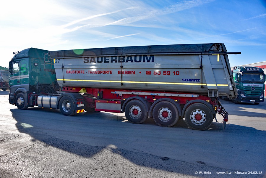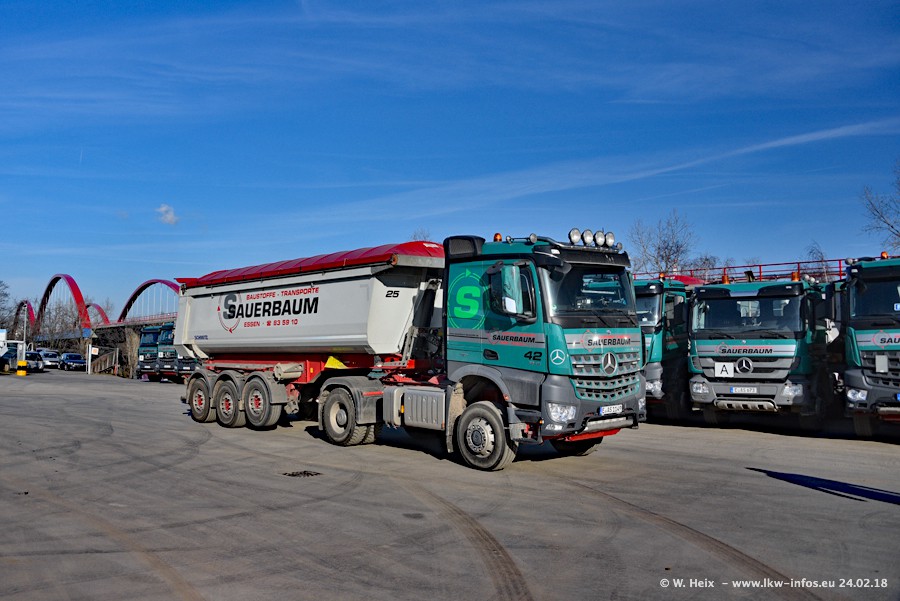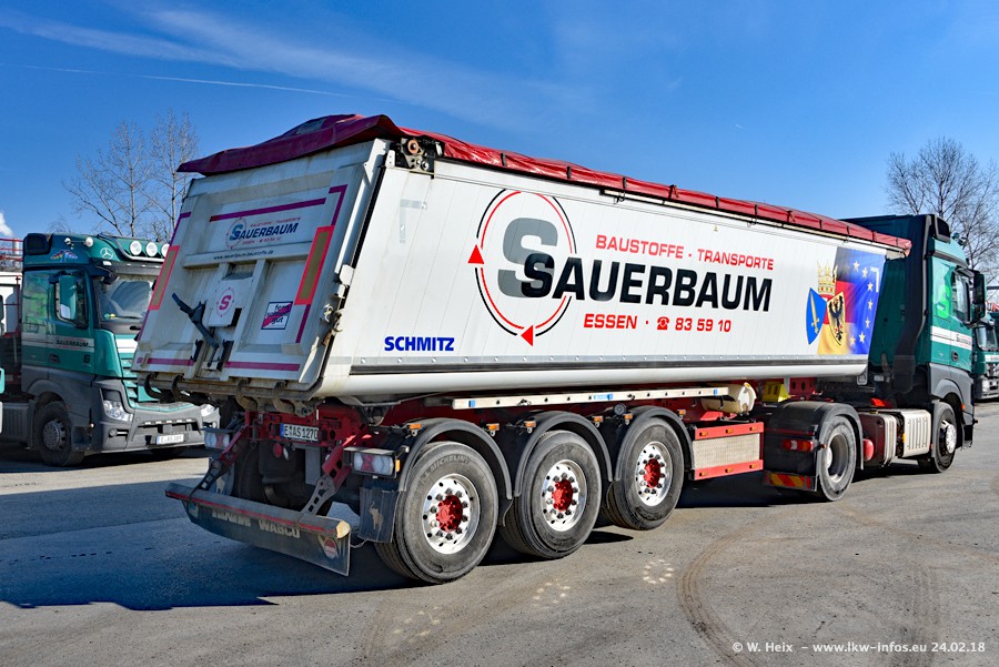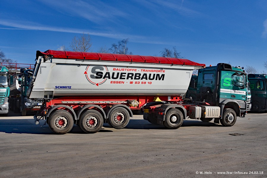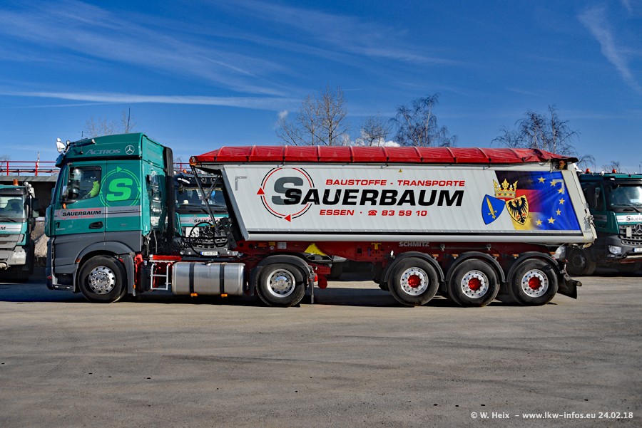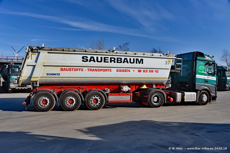 Der Fuhrpark von Sauerbaum besteht aus rund 50 LKW. Das sind 2 MAN TGS Euro 6 und alle anderen Fahrzeuge sind von Mercedes-Benz: Actros 3 und 4 sowie Arocs bei den Allrad-Zugmaschinen.