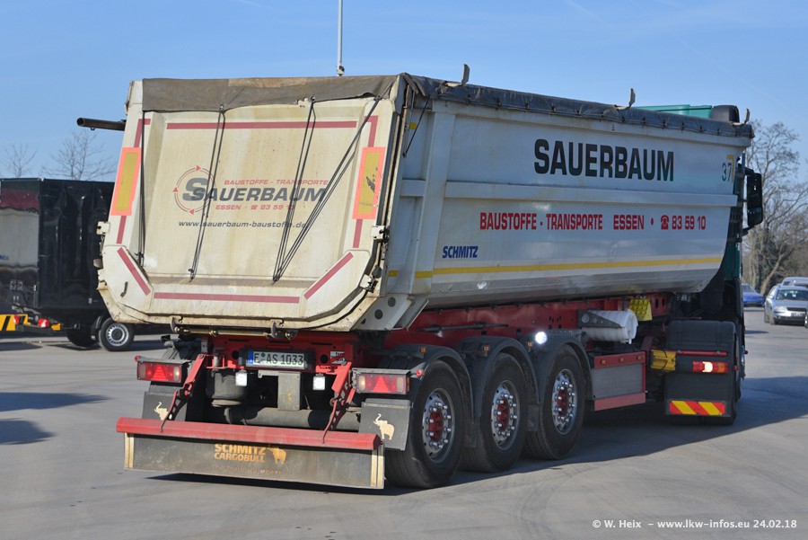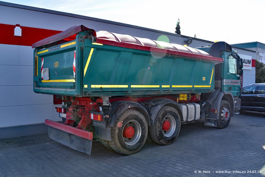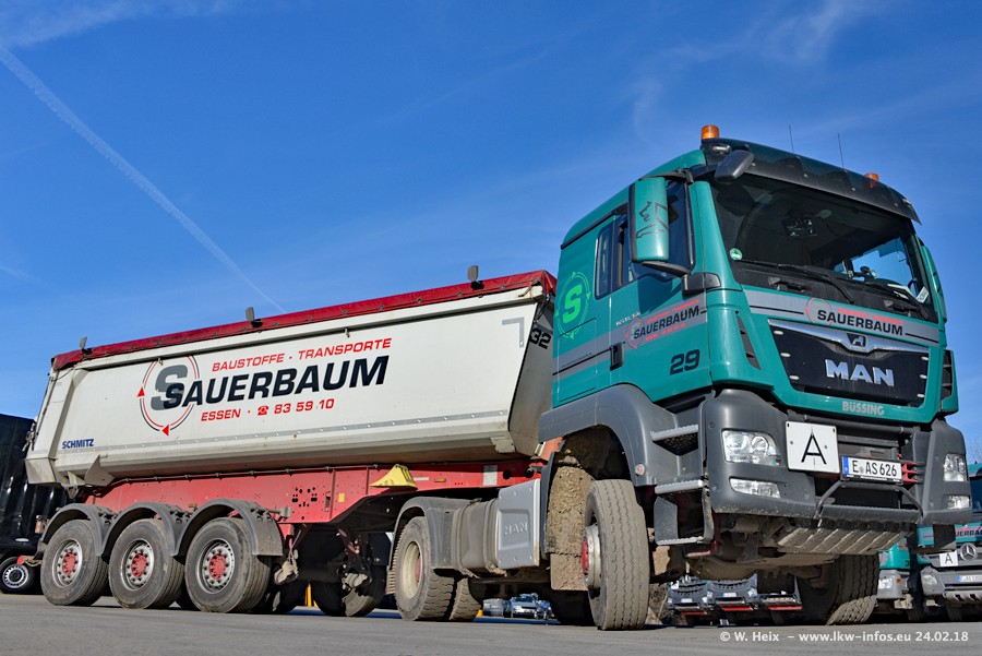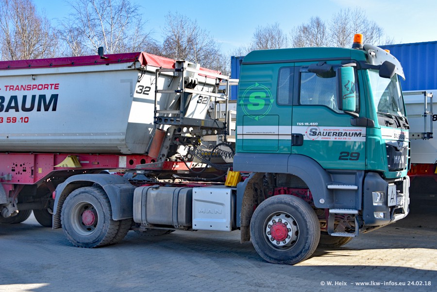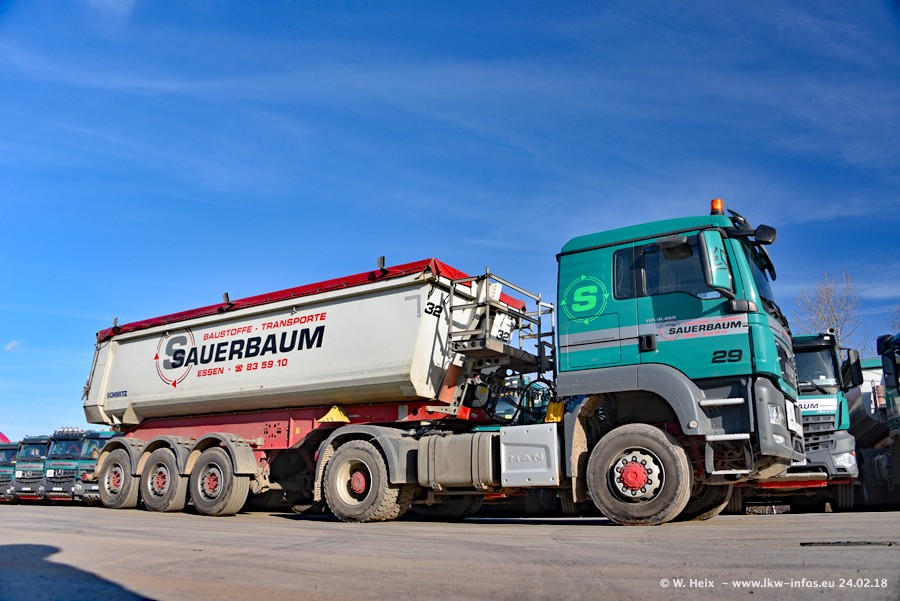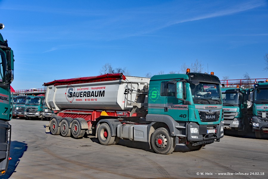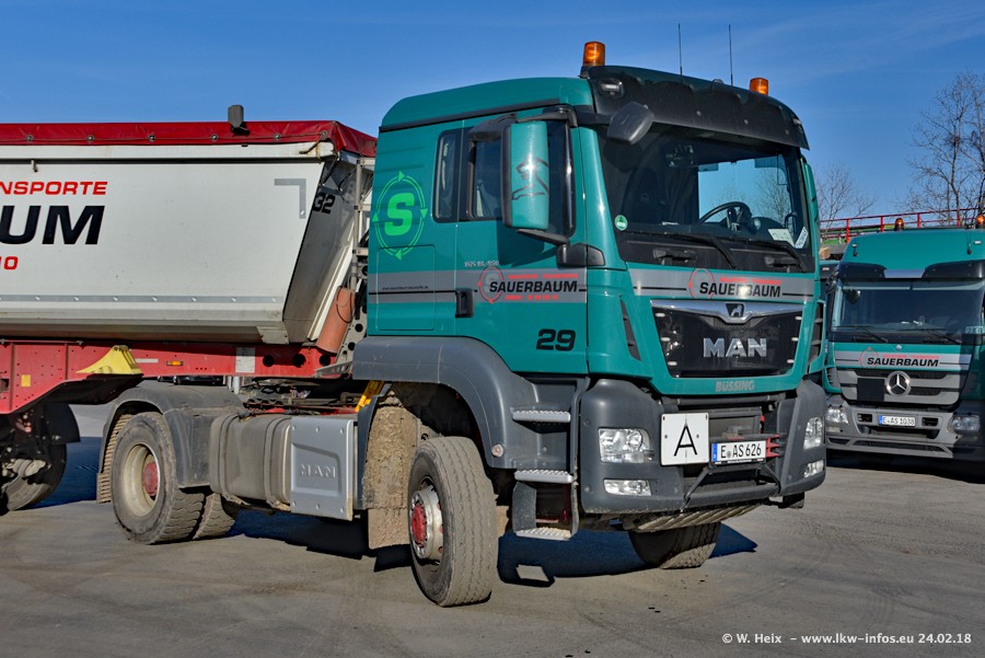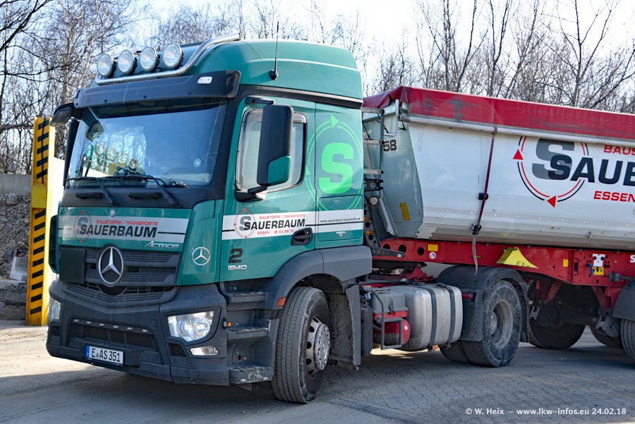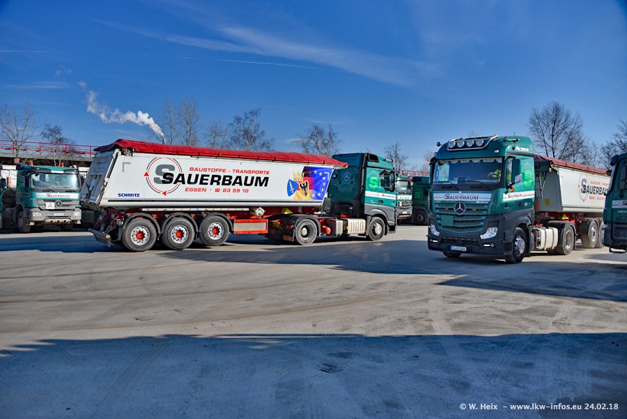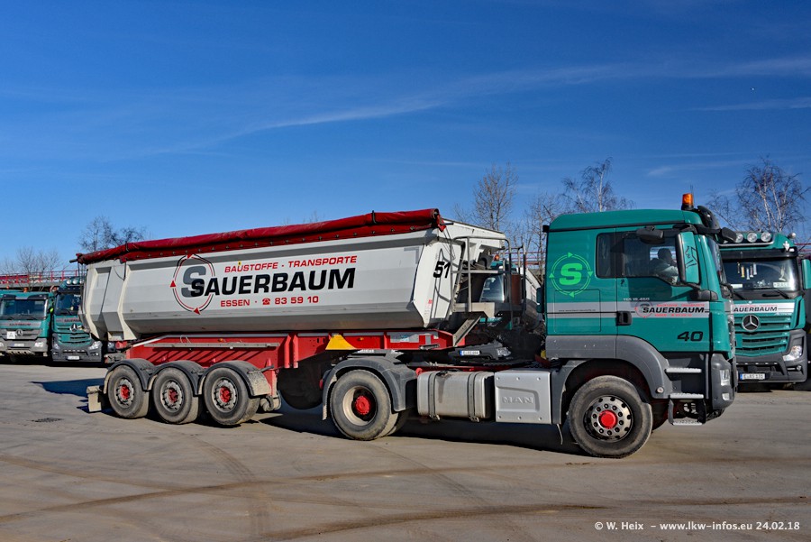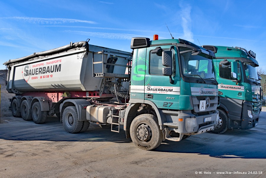 Der Fuhrpark von Sauerbaum besteht aus rund 50 LKW. Das sind 2 MAN TGS Euro 6 und alle anderen Fahrzeuge sind von Mercedes-Benz: Actros 3 und 4 sowie Arocs bei den Allrad-Zugmaschinen.