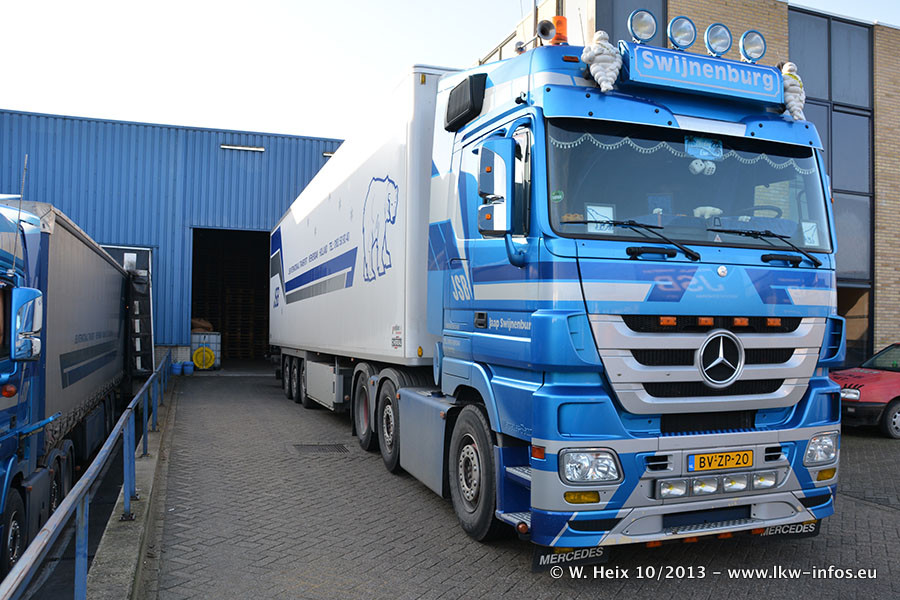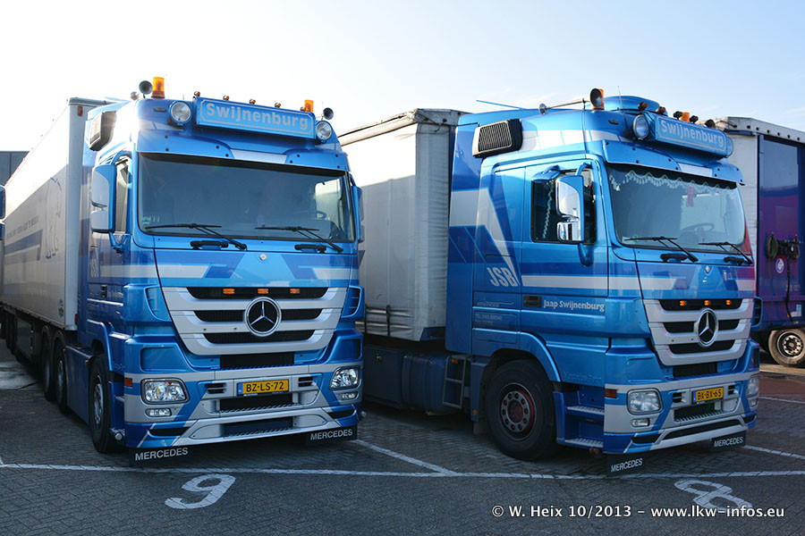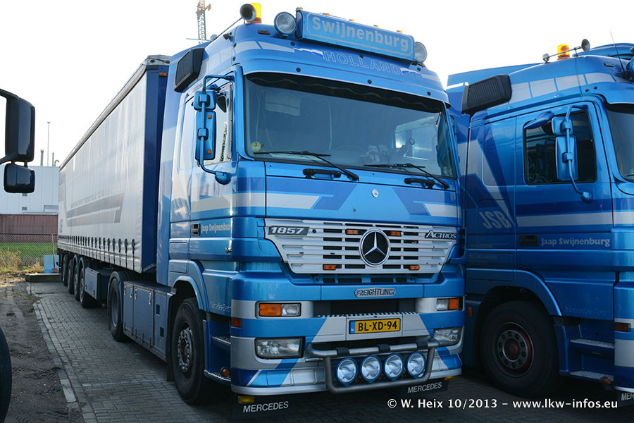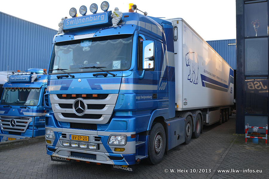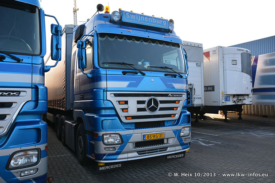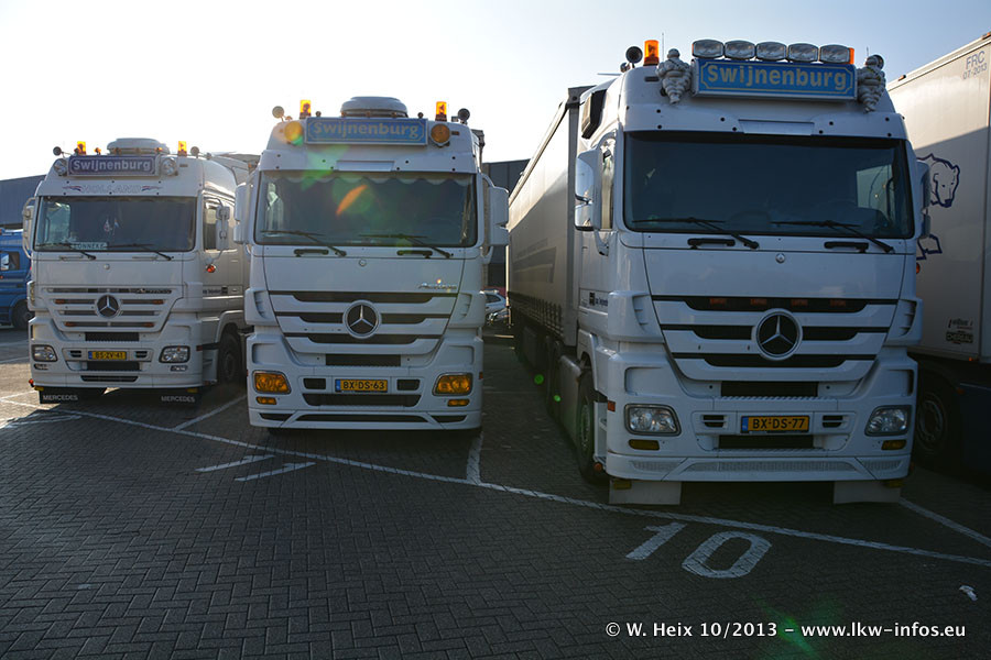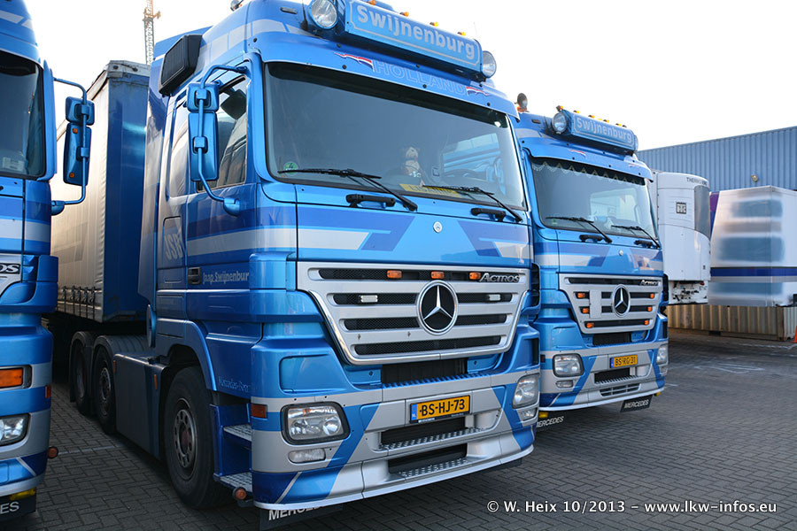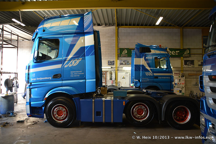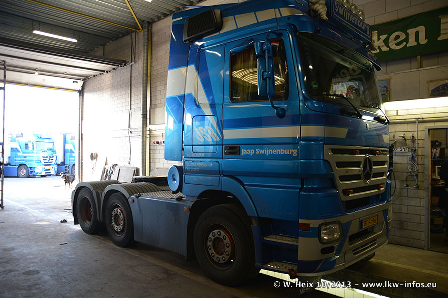 Im Fuhrpark sind zwei weitere neue Mercedes-Benz Actros 4 Euro 6. Einer davon stand vorne am Straßenrand, der andere (noch ganz neue) stand in der Werkstatt. Zur Zeit hat Swijnenburg 25 LKW, alle aus dem Hause Mercedes-Benz und alle aus der Actros-Baureihe von der ersten bis zur aktuellen vierten Generation sowie einen SK der ersten Generation, der zwischenzeitlich "restauriert" wurde und im Fuhrpark bleiben wird.