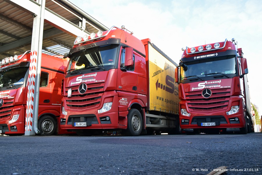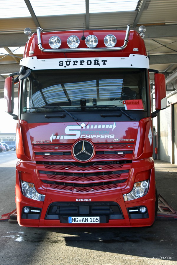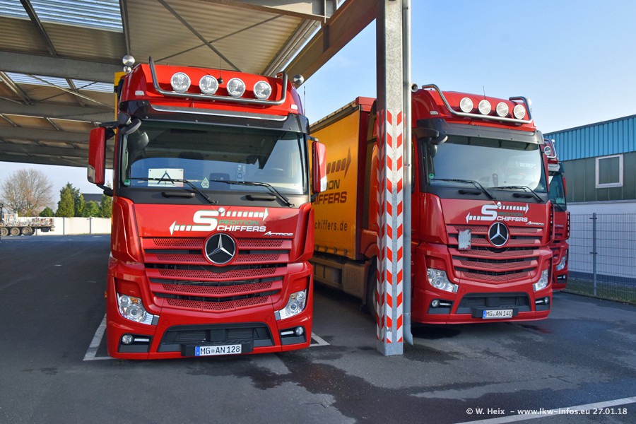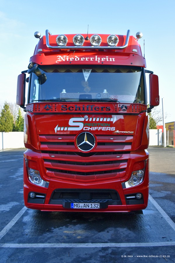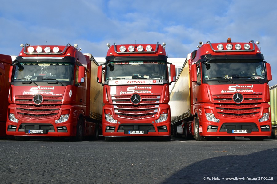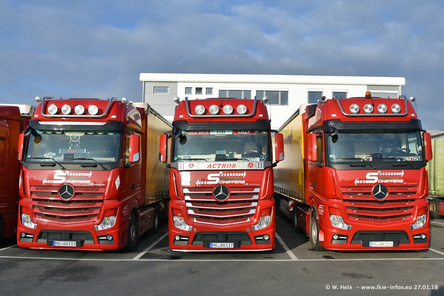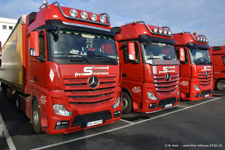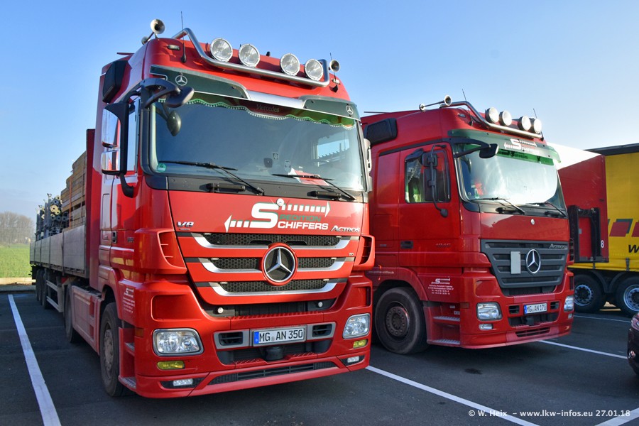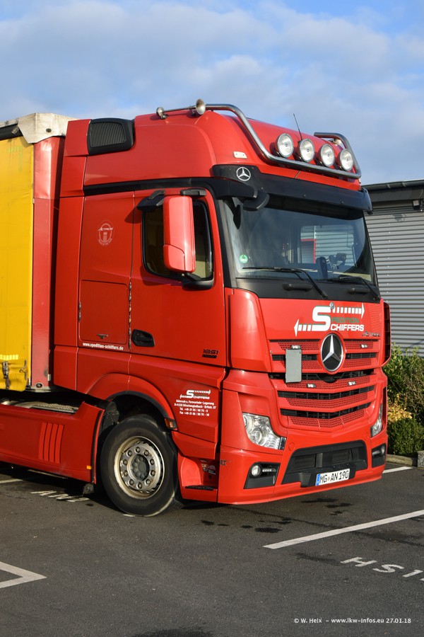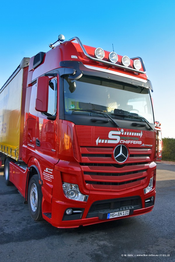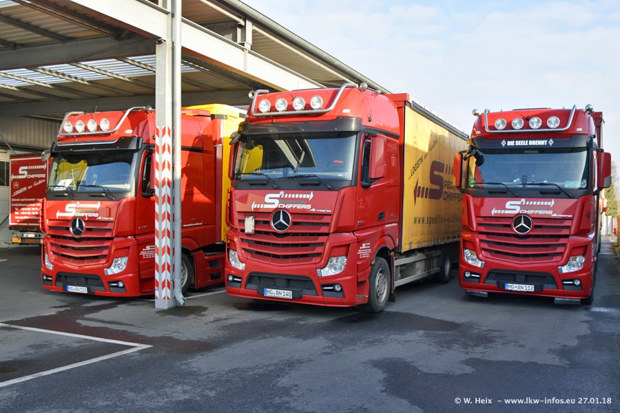 Heute war ich zum ersten Mal bei Schiffers in Mönchengladbach. Es gibt insgesamt 28 LKW, alle von Mercedes-Benz. Im Fernverkehr sind überwiegend Actros 4 im Einsatz. Im Nahverkehr werden überwiegend Mercedes-Benz der Baureihen Actros MP2 und Actros 3 eingesetzt.