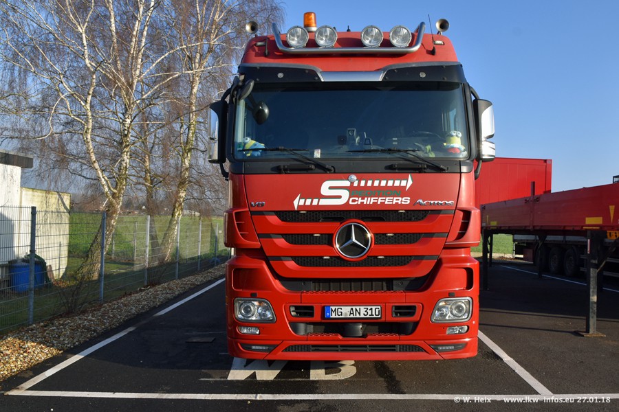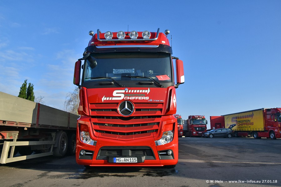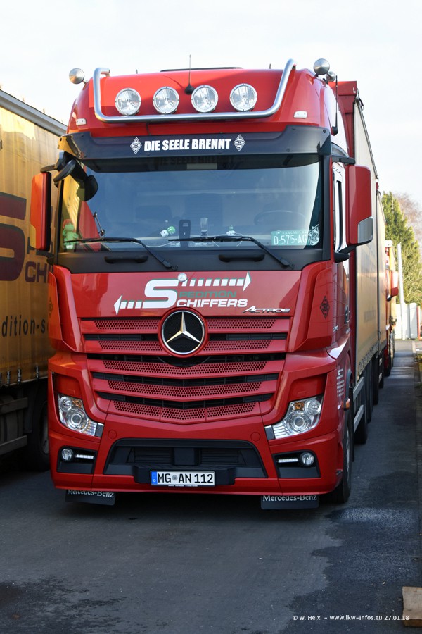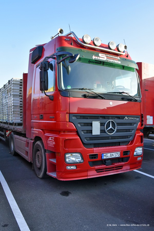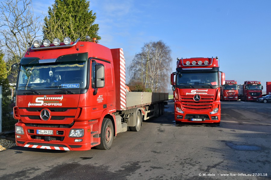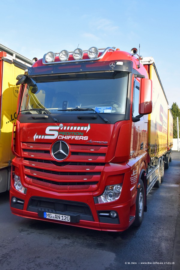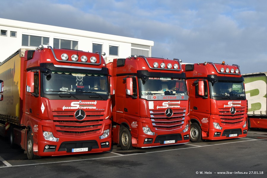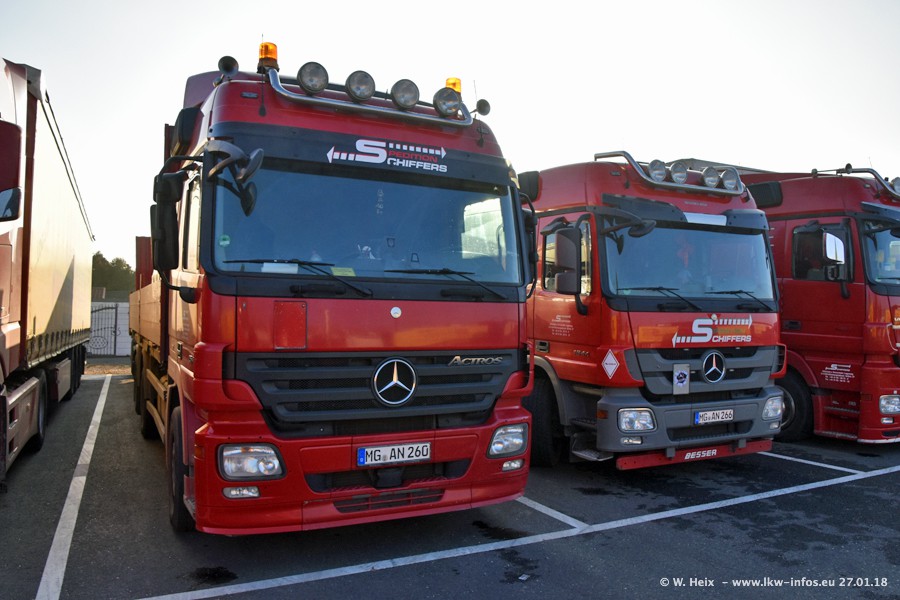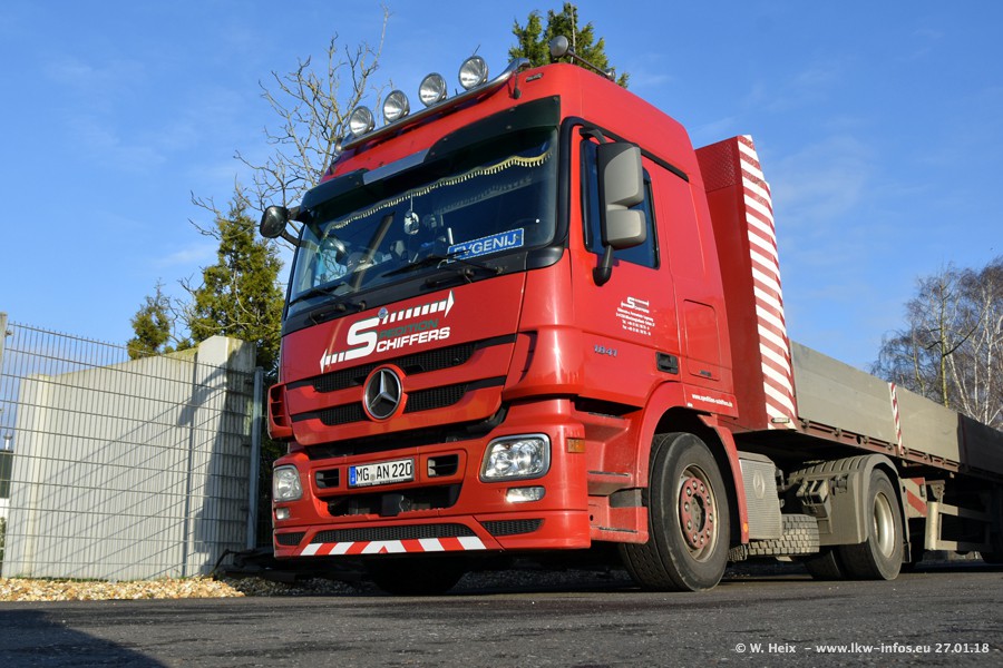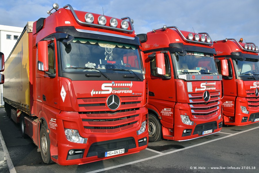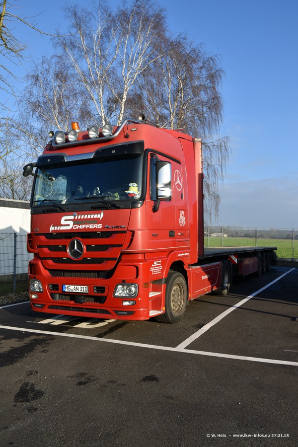 Heute war ich zum ersten Mal bei Schiffers in Mönchengladbach. Es gibt insgesamt 28 LKW, alle von Mercedes-Benz. Im Fernverkehr sind überwiegend Actros 4 im Einsatz. Im Nahverkehr werden überwiegend Mercedes-Benz der Baureihen Actros MP2 und Actros 3 eingesetzt.