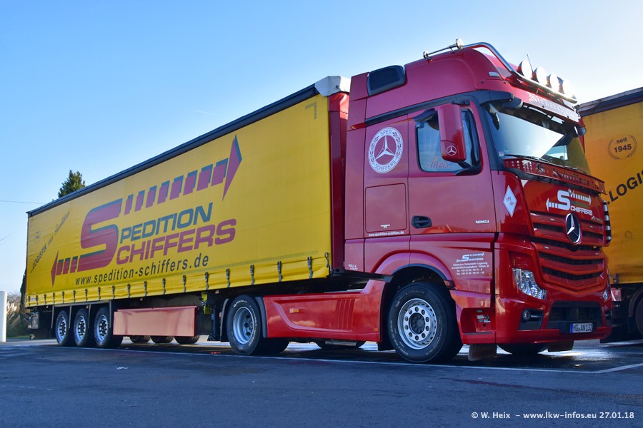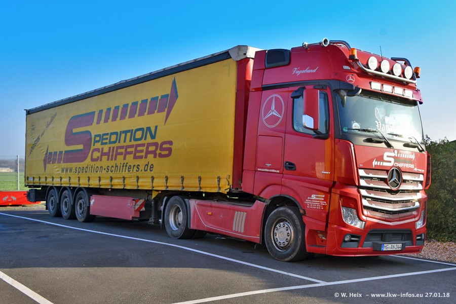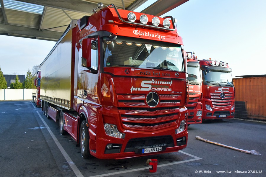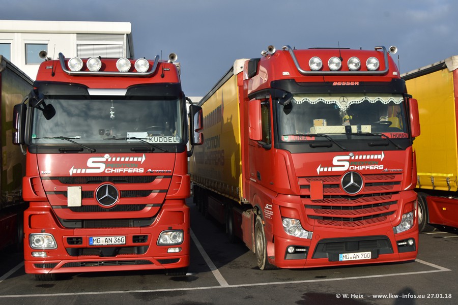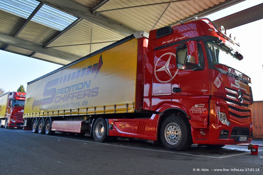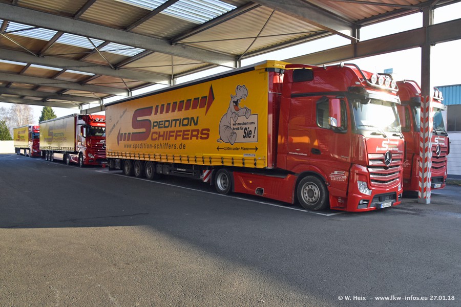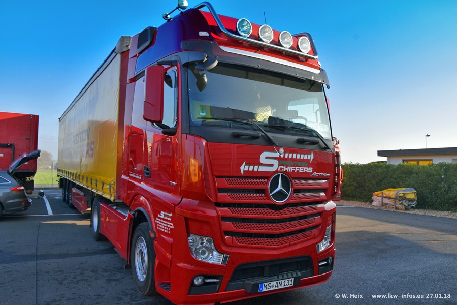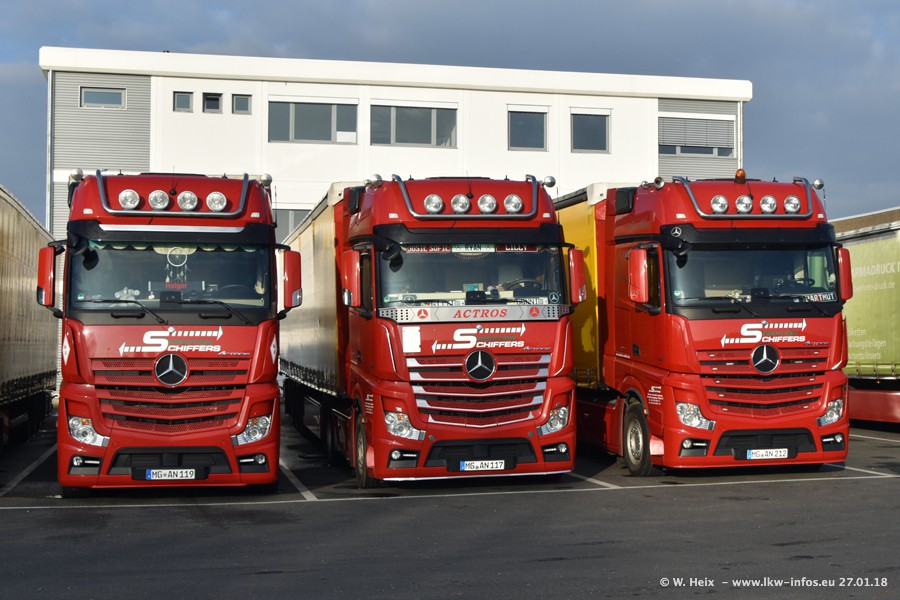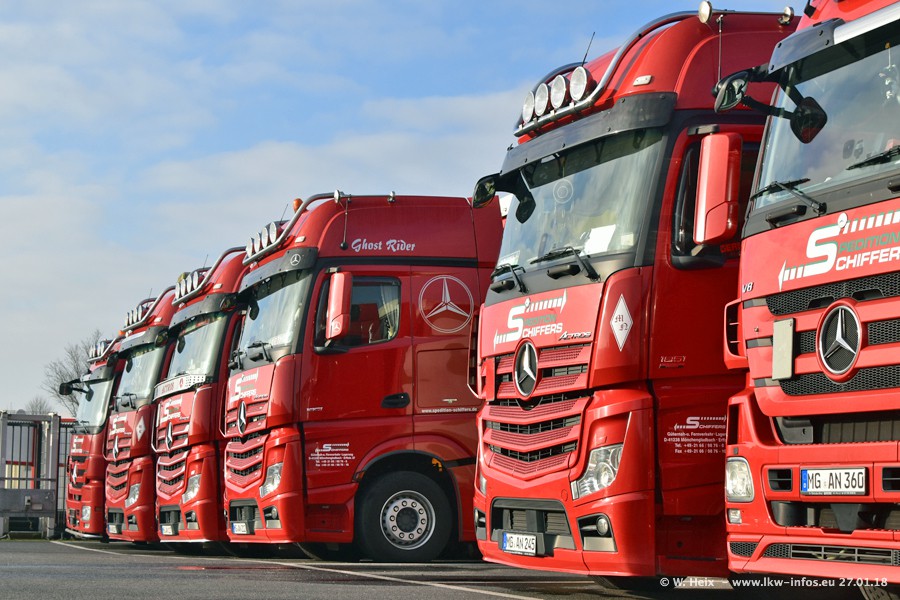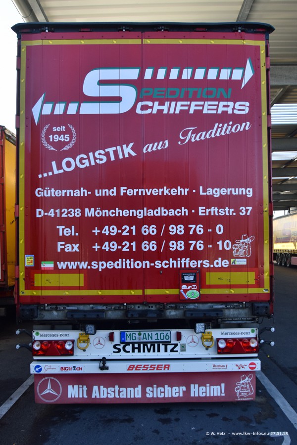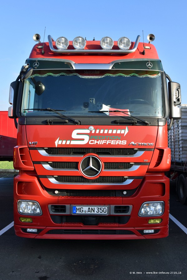 Heute war ich zum ersten Mal bei Schiffers in Mönchengladbach. Es gibt insgesamt 28 LKW, alle von Mercedes-Benz. Im Fernverkehr sind überwiegend Actros 4 im Einsatz. Im Nahverkehr werden überwiegend Mercedes-Benz der Baureihen Actros MP2 und Actros 3 eingesetzt.