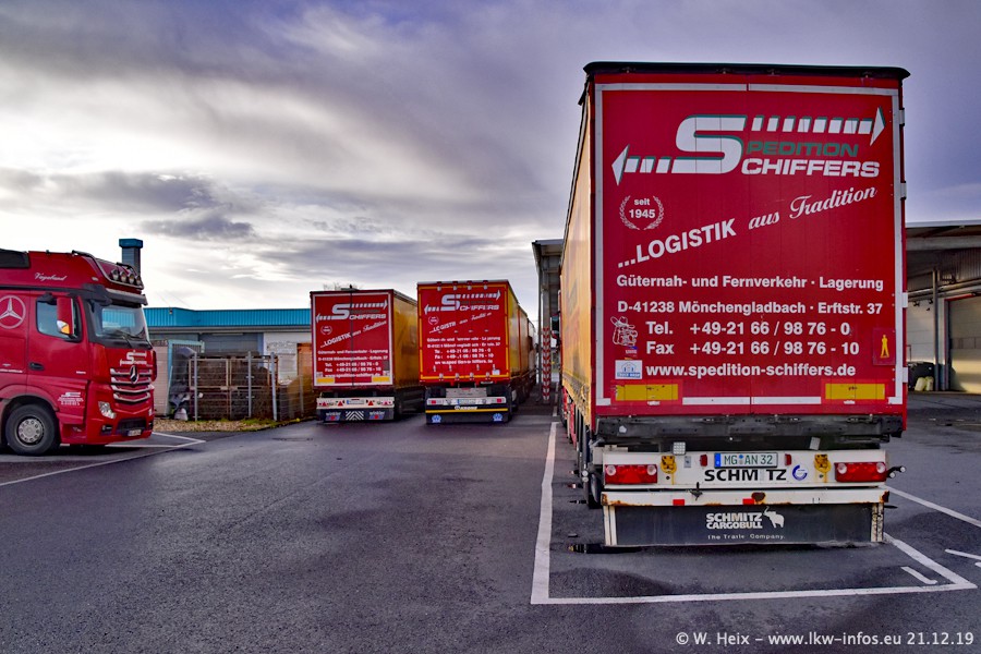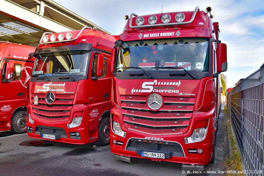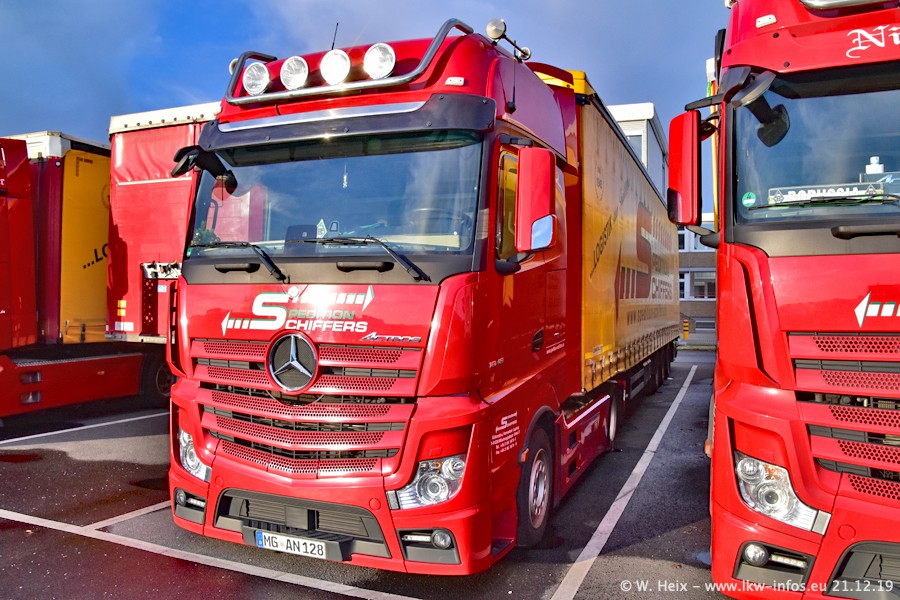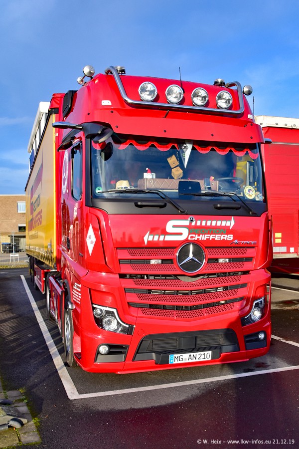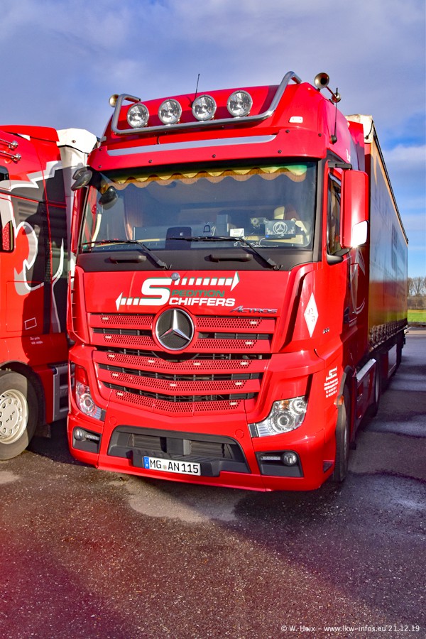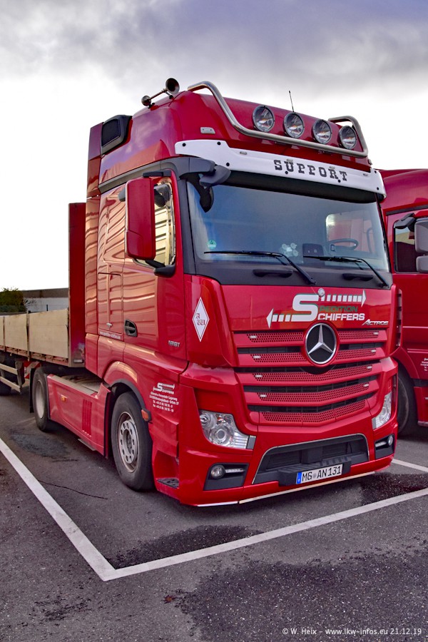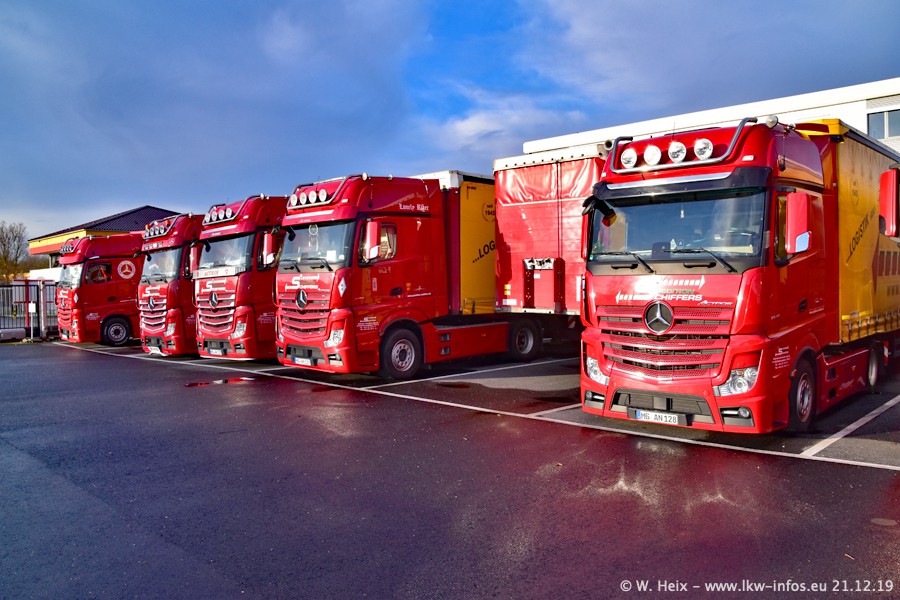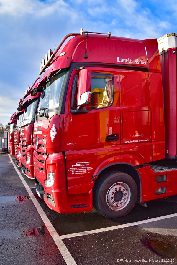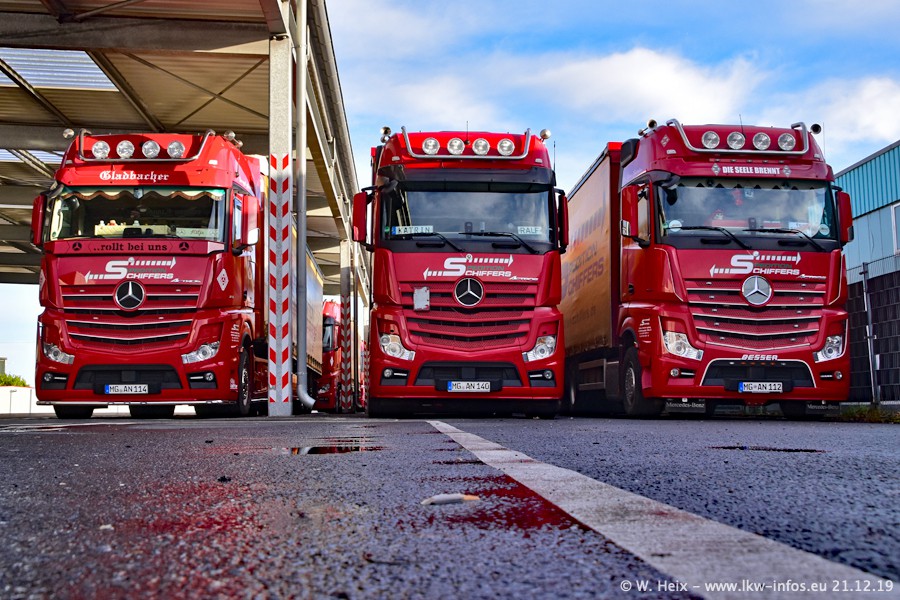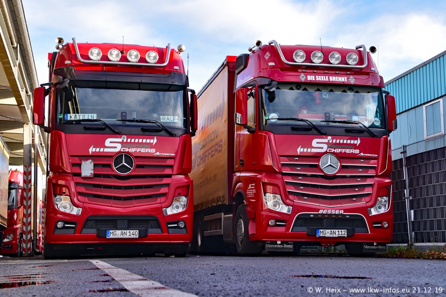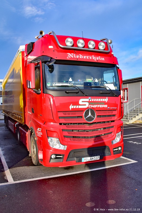 Dies war mein erster "Weihnachtsbesuch" bei Schiffers. Da die Feiertage in diesem Jahr so fallen, dass nur noch der Montag (23.12.) ein Arbeistag ist, haben schon viele Firmen ab dem 21.12. ihren Weihnachtsurlaub und bis Anfang Januar geschlossen. Und entsprechend hatte ich Glück, denn der gesamte Fuhrpark ist über Weihnachten zuhause in Mönchengladbach. Es gibt seit einigen Wochen den ersten Mercedes-Benz New Actros 4 (ohne Spiegel) im Fuhrpark. Der nächste kommt Anfang 2020.