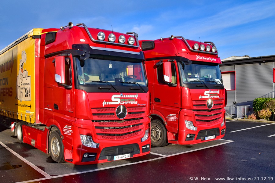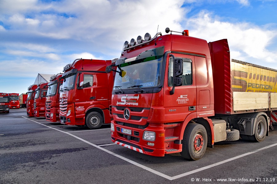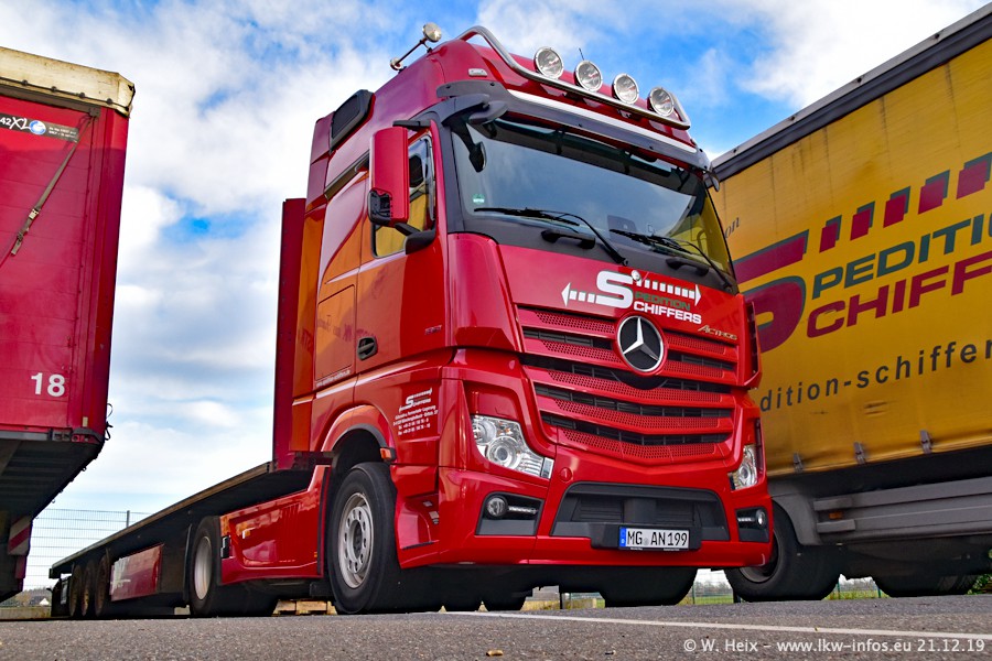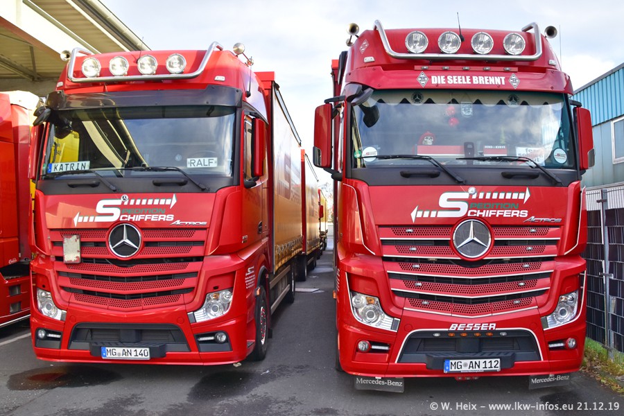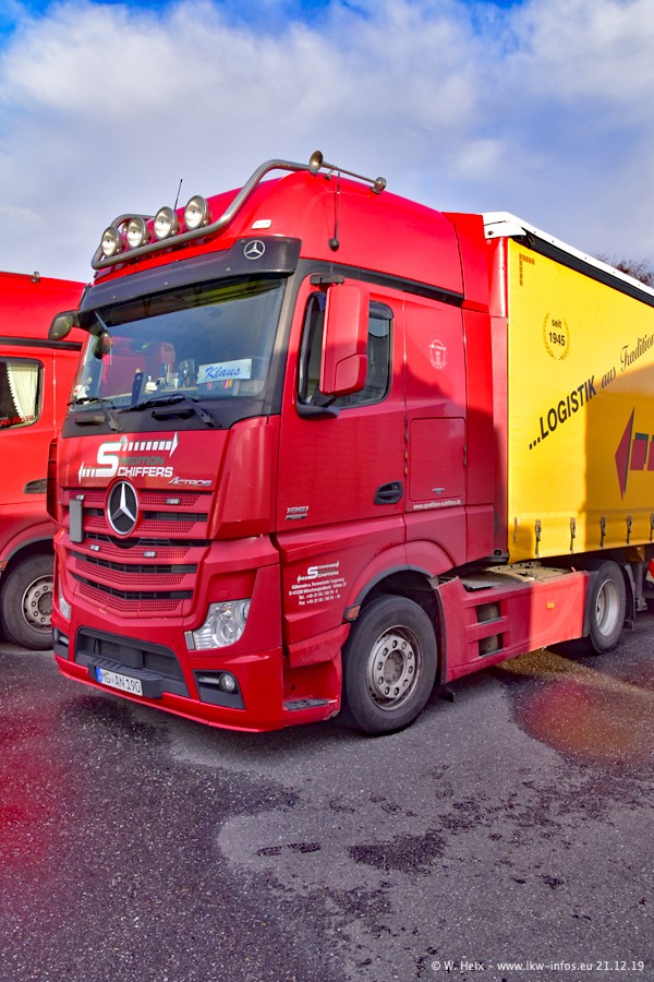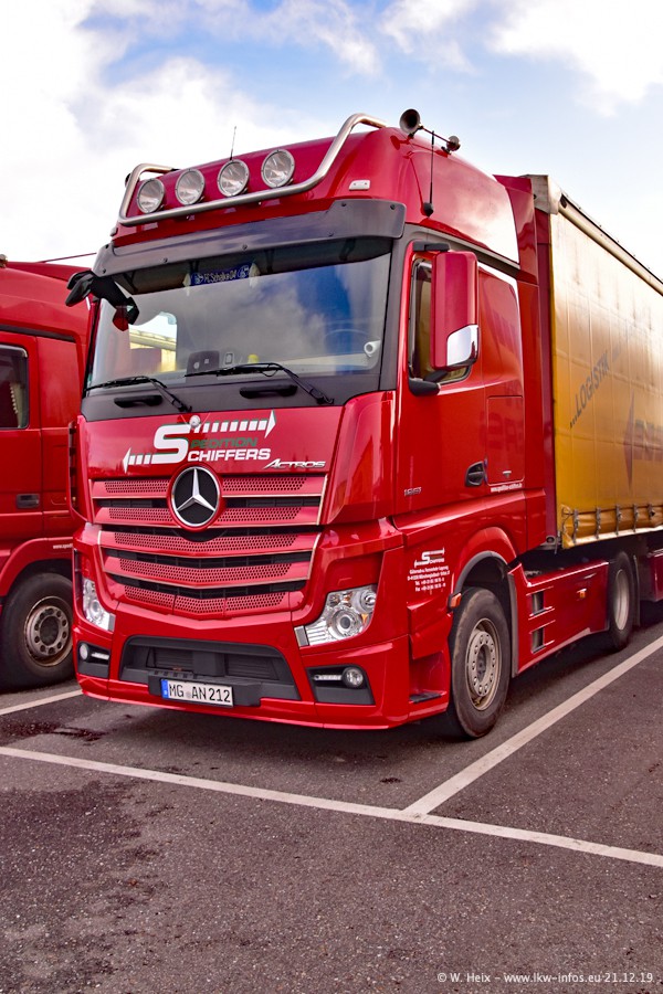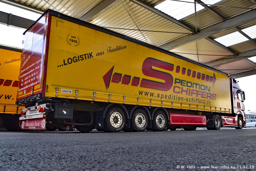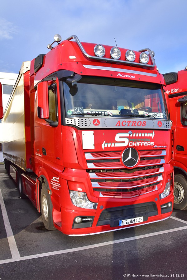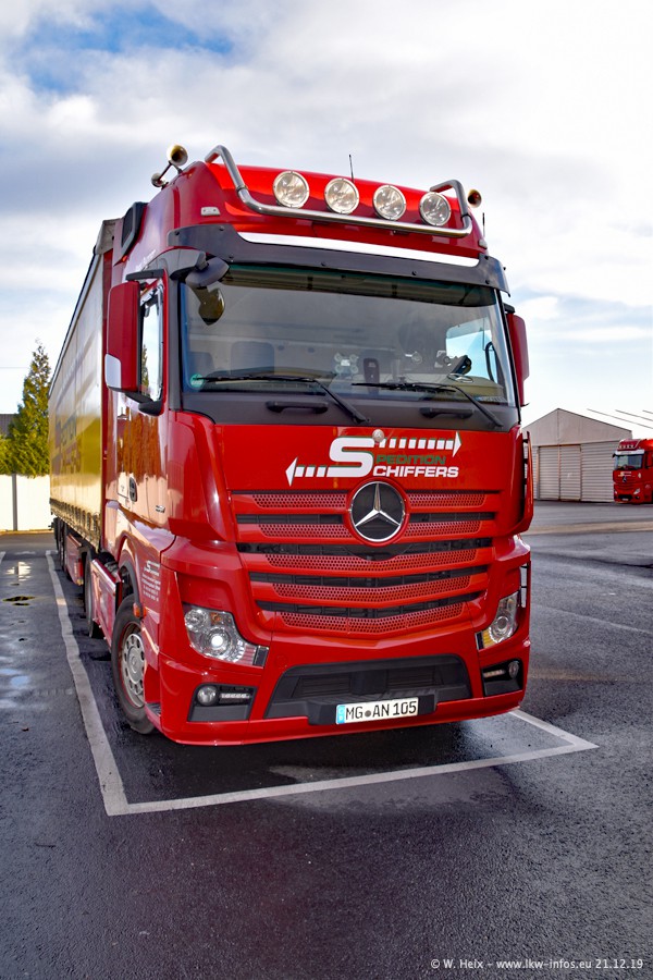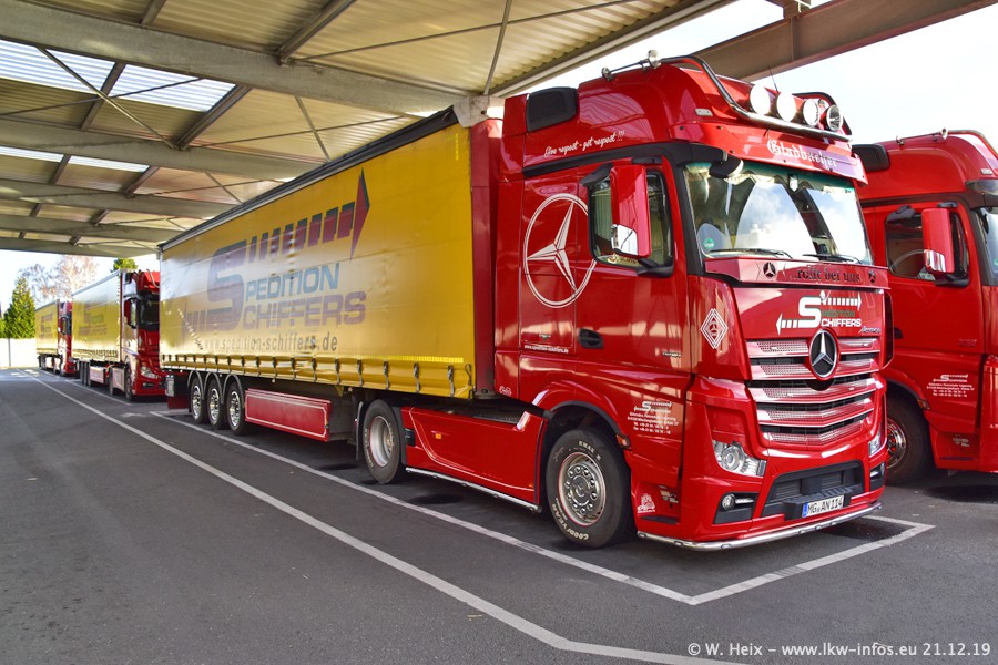 Dies war mein erster "Weihnachtsbesuch" bei Schiffers. Da die Feiertage in diesem Jahr so fallen, dass nur noch der Montag (23.12.) ein Arbeistag ist, haben schon viele Firmen ab dem 21.12. ihren Weihnachtsurlaub und bis Anfang Januar geschlossen. Und entsprechend hatte ich Glück, denn der gesamte Fuhrpark ist über Weihnachten zuhause in Mönchengladbach. Es gibt seit einigen Wochen den ersten Mercedes-Benz New Actros 4 (ohne Spiegel) im Fuhrpark. Der nächste kommt Anfang 2020.