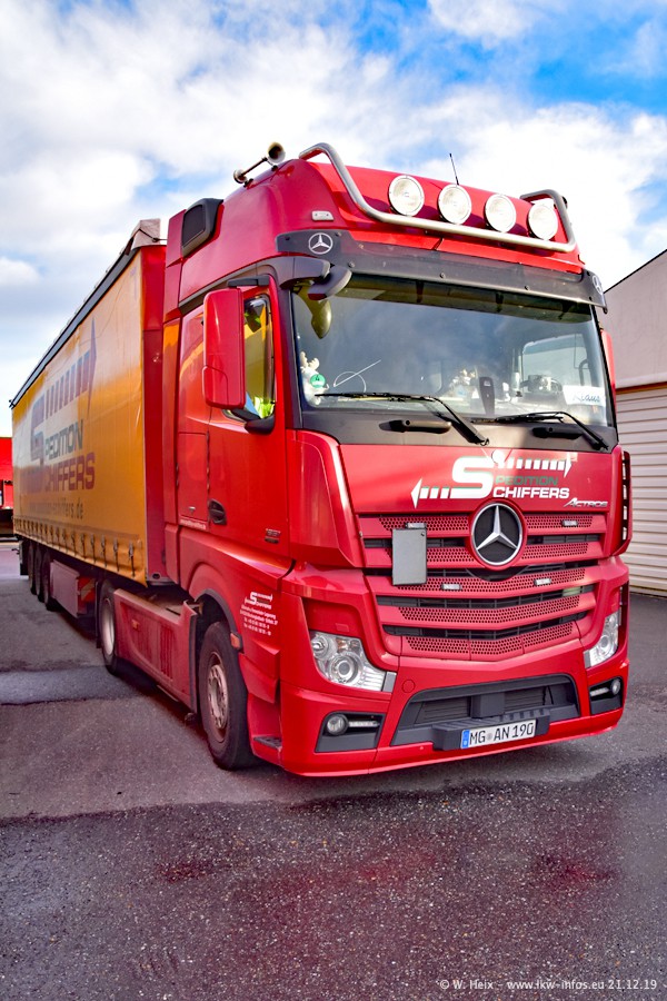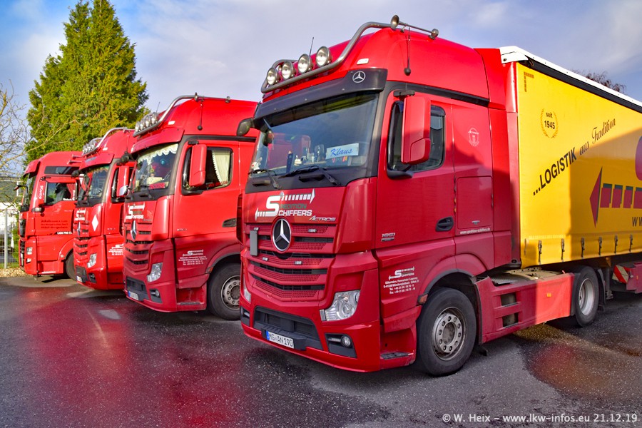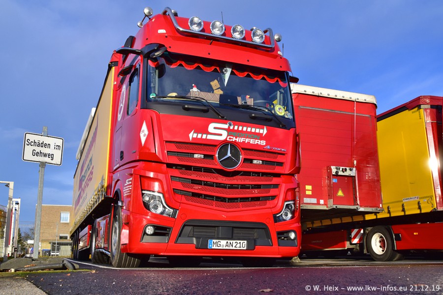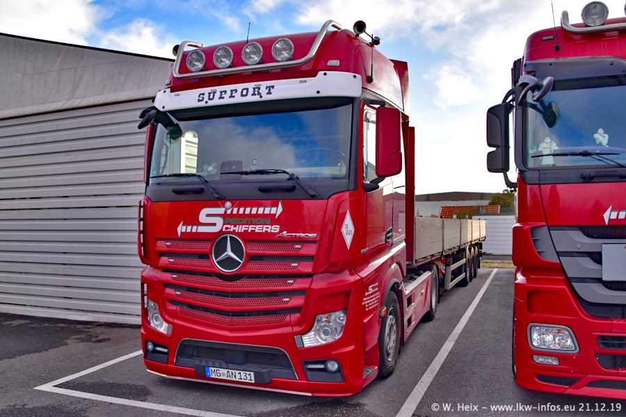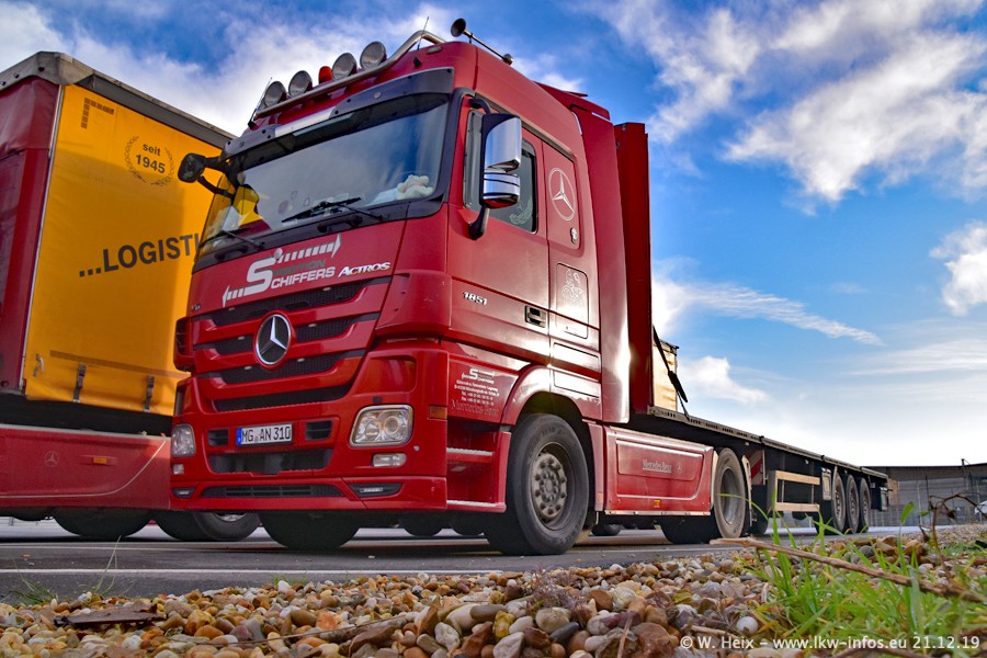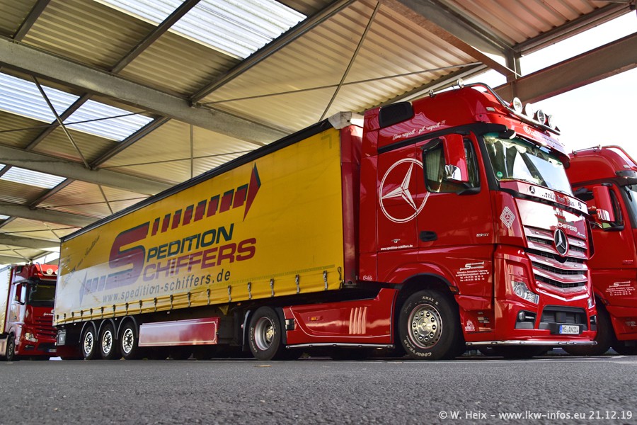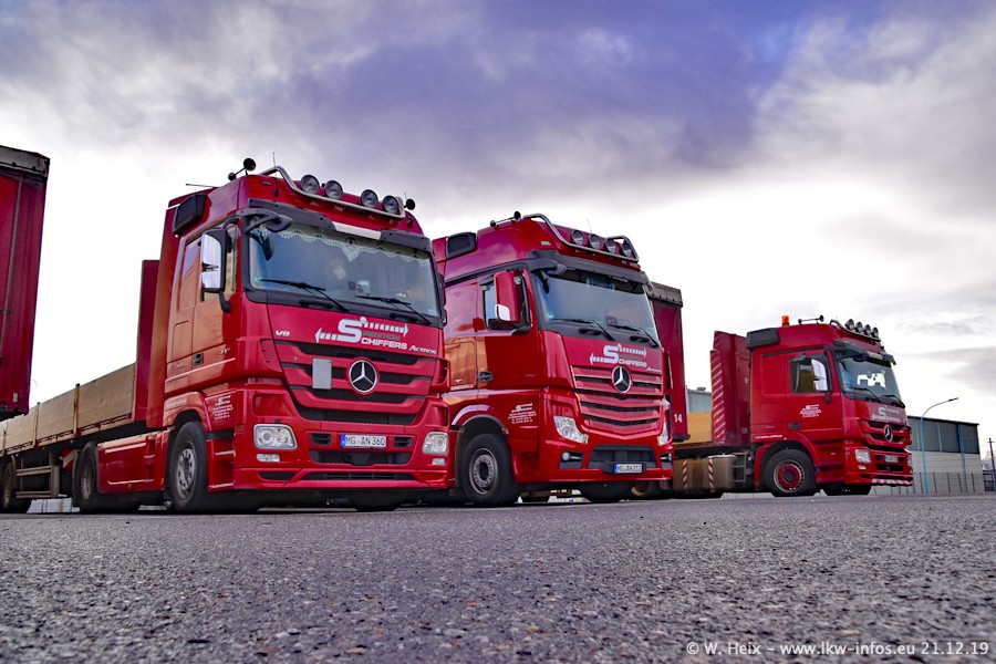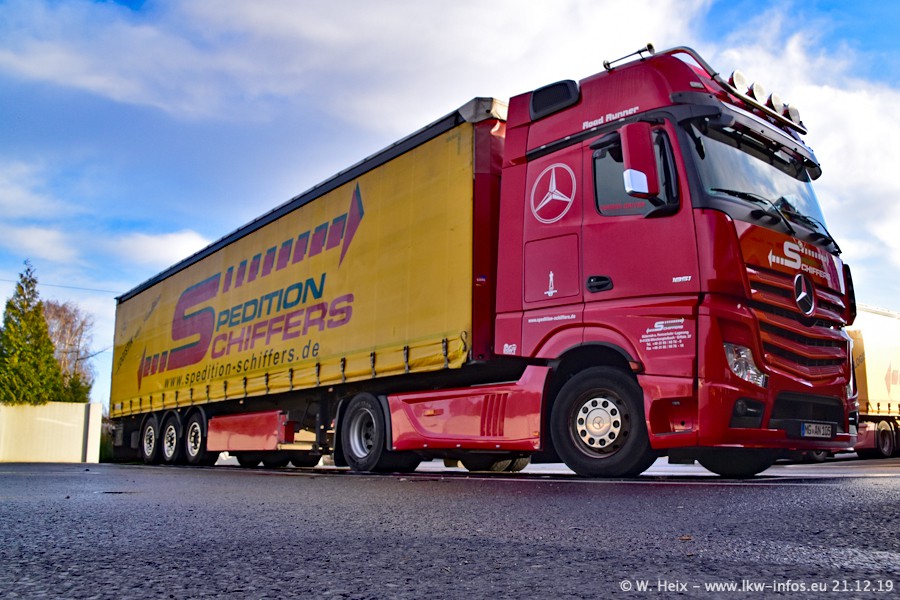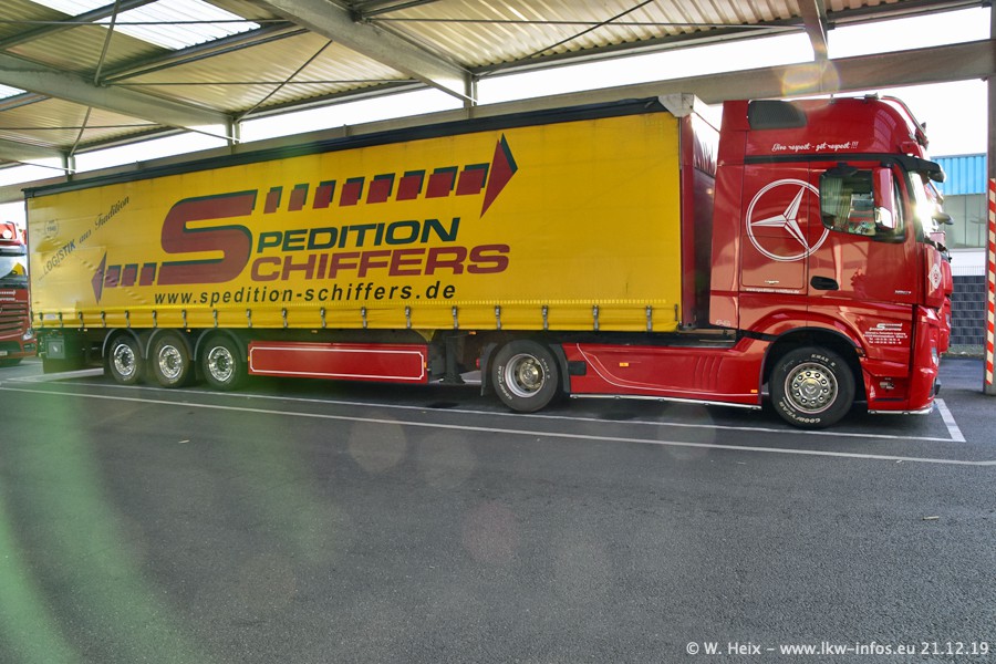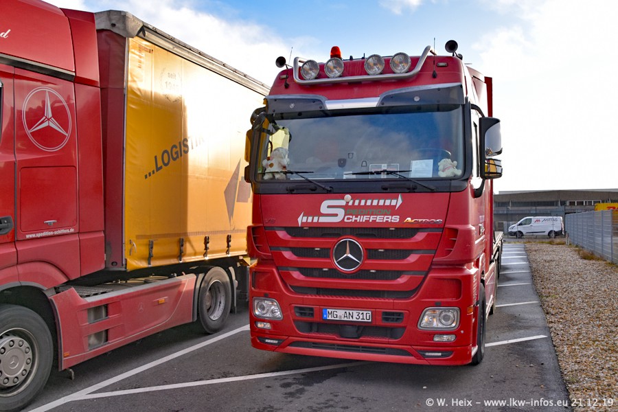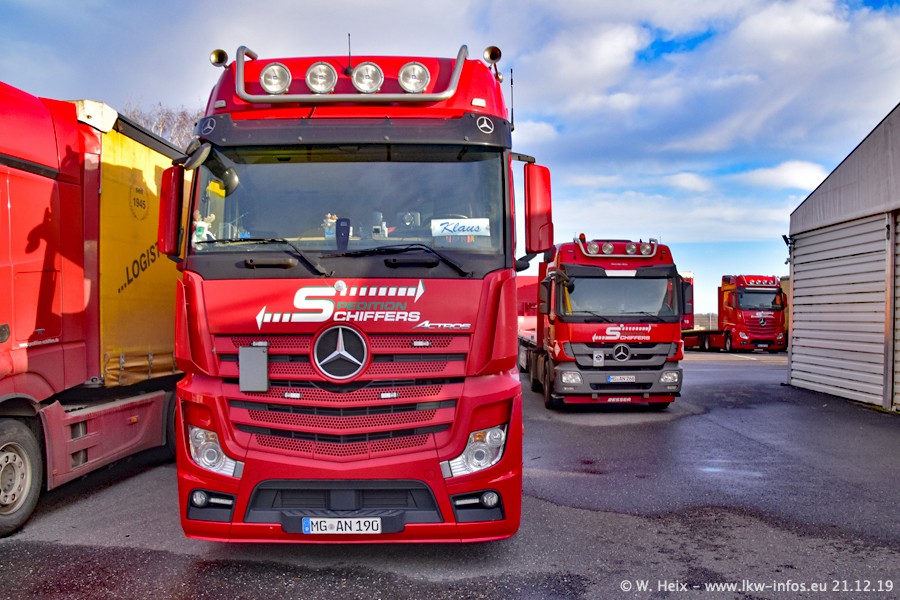 Dies war mein erster "Weihnachtsbesuch" bei Schiffers. Da die Feiertage in diesem Jahr so fallen, dass nur noch der Montag (23.12.) ein Arbeistag ist, haben schon viele Firmen ab dem 21.12. ihren Weihnachtsurlaub und bis Anfang Januar geschlossen. Und entsprechend hatte ich Glück, denn der gesamte Fuhrpark ist über Weihnachten zuhause in Mönchengladbach. Es gibt seit einigen Wochen den ersten Mercedes-Benz New Actros 4 (ohne Spiegel) im Fuhrpark. Der nächste kommt Anfang 2020.