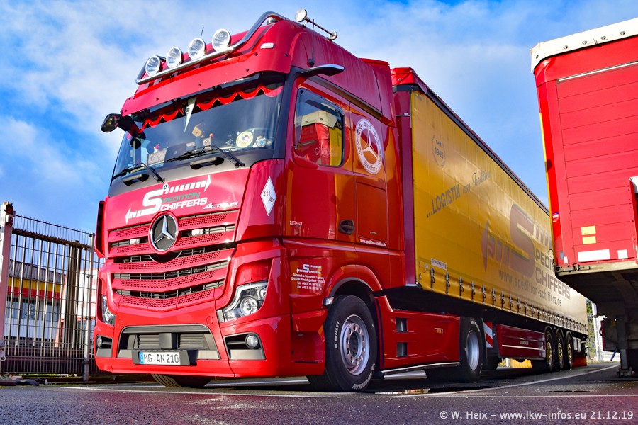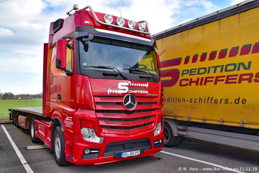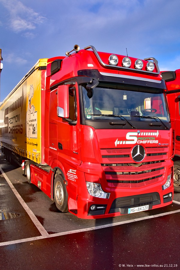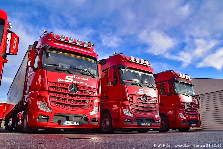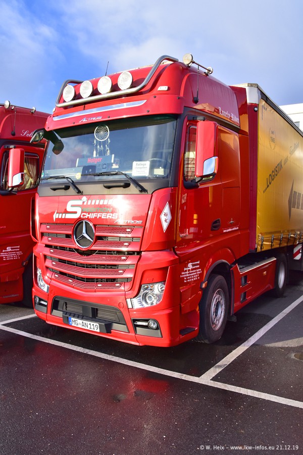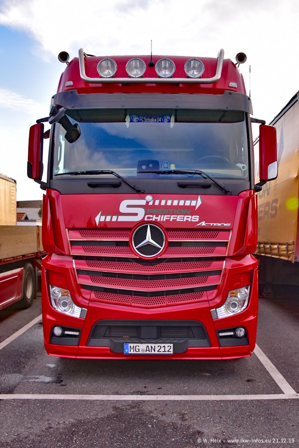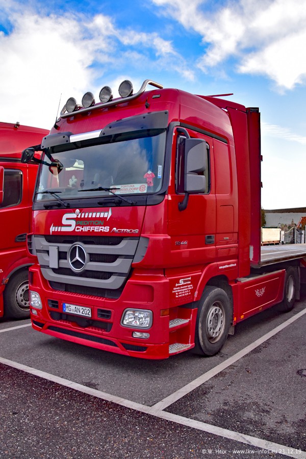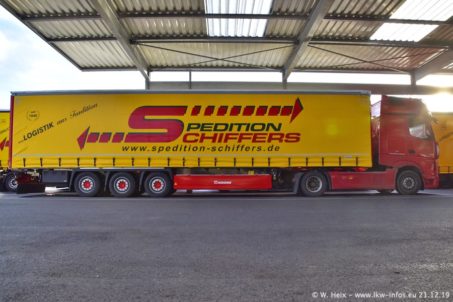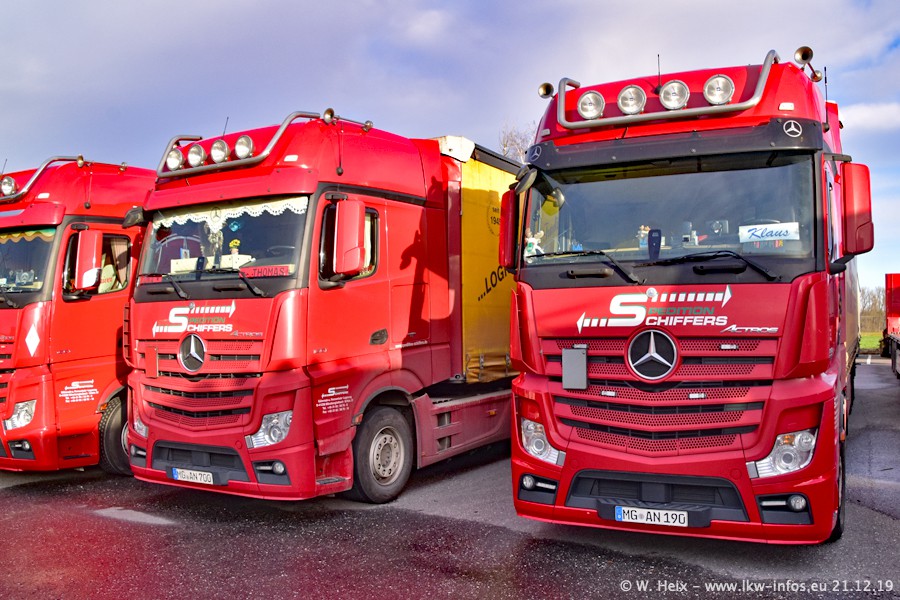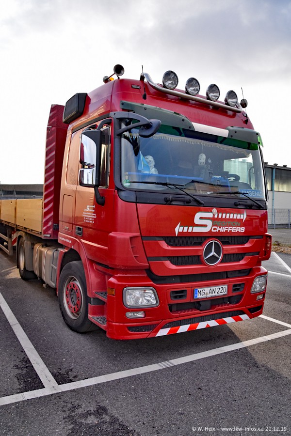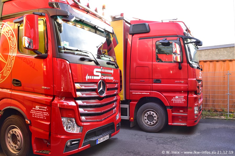 Dies war mein erster "Weihnachtsbesuch" bei Schiffers. Da die Feiertage in diesem Jahr so fallen, dass nur noch der Montag (23.12.) ein Arbeistag ist, haben schon viele Firmen ab dem 21.12. ihren Weihnachtsurlaub und bis Anfang Januar geschlossen. Und entsprechend hatte ich Glück, denn der gesamte Fuhrpark ist über Weihnachten zuhause in Mönchengladbach. Es gibt seit einigen Wochen den ersten Mercedes-Benz New Actros 4 (ohne Spiegel) im Fuhrpark. Der nächste kommt Anfang 2020.