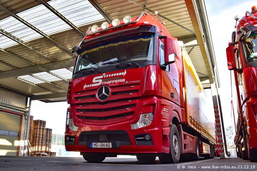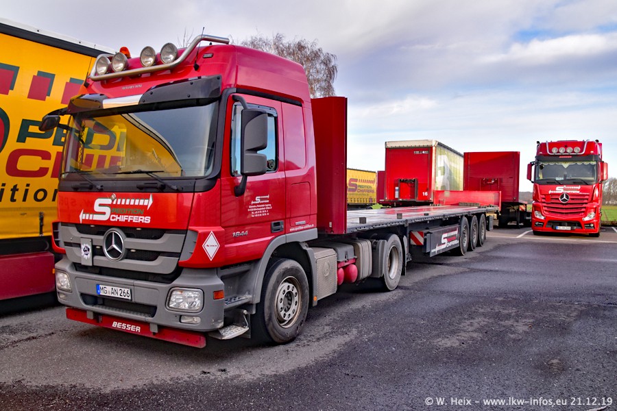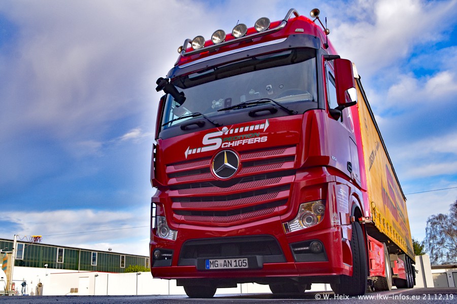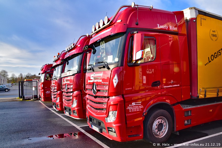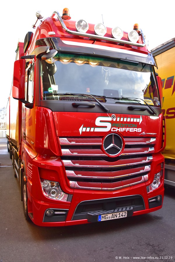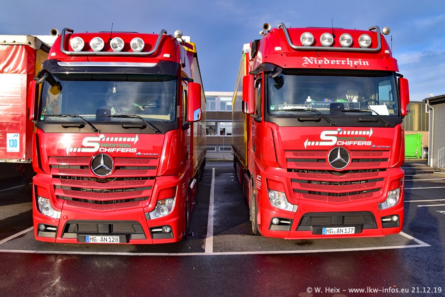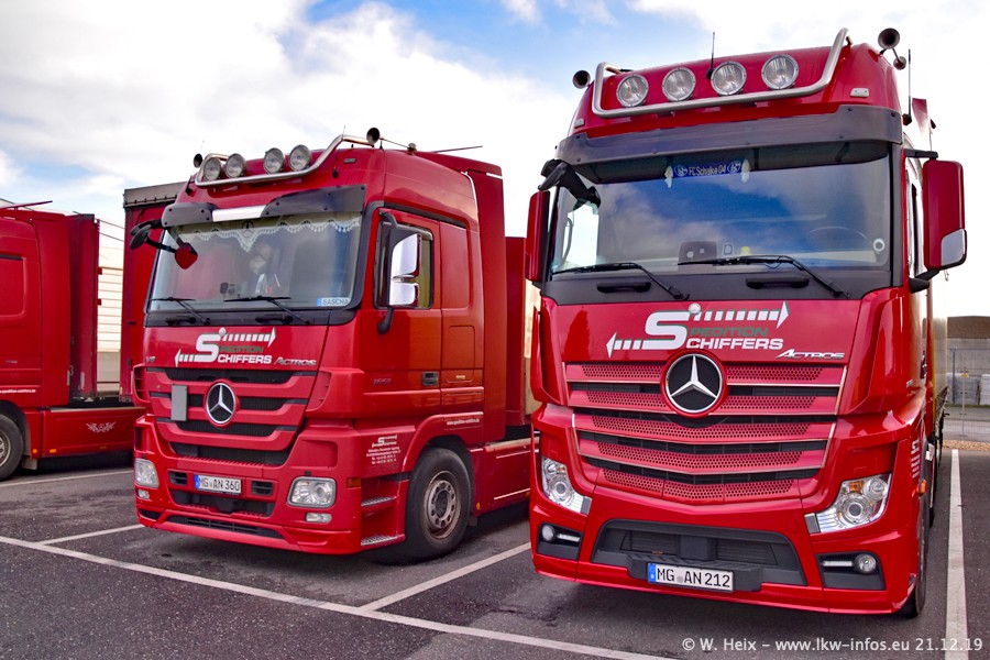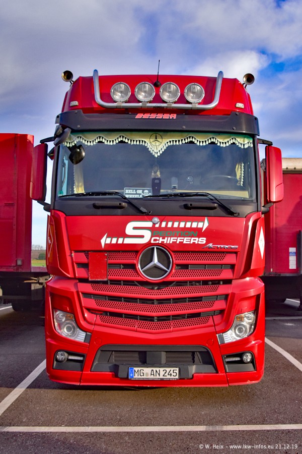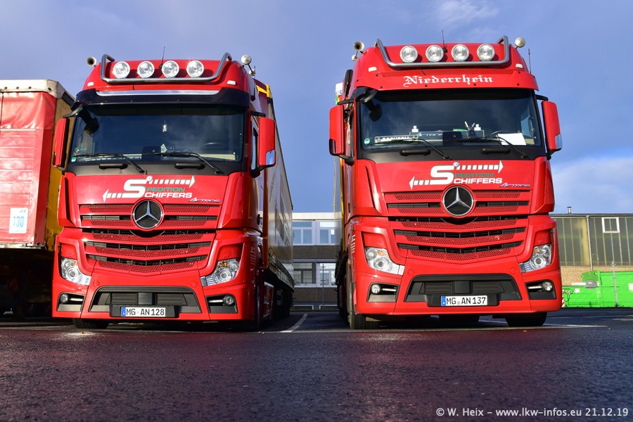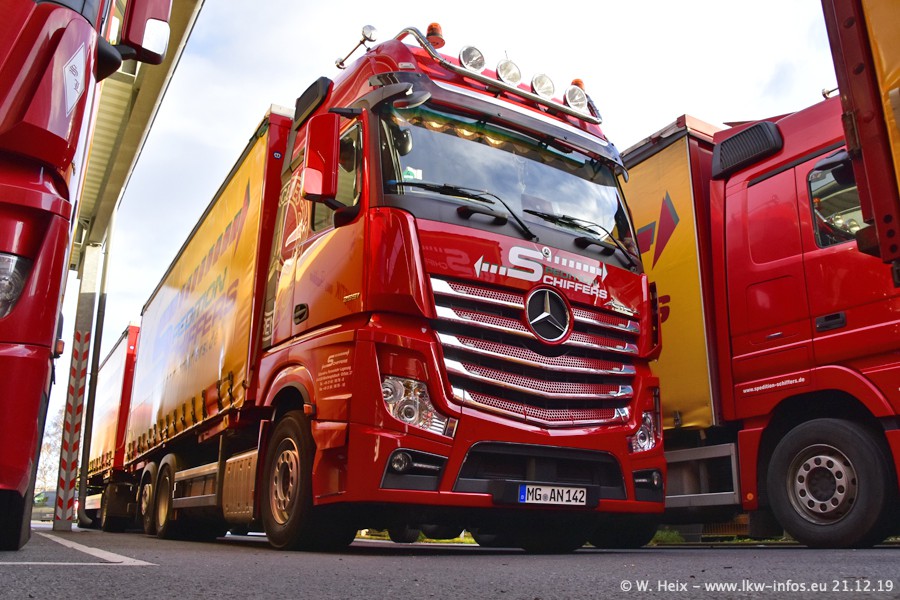 Dies war mein erster "Weihnachtsbesuch" bei Schiffers. Da die Feiertage in diesem Jahr so fallen, dass nur noch der Montag (23.12.) ein Arbeistag ist, haben schon viele Firmen ab dem 21.12. ihren Weihnachtsurlaub und bis Anfang Januar geschlossen. Und entsprechend hatte ich Glück, denn der gesamte Fuhrpark ist über Weihnachten zuhause in Mönchengladbach. Es gibt seit einigen Wochen den ersten Mercedes-Benz New Actros 4 (ohne Spiegel) im Fuhrpark. Der nächste kommt Anfang 2020.