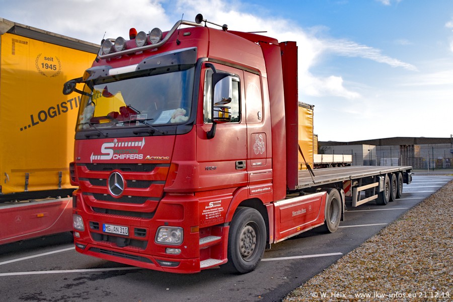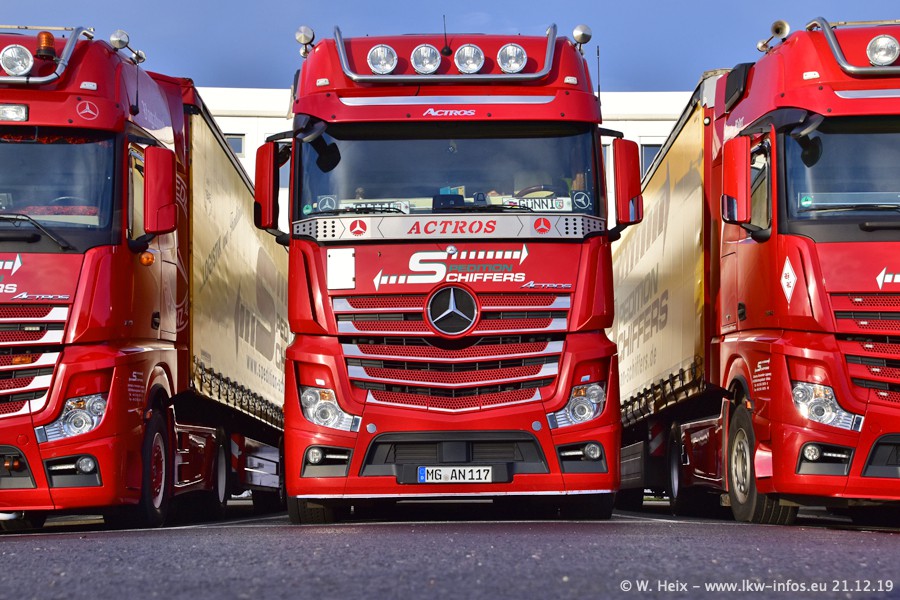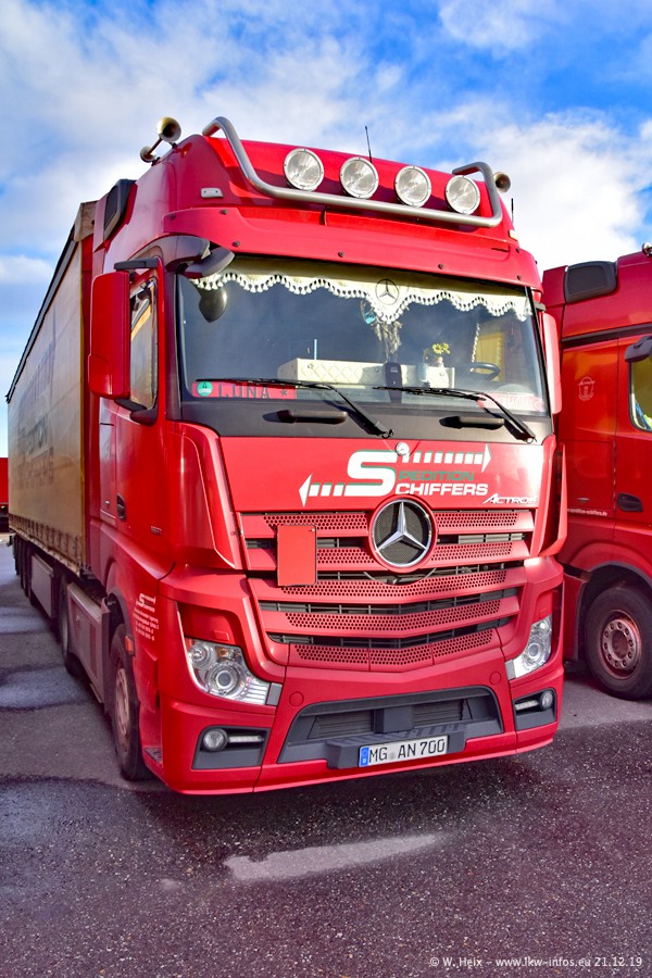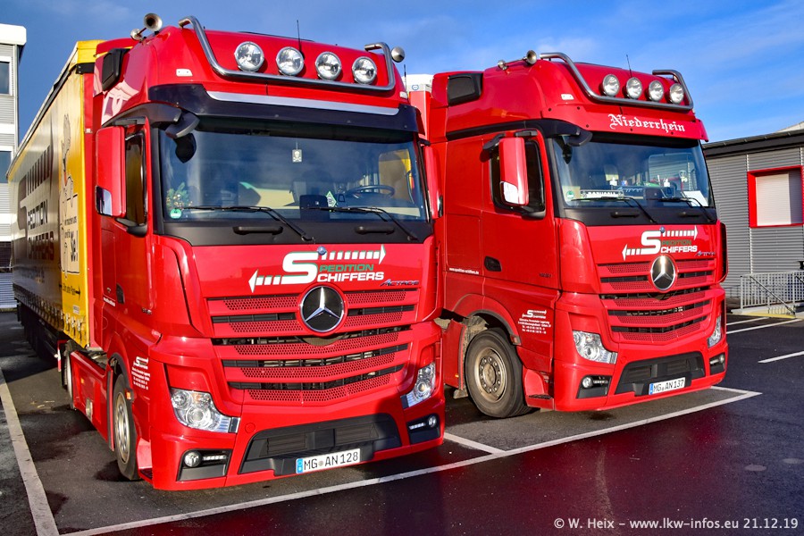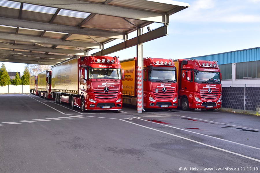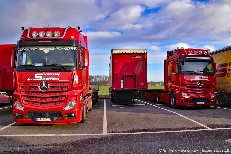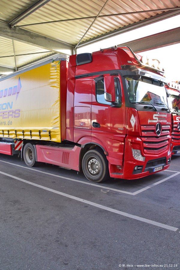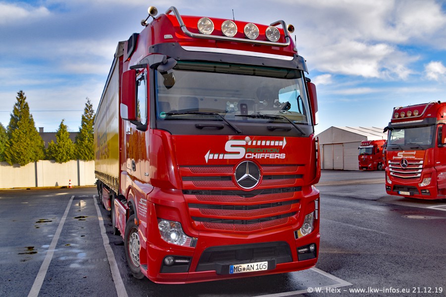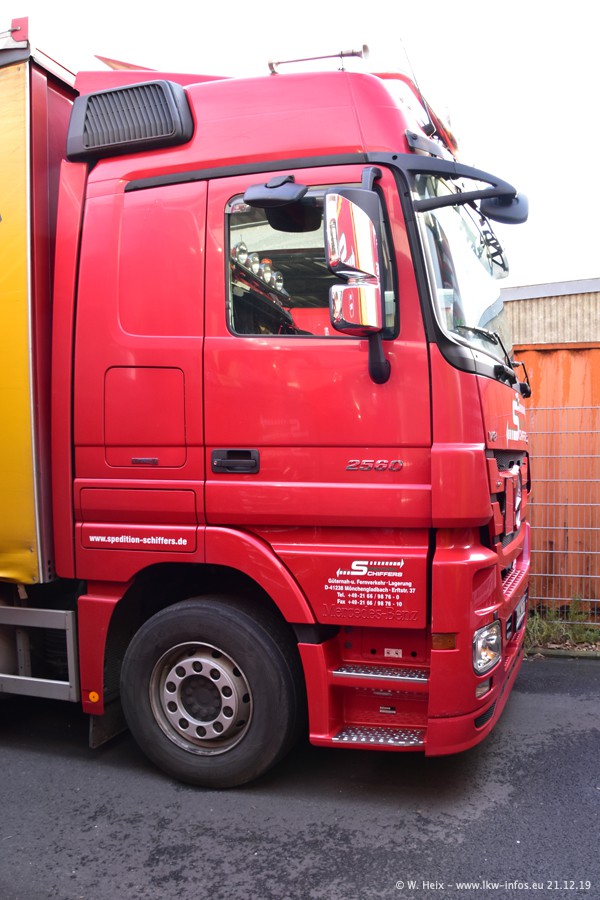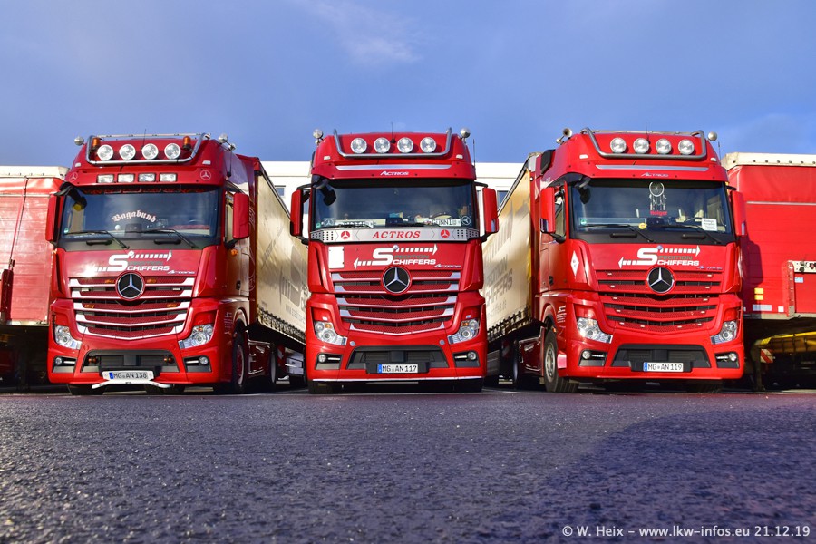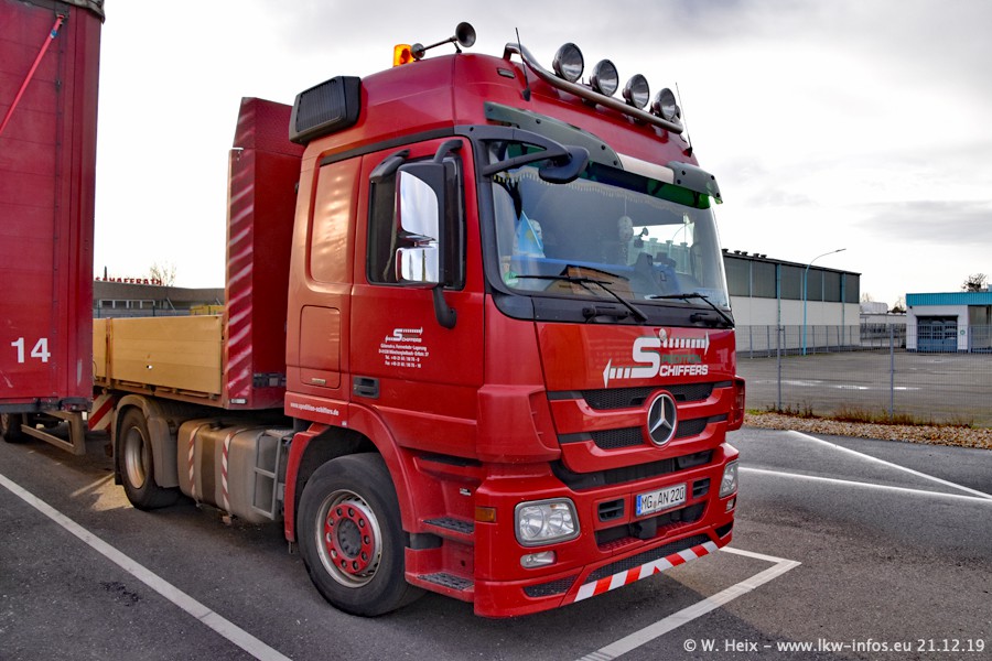 Dies war mein erster "Weihnachtsbesuch" bei Schiffers. Da die Feiertage in diesem Jahr so fallen, dass nur noch der Montag (23.12.) ein Arbeistag ist, haben schon viele Firmen ab dem 21.12. ihren Weihnachtsurlaub und bis Anfang Januar geschlossen. Und entsprechend hatte ich Glück, denn der gesamte Fuhrpark ist über Weihnachten zuhause in Mönchengladbach. Es gibt seit einigen Wochen den ersten Mercedes-Benz New Actros 4 (ohne Spiegel) im Fuhrpark. Der nächste kommt Anfang 2020.