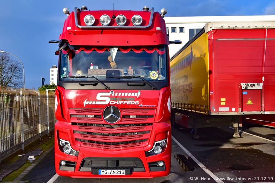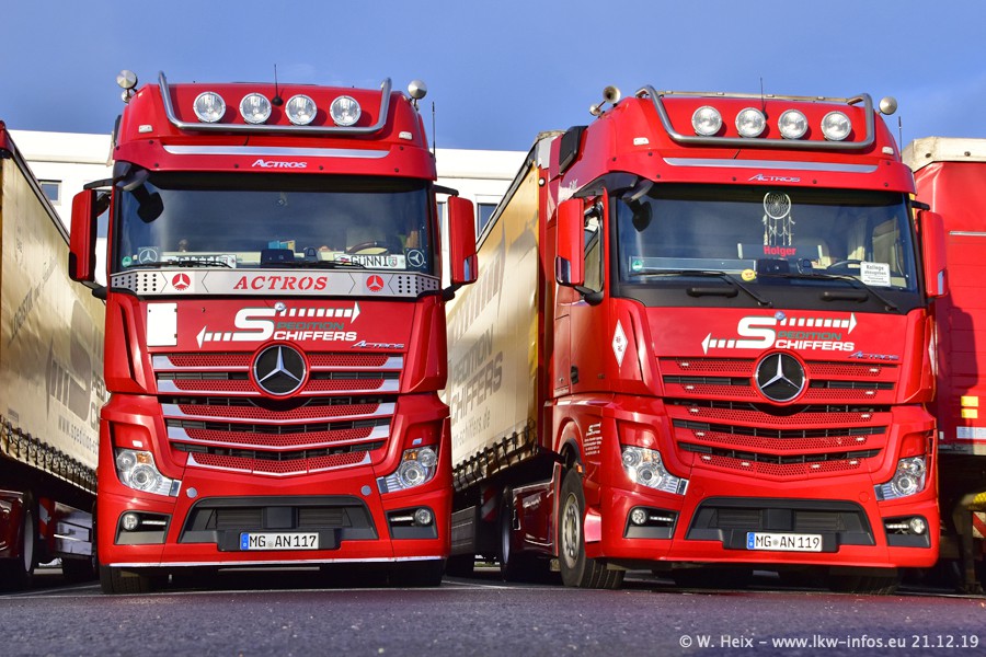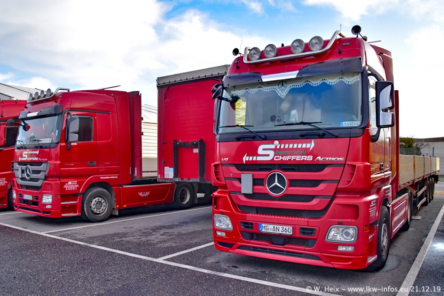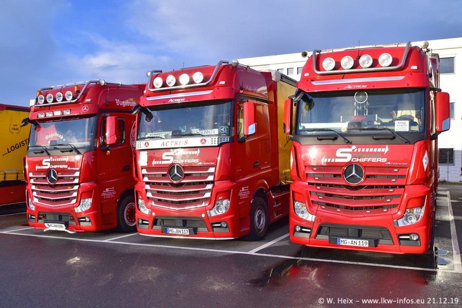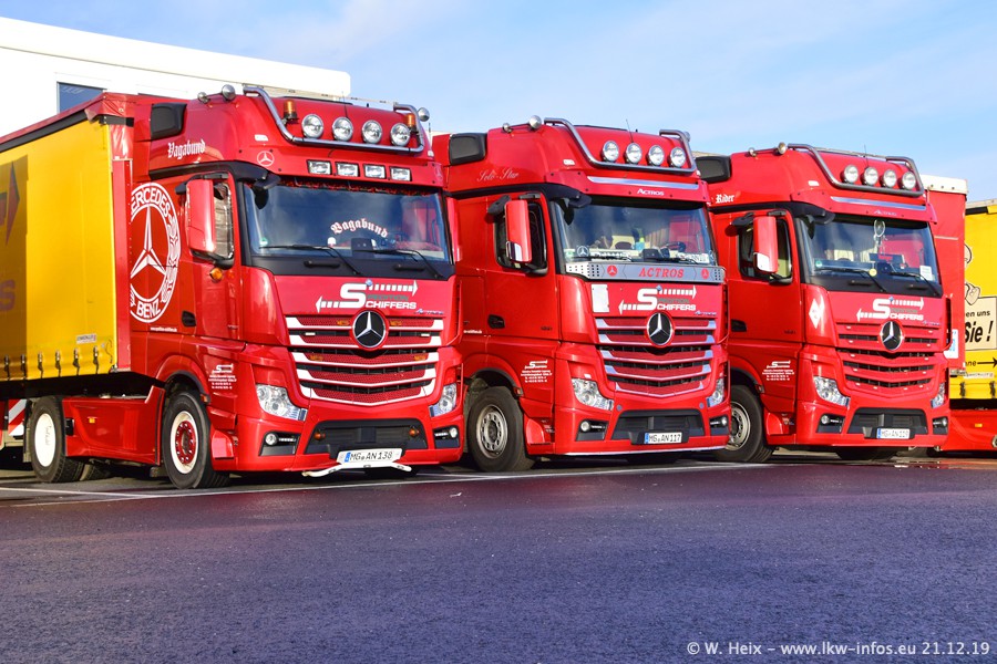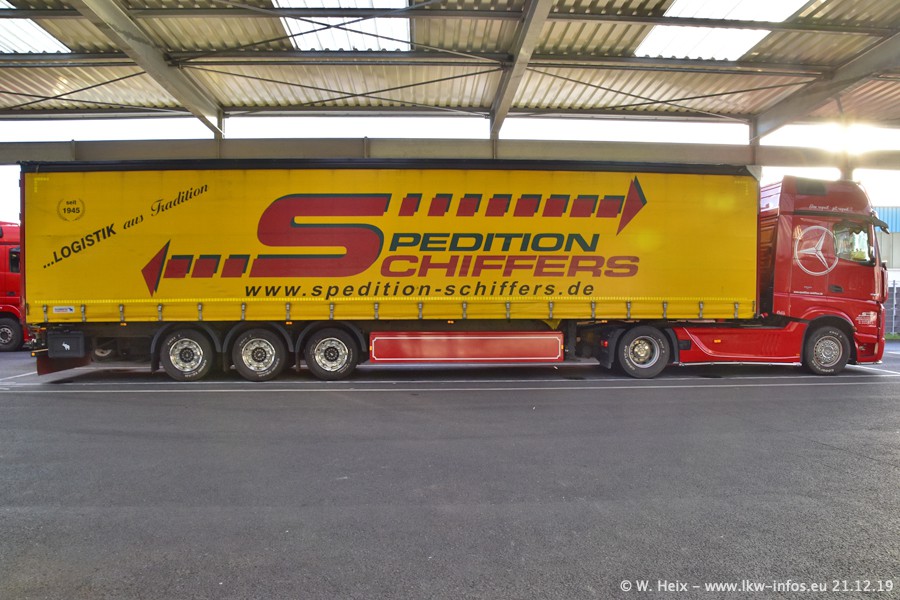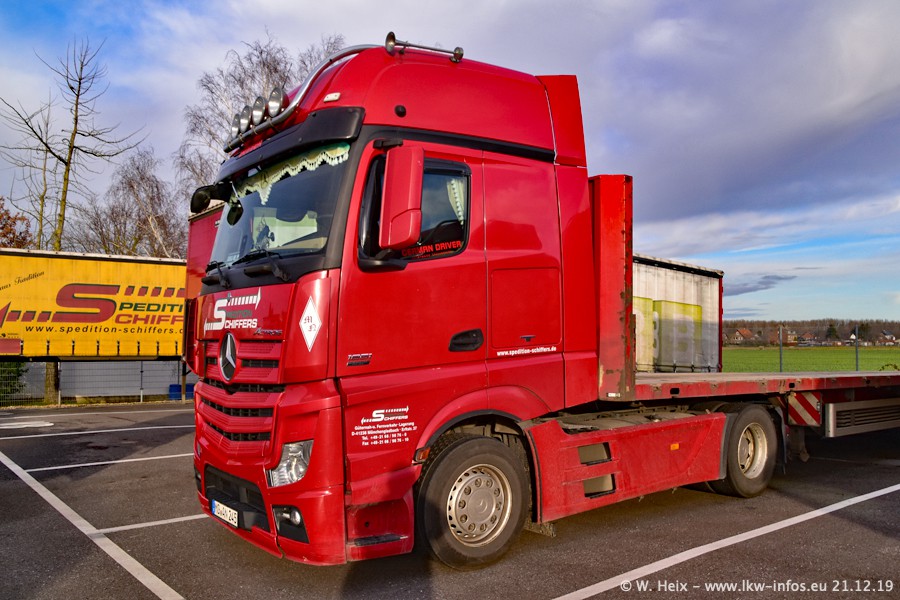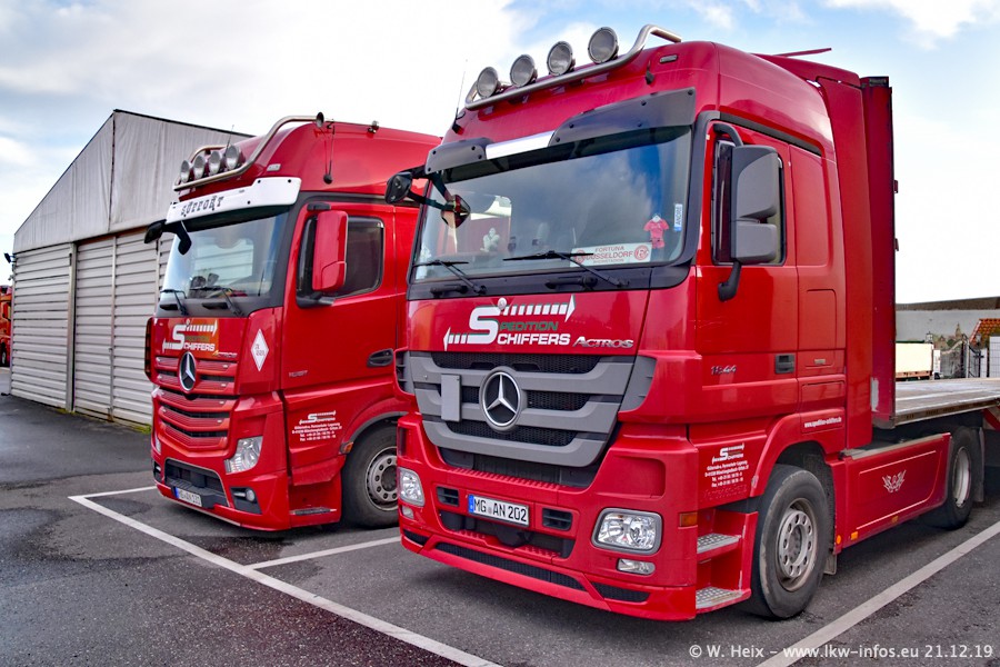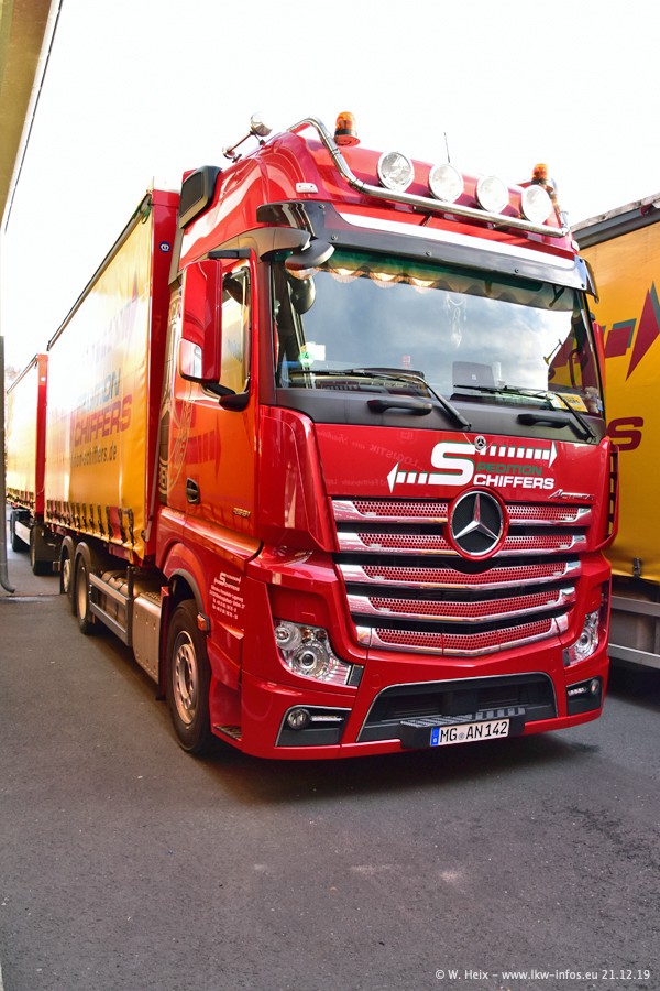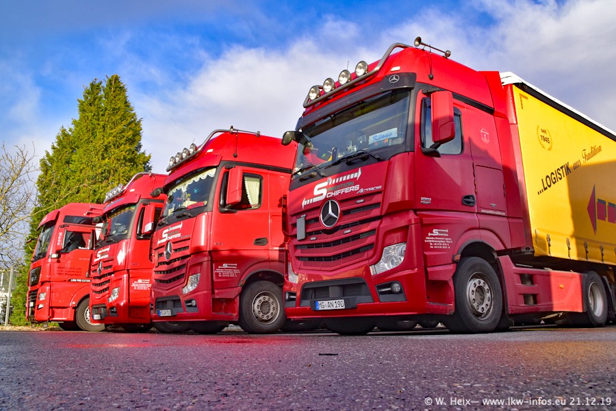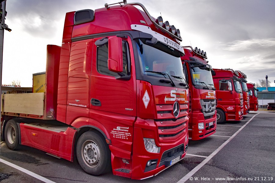 Dies war mein erster "Weihnachtsbesuch" bei Schiffers. Da die Feiertage in diesem Jahr so fallen, dass nur noch der Montag (23.12.) ein Arbeistag ist, haben schon viele Firmen ab dem 21.12. ihren Weihnachtsurlaub und bis Anfang Januar geschlossen. Und entsprechend hatte ich Glück, denn der gesamte Fuhrpark ist über Weihnachten zuhause in Mönchengladbach. Es gibt seit einigen Wochen den ersten Mercedes-Benz New Actros 4 (ohne Spiegel) im Fuhrpark. Der nächste kommt Anfang 2020.
