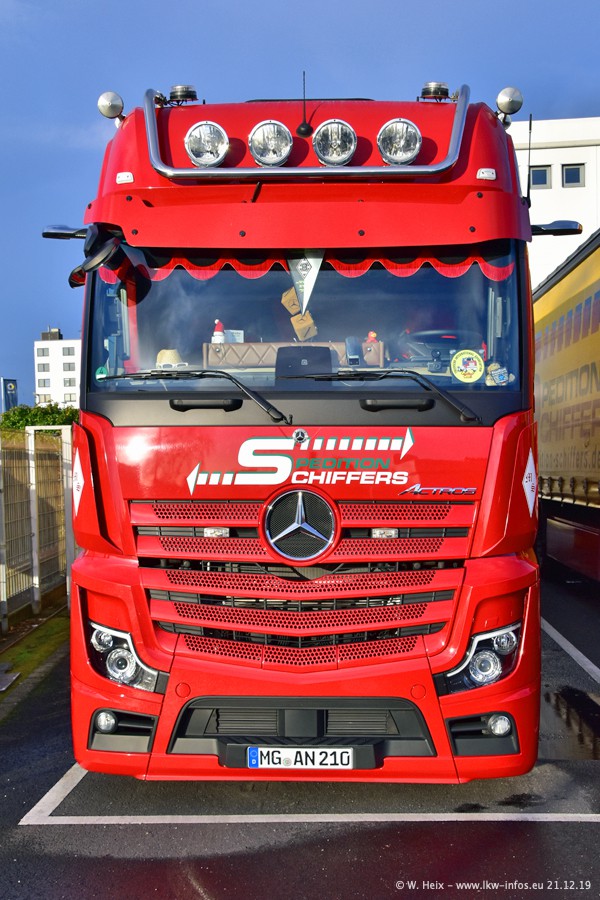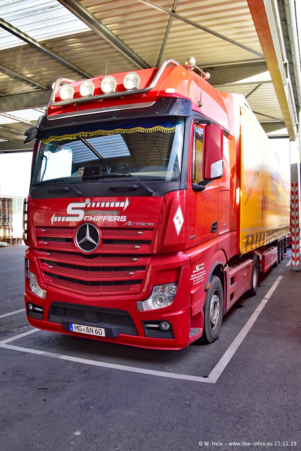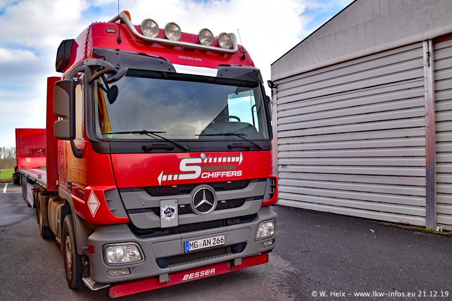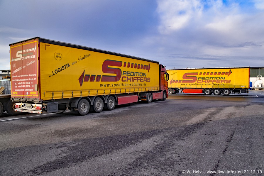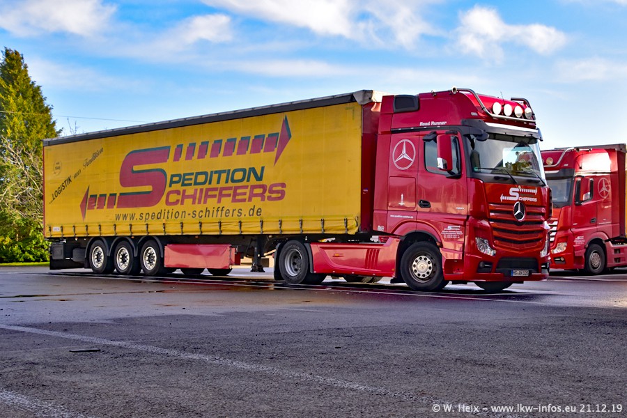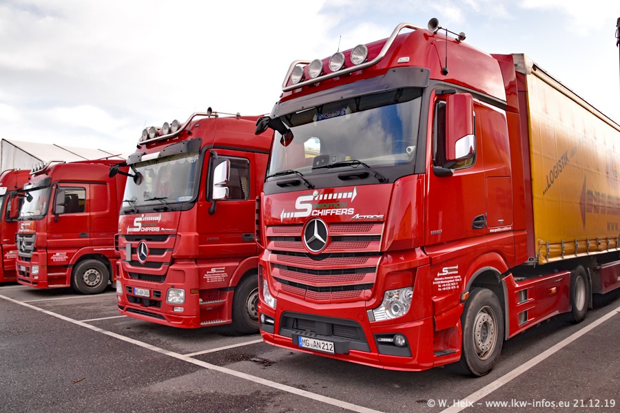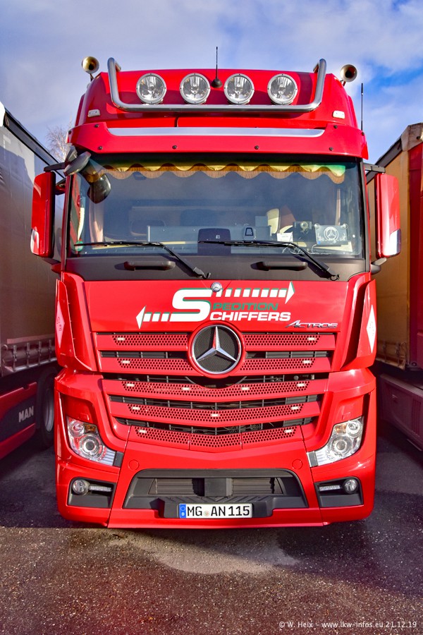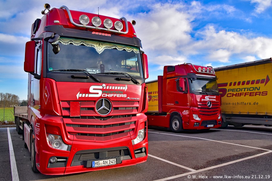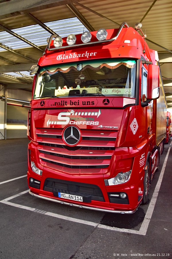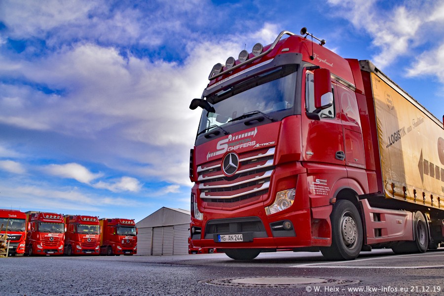 Dies war mein erster "Weihnachtsbesuch" bei Schiffers. Da die Feiertage in diesem Jahr so fallen, dass nur noch der Montag (23.12.) ein Arbeistag ist, haben schon viele Firmen ab dem 21.12. ihren Weihnachtsurlaub und bis Anfang Januar geschlossen. Und entsprechend hatte ich Glück, denn der gesamte Fuhrpark ist über Weihnachten zuhause in Mönchengladbach. Es gibt seit einigen Wochen den ersten Mercedes-Benz New Actros 4 (ohne Spiegel) im Fuhrpark. Der nächste kommt Anfang 2020.
