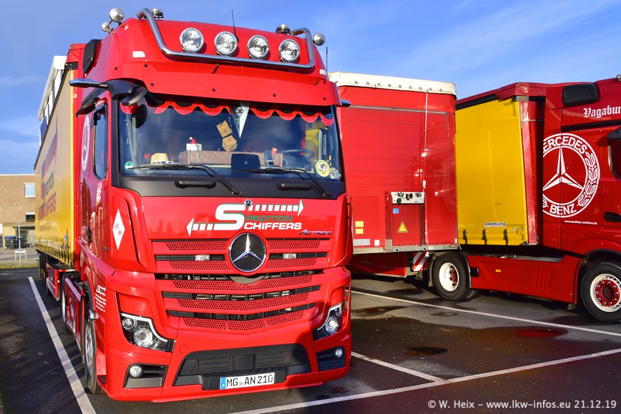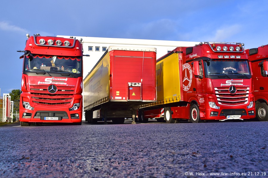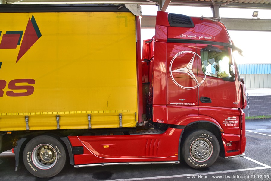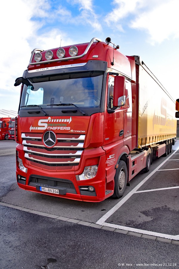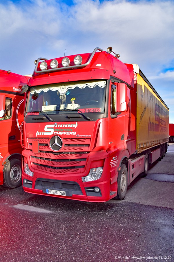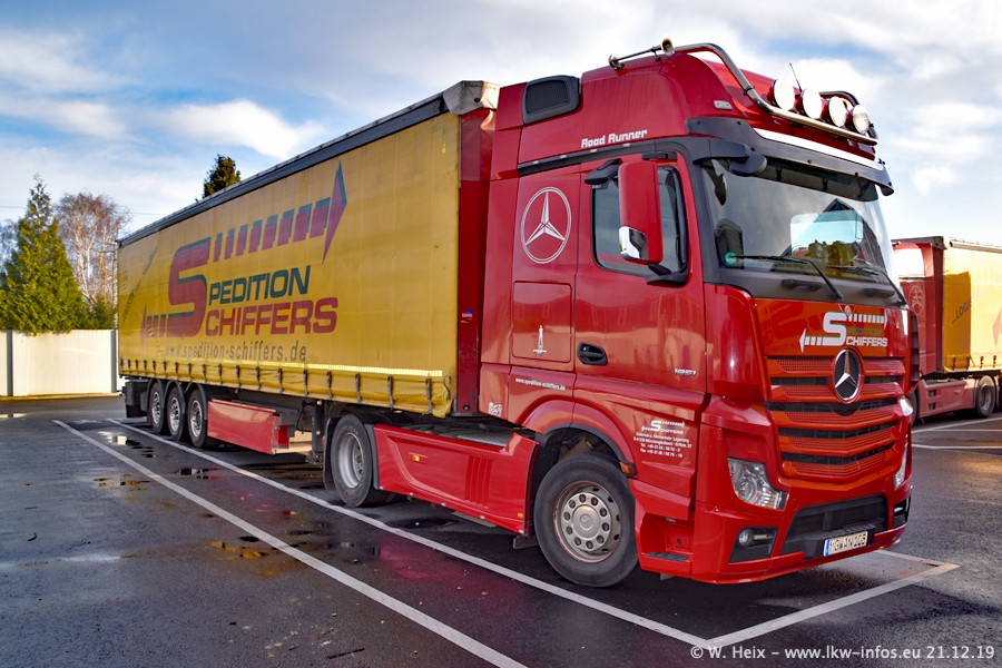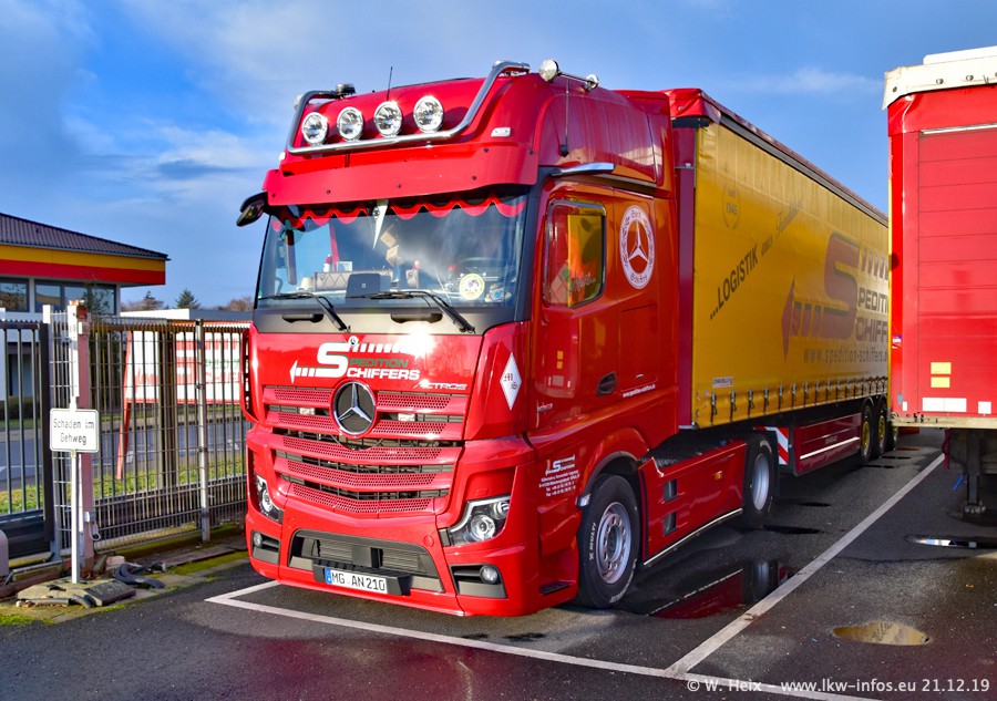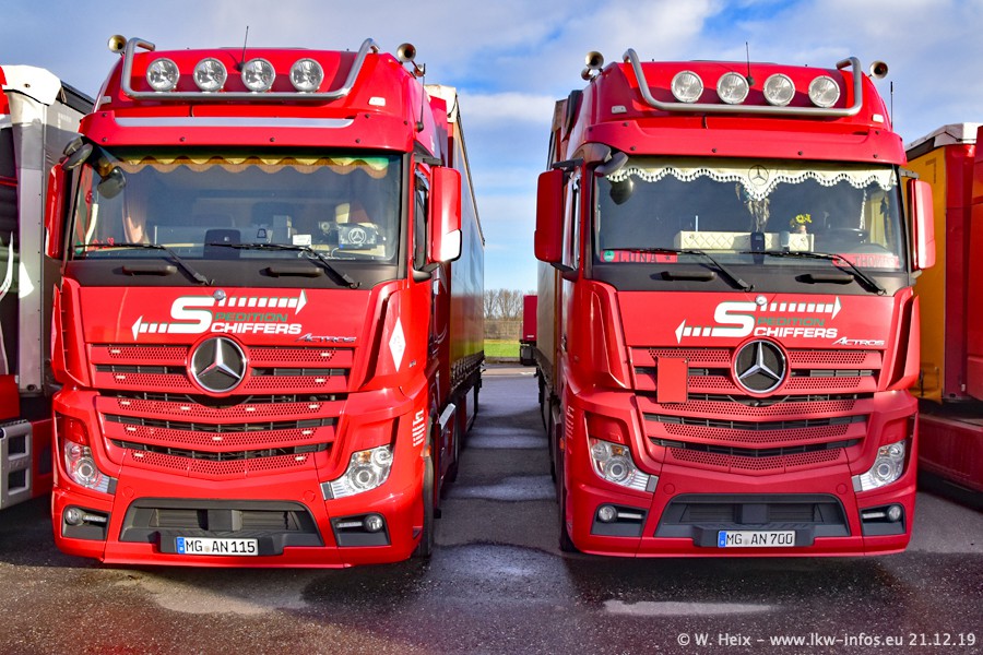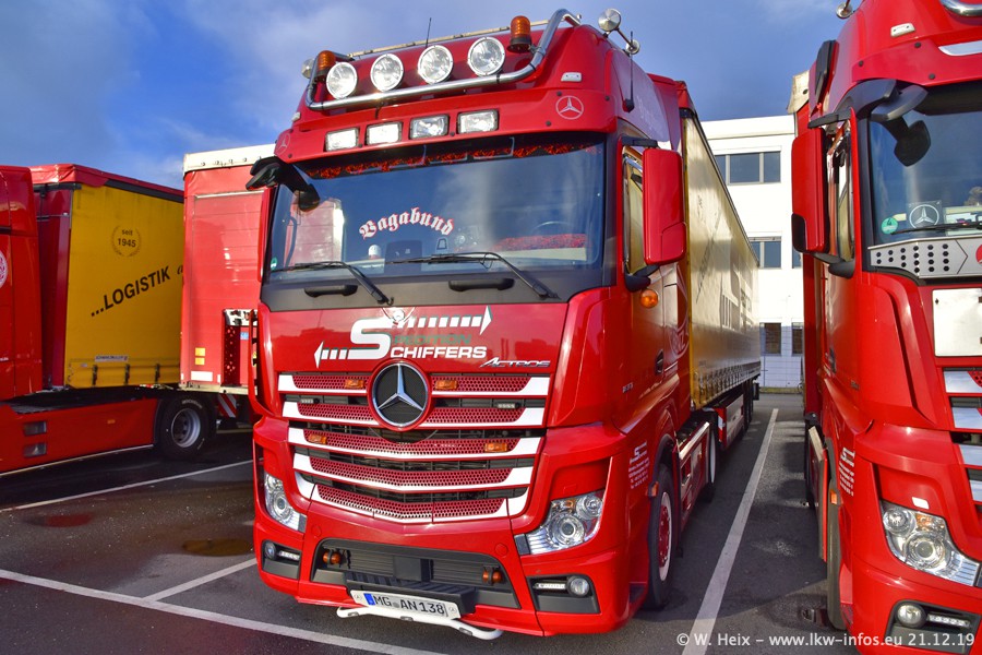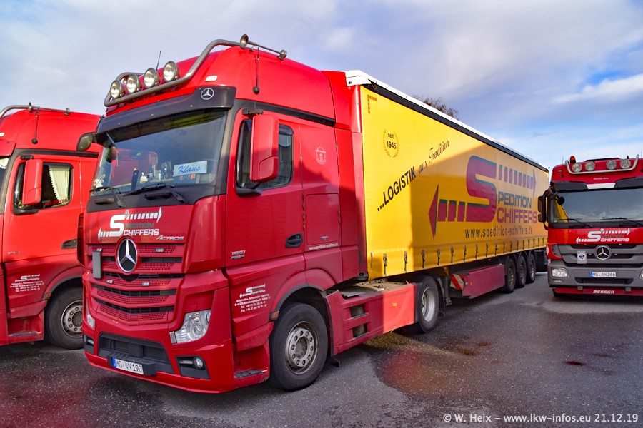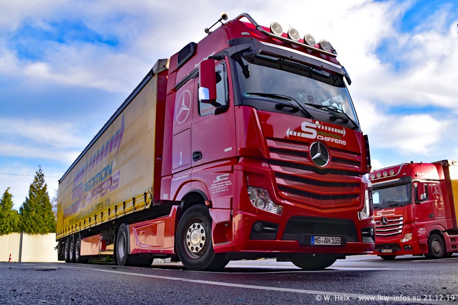 Dies war mein erster "Weihnachtsbesuch" bei Schiffers. Da die Feiertage in diesem Jahr so fallen, dass nur noch der Montag (23.12.) ein Arbeistag ist, haben schon viele Firmen ab dem 21.12. ihren Weihnachtsurlaub und bis Anfang Januar geschlossen. Und entsprechend hatte ich Glück, denn der gesamte Fuhrpark ist über Weihnachten zuhause in Mönchengladbach. Es gibt seit einigen Wochen den ersten Mercedes-Benz New Actros 4 (ohne Spiegel) im Fuhrpark. Der nächste kommt Anfang 2020.