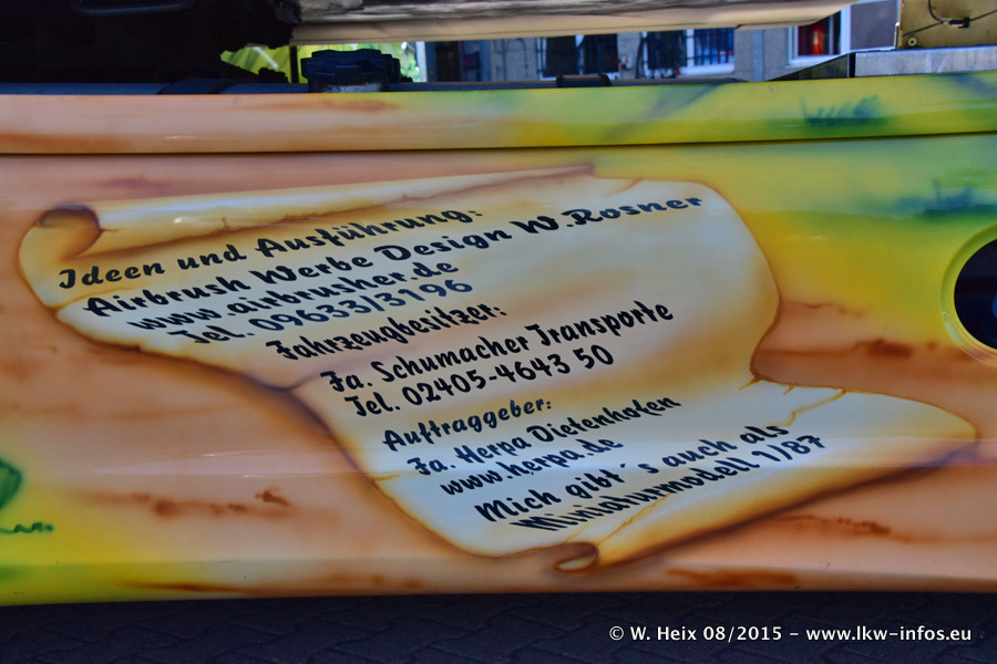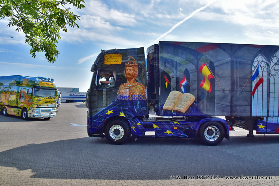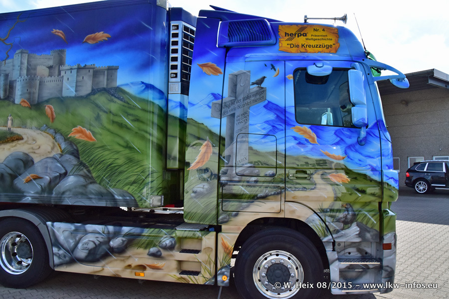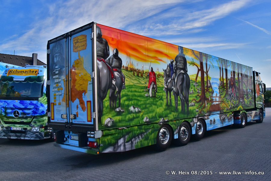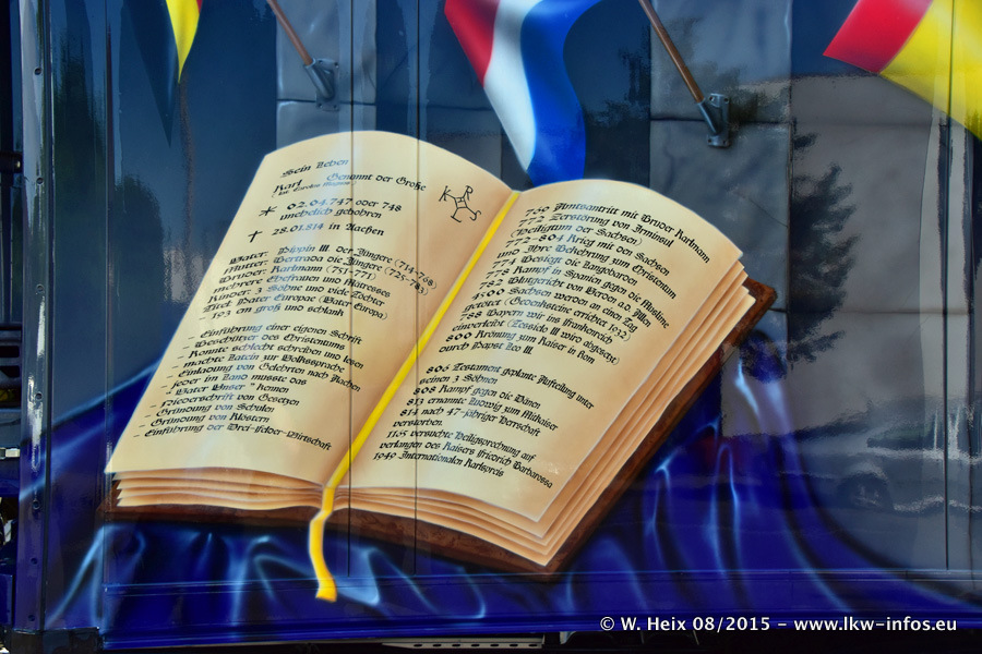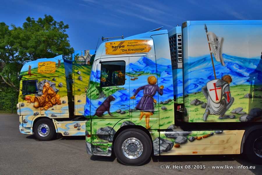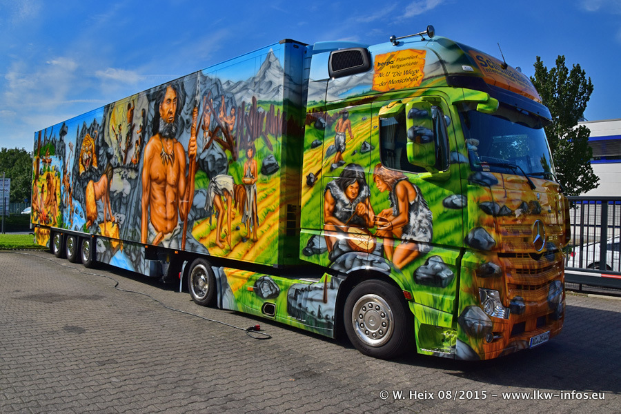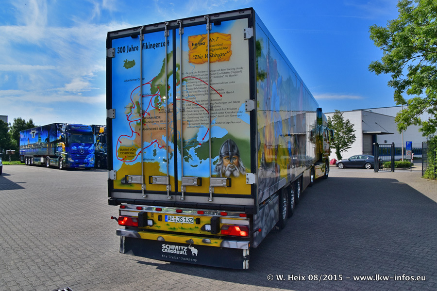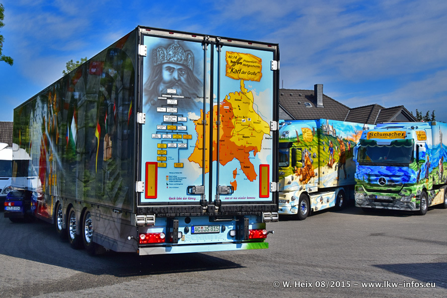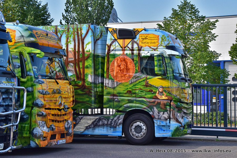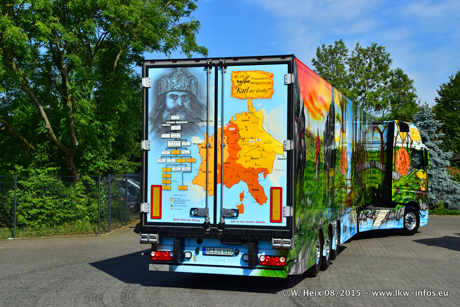 Bei diesem Besuch waren bis auf einen LKW alle Showtrucks der Herpa-Serie zuhause. Schumacher hat ja bekanntlich inzwischen den größten Teil dieser 14 Trucks im Fuhrpark. Die Nummer 1 bekam vor einigen Monaten eine neue Zugmaschine und läuft jetzt unter der Numer 1.1 "Die Wiege der Menschheit". Ende 2014 bekam Schumacher die Nummer 14 der Serie: "Herpa präsentiert Weltgeschichte Nr. 14 - Karl der Große". Das ist aktuell der letzte neue Showtruck der Herpa-Serie. Außerdem konnte ich diesmal den Köln-Truck von allen Seiten fotografieren, da dieser auch zuhause war. Danke an den/die Fahrer von Schumacher, die mir die Showtrucks zum Fotografieren auf dem Hof "ins richtige Licht" gerückt haben.