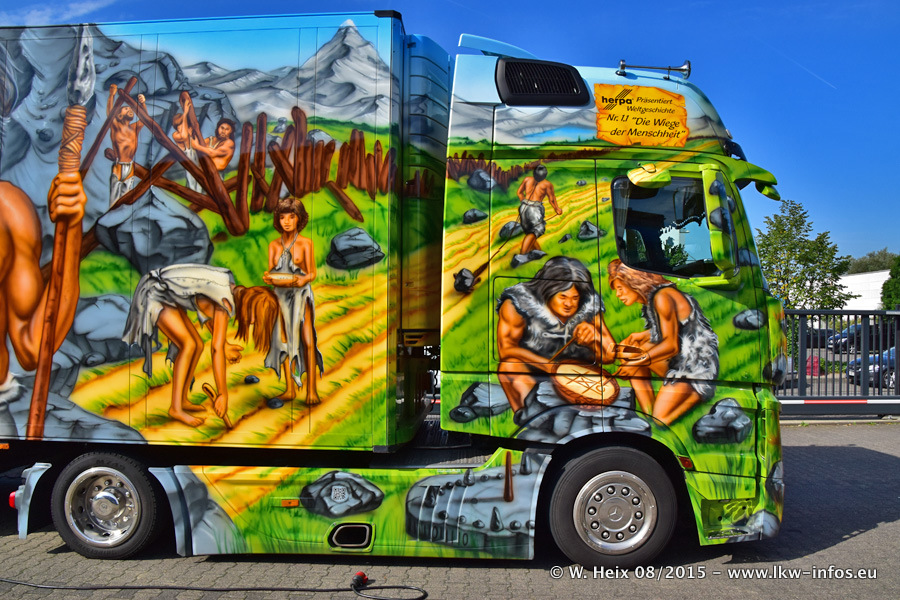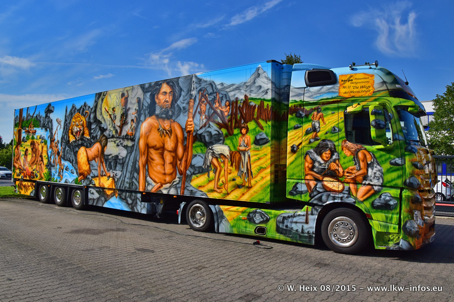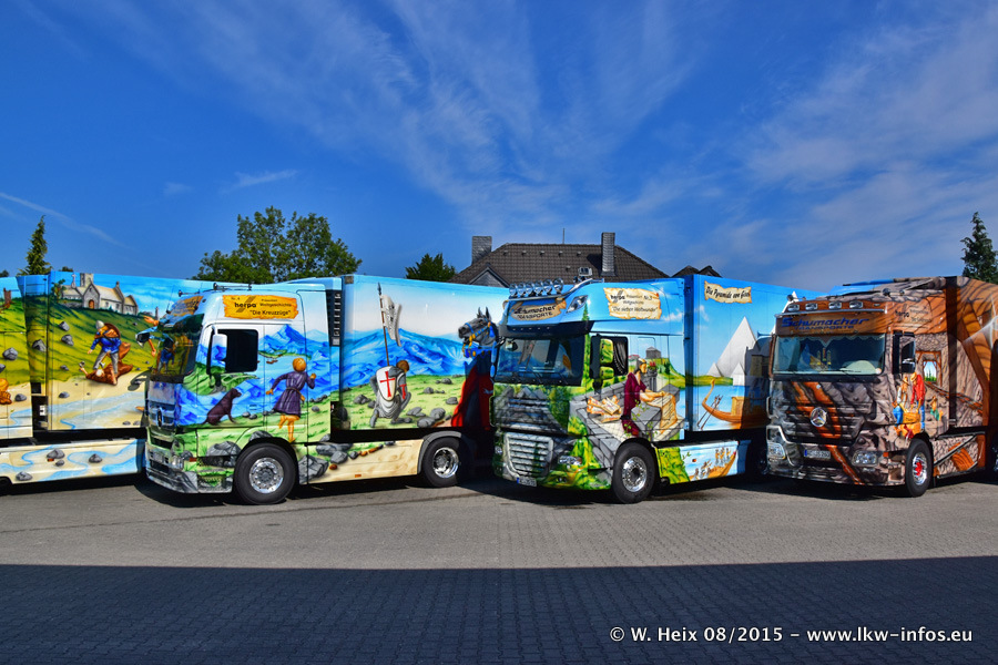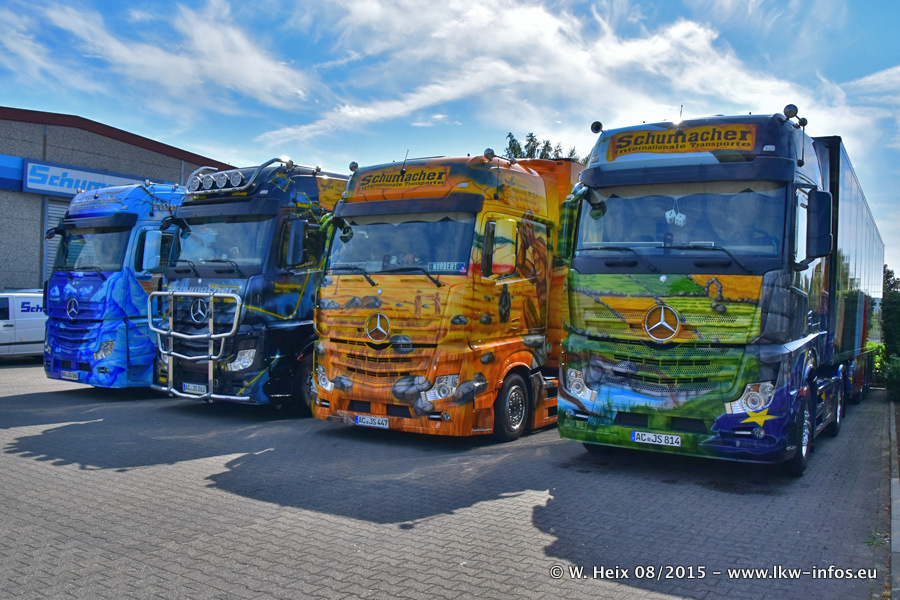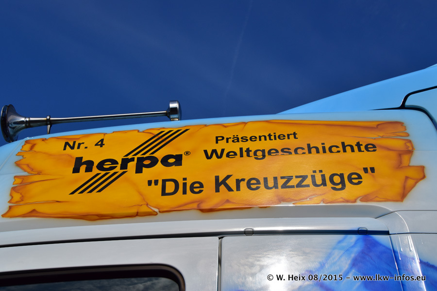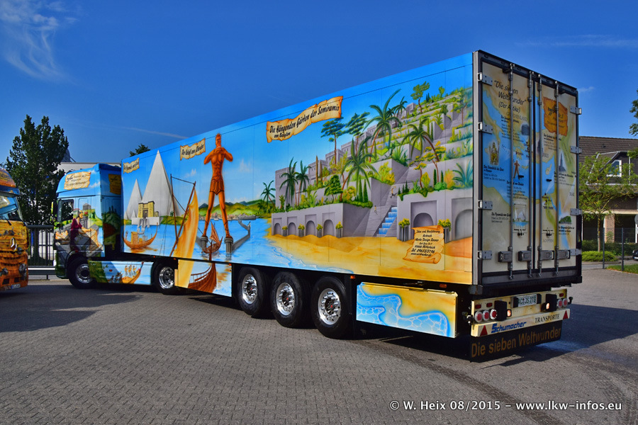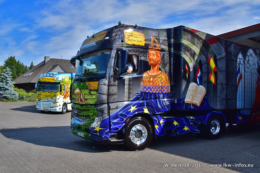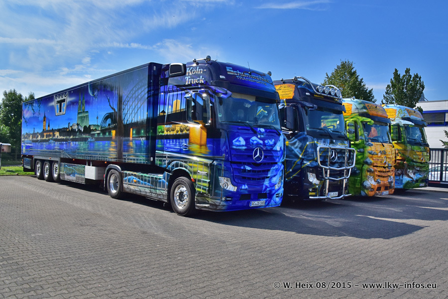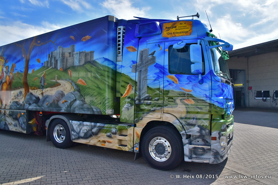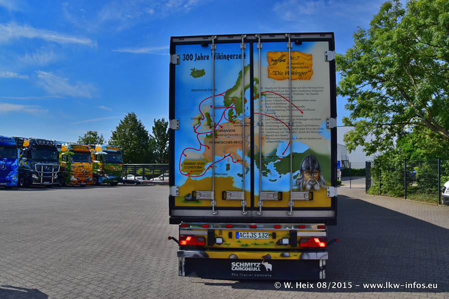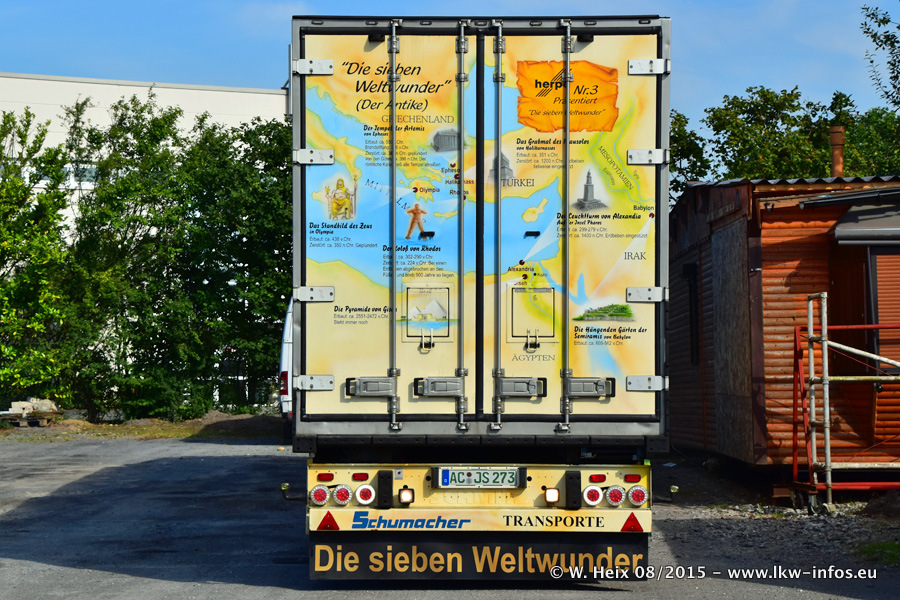 Bei diesem Besuch waren bis auf einen LKW alle Showtrucks der Herpa-Serie zuhause. Schumacher hat ja bekanntlich inzwischen den größten Teil dieser 14 Trucks im Fuhrpark. Die Nummer 1 bekam vor einigen Monaten eine neue Zugmaschine und läuft jetzt unter der Numer 1.1 "Die Wiege der Menschheit". Ende 2014 bekam Schumacher die Nummer 14 der Serie: "Herpa präsentiert Weltgeschichte Nr. 14 - Karl der Große". Das ist aktuell der letzte neue Showtruck der Herpa-Serie. Außerdem konnte ich diesmal den Köln-Truck von allen Seiten fotografieren, da dieser auch zuhause war. Danke an den/die Fahrer von Schumacher, die mir die Showtrucks zum Fotografieren auf dem Hof "ins richtige Licht" gerückt haben.
