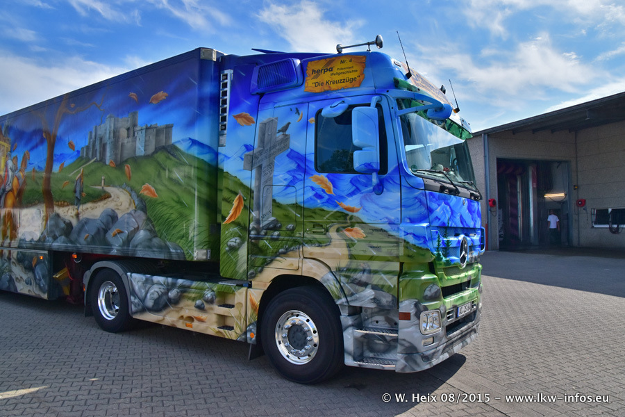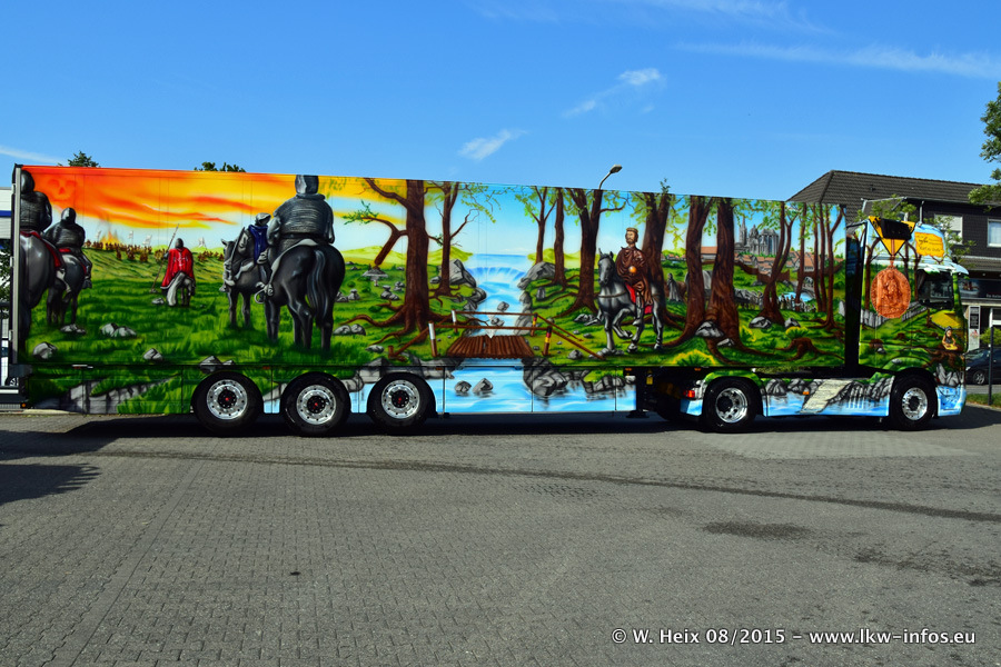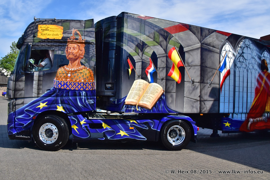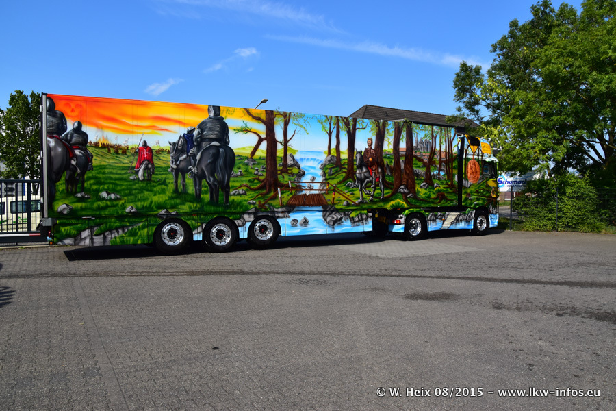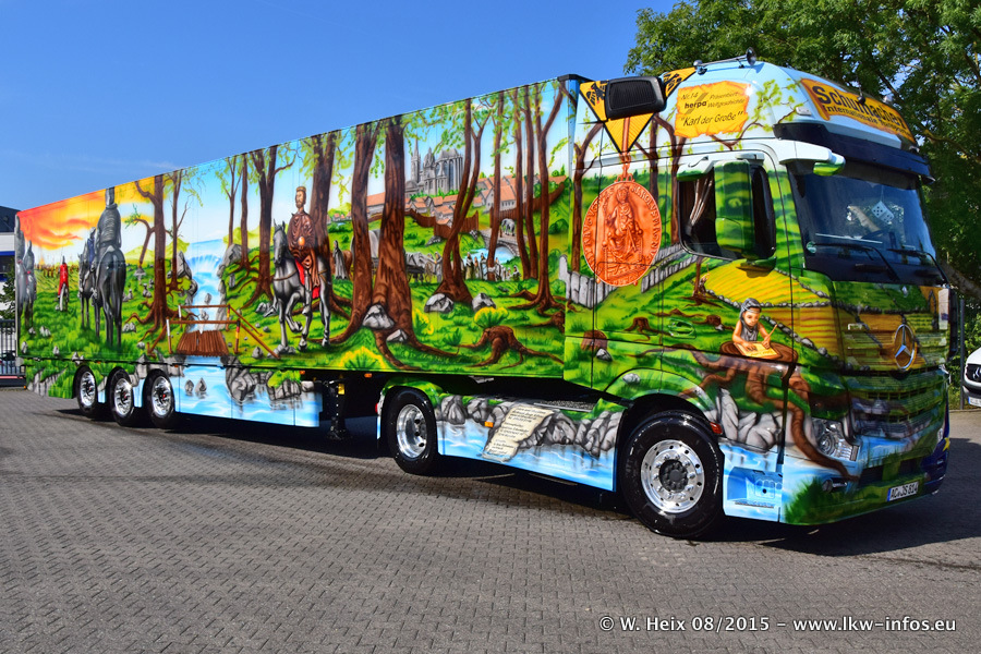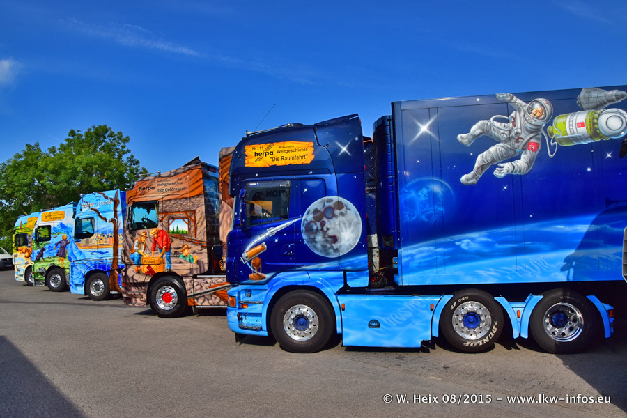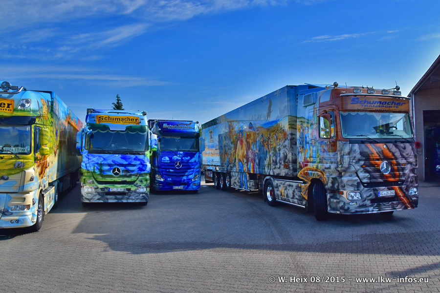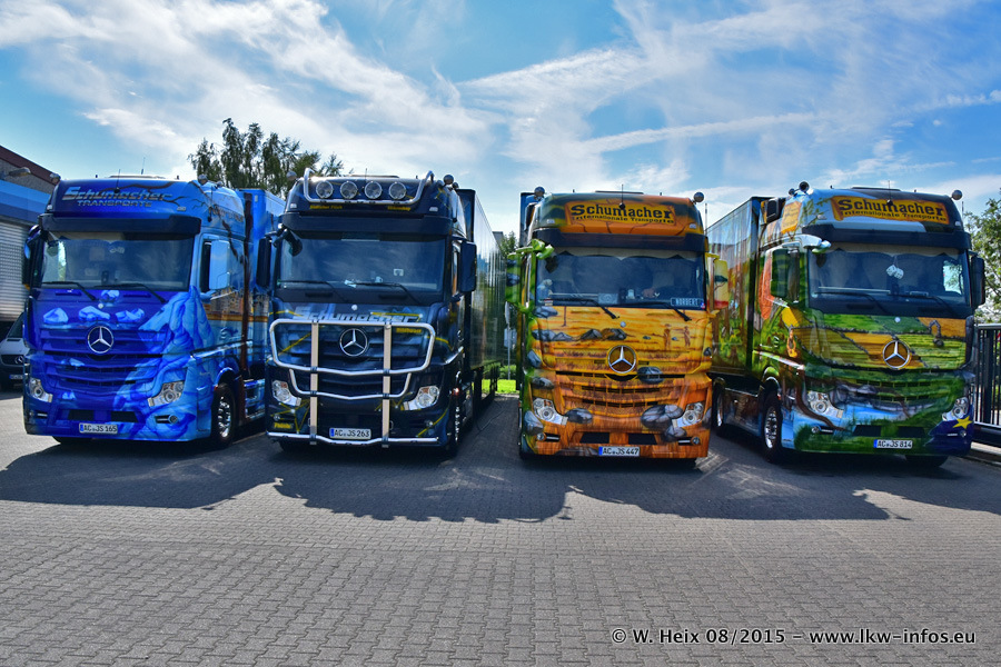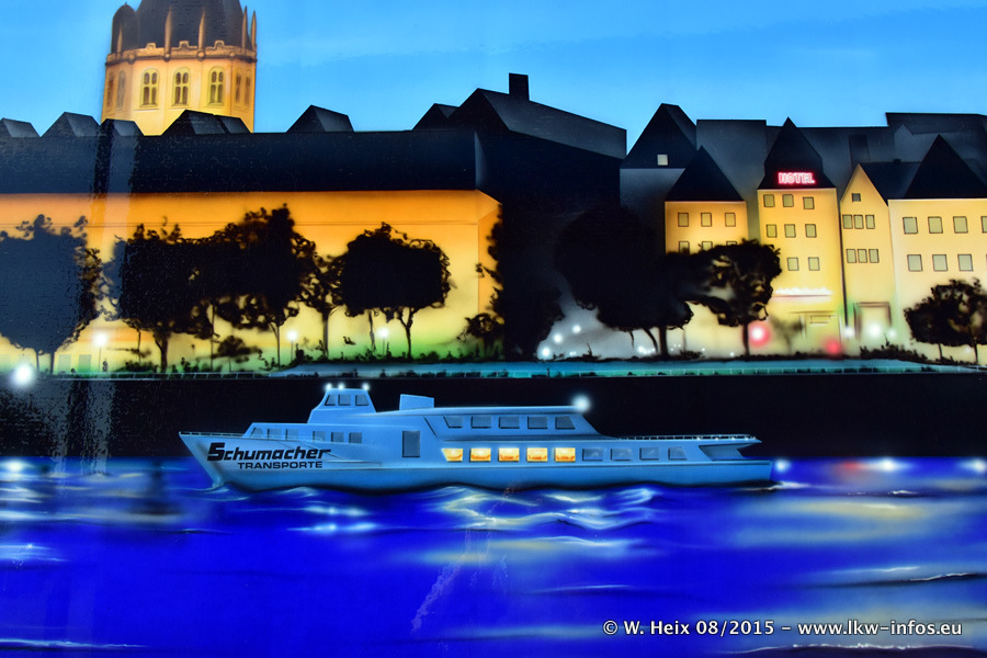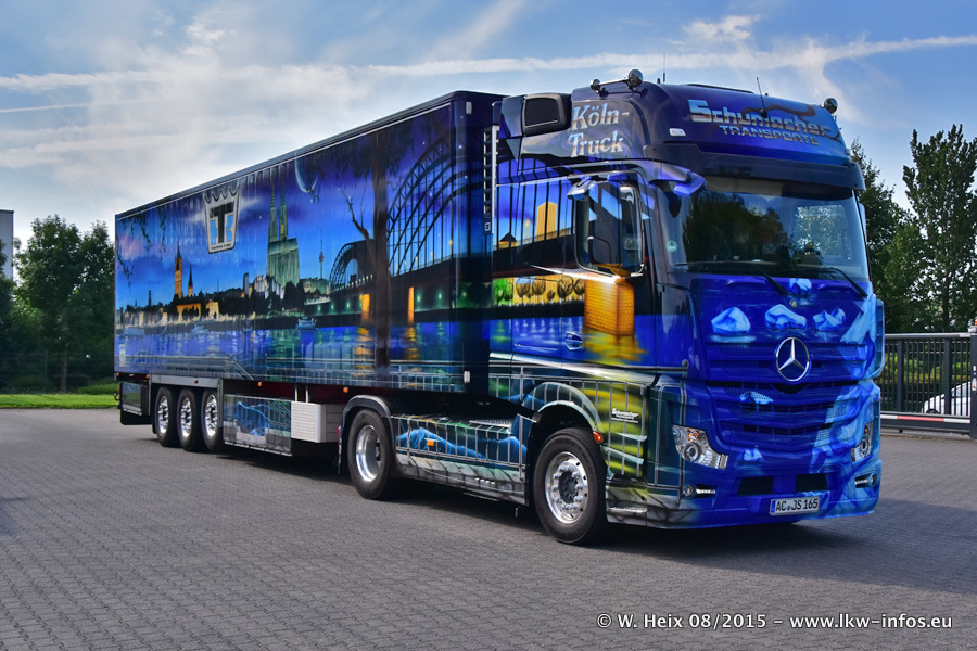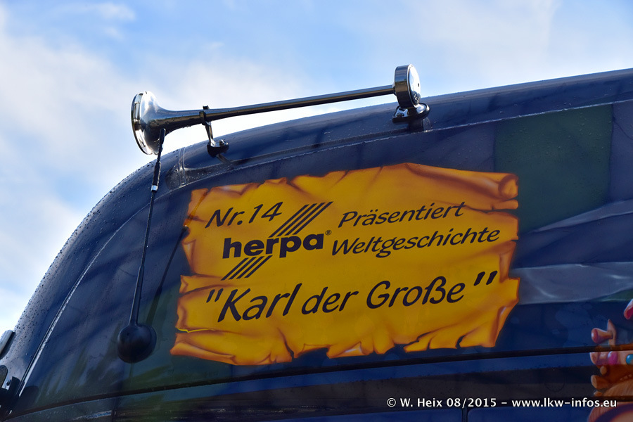 Bei diesem Besuch waren bis auf einen LKW alle Showtrucks der Herpa-Serie zuhause. Schumacher hat ja bekanntlich inzwischen den größten Teil dieser 14 Trucks im Fuhrpark. Die Nummer 1 bekam vor einigen Monaten eine neue Zugmaschine und läuft jetzt unter der Numer 1.1 "Die Wiege der Menschheit". Ende 2014 bekam Schumacher die Nummer 14 der Serie: "Herpa präsentiert Weltgeschichte Nr. 14 - Karl der Große". Das ist aktuell der letzte neue Showtruck der Herpa-Serie. Außerdem konnte ich diesmal den Köln-Truck von allen Seiten fotografieren, da dieser auch zuhause war. Danke an den/die Fahrer von Schumacher, die mir die Showtrucks zum Fotografieren auf dem Hof "ins richtige Licht" gerückt haben.