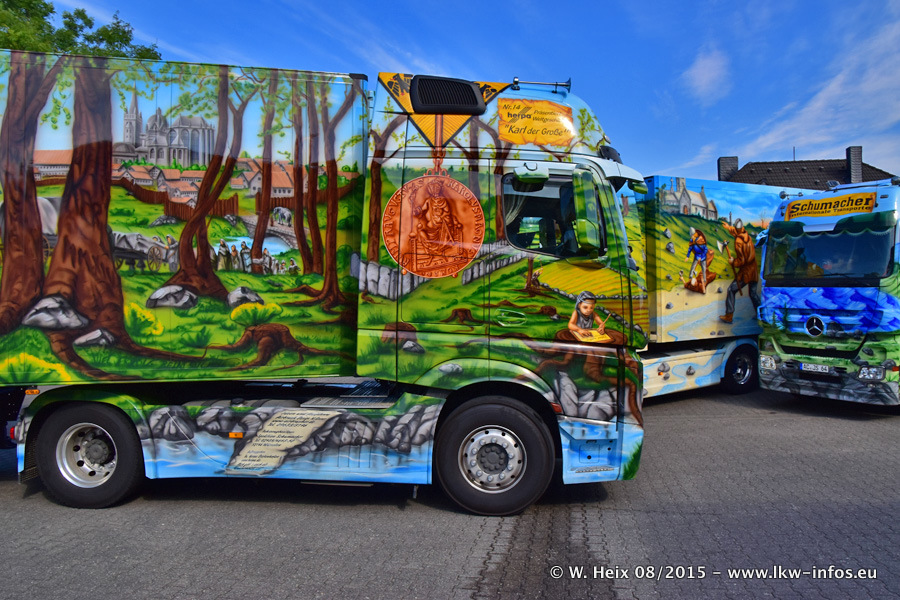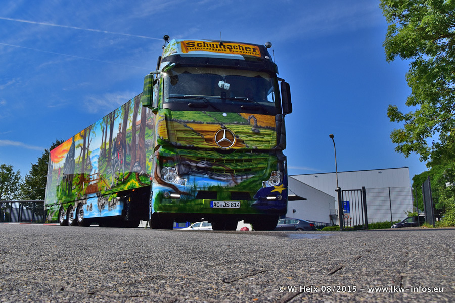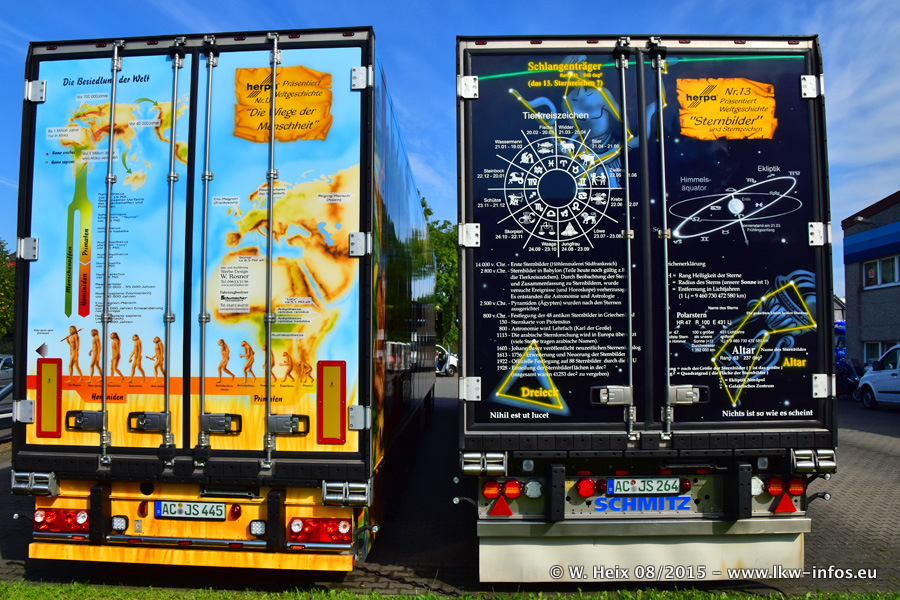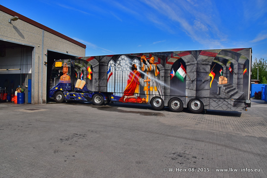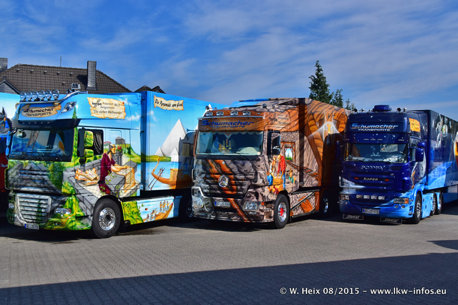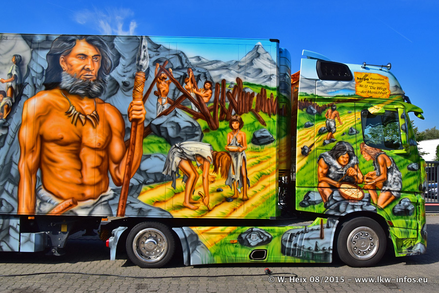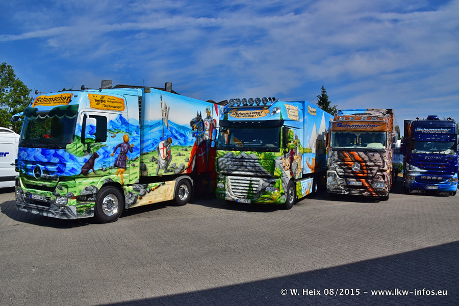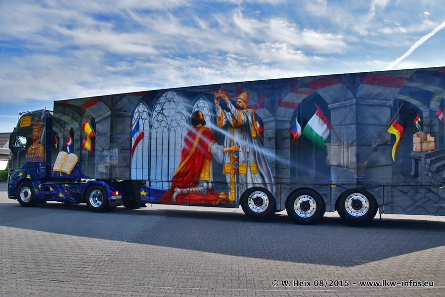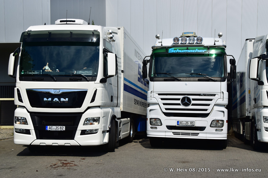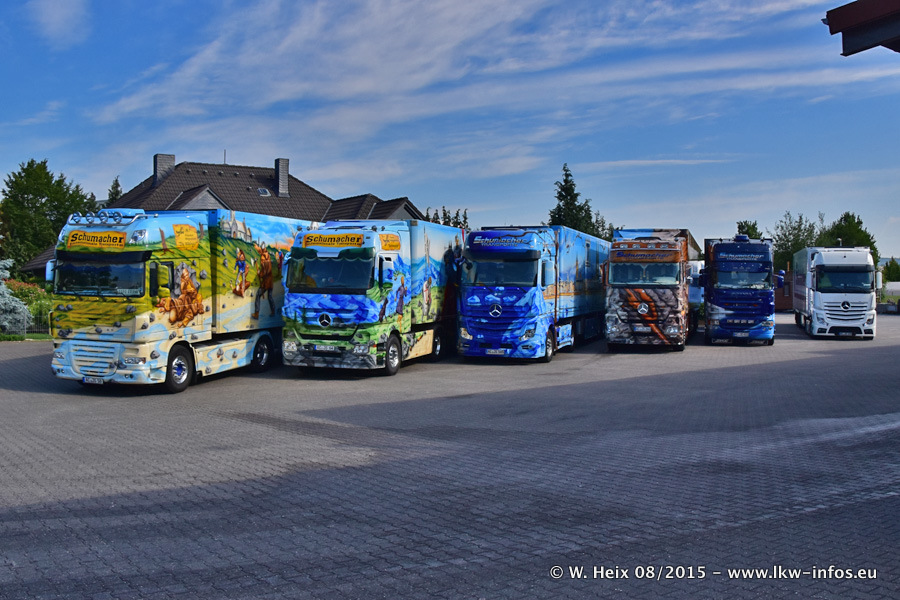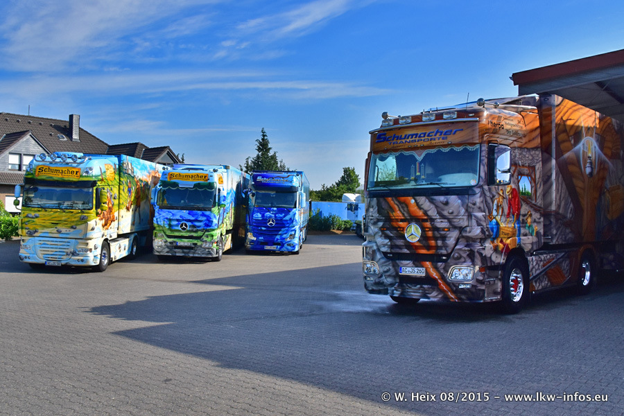 Bei diesem Besuch waren bis auf einen LKW alle Showtrucks der Herpa-Serie zuhause. Schumacher hat ja bekanntlich inzwischen den größten Teil dieser 14 Trucks im Fuhrpark. Die Nummer 1 bekam vor einigen Monaten eine neue Zugmaschine und läuft jetzt unter der Numer 1.1 "Die Wiege der Menschheit". Ende 2014 bekam Schumacher die Nummer 14 der Serie: "Herpa präsentiert Weltgeschichte Nr. 14 - Karl der Große". Das ist aktuell der letzte neue Showtruck der Herpa-Serie. Außerdem konnte ich diesmal den Köln-Truck von allen Seiten fotografieren, da dieser auch zuhause war. Danke an den/die Fahrer von Schumacher, die mir die Showtrucks zum Fotografieren auf dem Hof "ins richtige Licht" gerückt haben.