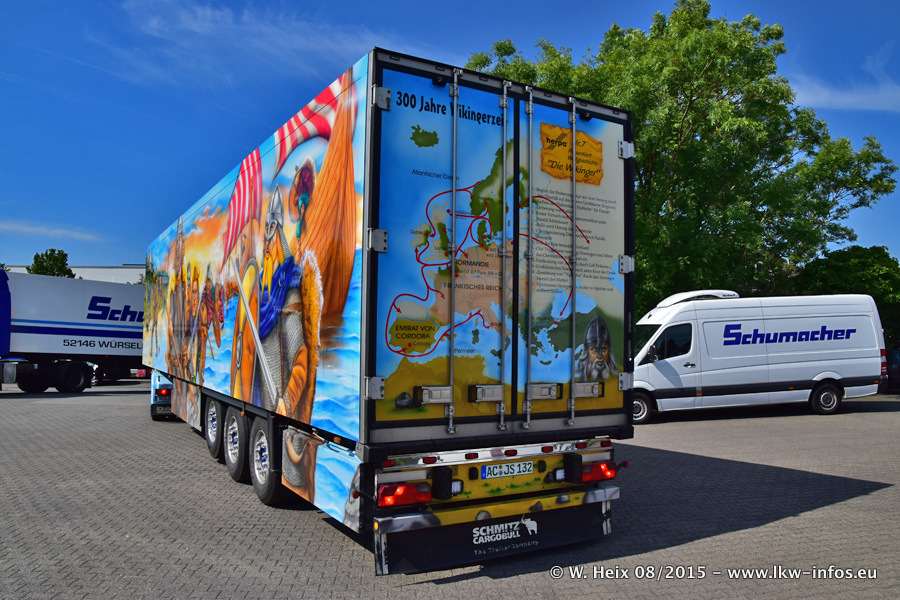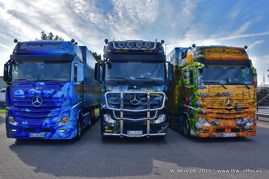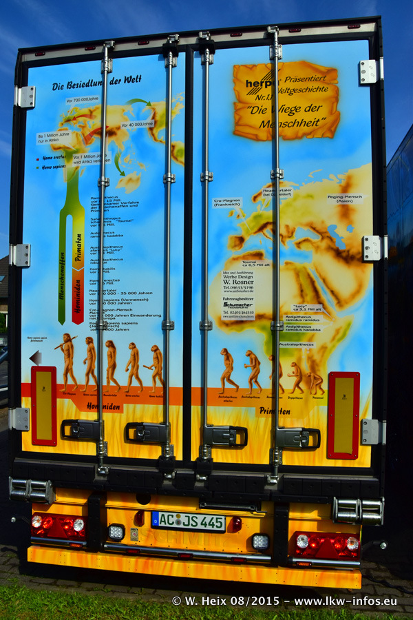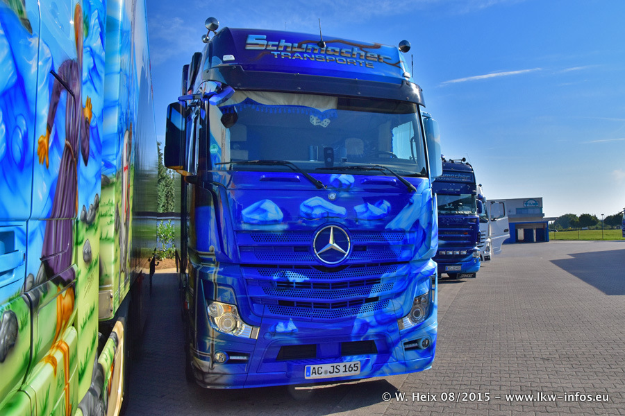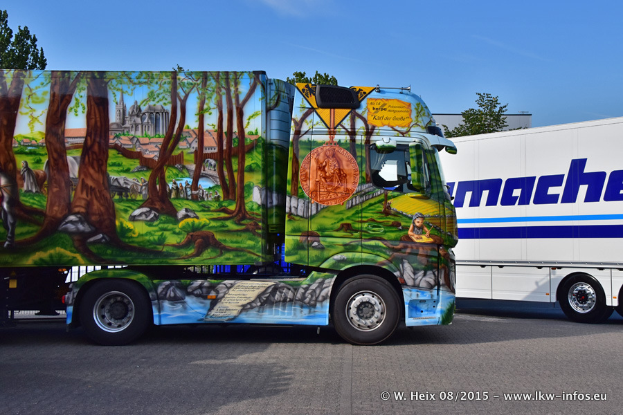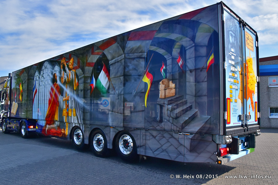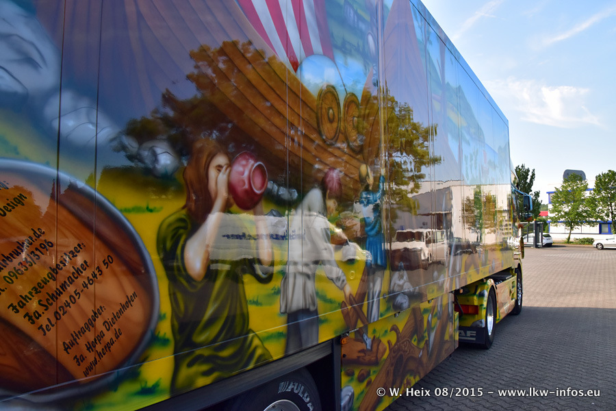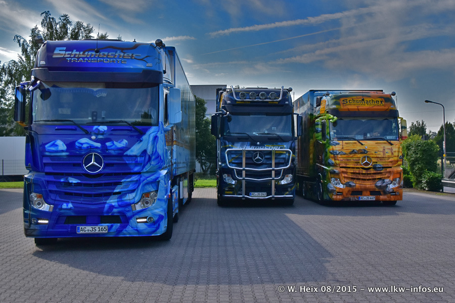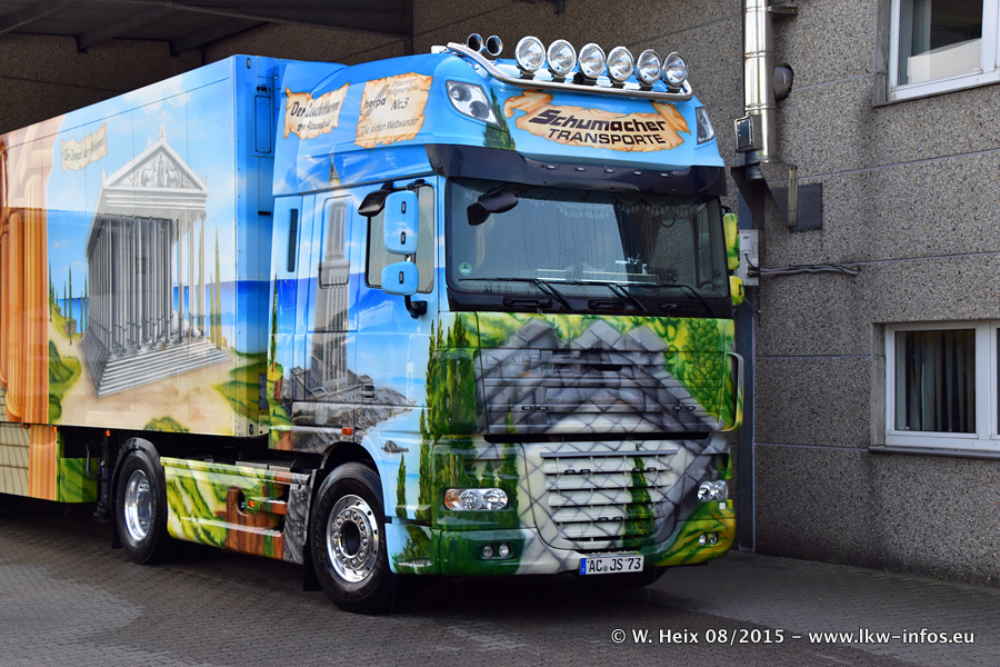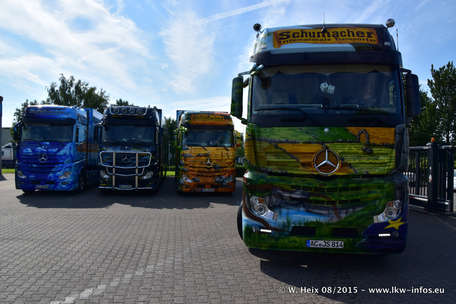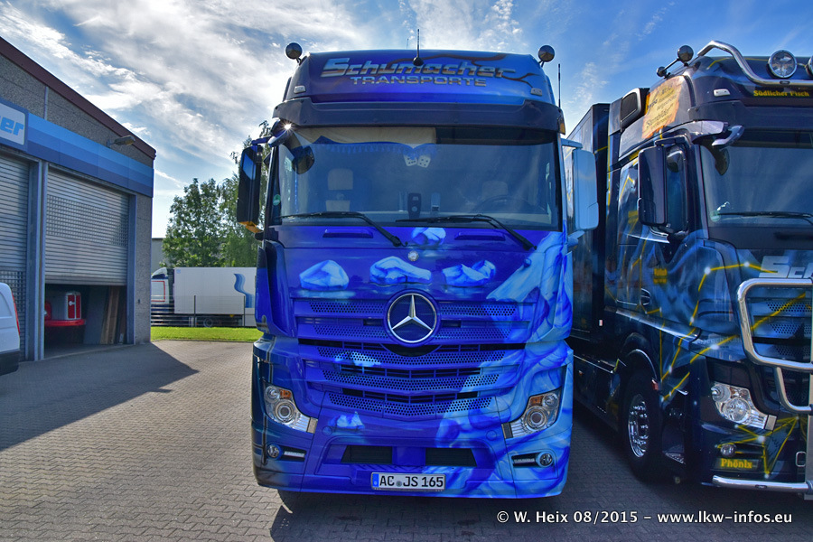 Bei diesem Besuch waren bis auf einen LKW alle Showtrucks der Herpa-Serie zuhause. Schumacher hat ja bekanntlich inzwischen den größten Teil dieser 14 Trucks im Fuhrpark. Die Nummer 1 bekam vor einigen Monaten eine neue Zugmaschine und läuft jetzt unter der Numer 1.1 "Die Wiege der Menschheit". Ende 2014 bekam Schumacher die Nummer 14 der Serie: "Herpa präsentiert Weltgeschichte Nr. 14 - Karl der Große". Das ist aktuell der letzte neue Showtruck der Herpa-Serie. Außerdem konnte ich diesmal den Köln-Truck von allen Seiten fotografieren, da dieser auch zuhause war. Danke an den/die Fahrer von Schumacher, die mir die Showtrucks zum Fotografieren auf dem Hof "ins richtige Licht" gerückt haben.
