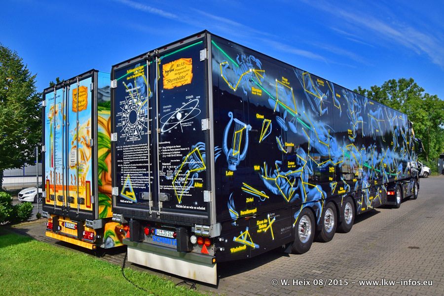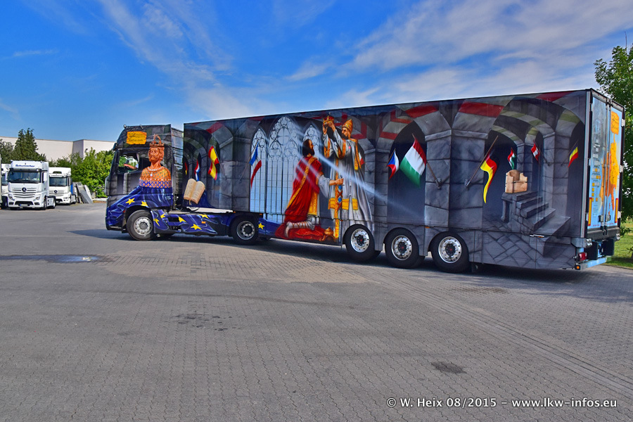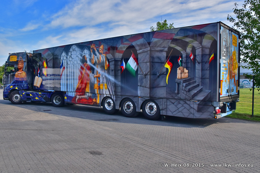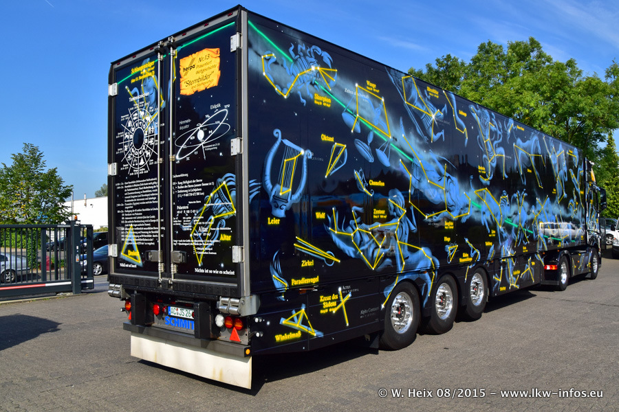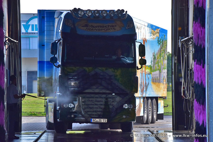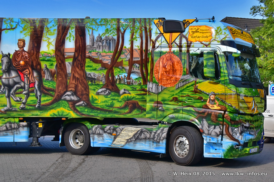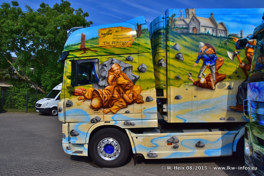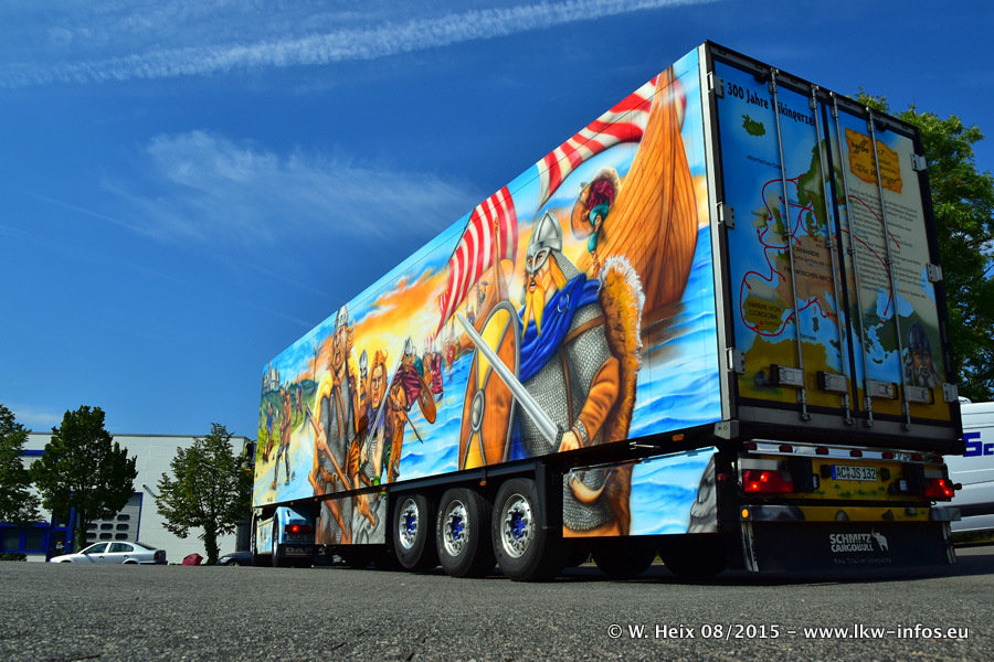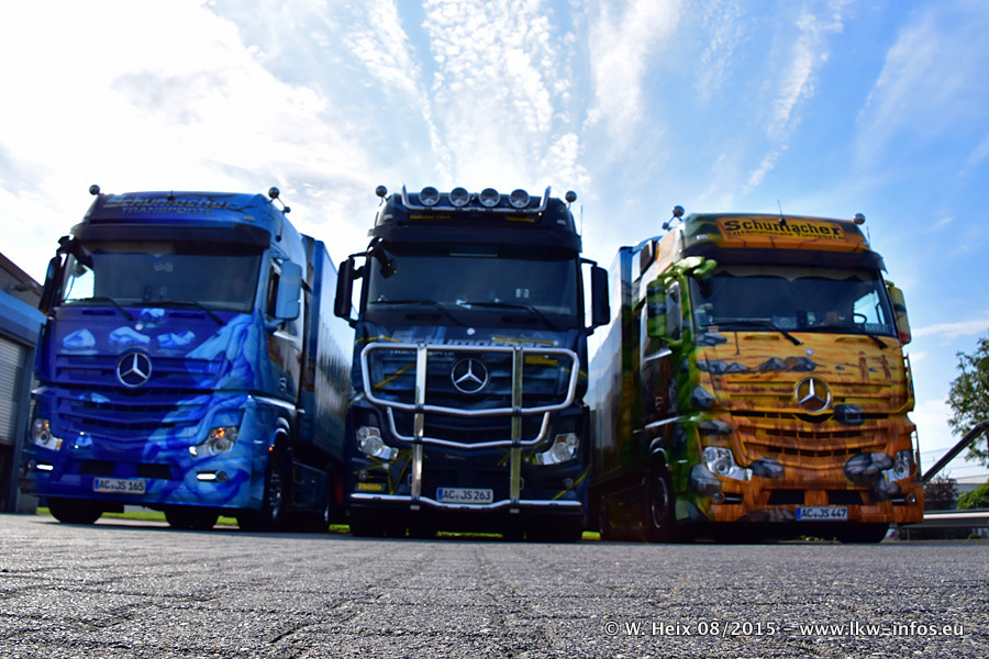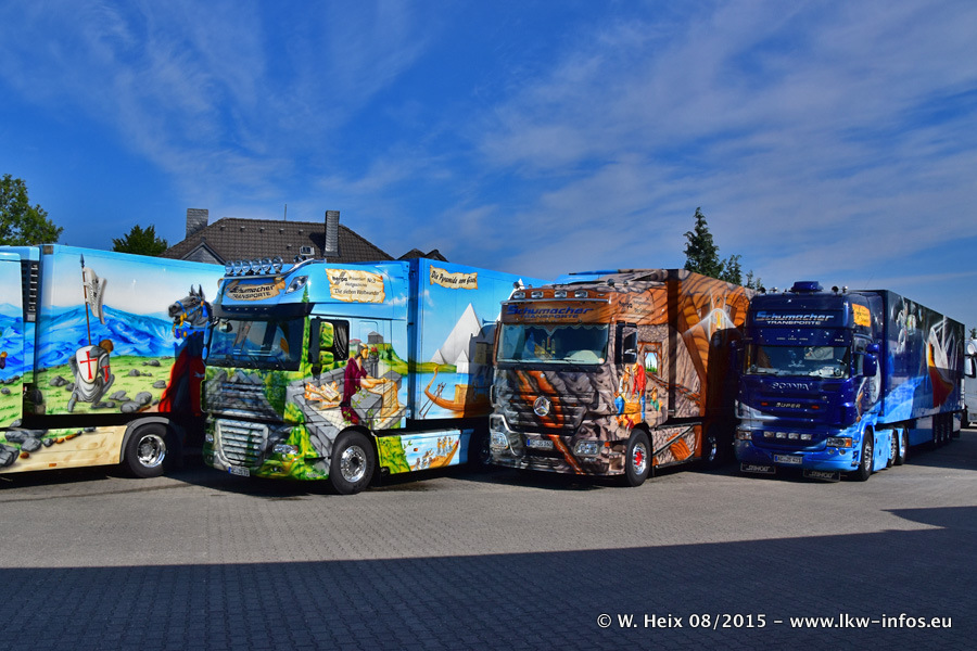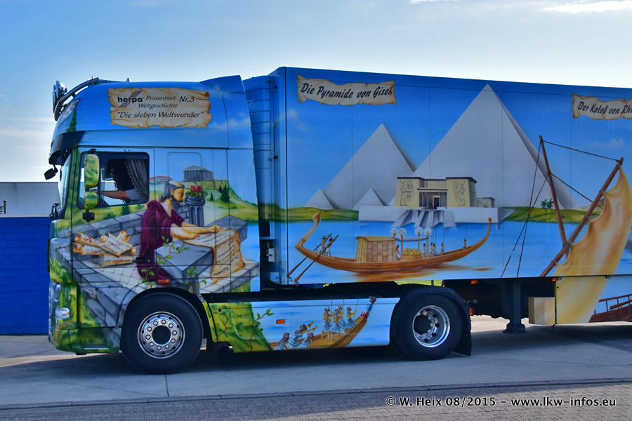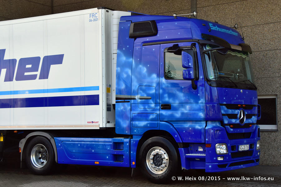 Bei diesem Besuch waren bis auf einen LKW alle Showtrucks der Herpa-Serie zuhause. Schumacher hat ja bekanntlich inzwischen den größten Teil dieser 14 Trucks im Fuhrpark. Die Nummer 1 bekam vor einigen Monaten eine neue Zugmaschine und läuft jetzt unter der Numer 1.1 "Die Wiege der Menschheit". Ende 2014 bekam Schumacher die Nummer 14 der Serie: "Herpa präsentiert Weltgeschichte Nr. 14 - Karl der Große". Das ist aktuell der letzte neue Showtruck der Herpa-Serie. Außerdem konnte ich diesmal den Köln-Truck von allen Seiten fotografieren, da dieser auch zuhause war. Danke an den/die Fahrer von Schumacher, die mir die Showtrucks zum Fotografieren auf dem Hof "ins richtige Licht" gerückt haben.