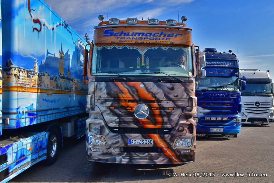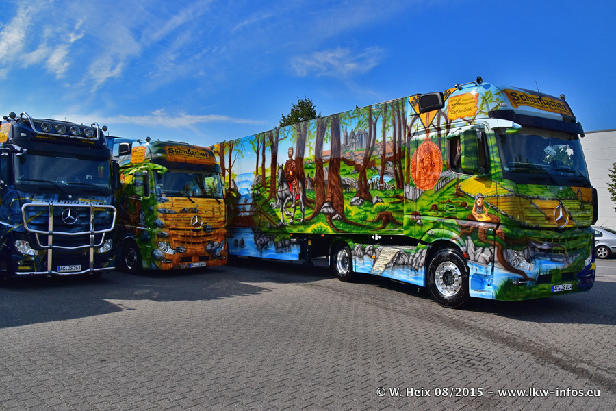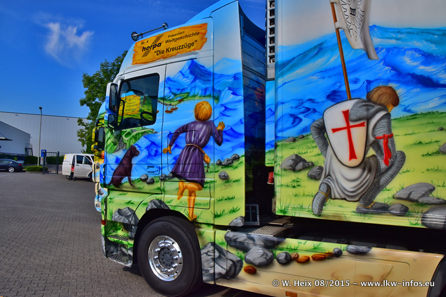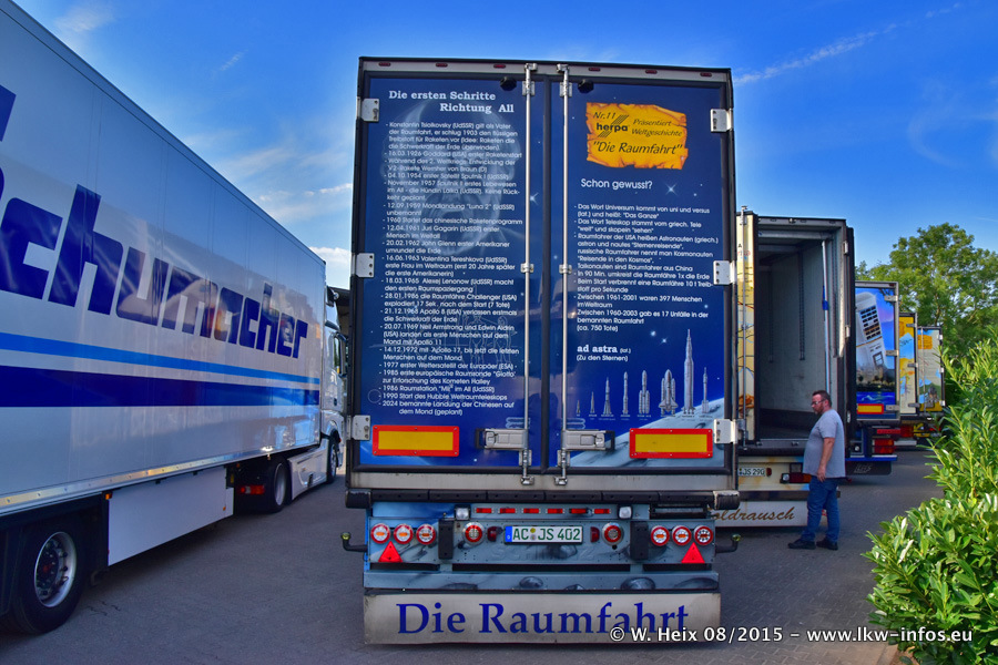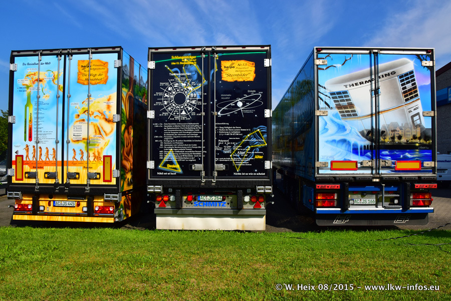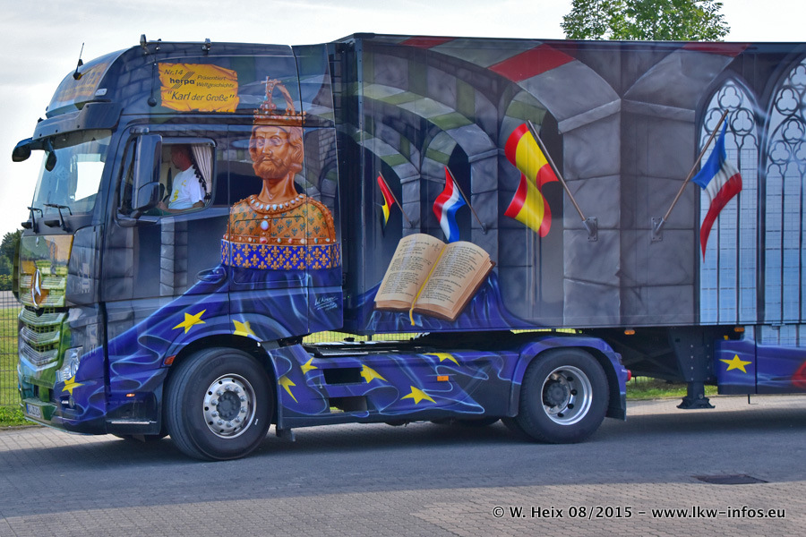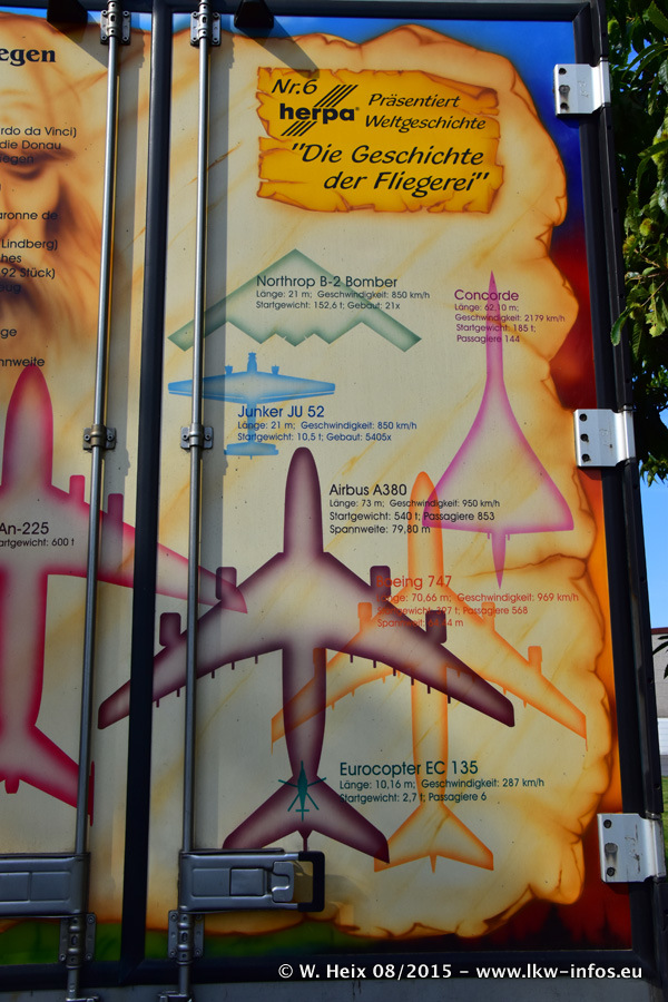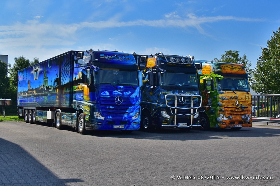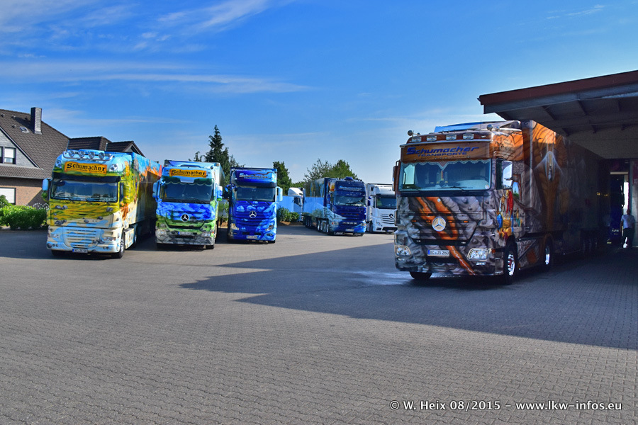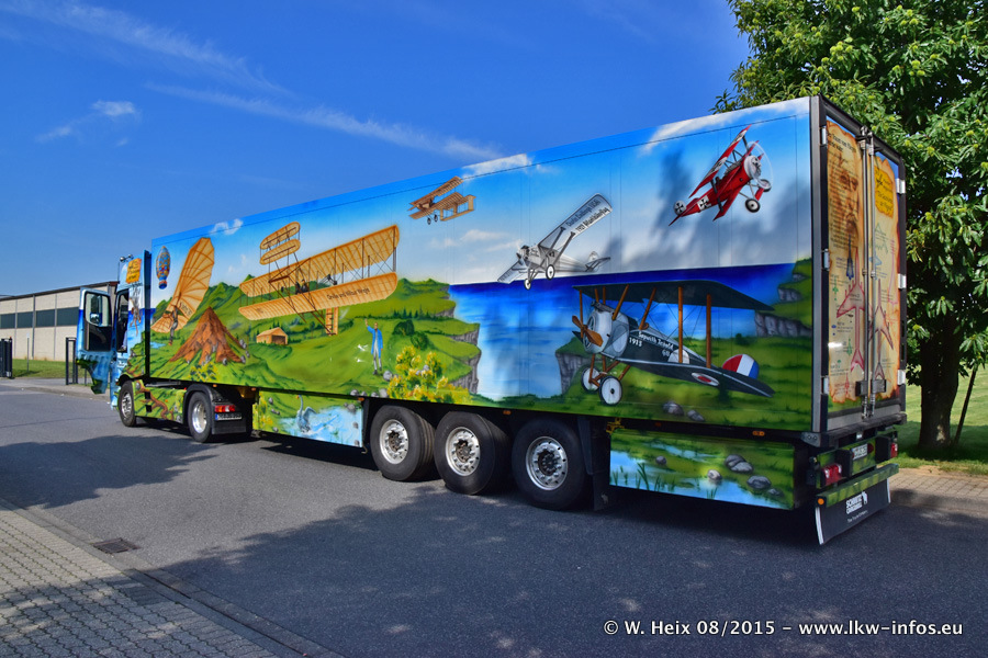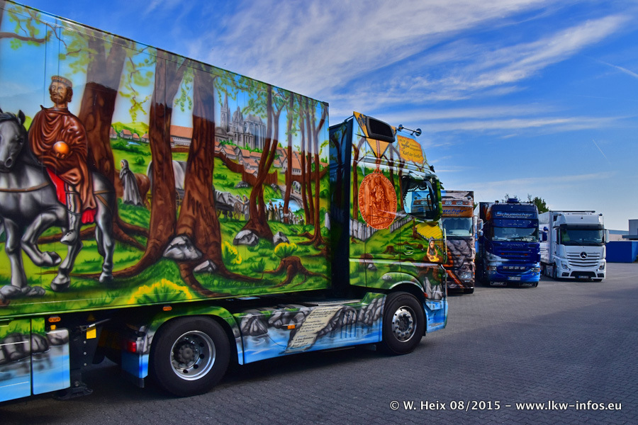 Bei diesem Besuch waren bis auf einen LKW alle Showtrucks der Herpa-Serie zuhause. Schumacher hat ja bekanntlich inzwischen den größten Teil dieser 14 Trucks im Fuhrpark. Die Nummer 1 bekam vor einigen Monaten eine neue Zugmaschine und läuft jetzt unter der Numer 1.1 "Die Wiege der Menschheit". Ende 2014 bekam Schumacher die Nummer 14 der Serie: "Herpa präsentiert Weltgeschichte Nr. 14 - Karl der Große". Das ist aktuell der letzte neue Showtruck der Herpa-Serie. Außerdem konnte ich diesmal den Köln-Truck von allen Seiten fotografieren, da dieser auch zuhause war. Danke an den/die Fahrer von Schumacher, die mir die Showtrucks zum Fotografieren auf dem Hof "ins richtige Licht" gerückt haben.