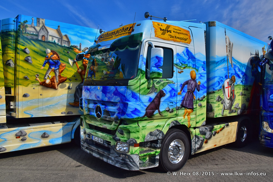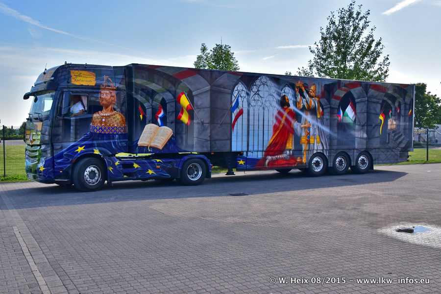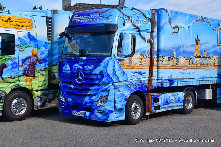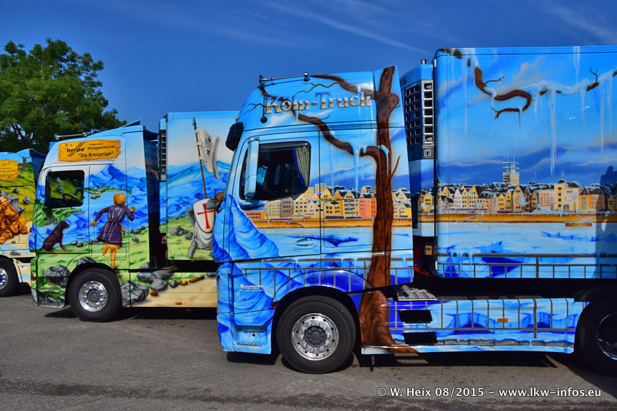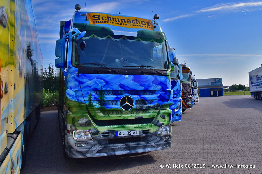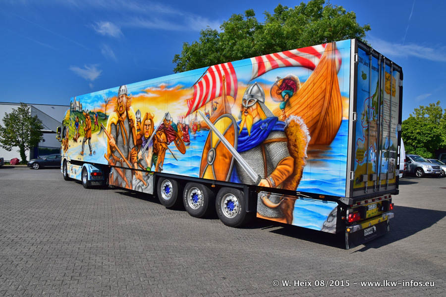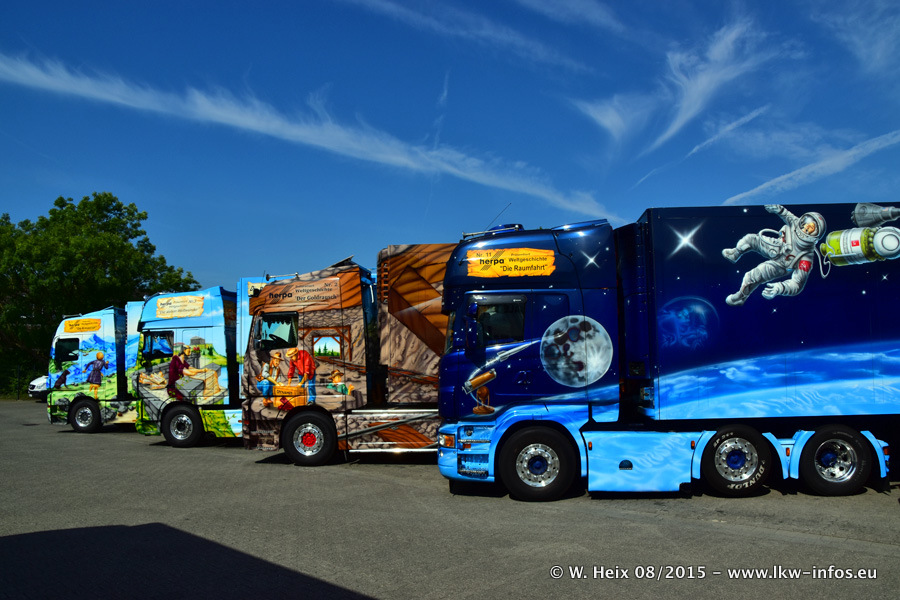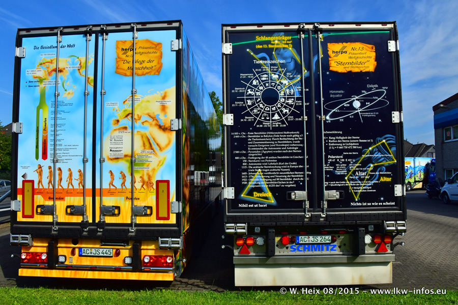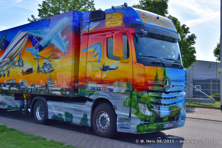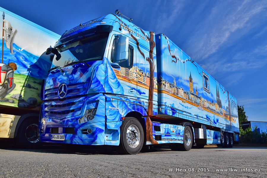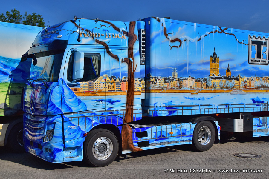 Bei diesem Besuch waren bis auf einen LKW alle Showtrucks der Herpa-Serie zuhause. Schumacher hat ja bekanntlich inzwischen den größten Teil dieser 14 Trucks im Fuhrpark. Die Nummer 1 bekam vor einigen Monaten eine neue Zugmaschine und läuft jetzt unter der Numer 1.1 "Die Wiege der Menschheit". Ende 2014 bekam Schumacher die Nummer 14 der Serie: "Herpa präsentiert Weltgeschichte Nr. 14 - Karl der Große". Das ist aktuell der letzte neue Showtruck der Herpa-Serie. Außerdem konnte ich diesmal den Köln-Truck von allen Seiten fotografieren, da dieser auch zuhause war. Danke an den/die Fahrer von Schumacher, die mir die Showtrucks zum Fotografieren auf dem Hof "ins richtige Licht" gerückt haben.