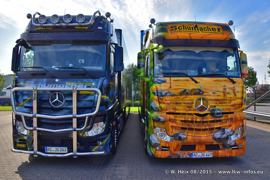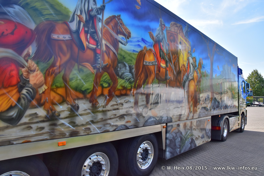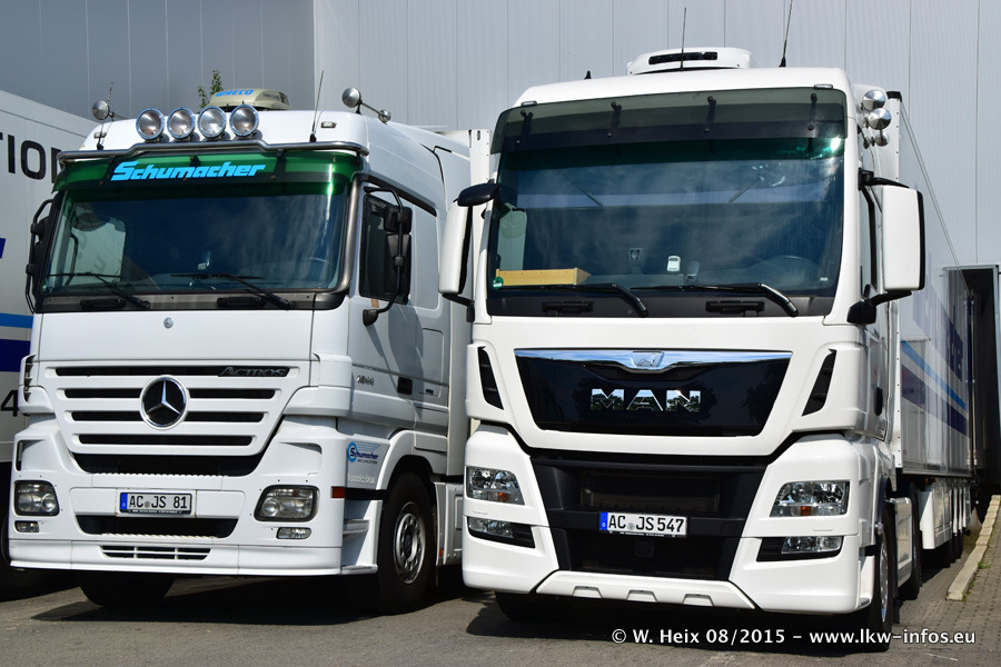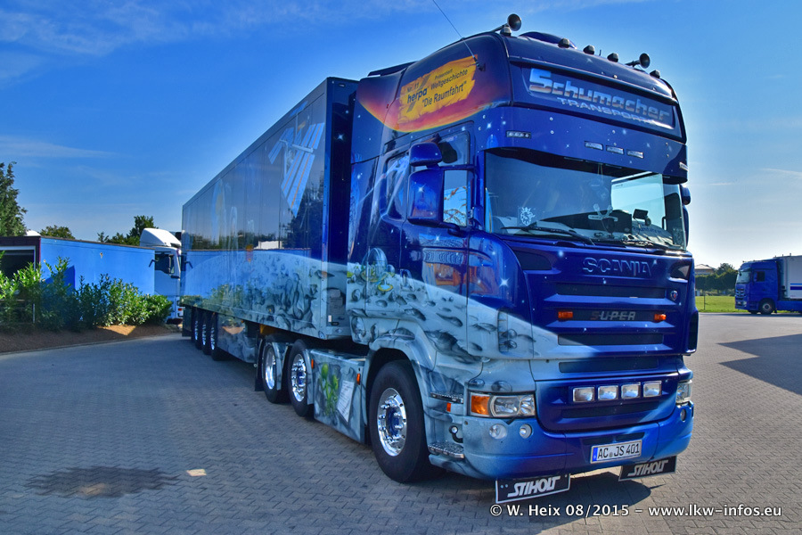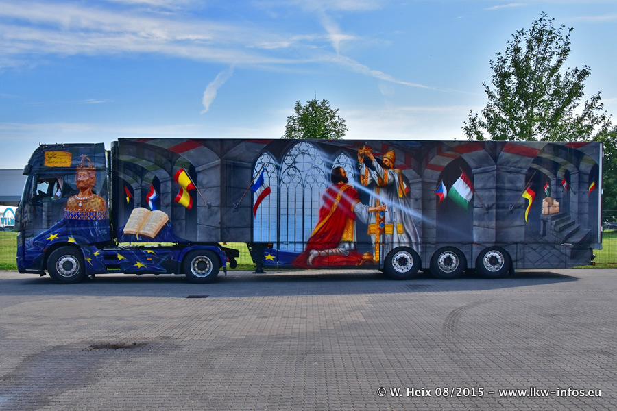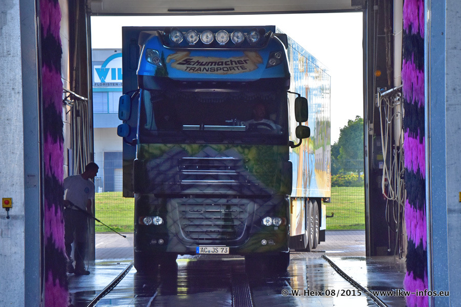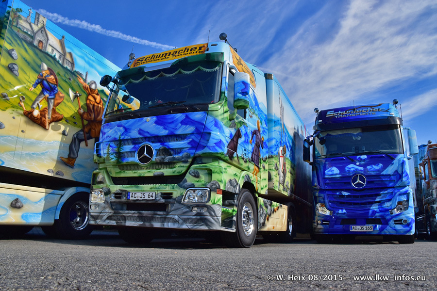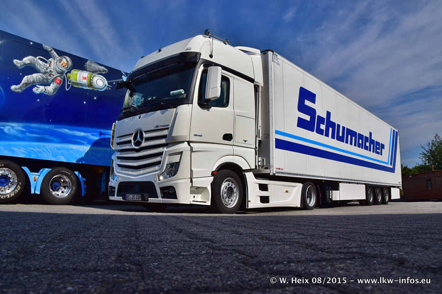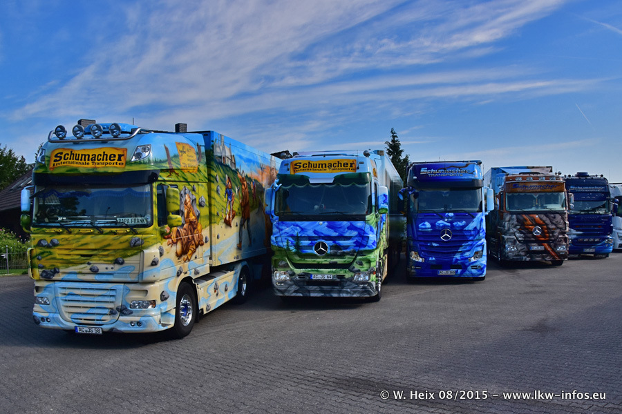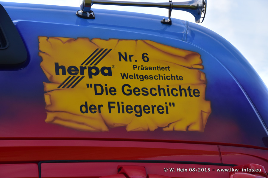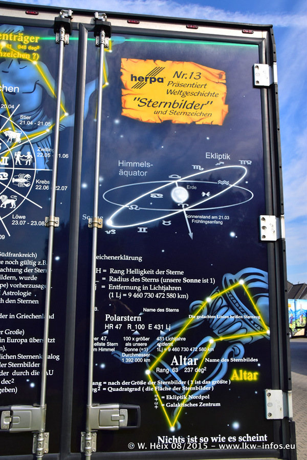 Bei diesem Besuch waren bis auf einen LKW alle Showtrucks der Herpa-Serie zuhause. Schumacher hat ja bekanntlich inzwischen den größten Teil dieser 14 Trucks im Fuhrpark. Die Nummer 1 bekam vor einigen Monaten eine neue Zugmaschine und läuft jetzt unter der Numer 1.1 "Die Wiege der Menschheit". Ende 2014 bekam Schumacher die Nummer 14 der Serie: "Herpa präsentiert Weltgeschichte Nr. 14 - Karl der Große". Das ist aktuell der letzte neue Showtruck der Herpa-Serie. Außerdem konnte ich diesmal den Köln-Truck von allen Seiten fotografieren, da dieser auch zuhause war. Danke an den/die Fahrer von Schumacher, die mir die Showtrucks zum Fotografieren auf dem Hof "ins richtige Licht" gerückt haben.