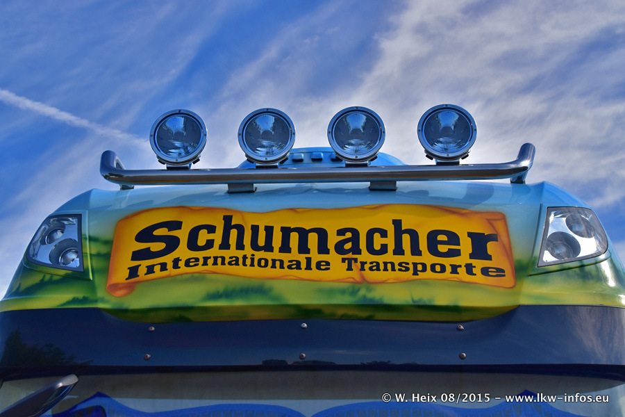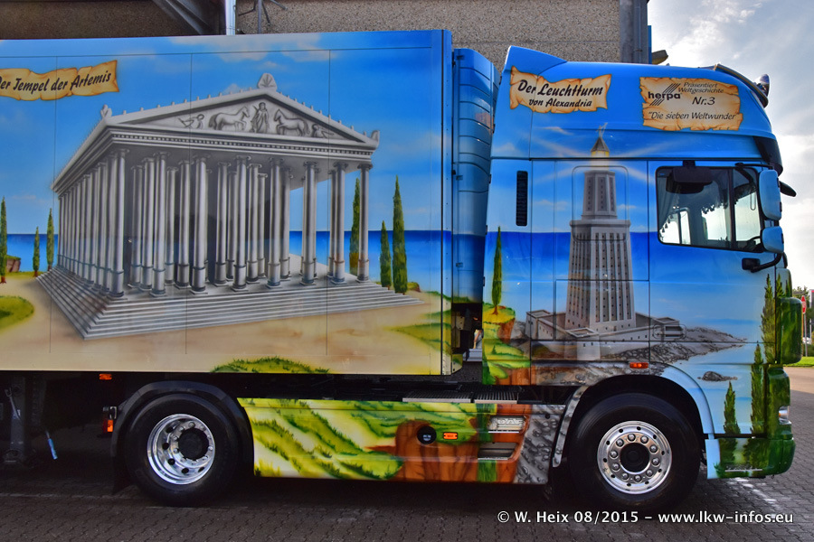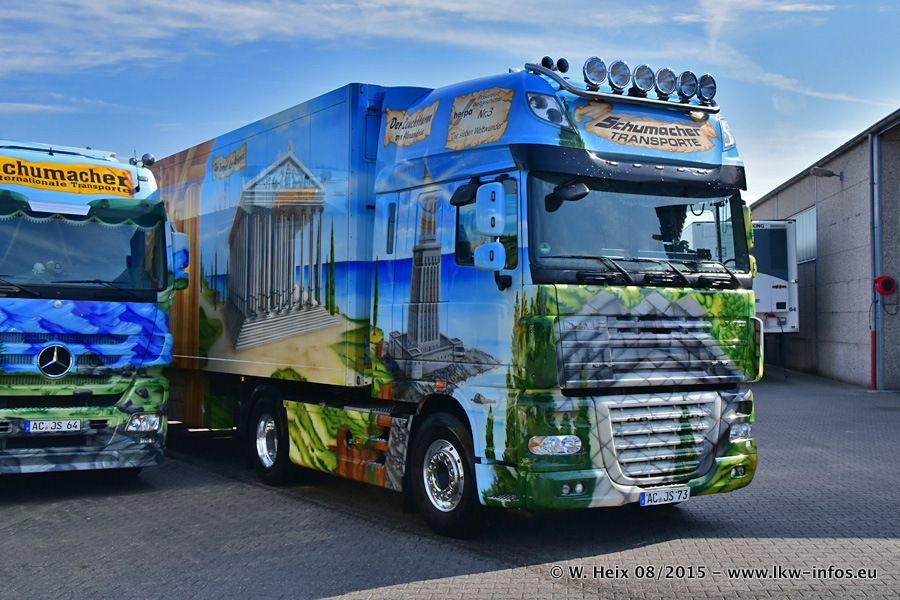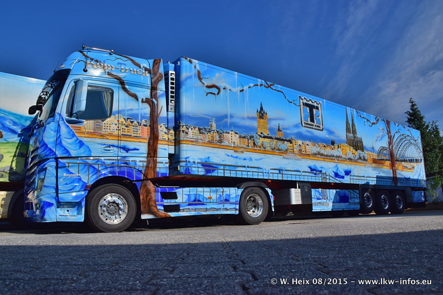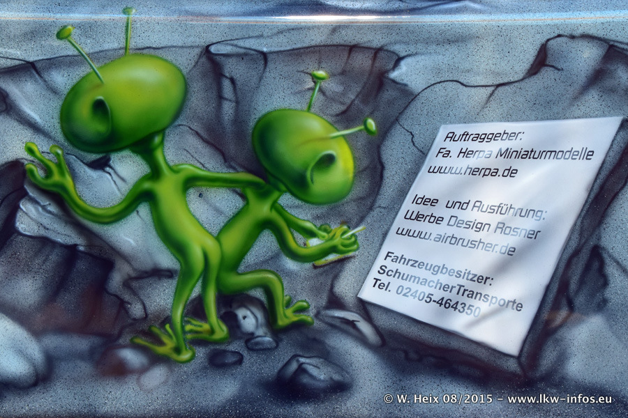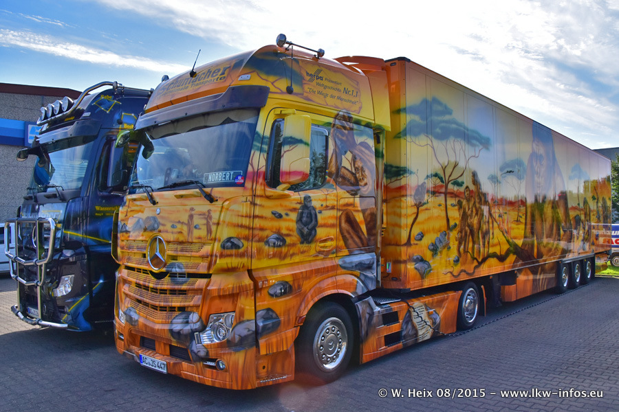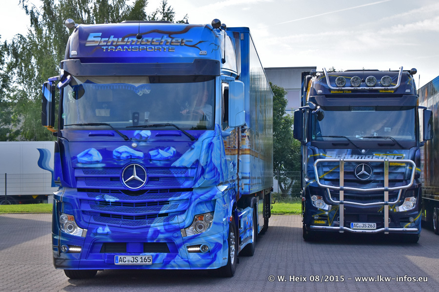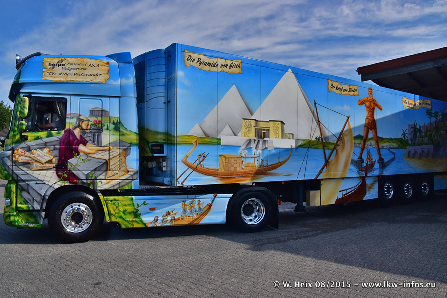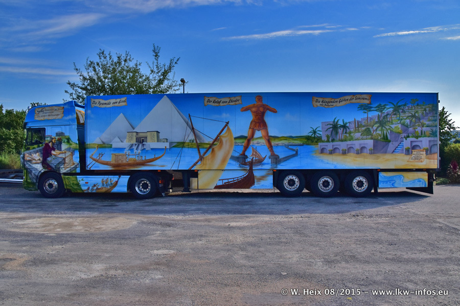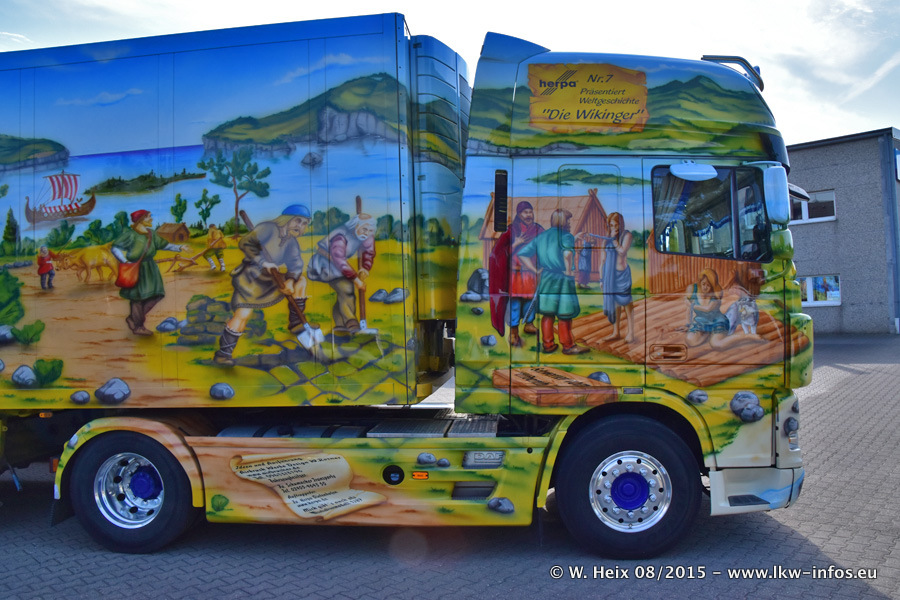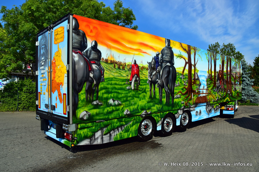 Bei diesem Besuch waren bis auf einen LKW alle Showtrucks der Herpa-Serie zuhause. Schumacher hat ja bekanntlich inzwischen den größten Teil dieser 14 Trucks im Fuhrpark. Die Nummer 1 bekam vor einigen Monaten eine neue Zugmaschine und läuft jetzt unter der Numer 1.1 "Die Wiege der Menschheit". Ende 2014 bekam Schumacher die Nummer 14 der Serie: "Herpa präsentiert Weltgeschichte Nr. 14 - Karl der Große". Das ist aktuell der letzte neue Showtruck der Herpa-Serie. Außerdem konnte ich diesmal den Köln-Truck von allen Seiten fotografieren, da dieser auch zuhause war. Danke an den/die Fahrer von Schumacher, die mir die Showtrucks zum Fotografieren auf dem Hof "ins richtige Licht" gerückt haben.