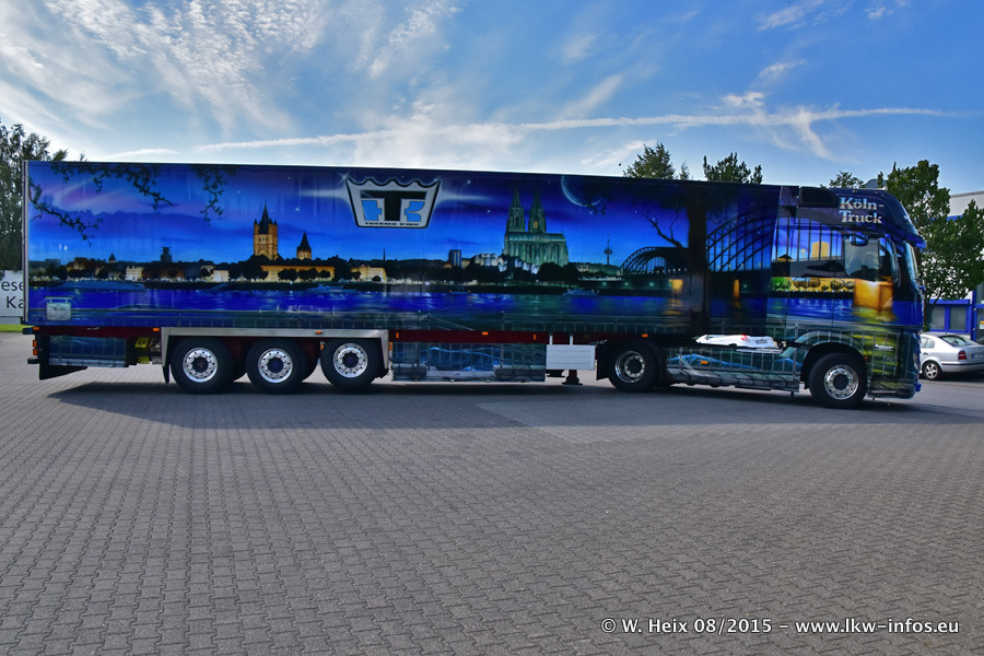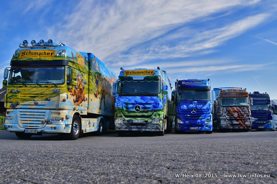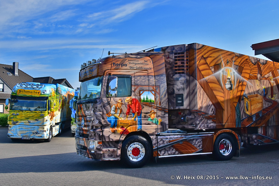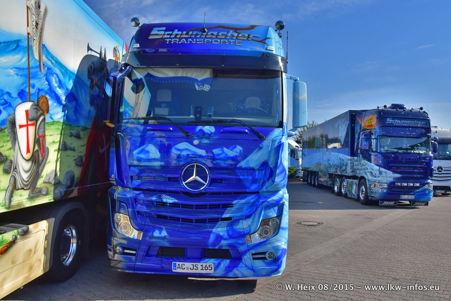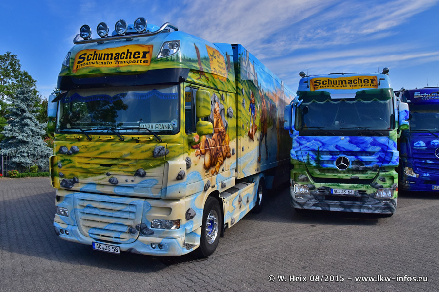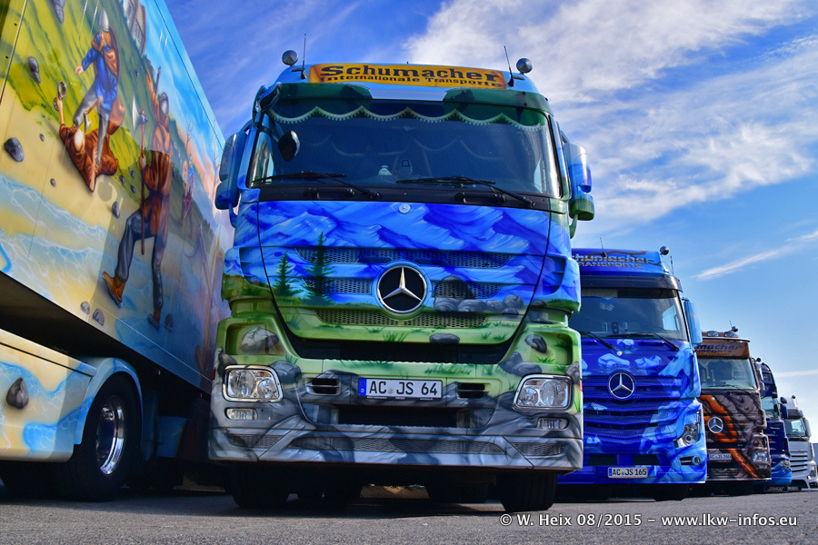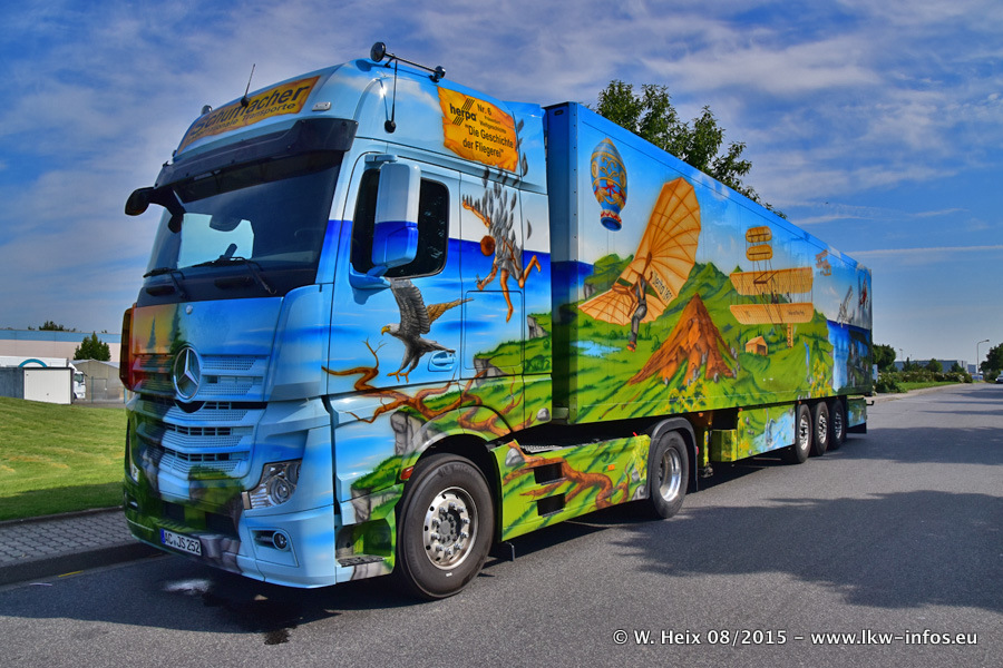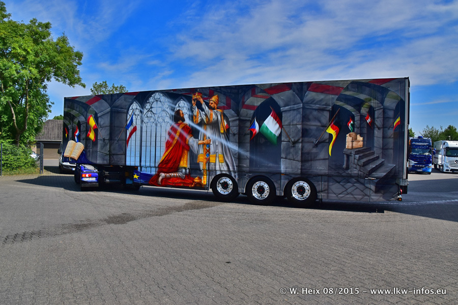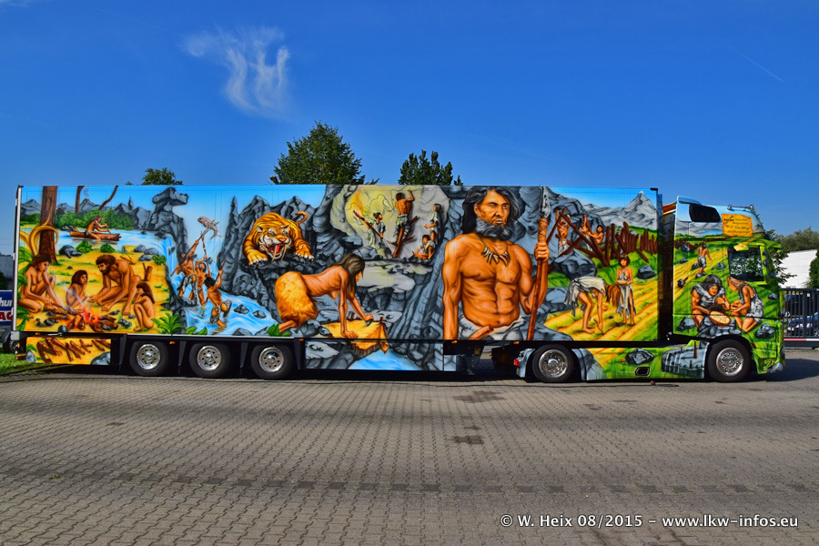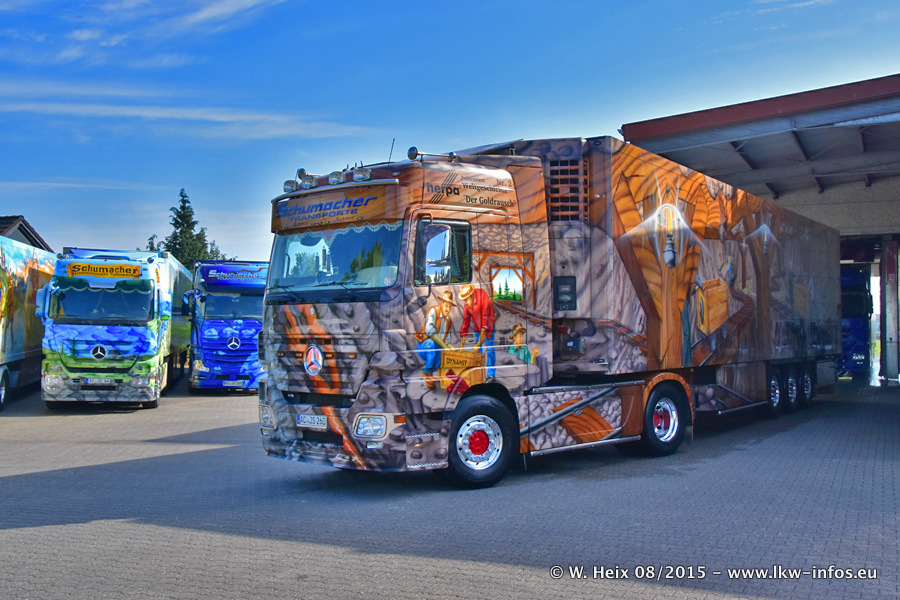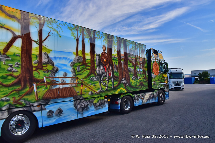 Bei diesem Besuch waren bis auf einen LKW alle Showtrucks der Herpa-Serie zuhause. Schumacher hat ja bekanntlich inzwischen den größten Teil dieser 14 Trucks im Fuhrpark. Die Nummer 1 bekam vor einigen Monaten eine neue Zugmaschine und läuft jetzt unter der Numer 1.1 "Die Wiege der Menschheit". Ende 2014 bekam Schumacher die Nummer 14 der Serie: "Herpa präsentiert Weltgeschichte Nr. 14 - Karl der Große". Das ist aktuell der letzte neue Showtruck der Herpa-Serie. Außerdem konnte ich diesmal den Köln-Truck von allen Seiten fotografieren, da dieser auch zuhause war. Danke an den/die Fahrer von Schumacher, die mir die Showtrucks zum Fotografieren auf dem Hof "ins richtige Licht" gerückt haben.