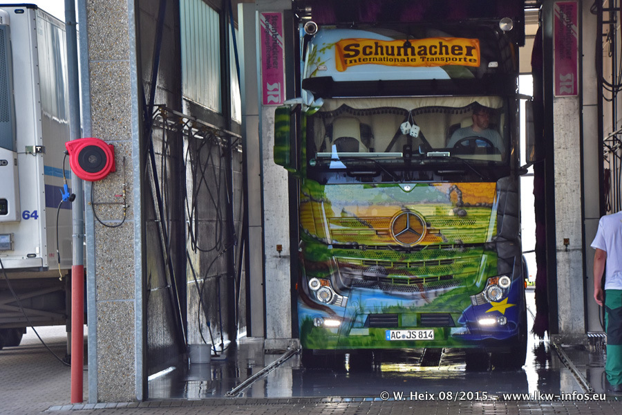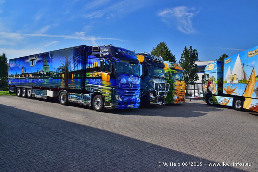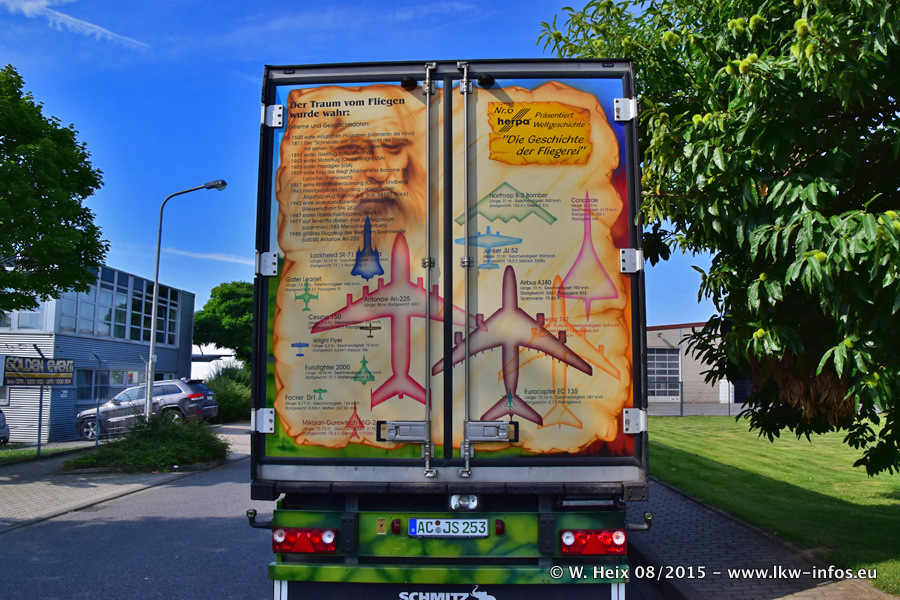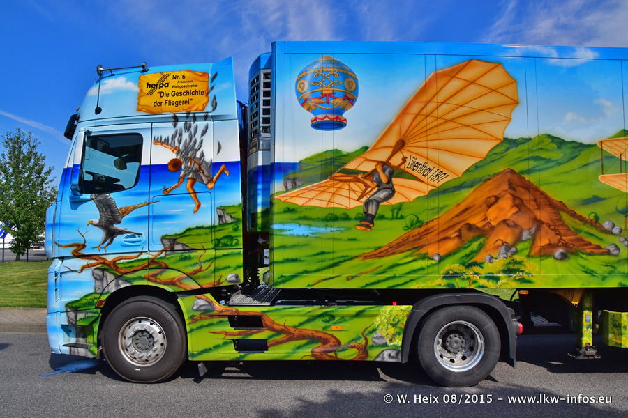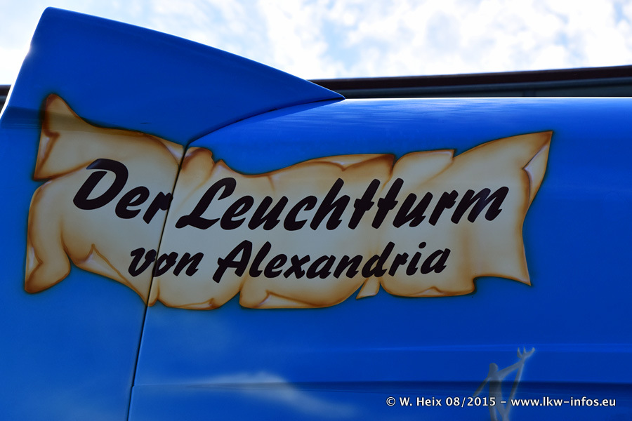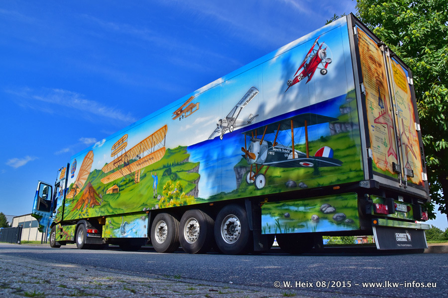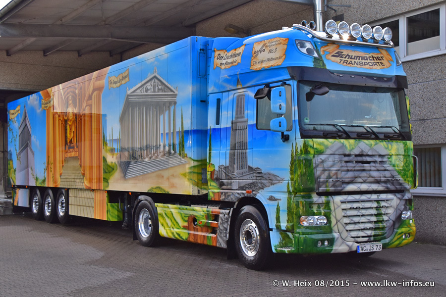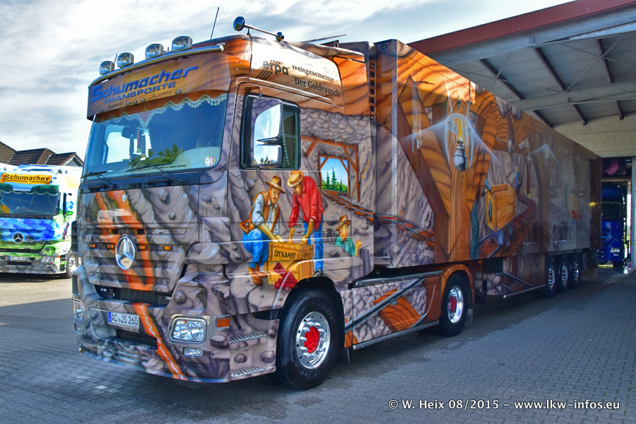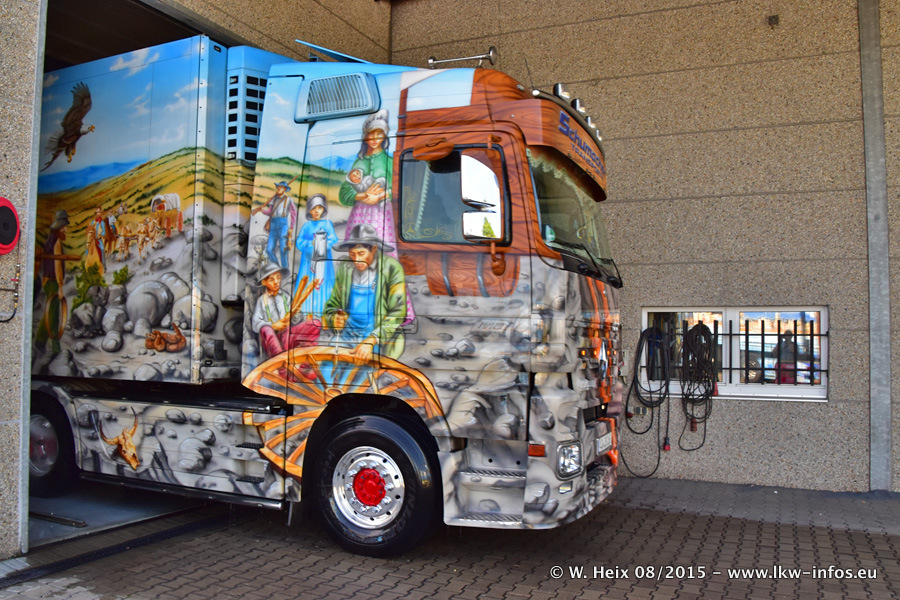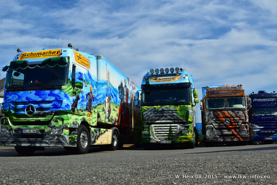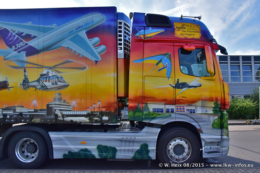 Bei diesem Besuch waren bis auf einen LKW alle Showtrucks der Herpa-Serie zuhause. Schumacher hat ja bekanntlich inzwischen den größten Teil dieser 14 Trucks im Fuhrpark. Die Nummer 1 bekam vor einigen Monaten eine neue Zugmaschine und läuft jetzt unter der Numer 1.1 "Die Wiege der Menschheit". Ende 2014 bekam Schumacher die Nummer 14 der Serie: "Herpa präsentiert Weltgeschichte Nr. 14 - Karl der Große". Das ist aktuell der letzte neue Showtruck der Herpa-Serie. Außerdem konnte ich diesmal den Köln-Truck von allen Seiten fotografieren, da dieser auch zuhause war. Danke an den/die Fahrer von Schumacher, die mir die Showtrucks zum Fotografieren auf dem Hof "ins richtige Licht" gerückt haben.