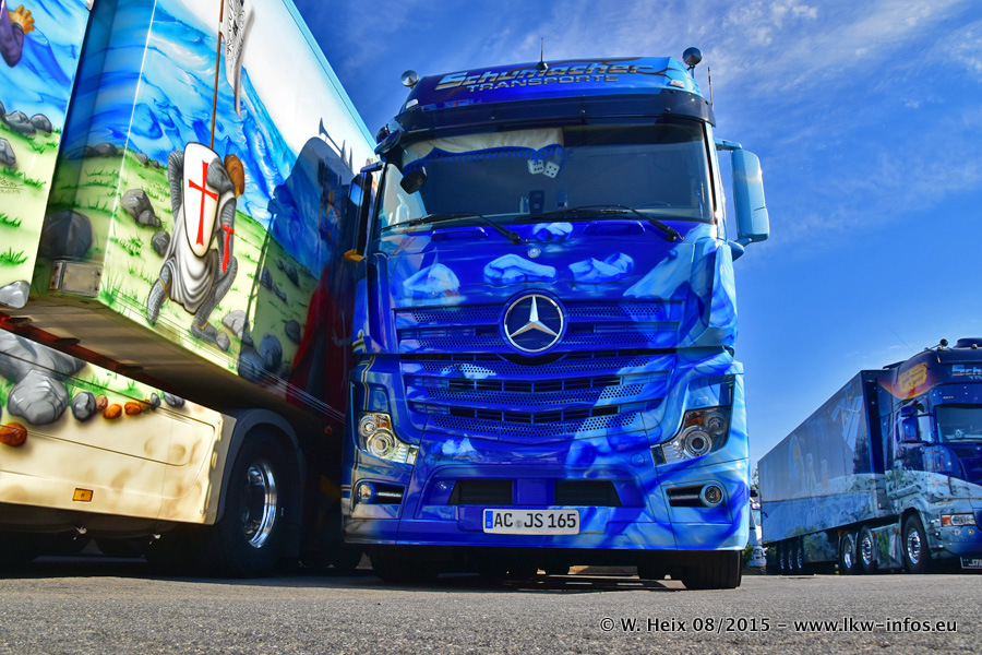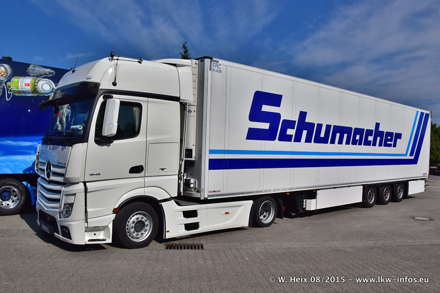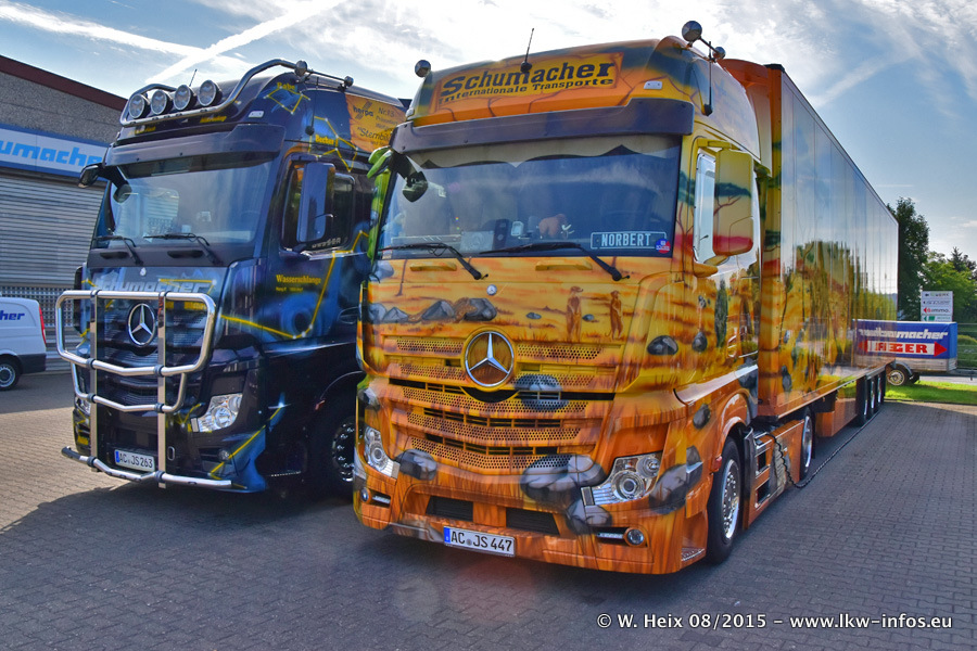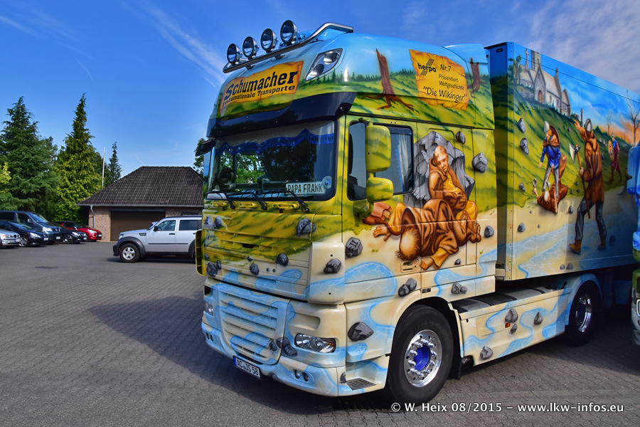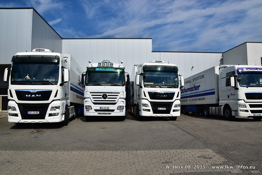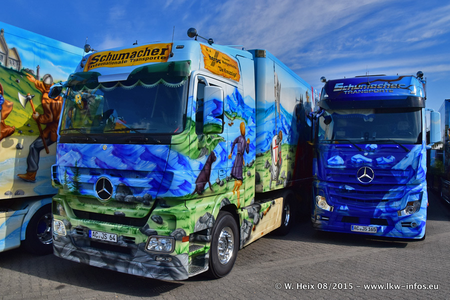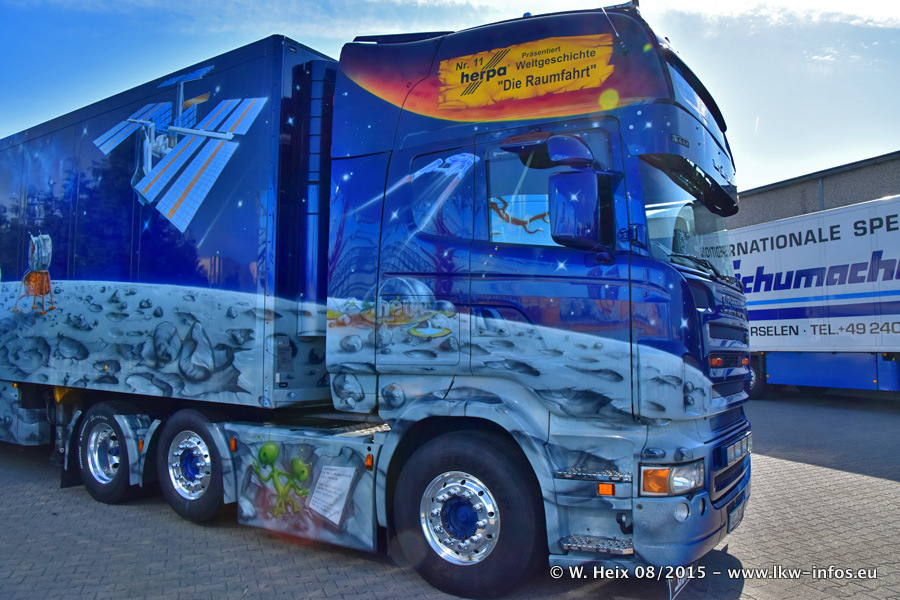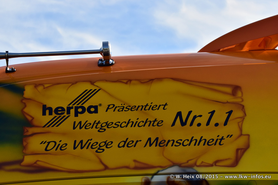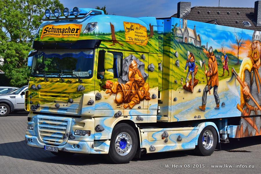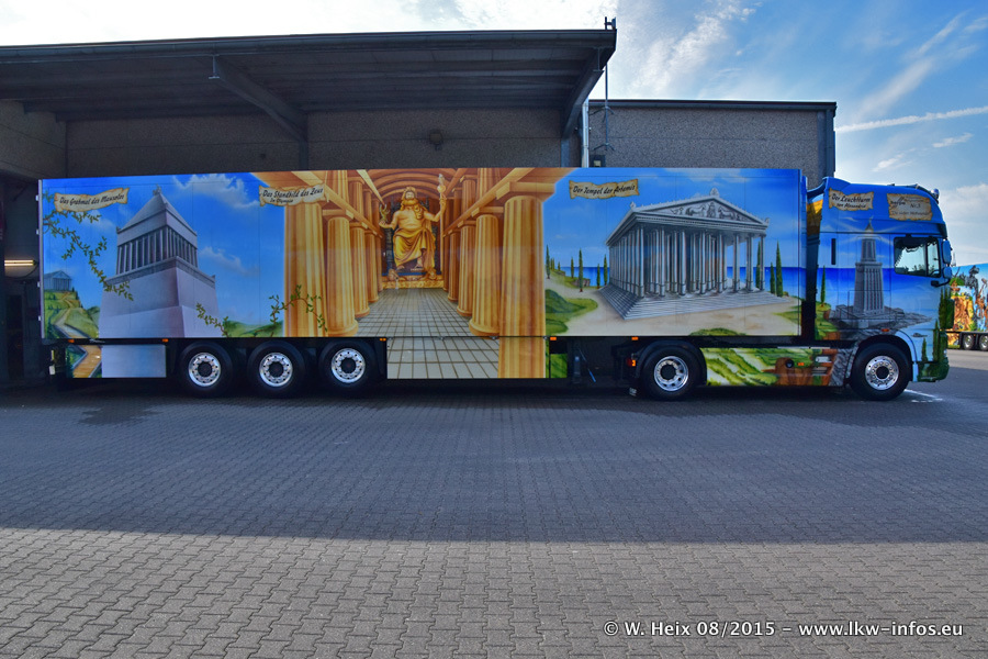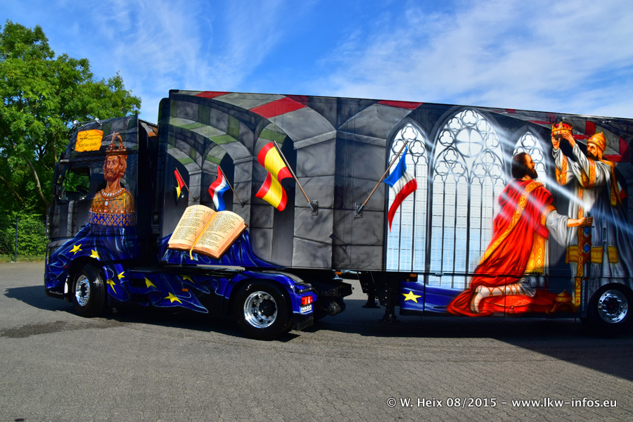 Bei diesem Besuch waren bis auf einen LKW alle Showtrucks der Herpa-Serie zuhause. Schumacher hat ja bekanntlich inzwischen den größten Teil dieser 14 Trucks im Fuhrpark. Die Nummer 1 bekam vor einigen Monaten eine neue Zugmaschine und läuft jetzt unter der Numer 1.1 "Die Wiege der Menschheit". Ende 2014 bekam Schumacher die Nummer 14 der Serie: "Herpa präsentiert Weltgeschichte Nr. 14 - Karl der Große". Das ist aktuell der letzte neue Showtruck der Herpa-Serie. Außerdem konnte ich diesmal den Köln-Truck von allen Seiten fotografieren, da dieser auch zuhause war. Danke an den/die Fahrer von Schumacher, die mir die Showtrucks zum Fotografieren auf dem Hof "ins richtige Licht" gerückt haben.