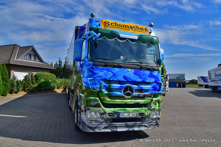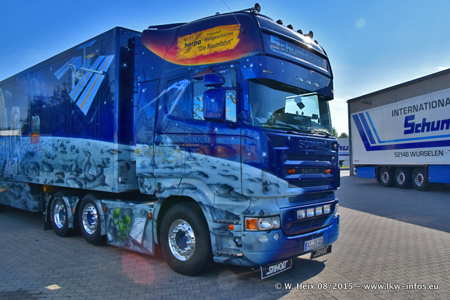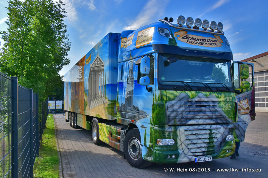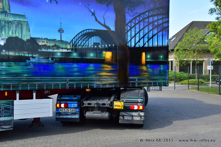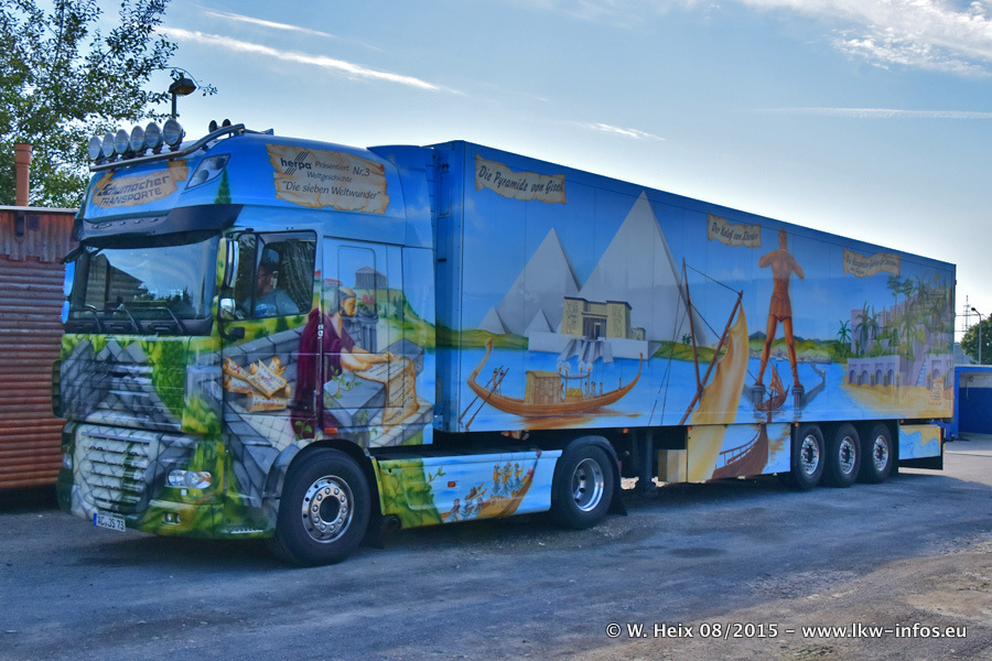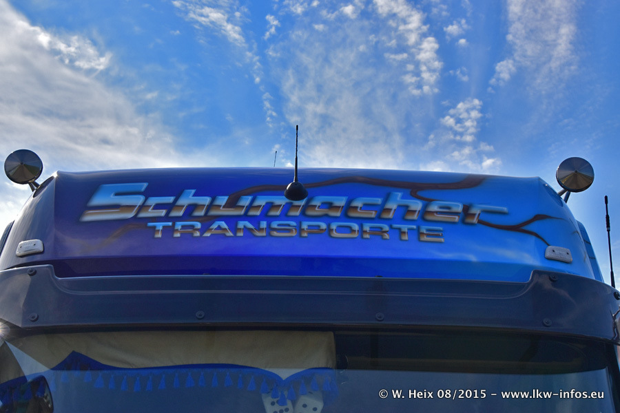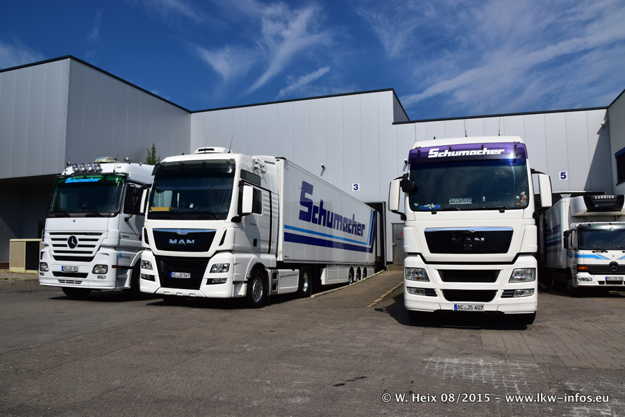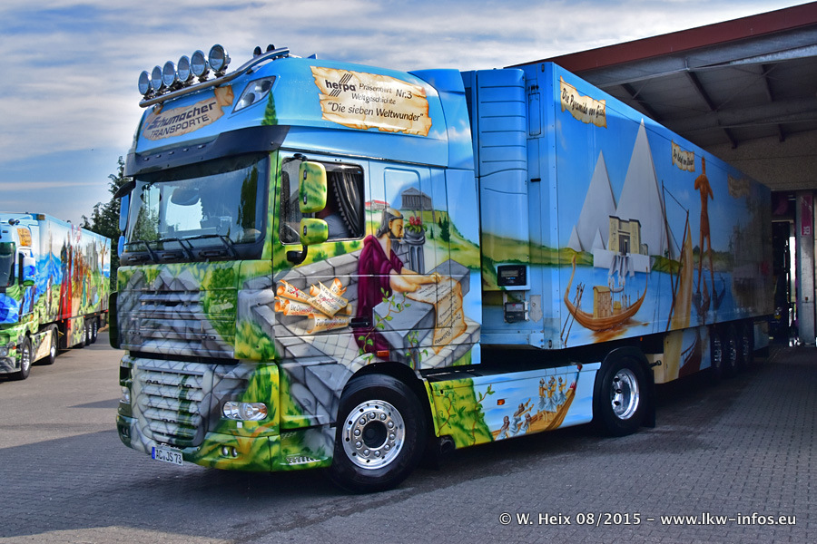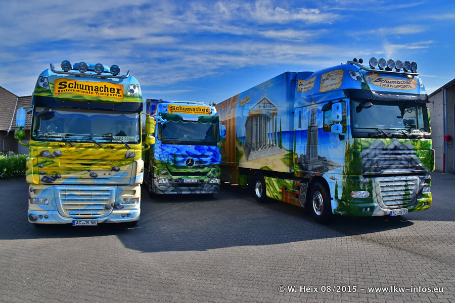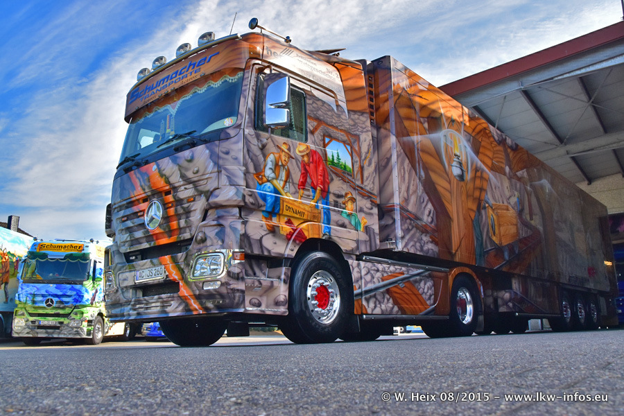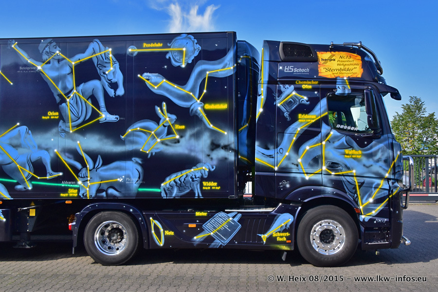 Bei diesem Besuch waren bis auf einen LKW alle Showtrucks der Herpa-Serie zuhause. Schumacher hat ja bekanntlich inzwischen den größten Teil dieser 14 Trucks im Fuhrpark. Die Nummer 1 bekam vor einigen Monaten eine neue Zugmaschine und läuft jetzt unter der Numer 1.1 "Die Wiege der Menschheit". Ende 2014 bekam Schumacher die Nummer 14 der Serie: "Herpa präsentiert Weltgeschichte Nr. 14 - Karl der Große". Das ist aktuell der letzte neue Showtruck der Herpa-Serie. Außerdem konnte ich diesmal den Köln-Truck von allen Seiten fotografieren, da dieser auch zuhause war. Danke an den/die Fahrer von Schumacher, die mir die Showtrucks zum Fotografieren auf dem Hof "ins richtige Licht" gerückt haben.