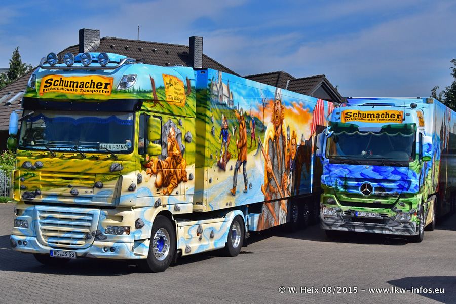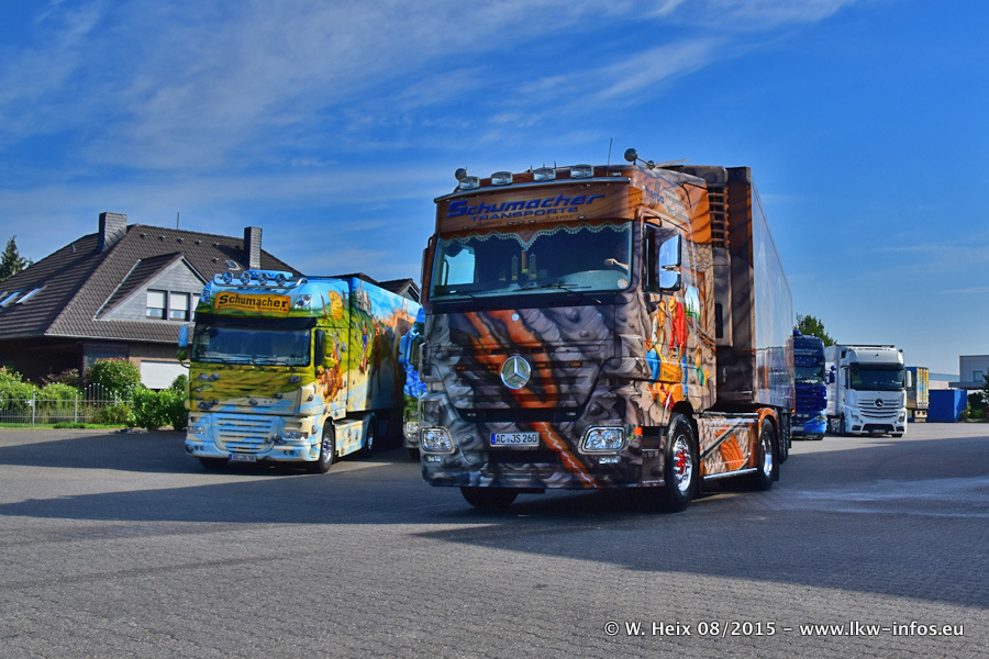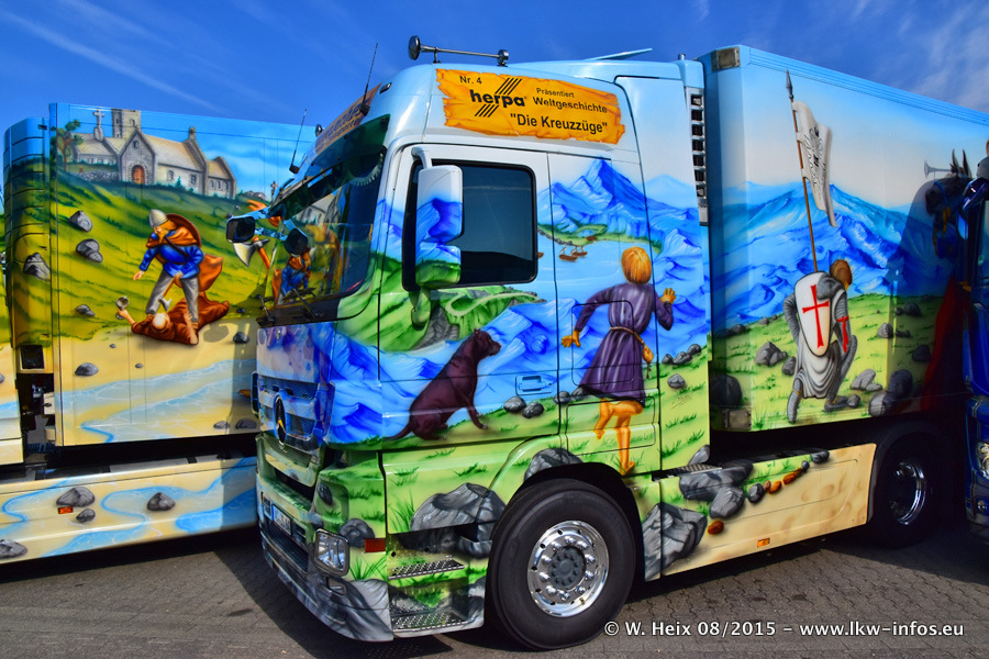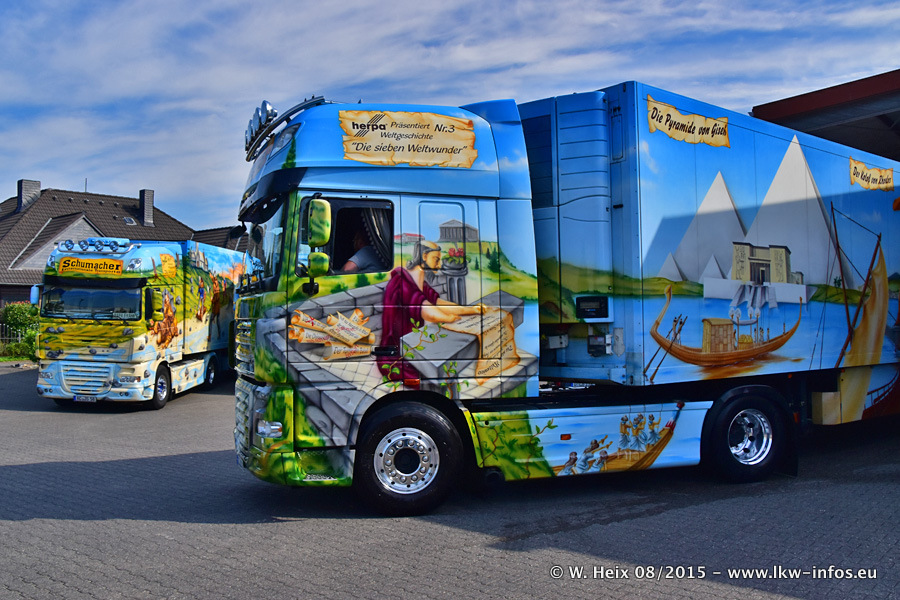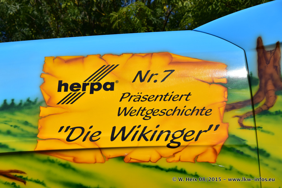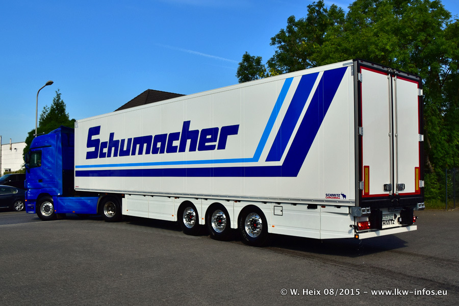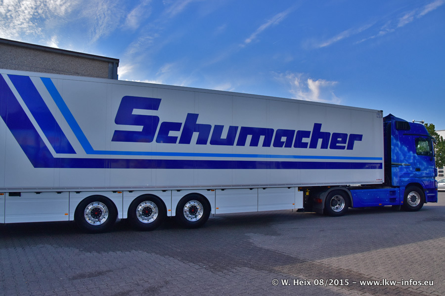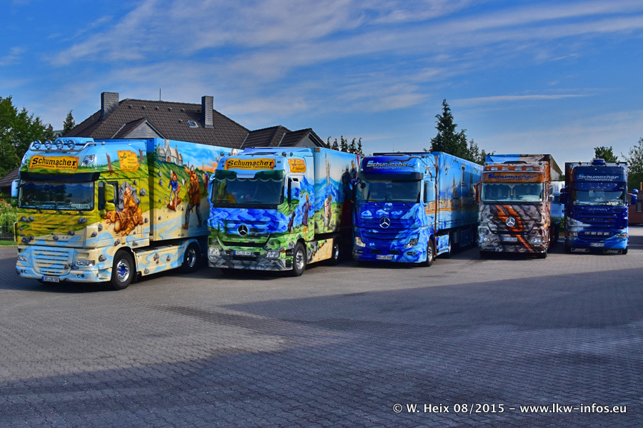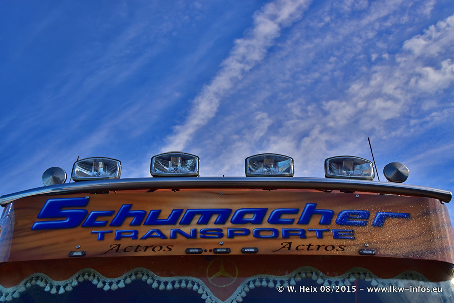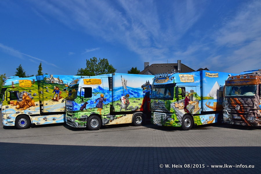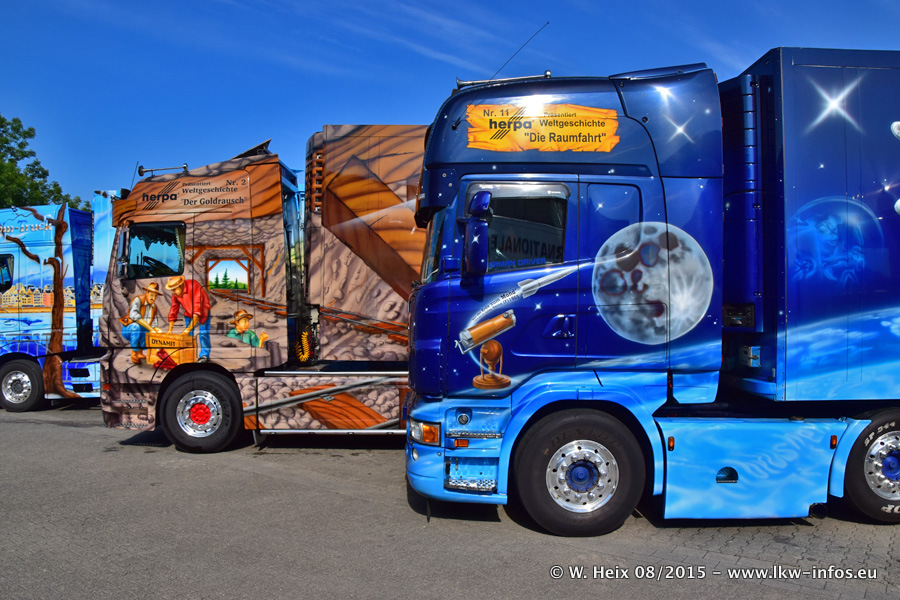 Bei diesem Besuch waren bis auf einen LKW alle Showtrucks der Herpa-Serie zuhause. Schumacher hat ja bekanntlich inzwischen den größten Teil dieser 14 Trucks im Fuhrpark. Die Nummer 1 bekam vor einigen Monaten eine neue Zugmaschine und läuft jetzt unter der Numer 1.1 "Die Wiege der Menschheit". Ende 2014 bekam Schumacher die Nummer 14 der Serie: "Herpa präsentiert Weltgeschichte Nr. 14 - Karl der Große". Das ist aktuell der letzte neue Showtruck der Herpa-Serie. Außerdem konnte ich diesmal den Köln-Truck von allen Seiten fotografieren, da dieser auch zuhause war. Danke an den/die Fahrer von Schumacher, die mir die Showtrucks zum Fotografieren auf dem Hof "ins richtige Licht" gerückt haben.